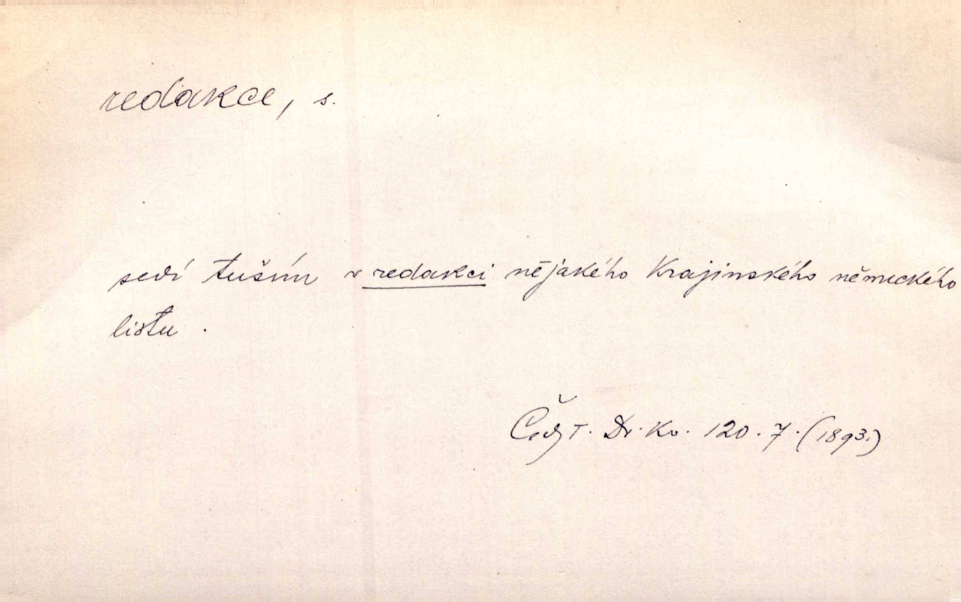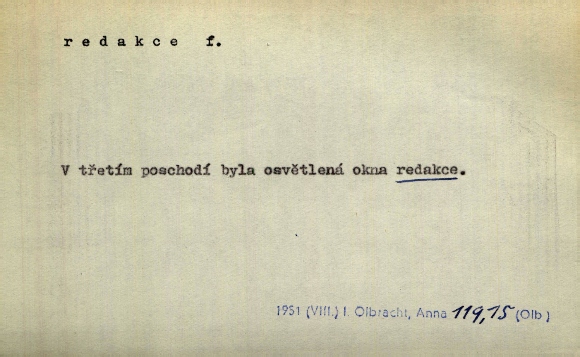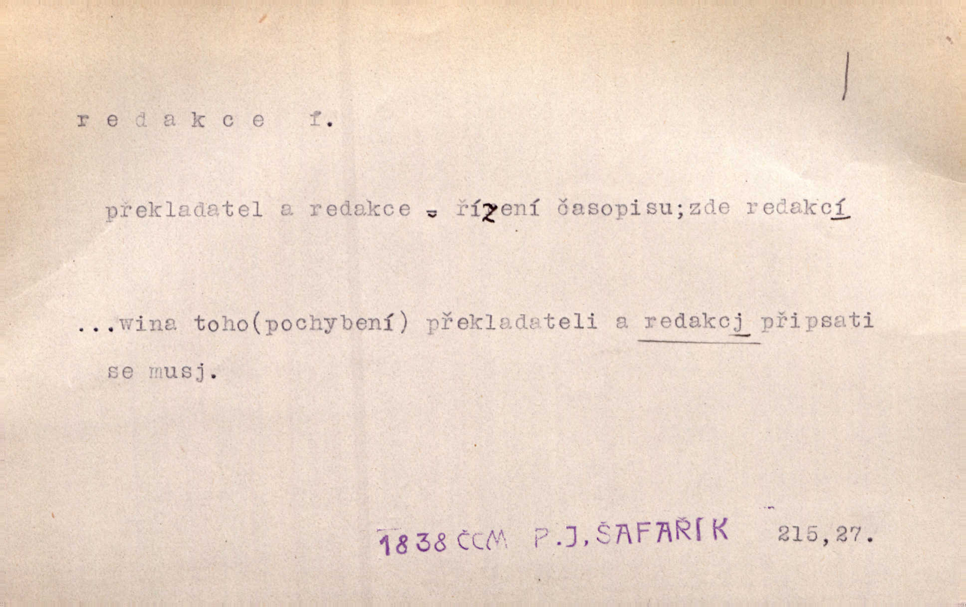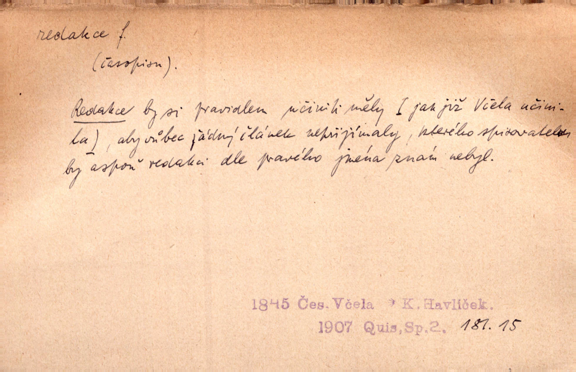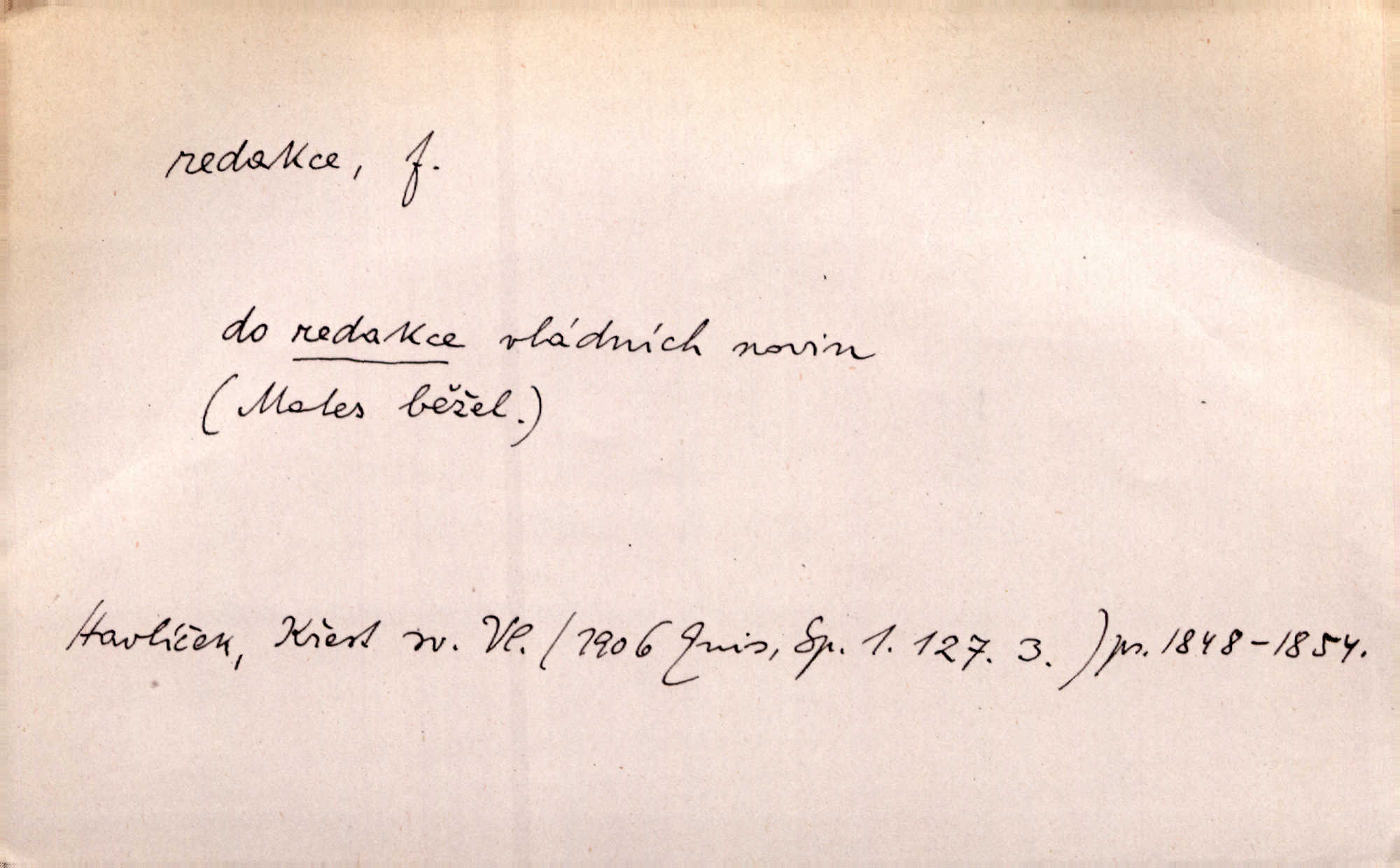 - redakce, -e (zast. redakcí, -í), f. činnost osob majících na starosti řízení, pořádání, redigování časopisu n. periodického n. souborného díla. „Průmyslník“ počne vycházeti tohoto měsíce redakcí Karla Procházky. Zl. Praha. Převzal [Palacký] redakcí časopisu musejního. Bran. Národní bibliothéce nedostávalo se přiměřeného řízení čili jednotné redakce. Osv. Poslední redakci [Slovníku] bude míti Palacký. Zel. D místnost, budova, v níž pracují tyto osoby. Tiskárna, redakce i expedice byly v jeho [Rosenmüllerově] domě. Jir. Vraceje se pozdě večer z redakce domů, zahnul jsem do ulice, v kteréž Eldora bydlila. Arb. D úprava textu, zpr. literárního, vydání v jisté úpravě. Nevím, je-li román kněze-buditele [„Drašar“], otištěný v „Květech“, již konečnou redakcí. Šal. Jest to spis bratrský, při jehož latinské redakci Bratří užili pomoci svých přátel. Goll. Církevně-slovanská slova dle redakce asi srbské pojata do stčes. vokabuláře. Ath. D soubor osob majících na starosti uspořádání obsahové části novin, časopisu n. jiného periodického n. souborného díla. Redakce různých listů vracely jí [Ackermannové] šmahem básně. Vrch. Přičinlivá redakcí čím dále tím více zdařilých plodů vlastencům podávala. Pal. Čekal na odpověď v listárně redakce jednoho listu. V. Mrš. [Rousseau] brojí proti Encyklopaedistům, s nimiž se zprvu zúčastnil v redakci velikého díla. Durd.