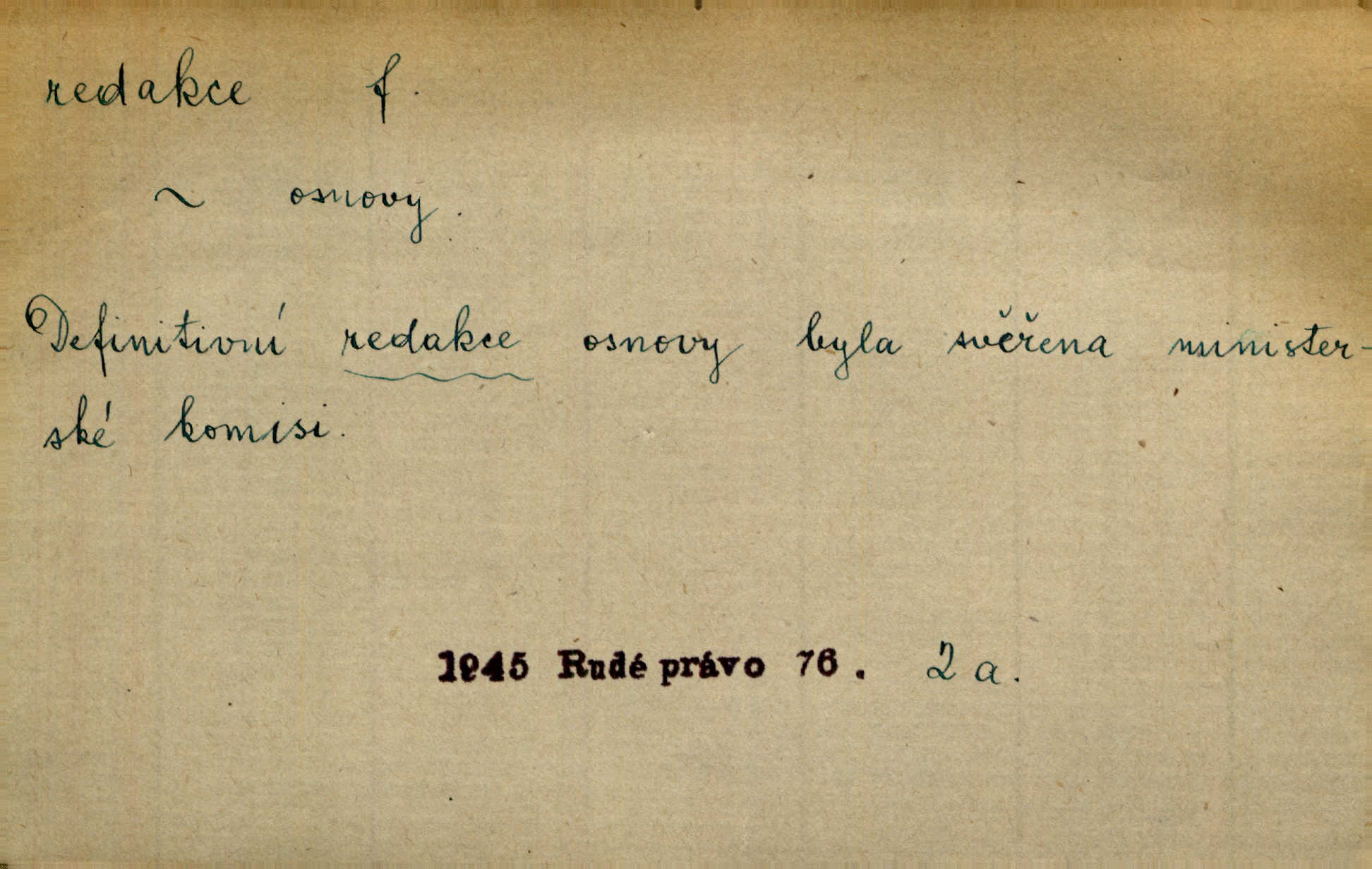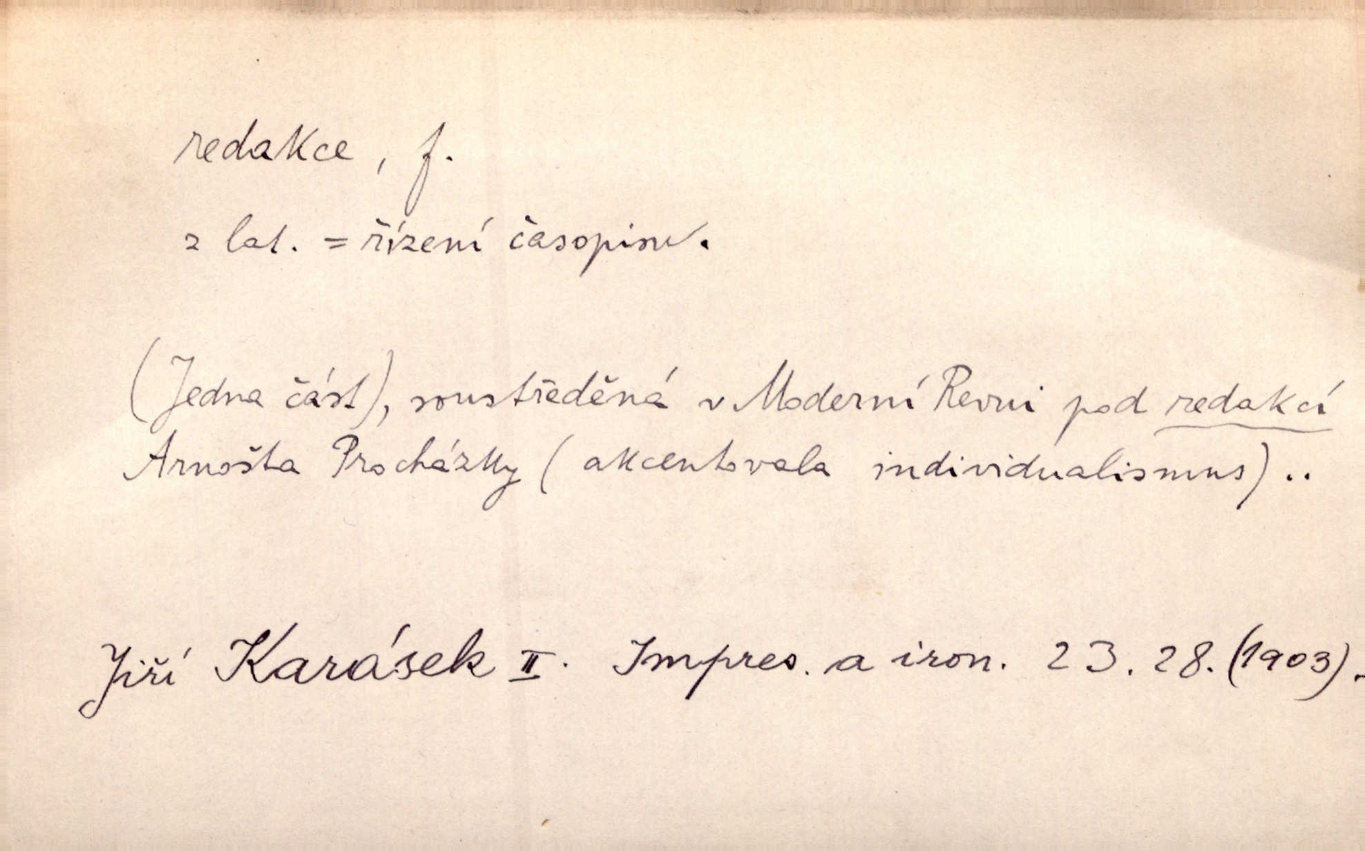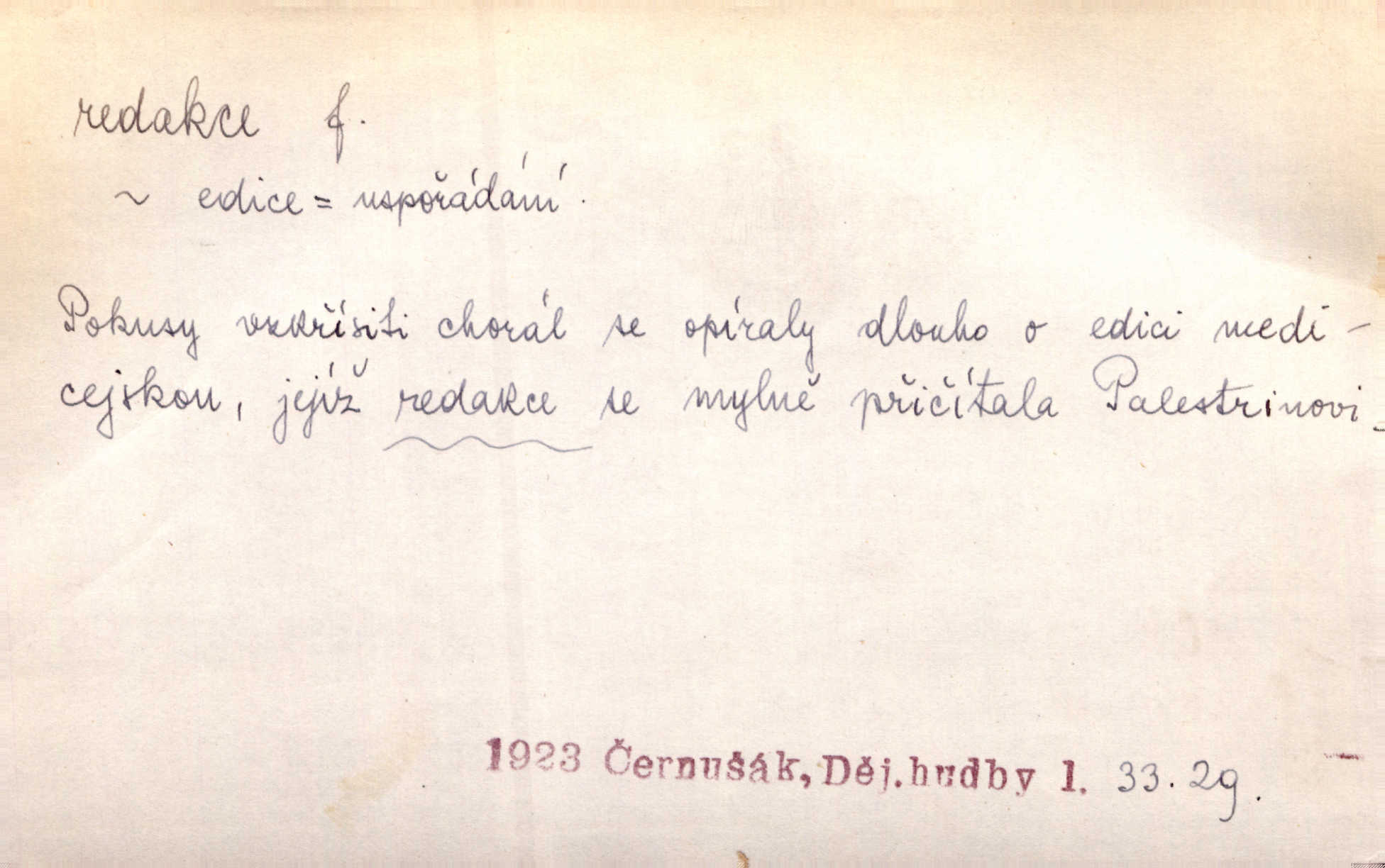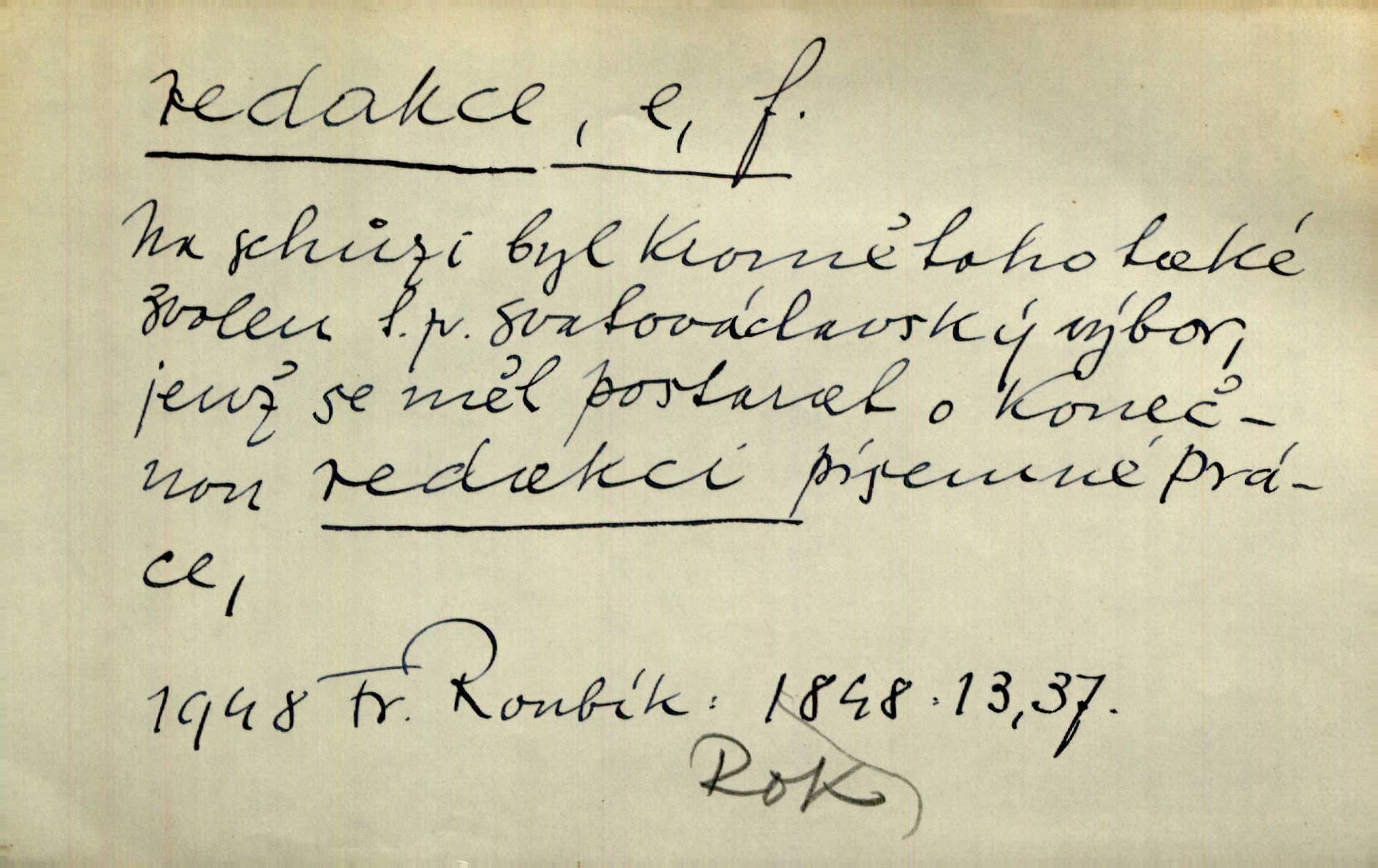 - redakce, -e (zast. redakcí, -í), f. činnost osob majících na starosti řízení, pořádání, redigování časopisu n. periodického n. souborného díla. „Průmyslník“ počne vycházeti tohoto měsíce redakcí Karla Procházky. Zl. Praha. Převzal [Palacký] redakcí časopisu musejního. Bran. Národní bibliothéce nedostávalo se přiměřeného řízení čili jednotné redakce. Osv. Poslední redakci [Slovníku] bude míti Palacký. Zel. D místnost, budova, v níž pracují tyto osoby. Tiskárna, redakce i expedice byly v jeho [Rosenmüllerově] domě. Jir. Vraceje se pozdě večer z redakce domů, zahnul jsem do ulice, v kteréž Eldora bydlila. Arb. D úprava textu, zpr. literárního, vydání v jisté úpravě. Nevím, je-li román kněze-buditele [„Drašar“], otištěný v „Květech“, již konečnou redakcí. Šal. Jest to spis bratrský, při jehož latinské redakci Bratří užili pomoci svých přátel. Goll. Církevně-slovanská slova dle redakce asi srbské pojata do stčes. vokabuláře. Ath. D soubor osob majících na starosti uspořádání obsahové části novin, časopisu n. jiného periodického n. souborného díla. Redakce různých listů vracely jí [Ackermannové] šmahem básně. Vrch. Přičinlivá redakcí čím dále tím více zdařilých plodů vlastencům podávala. Pal. Čekal na odpověď v listárně redakce jednoho listu. V. Mrš. [Rousseau] brojí proti Encyklopaedistům, s nimiž se zprvu zúčastnil v redakci velikého díla. Durd.