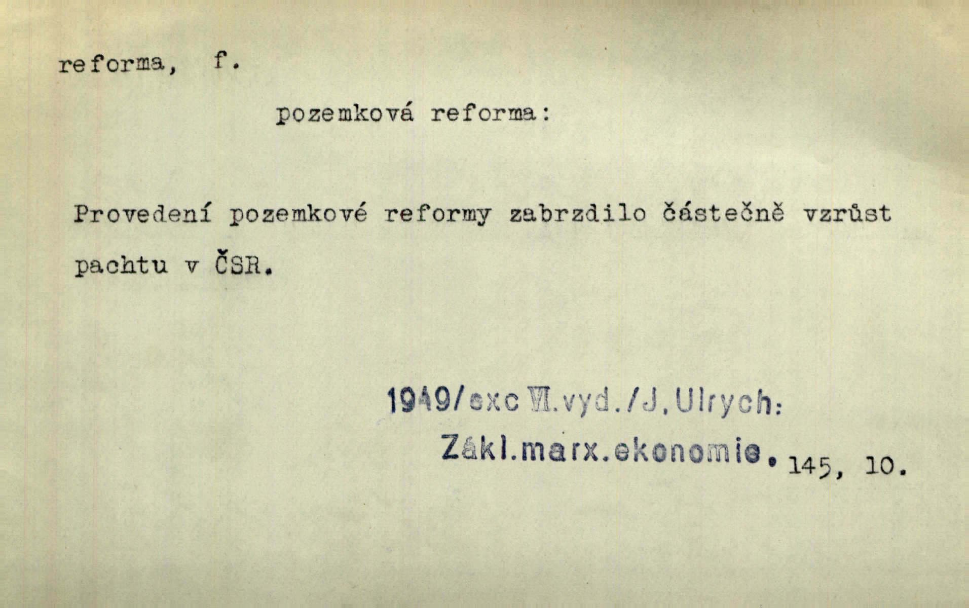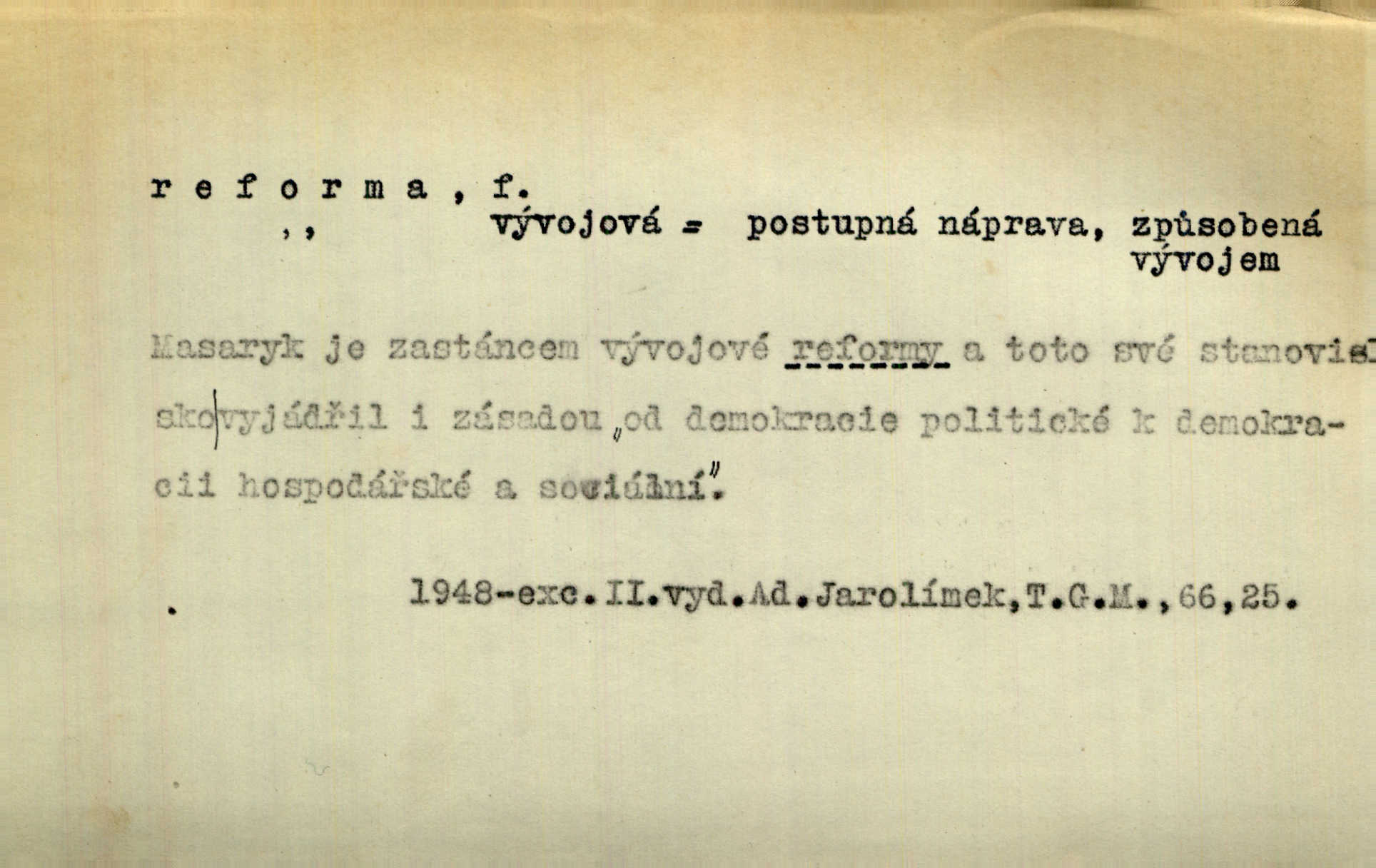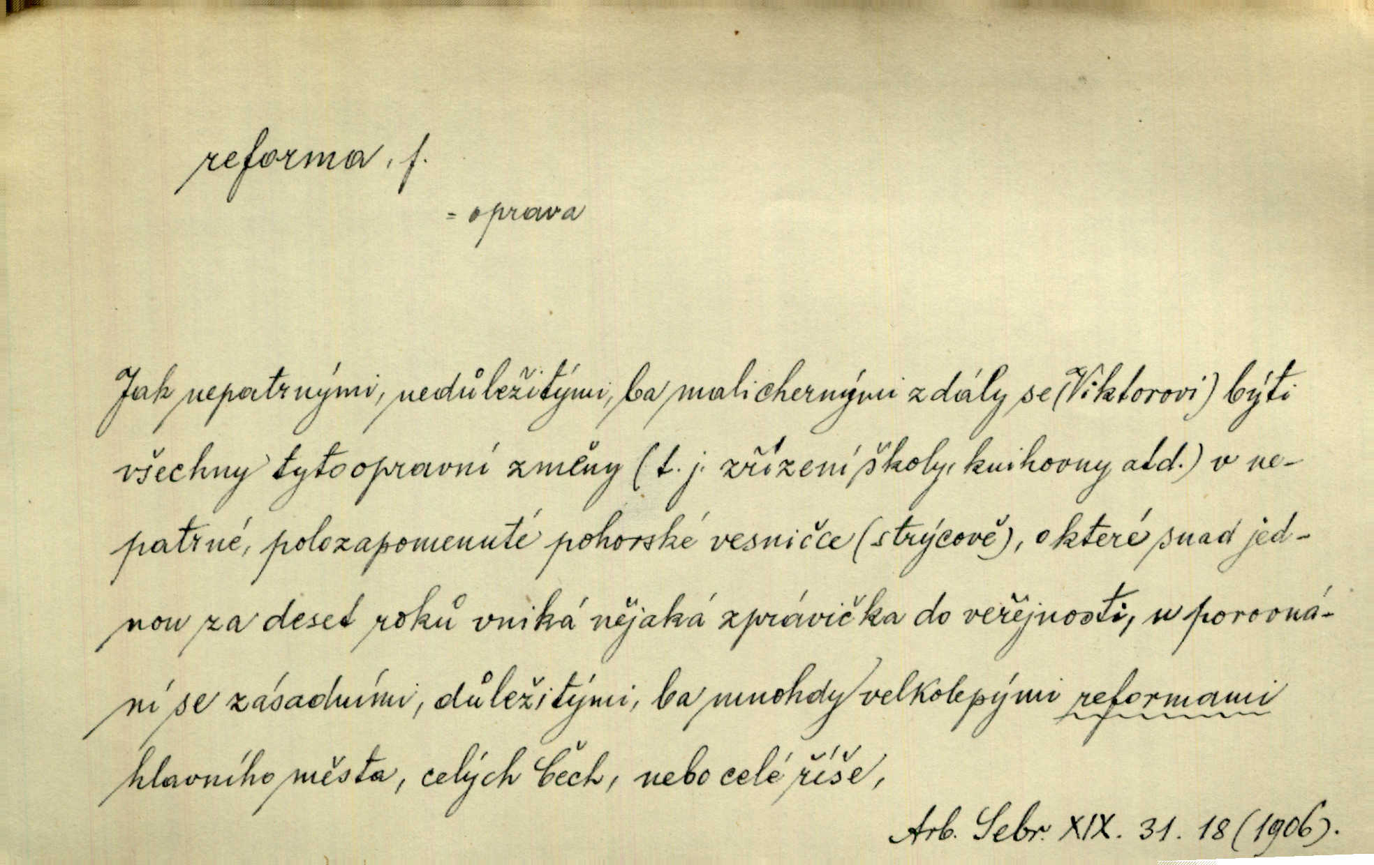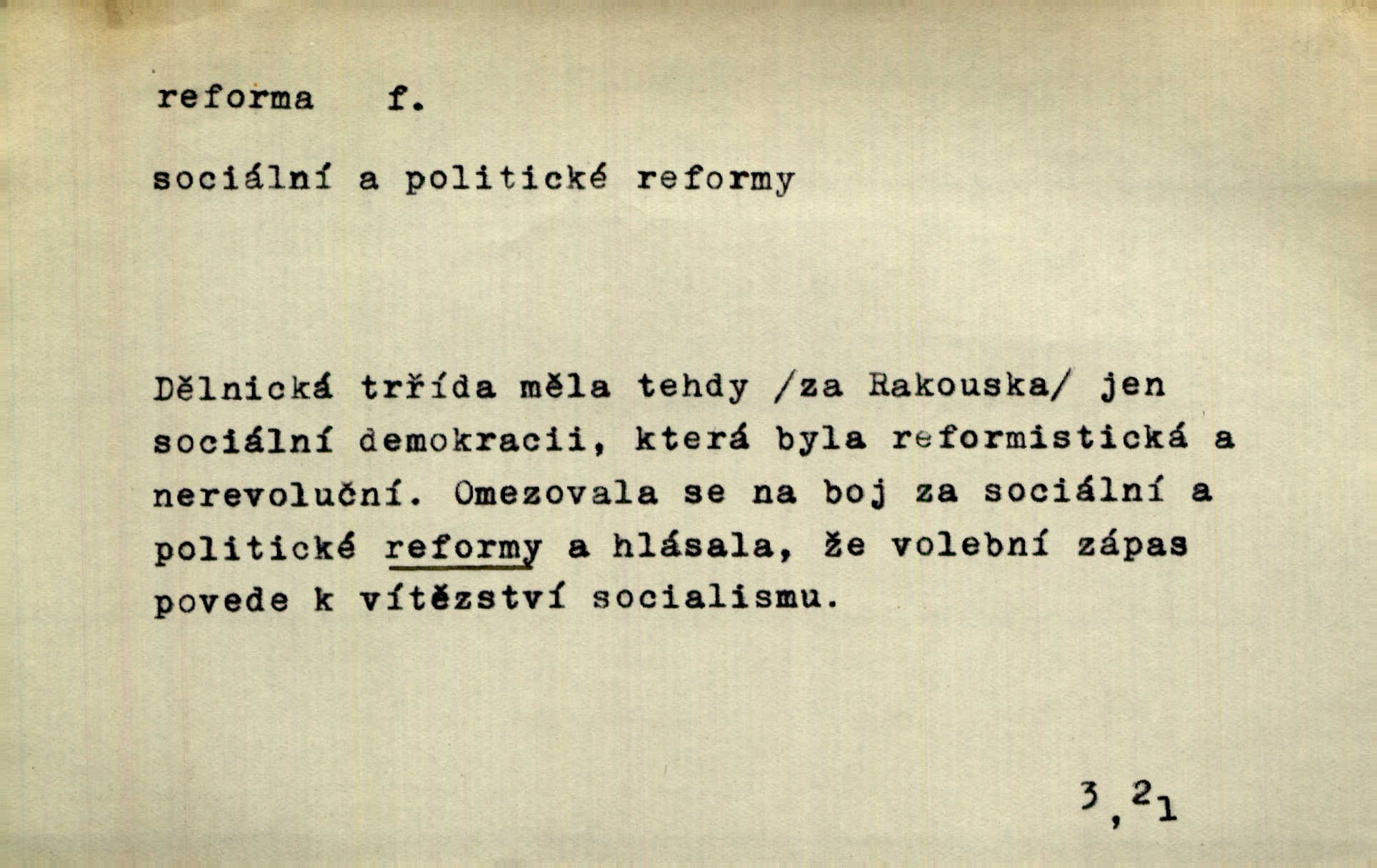 - reforma, -y f. úprava, změna, přeměna nějakého stavu n. řádu, zvl. též veřejného zařízení, směřující k jeho zlepšení. Reforma [kroje] dá se docílit jen vzděláváním [lidu]‚ zvlášť krasocitu. Něm. Umínil si Josef, uvésti jakousi užitečnou reformu dřívějšího systemu na statcích svých. Pfleg. Začali [farář s kaplanem] i o stavech, o císaři Josefovi, o jeho reformách. Třeb. Pracoval [Renan] o reformě vysokých škol. Vrch. Karel Havlíček vyznačil potřebu řádné reformy veškerého současného písemnictví. Osv. Jednalo se mu [Náprstkovi] o reformu společenskou. Zey. Jen tam ujme se hospodárská reforma, kde je lid umořen bídou. Hol. Hleděla [oposice] zmařiti vojenskou reformu. Čes. pol. Práv. pozemková reforma rozdělení velkého pozemkového majetku zákonitou cestou. D Mlyn. mlynářský stroj na čištění krupice a krupičky.