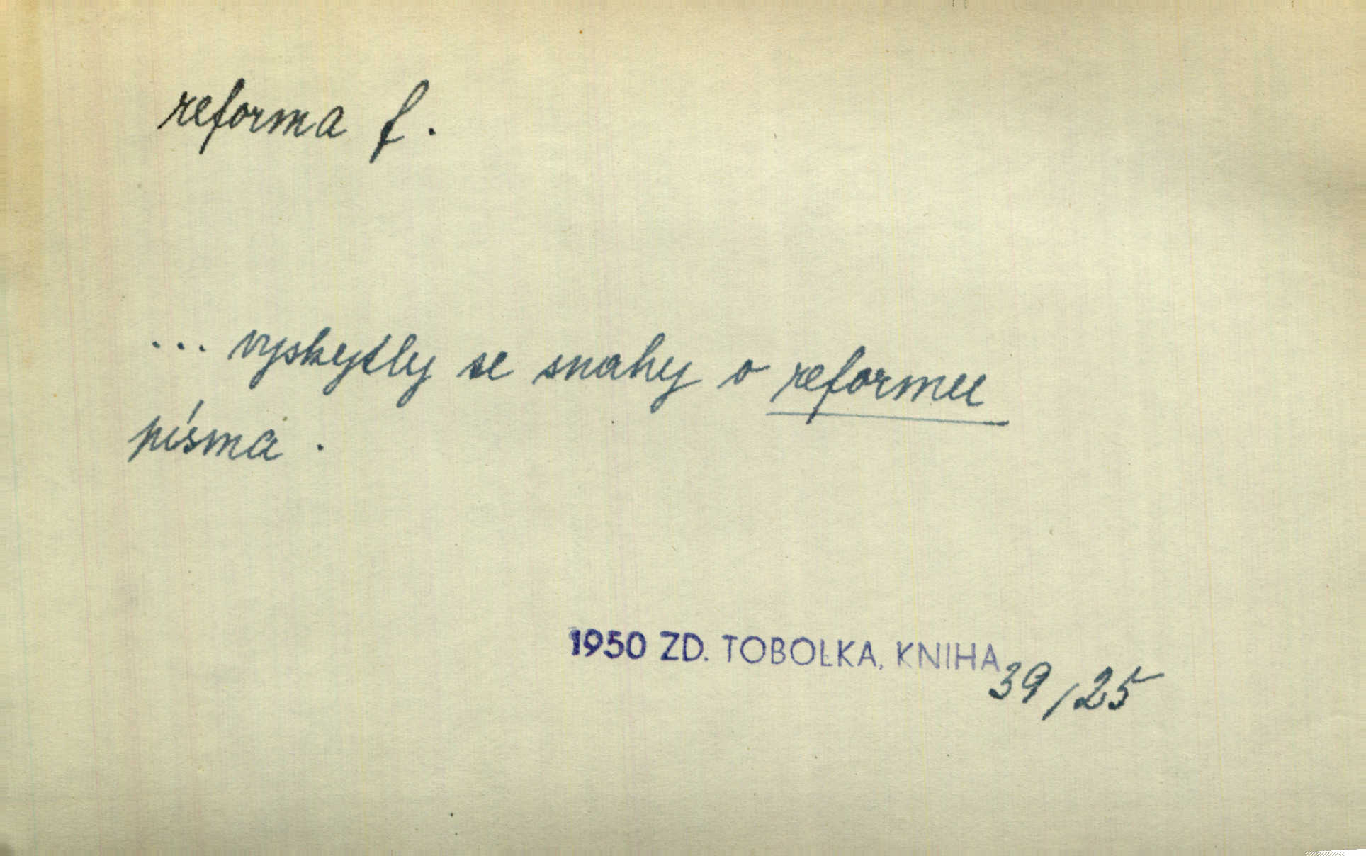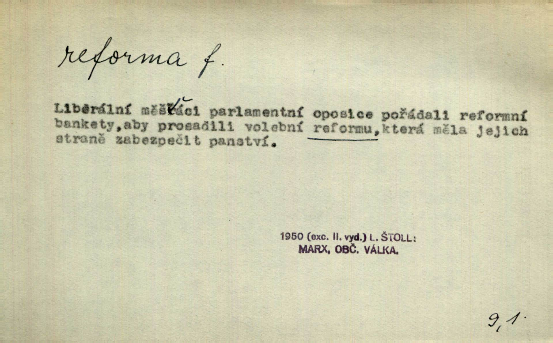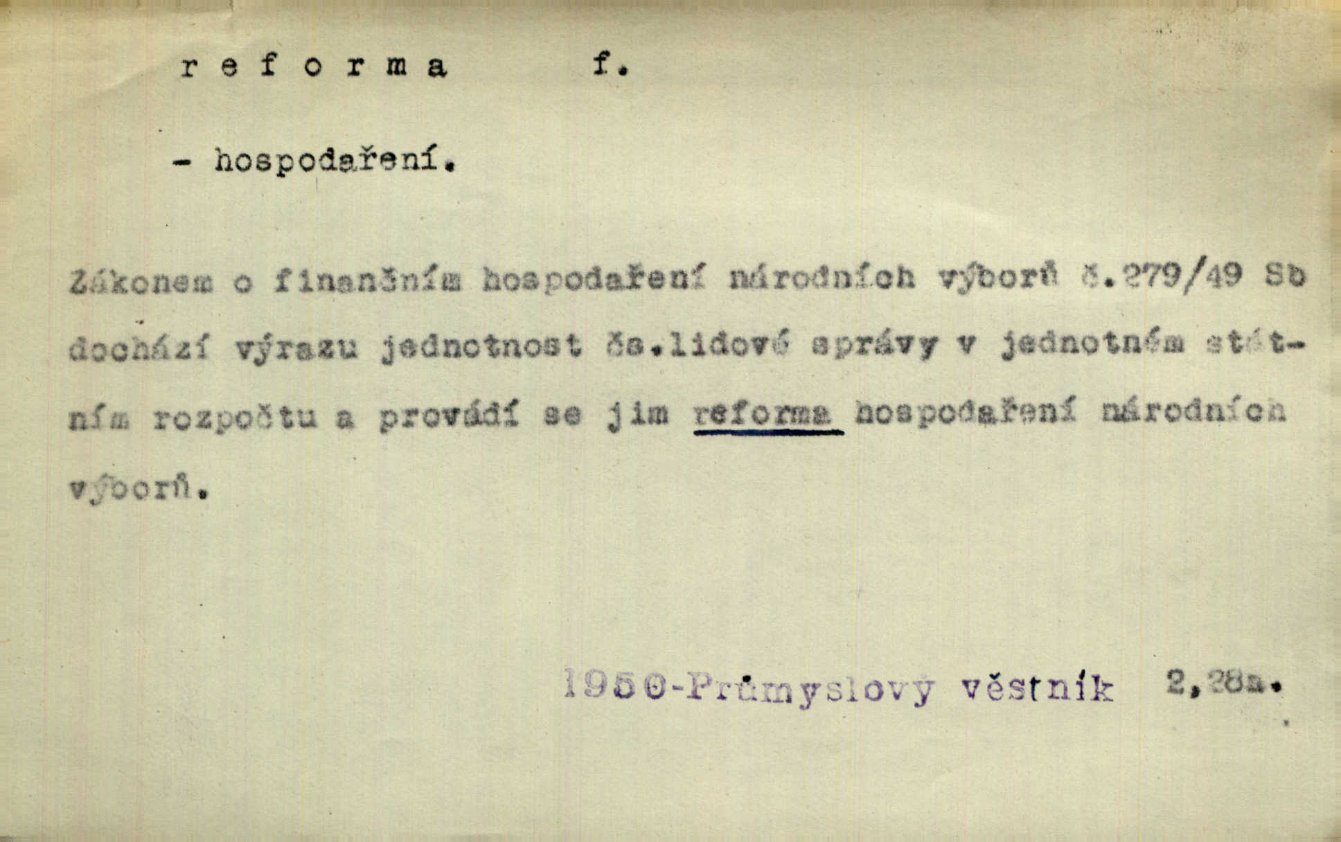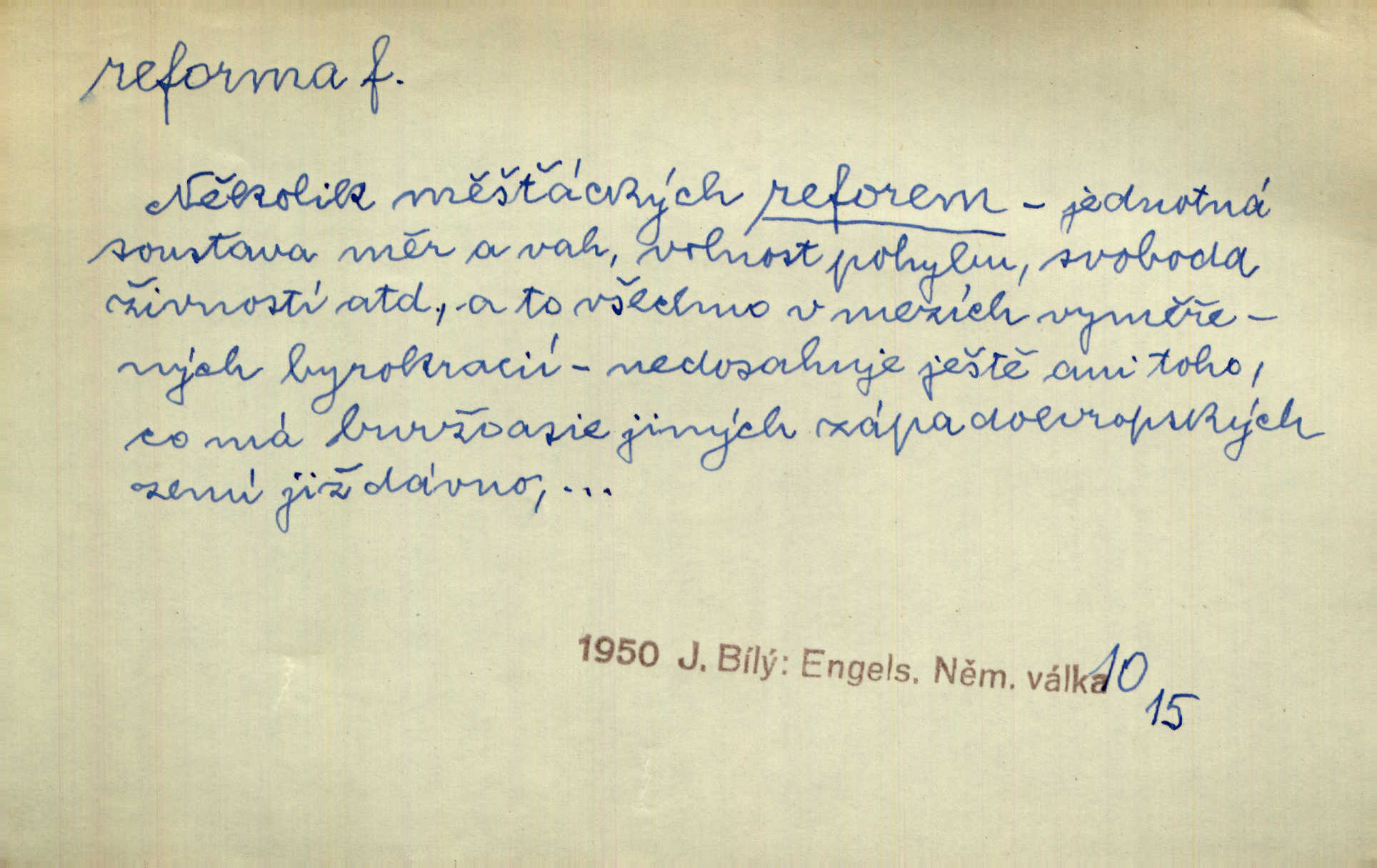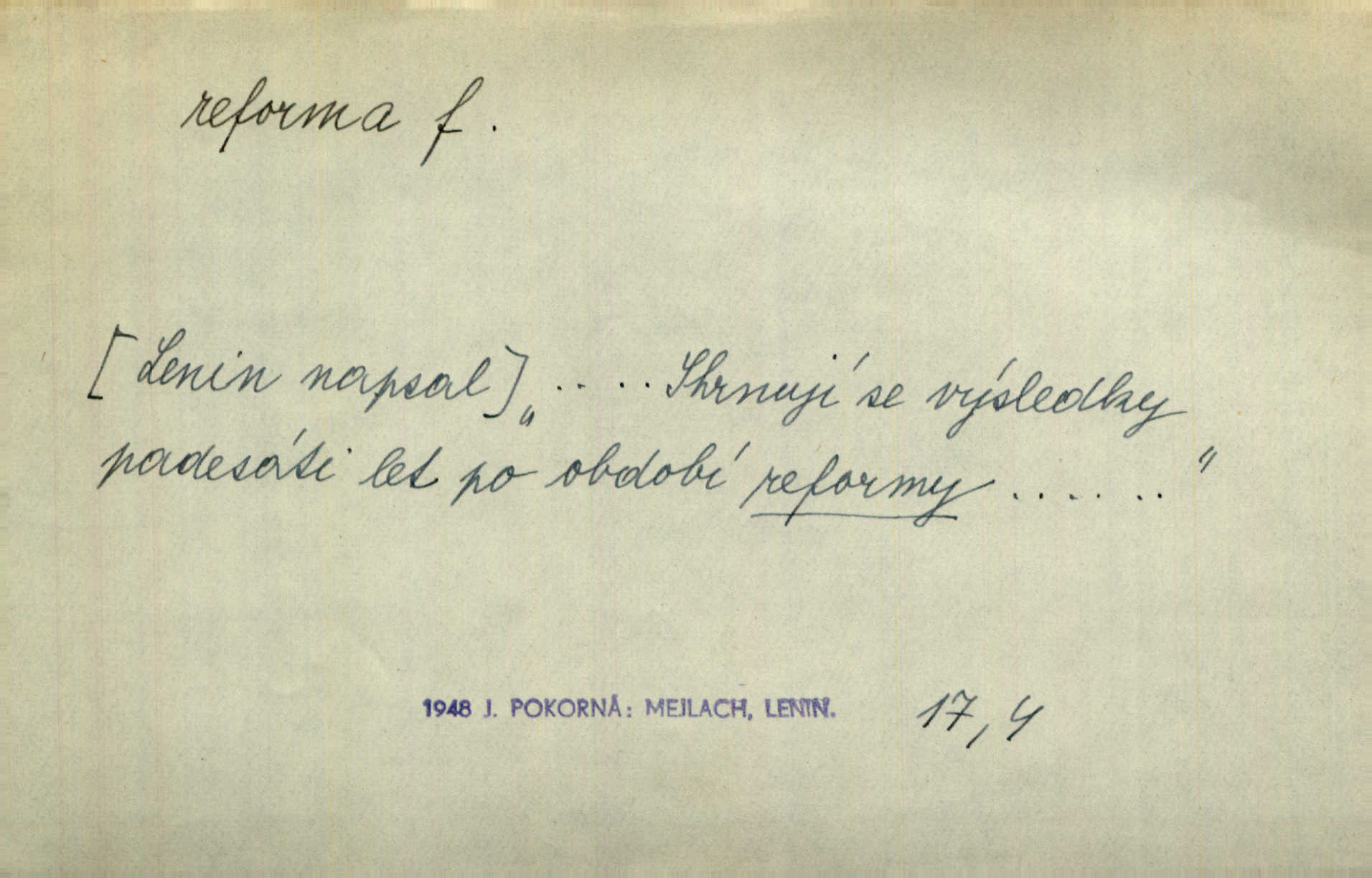 - reforma, -y f. úprava, změna, přeměna nějakého stavu n. řádu, zvl. též veřejného zařízení, směřující k jeho zlepšení. Reforma [kroje] dá se docílit jen vzděláváním [lidu]‚ zvlášť krasocitu. Něm. Umínil si Josef, uvésti jakousi užitečnou reformu dřívějšího systemu na statcích svých. Pfleg. Začali [farář s kaplanem] i o stavech, o císaři Josefovi, o jeho reformách. Třeb. Pracoval [Renan] o reformě vysokých škol. Vrch. Karel Havlíček vyznačil potřebu řádné reformy veškerého současného písemnictví. Osv. Jednalo se mu [Náprstkovi] o reformu společenskou. Zey. Jen tam ujme se hospodárská reforma, kde je lid umořen bídou. Hol. Hleděla [oposice] zmařiti vojenskou reformu. Čes. pol. Práv. pozemková reforma rozdělení velkého pozemkového majetku zákonitou cestou. D Mlyn. mlynářský stroj na čištění krupice a krupičky.