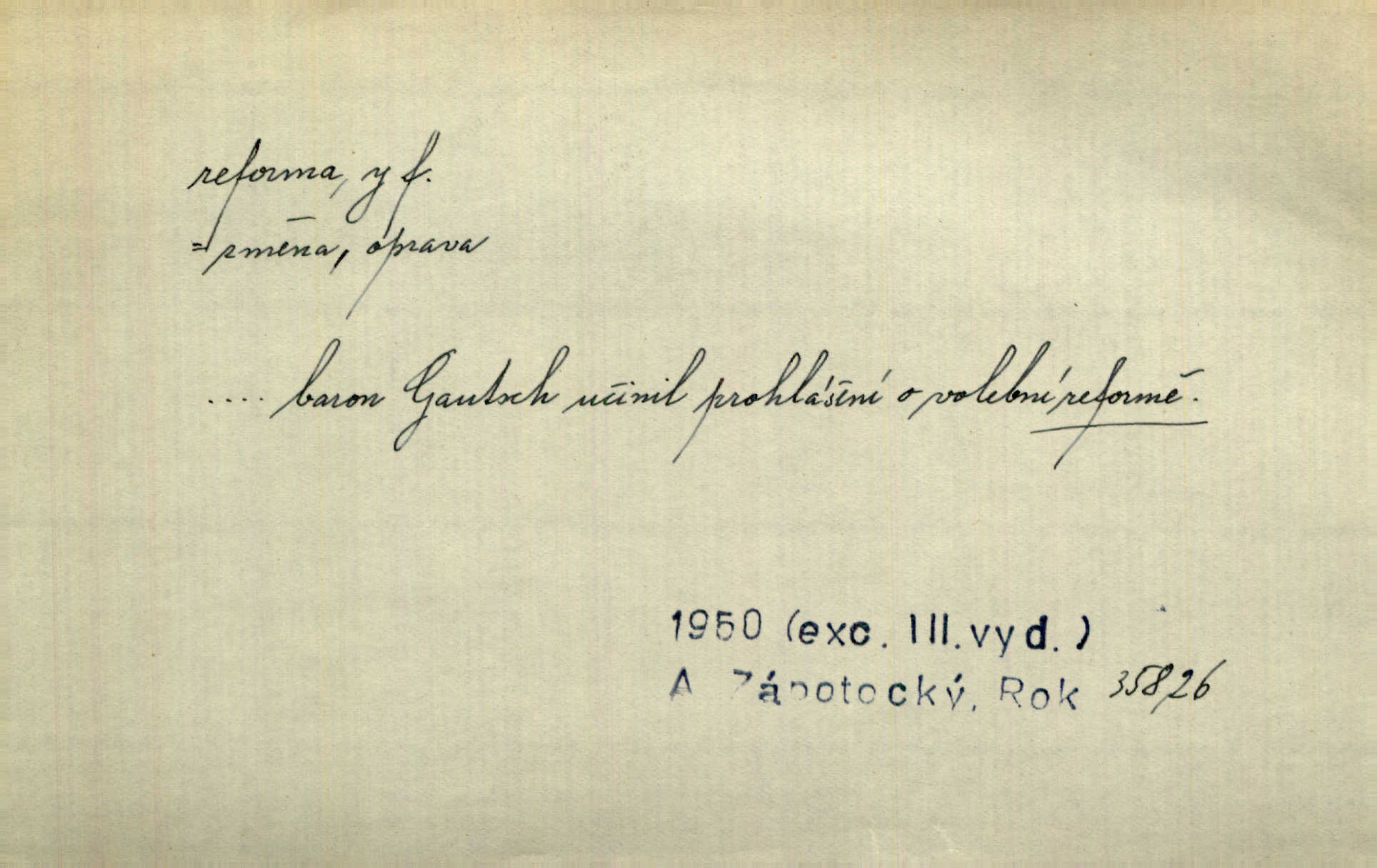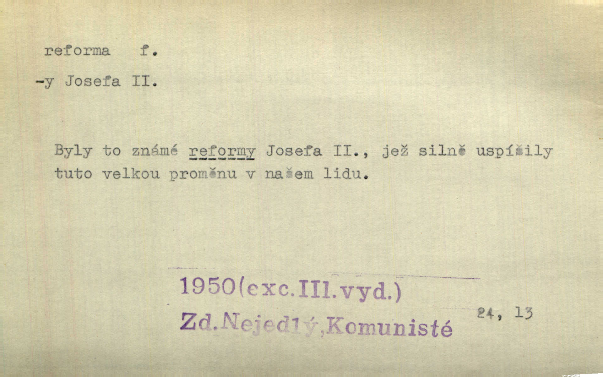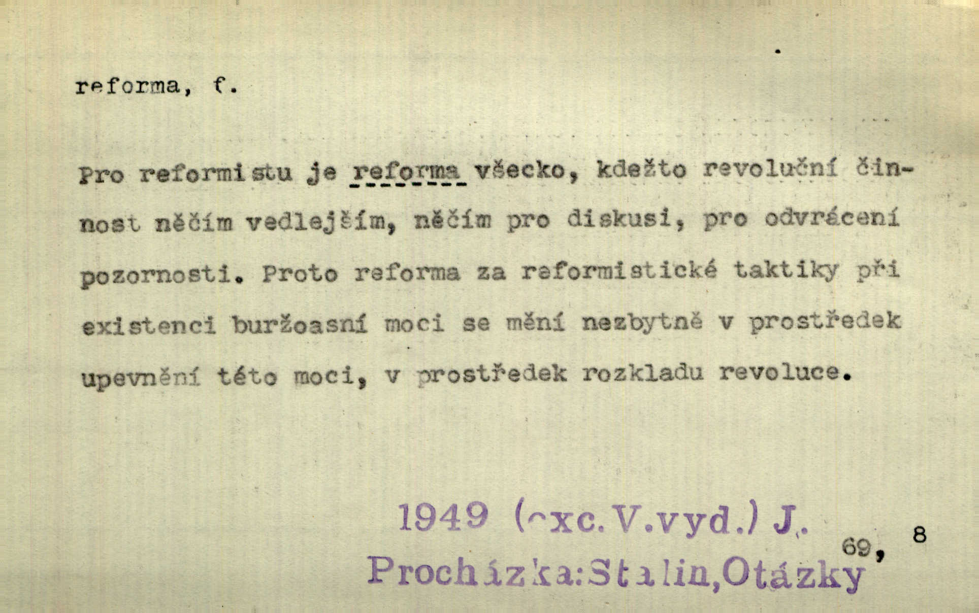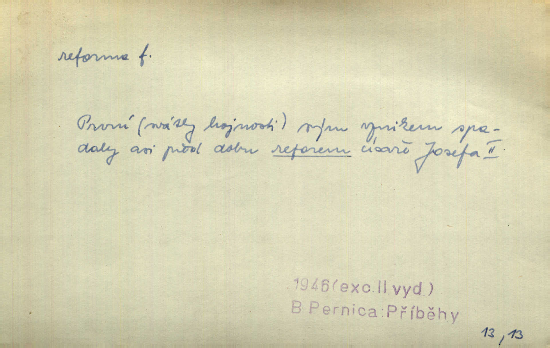 - reforma, -y f. úprava, změna, přeměna nějakého stavu n. řádu, zvl. též veřejného zařízení, směřující k jeho zlepšení. Reforma [kroje] dá se docílit jen vzděláváním [lidu]‚ zvlášť krasocitu. Něm. Umínil si Josef, uvésti jakousi užitečnou reformu dřívějšího systemu na statcích svých. Pfleg. Začali [farář s kaplanem] i o stavech, o císaři Josefovi, o jeho reformách. Třeb. Pracoval [Renan] o reformě vysokých škol. Vrch. Karel Havlíček vyznačil potřebu řádné reformy veškerého současného písemnictví. Osv. Jednalo se mu [Náprstkovi] o reformu společenskou. Zey. Jen tam ujme se hospodárská reforma, kde je lid umořen bídou. Hol. Hleděla [oposice] zmařiti vojenskou reformu. Čes. pol. Práv. pozemková reforma rozdělení velkého pozemkového majetku zákonitou cestou. D Mlyn. mlynářský stroj na čištění krupice a krupičky.