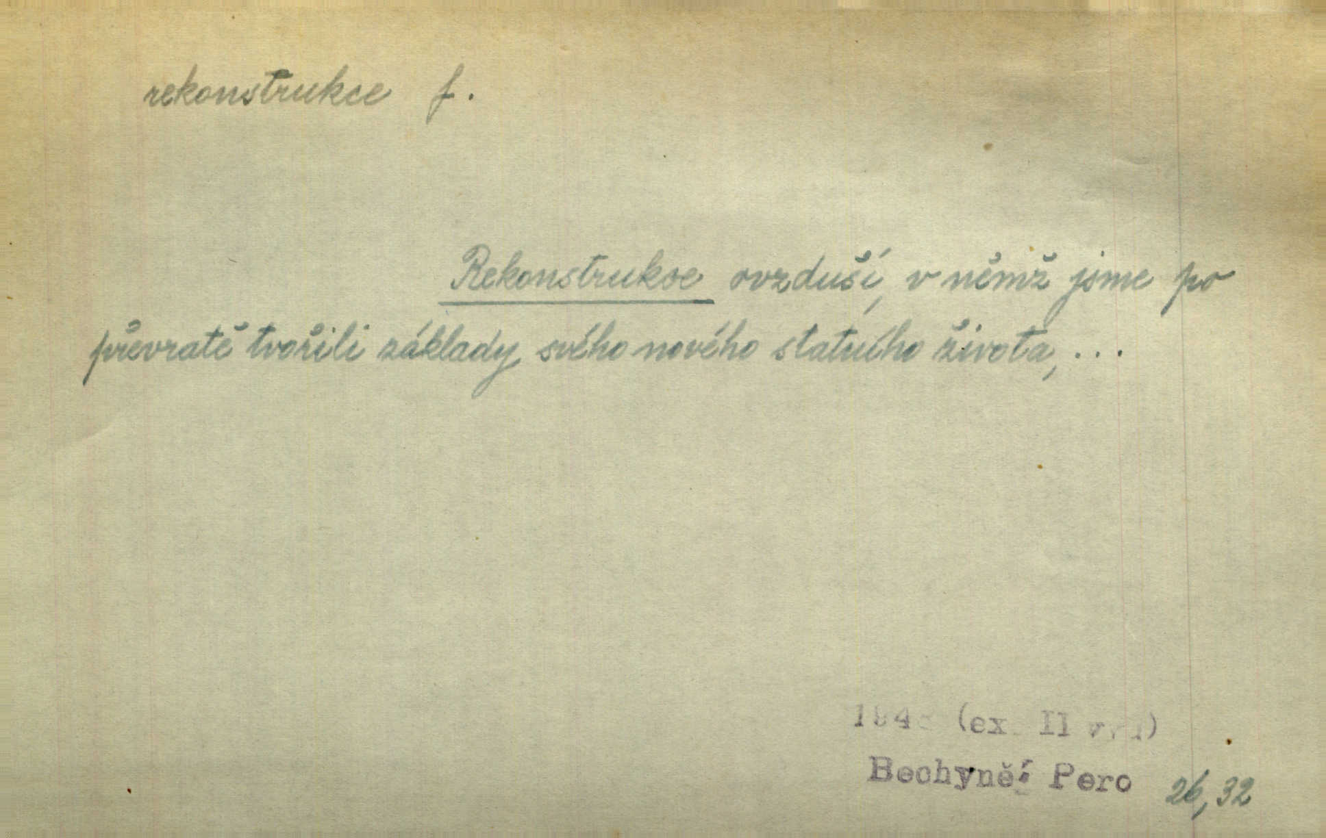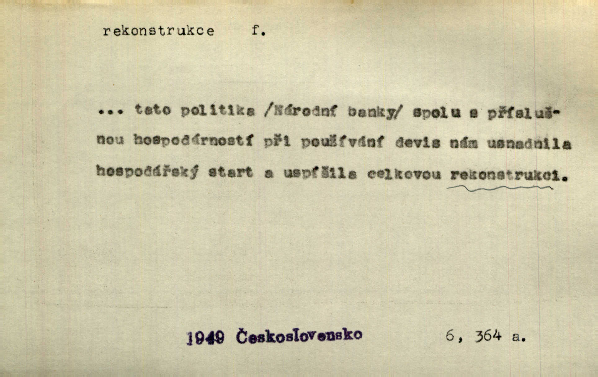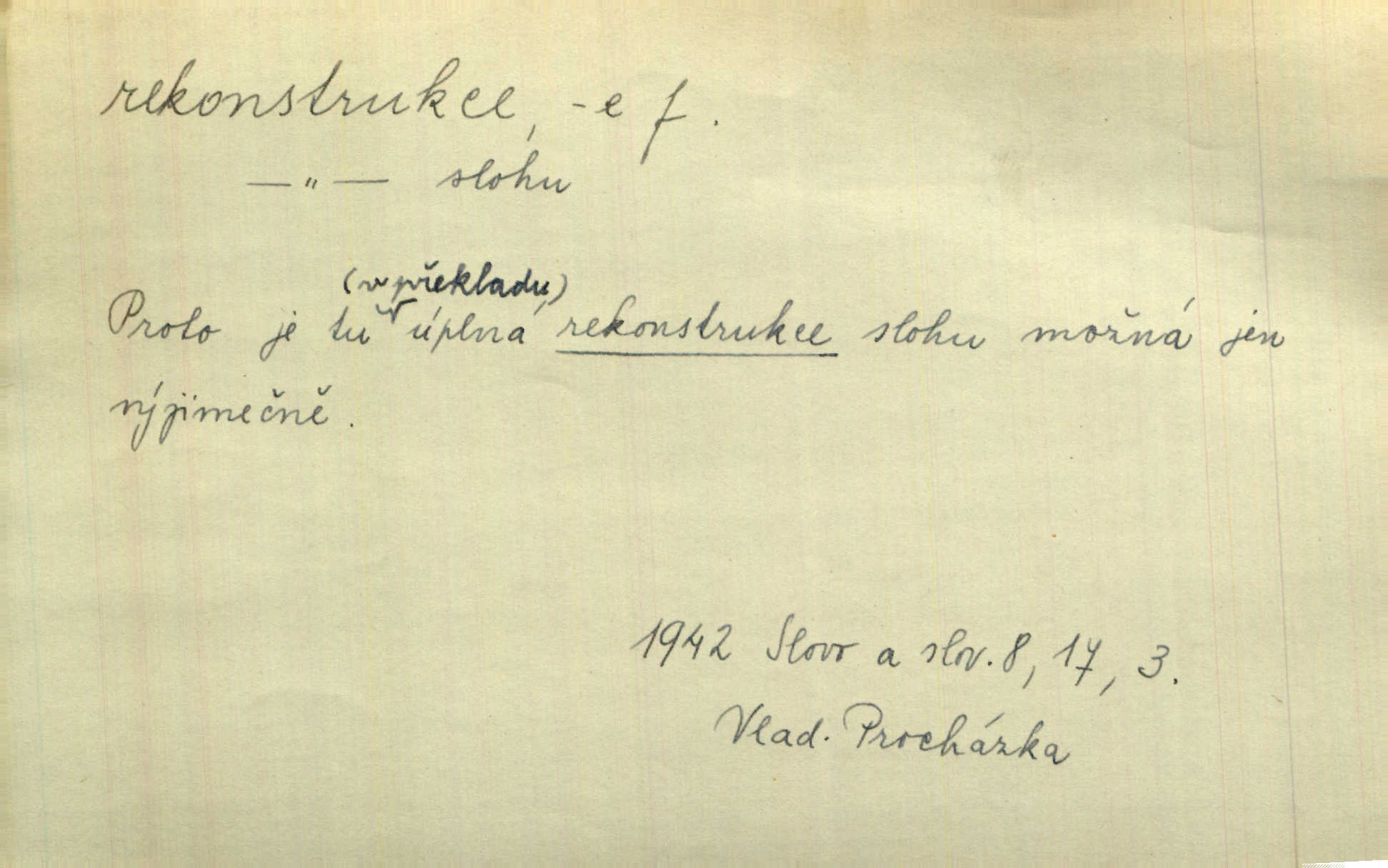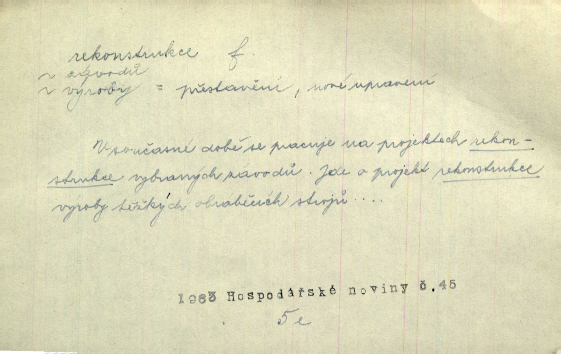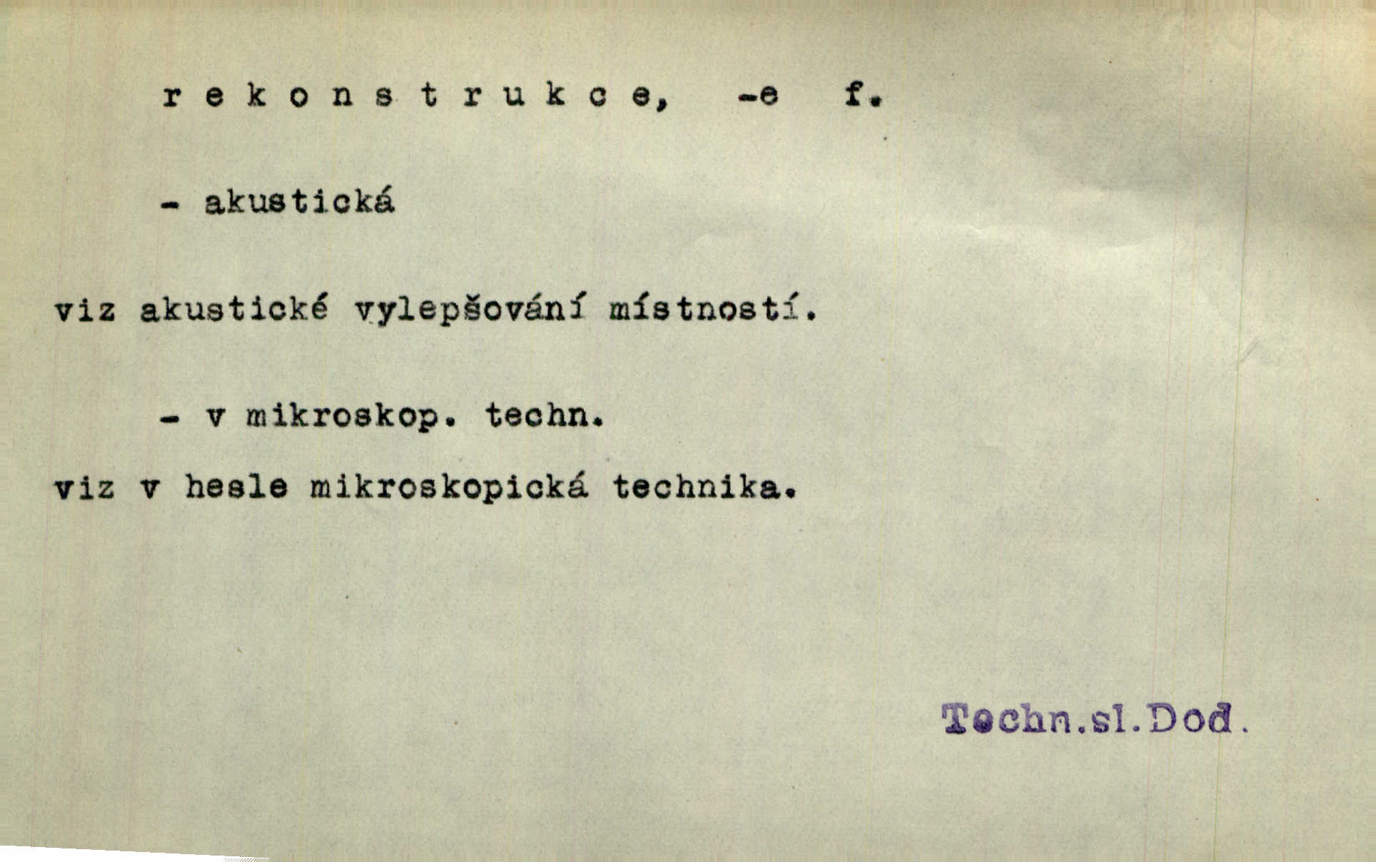 - rekonstrukce, -e f. opětné, nové sestrojení, sestavení, uvedení do původní podoby n. do původního průběhu. Nově provedená rekonstrukce [činu] znovu potvrdila, že šlo o sebevraždu. Nár. p. Státní zástupce navrhoval rekonstrukci na místě samotném. Lid. nov. Jsou to [kritisované hry] výseče z bohatého vesnického života koncipované jako rozhlasová pásma, výjevy a dějové rekonstrukce skutečnosti. Týd. rozhl. Napřed ne malou, ale rychlou rekonstrukci Václavského náměstí do let 1786—1790. Jir. Je to [kritisovaná kniha] víc než trpné vyvolávání minulých vznětů a zas to je méně nežli poetická rekonstrukce dětství. Sez. Srovnání všech recensí [„Vévody Arnošta“] a rekonstrukci nejst. textu provedl Bartsch. Tille. Geod. (ve fotogrammetrii) provedení základního úkolu, t. j. sestrojení pravoúhlých průmětů z daných perspektiv jakožto obráceného úkolu perspektivy. V mikroskopické technice hotovení prostorových modelů na základě řezových preparátů. D přestavba budovy n. pod. díla. [Stavitel] provedl rekonstrukci částí obou zámků, vystavěných Jindřichem IV. a Kateřinou de Medicis. Klost. Jak neměla mne [stavitele] vábiti rekonstrukce chrámu, v němž před tím sotva dovolil jsem si dýchati? Hilb. Bezmála tisíc dělníků zaměstnává nyní obec na svých podnicích, na rekonstrukci vodovodů a souvislé s tím úpravě rybníků i jiných vodních poměrů. Lier. D vůbec upravení něčeho jinak, předělání, přepracování. Jde o rekonstrukci celého stylu veřejného našeho života. V. Mrš. Rekonstrukce filmového podnikání však pokračovala dál. Smrž. Došlo k rekonstrukci vlády. Přít. Poválečná rekonstrukce.