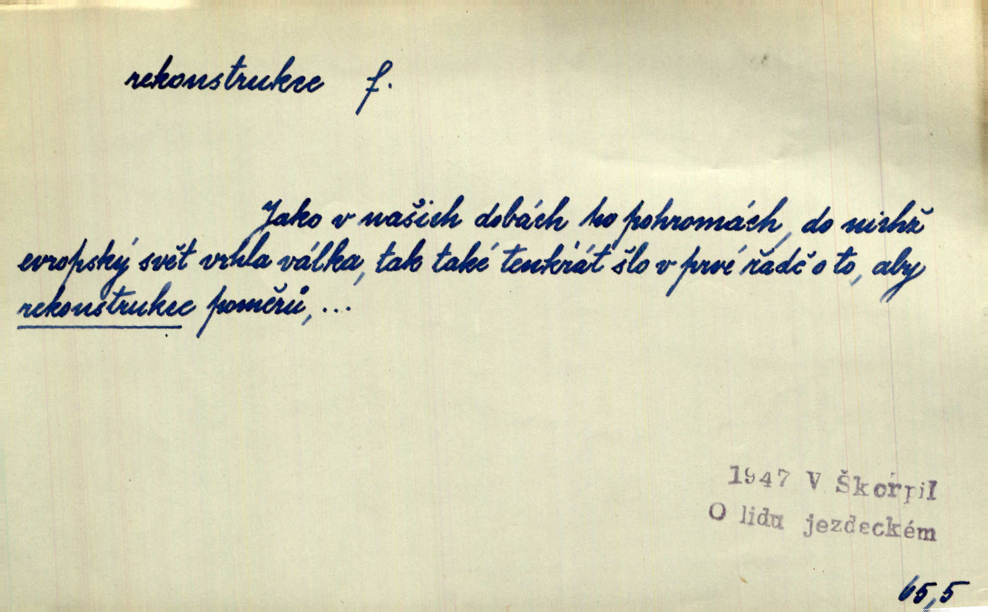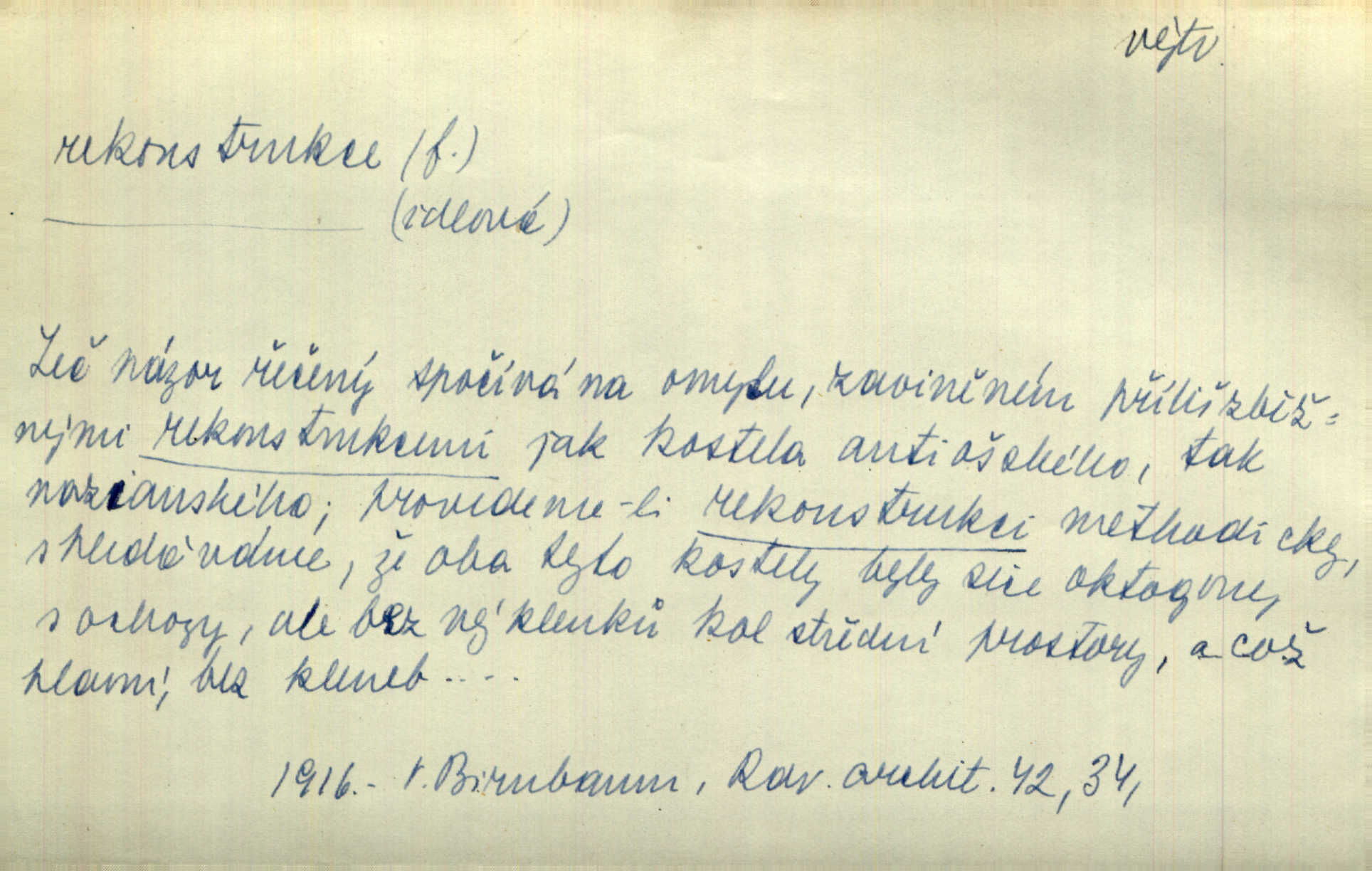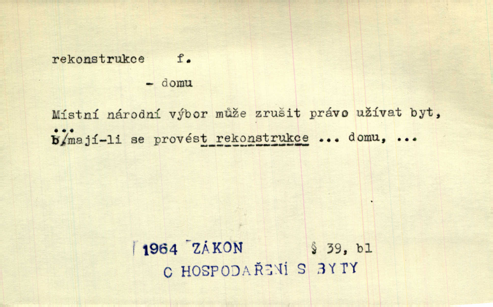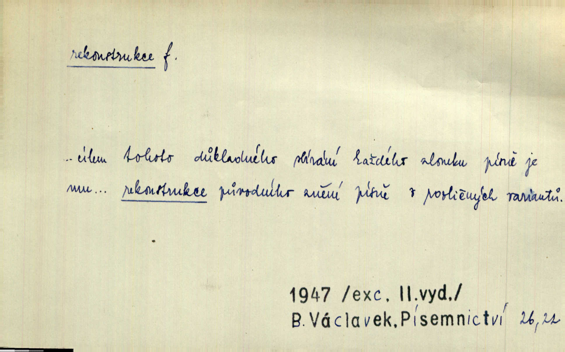 - rekonstrukce, -e f. opětné, nové sestrojení, sestavení, uvedení do původní podoby n. do původního průběhu. Nově provedená rekonstrukce [činu] znovu potvrdila, že šlo o sebevraždu. Nár. p. Státní zástupce navrhoval rekonstrukci na místě samotném. Lid. nov. Jsou to [kritisované hry] výseče z bohatého vesnického života koncipované jako rozhlasová pásma, výjevy a dějové rekonstrukce skutečnosti. Týd. rozhl. Napřed ne malou, ale rychlou rekonstrukci Václavského náměstí do let 1786—1790. Jir. Je to [kritisovaná kniha] víc než trpné vyvolávání minulých vznětů a zas to je méně nežli poetická rekonstrukce dětství. Sez. Srovnání všech recensí [„Vévody Arnošta“] a rekonstrukci nejst. textu provedl Bartsch. Tille. Geod. (ve fotogrammetrii) provedení základního úkolu, t. j. sestrojení pravoúhlých průmětů z daných perspektiv jakožto obráceného úkolu perspektivy. V mikroskopické technice hotovení prostorových modelů na základě řezových preparátů. D přestavba budovy n. pod. díla. [Stavitel] provedl rekonstrukci částí obou zámků, vystavěných Jindřichem IV. a Kateřinou de Medicis. Klost. Jak neměla mne [stavitele] vábiti rekonstrukce chrámu, v němž před tím sotva dovolil jsem si dýchati? Hilb. Bezmála tisíc dělníků zaměstnává nyní obec na svých podnicích, na rekonstrukci vodovodů a souvislé s tím úpravě rybníků i jiných vodních poměrů. Lier. D vůbec upravení něčeho jinak, předělání, přepracování. Jde o rekonstrukci celého stylu veřejného našeho života. V. Mrš. Rekonstrukce filmového podnikání však pokračovala dál. Smrž. Došlo k rekonstrukci vlády. Přít. Poválečná rekonstrukce.