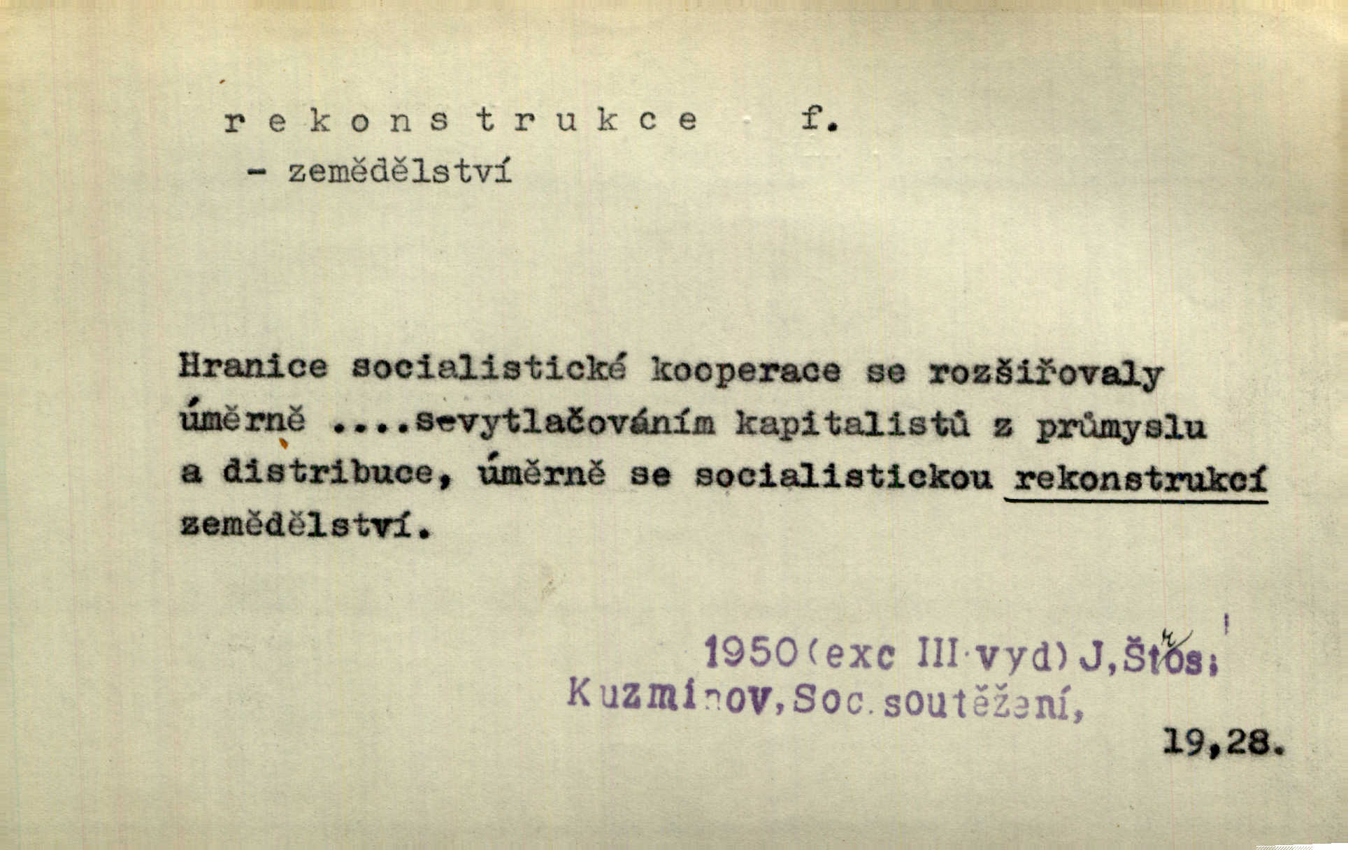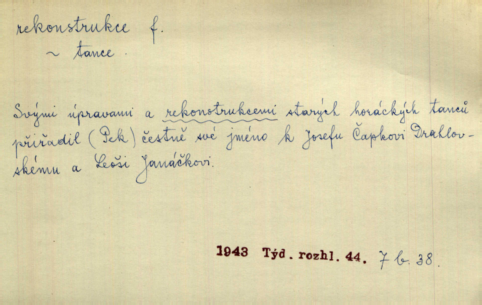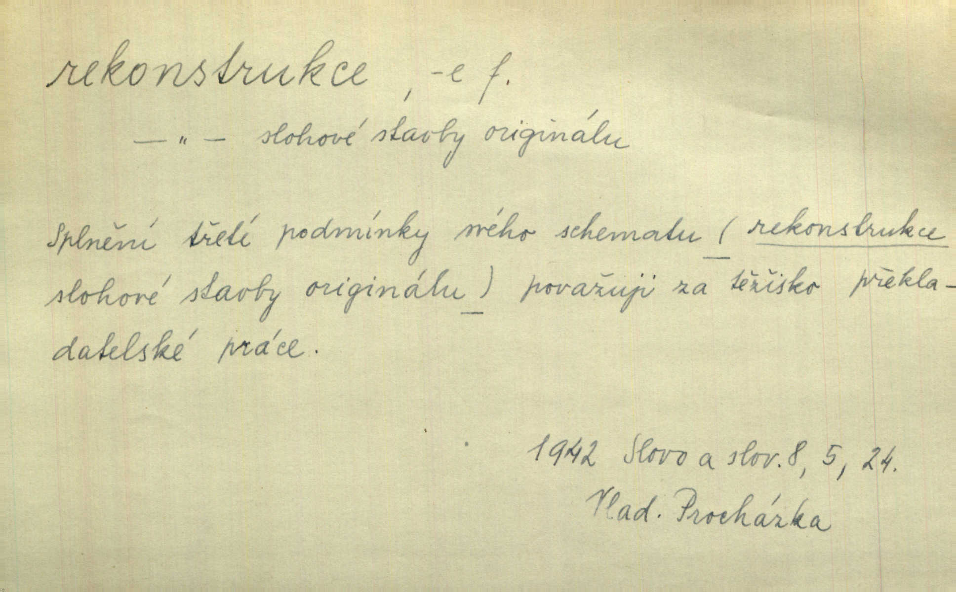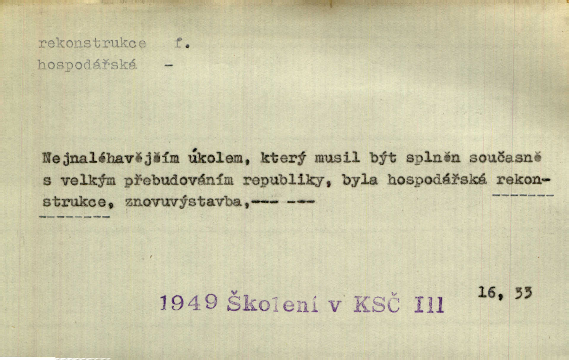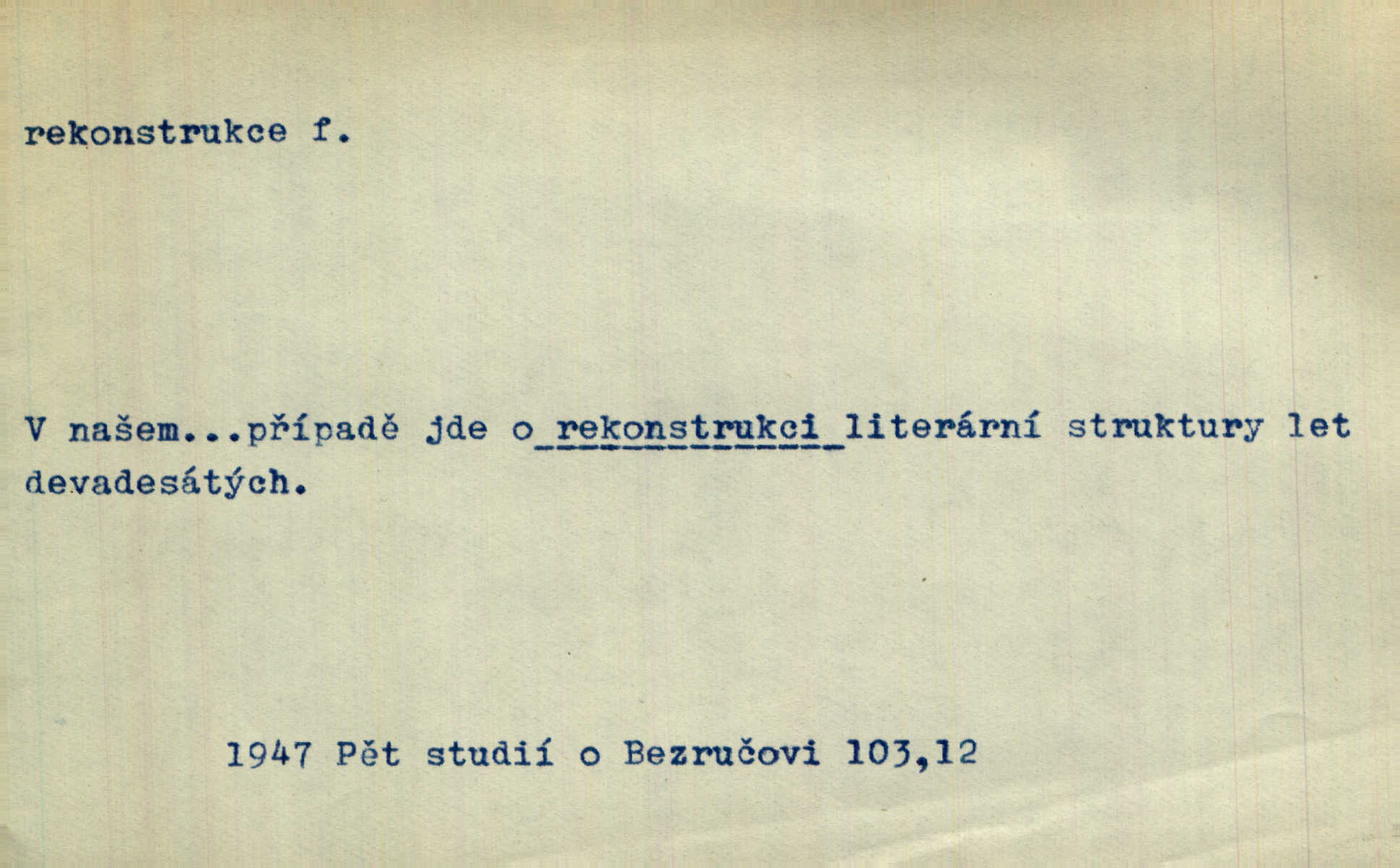 - rekonstrukce, -e f. opětné, nové sestrojení, sestavení, uvedení do původní podoby n. do původního průběhu. Nově provedená rekonstrukce [činu] znovu potvrdila, že šlo o sebevraždu. Nár. p. Státní zástupce navrhoval rekonstrukci na místě samotném. Lid. nov. Jsou to [kritisované hry] výseče z bohatého vesnického života koncipované jako rozhlasová pásma, výjevy a dějové rekonstrukce skutečnosti. Týd. rozhl. Napřed ne malou, ale rychlou rekonstrukci Václavského náměstí do let 1786—1790. Jir. Je to [kritisovaná kniha] víc než trpné vyvolávání minulých vznětů a zas to je méně nežli poetická rekonstrukce dětství. Sez. Srovnání všech recensí [„Vévody Arnošta“] a rekonstrukci nejst. textu provedl Bartsch. Tille. Geod. (ve fotogrammetrii) provedení základního úkolu, t. j. sestrojení pravoúhlých průmětů z daných perspektiv jakožto obráceného úkolu perspektivy. V mikroskopické technice hotovení prostorových modelů na základě řezových preparátů. D přestavba budovy n. pod. díla. [Stavitel] provedl rekonstrukci částí obou zámků, vystavěných Jindřichem IV. a Kateřinou de Medicis. Klost. Jak neměla mne [stavitele] vábiti rekonstrukce chrámu, v němž před tím sotva dovolil jsem si dýchati? Hilb. Bezmála tisíc dělníků zaměstnává nyní obec na svých podnicích, na rekonstrukci vodovodů a souvislé s tím úpravě rybníků i jiných vodních poměrů. Lier. D vůbec upravení něčeho jinak, předělání, přepracování. Jde o rekonstrukci celého stylu veřejného našeho života. V. Mrš. Rekonstrukce filmového podnikání však pokračovala dál. Smrž. Došlo k rekonstrukci vlády. Přít. Poválečná rekonstrukce.