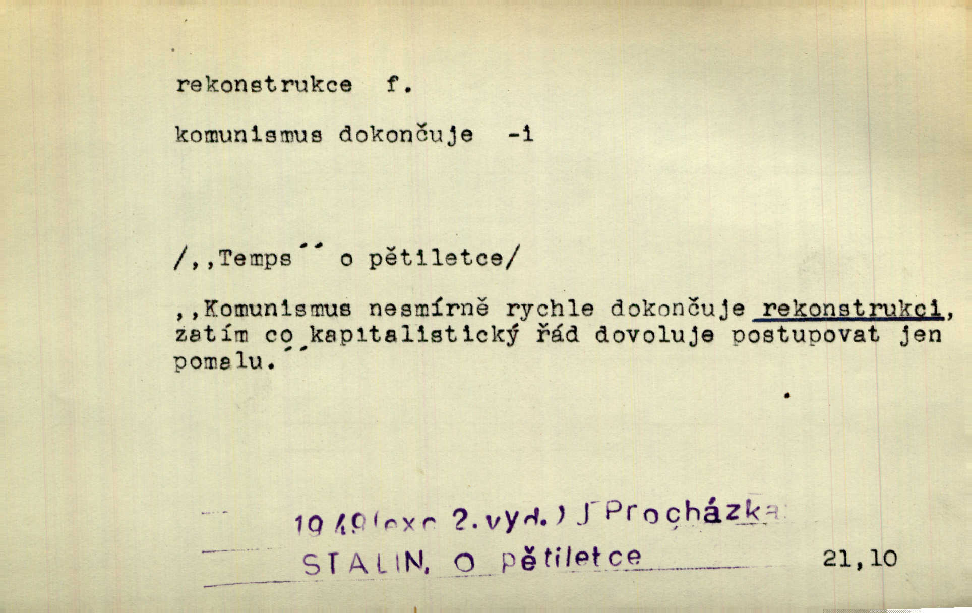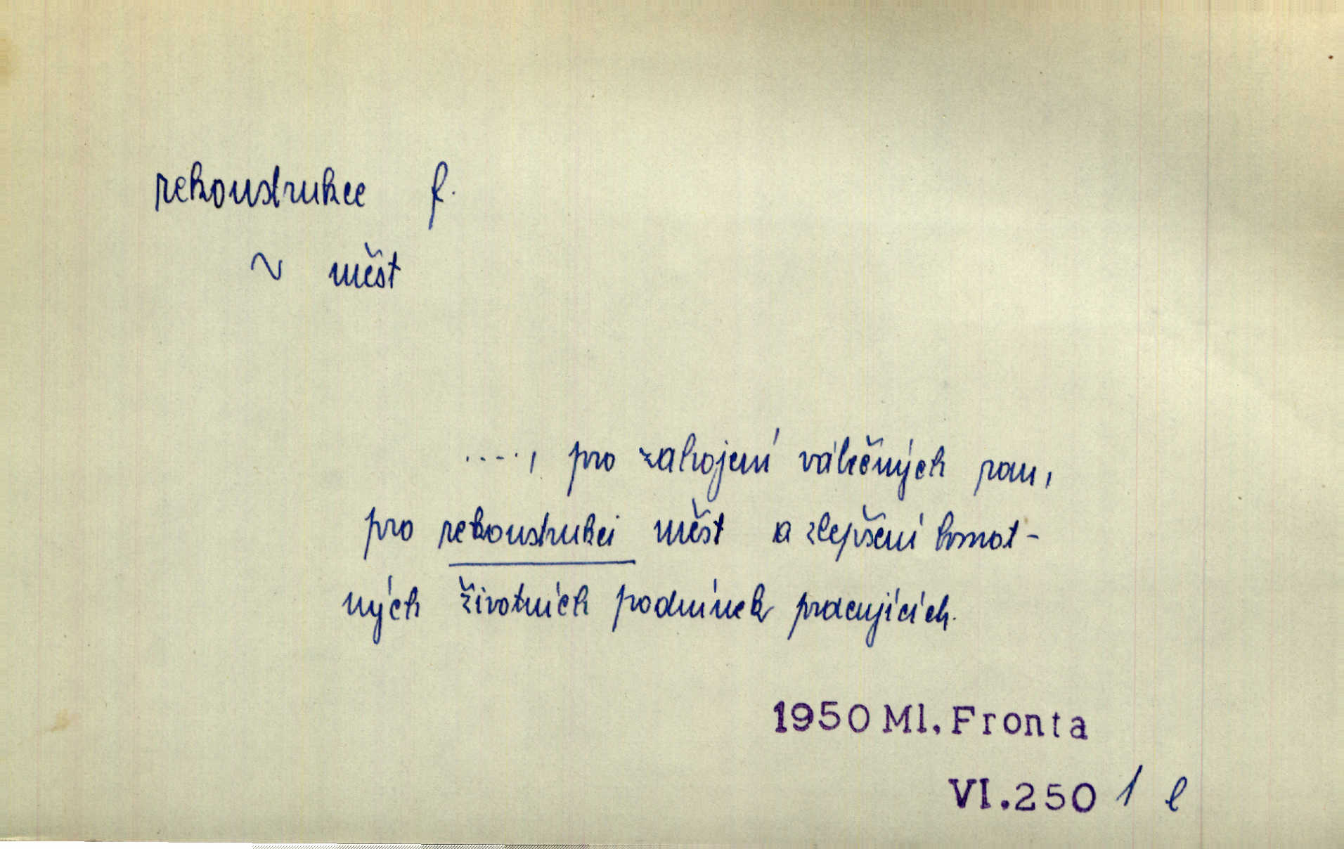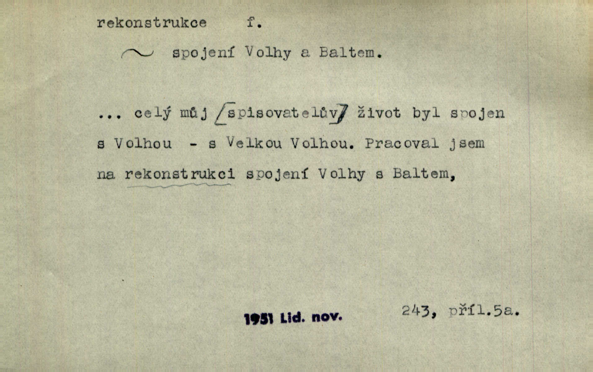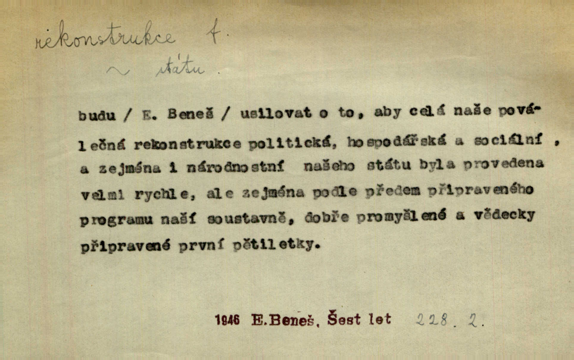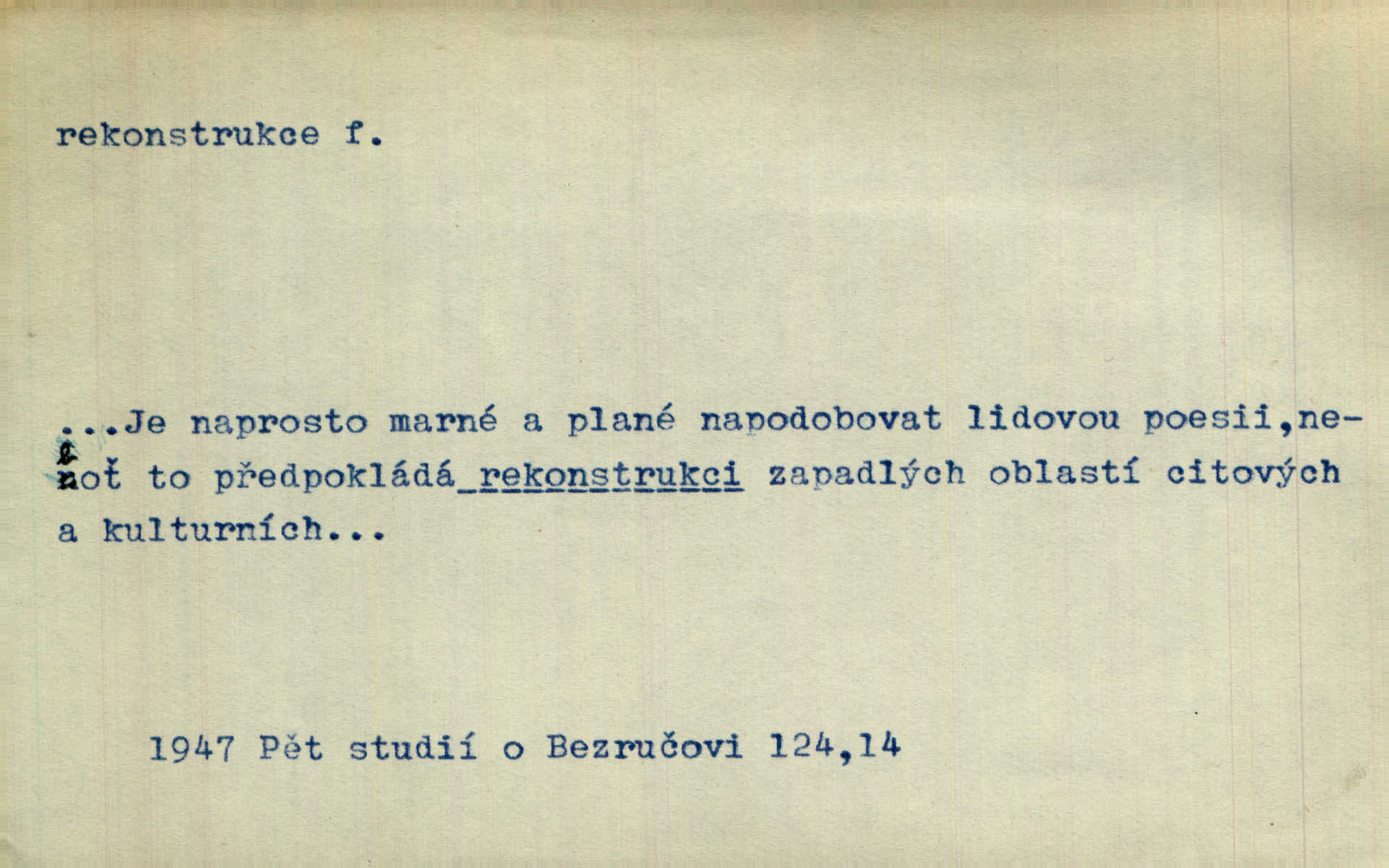 - rekonstrukce, -e f. opětné, nové sestrojení, sestavení, uvedení do původní podoby n. do původního průběhu. Nově provedená rekonstrukce [činu] znovu potvrdila, že šlo o sebevraždu. Nár. p. Státní zástupce navrhoval rekonstrukci na místě samotném. Lid. nov. Jsou to [kritisované hry] výseče z bohatého vesnického života koncipované jako rozhlasová pásma, výjevy a dějové rekonstrukce skutečnosti. Týd. rozhl. Napřed ne malou, ale rychlou rekonstrukci Václavského náměstí do let 1786—1790. Jir. Je to [kritisovaná kniha] víc než trpné vyvolávání minulých vznětů a zas to je méně nežli poetická rekonstrukce dětství. Sez. Srovnání všech recensí [„Vévody Arnošta“] a rekonstrukci nejst. textu provedl Bartsch. Tille. Geod. (ve fotogrammetrii) provedení základního úkolu, t. j. sestrojení pravoúhlých průmětů z daných perspektiv jakožto obráceného úkolu perspektivy. V mikroskopické technice hotovení prostorových modelů na základě řezových preparátů. D přestavba budovy n. pod. díla. [Stavitel] provedl rekonstrukci částí obou zámků, vystavěných Jindřichem IV. a Kateřinou de Medicis. Klost. Jak neměla mne [stavitele] vábiti rekonstrukce chrámu, v němž před tím sotva dovolil jsem si dýchati? Hilb. Bezmála tisíc dělníků zaměstnává nyní obec na svých podnicích, na rekonstrukci vodovodů a souvislé s tím úpravě rybníků i jiných vodních poměrů. Lier. D vůbec upravení něčeho jinak, předělání, přepracování. Jde o rekonstrukci celého stylu veřejného našeho života. V. Mrš. Rekonstrukce filmového podnikání však pokračovala dál. Smrž. Došlo k rekonstrukci vlády. Přít. Poválečná rekonstrukce.