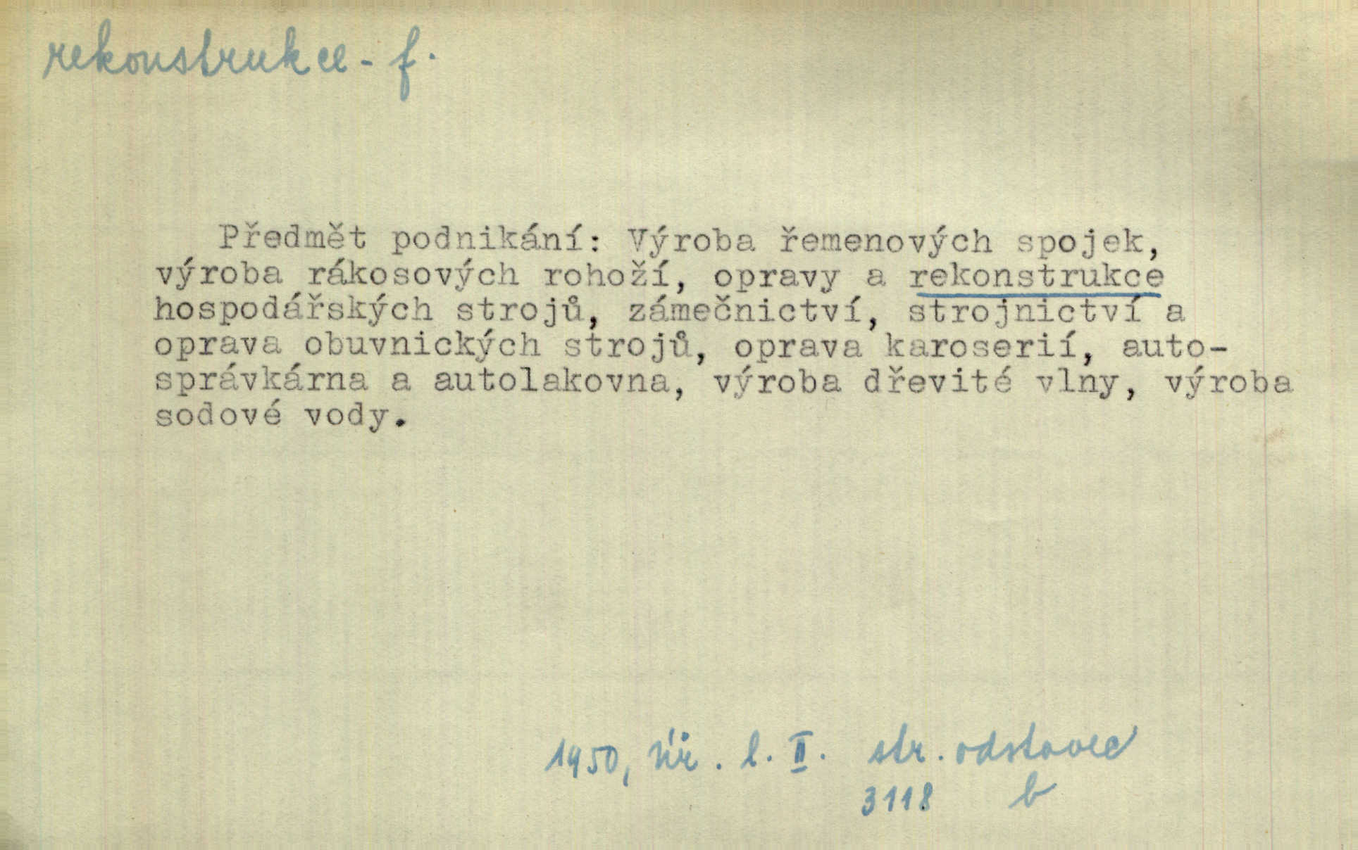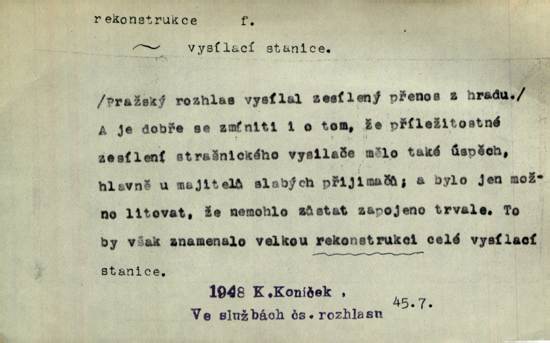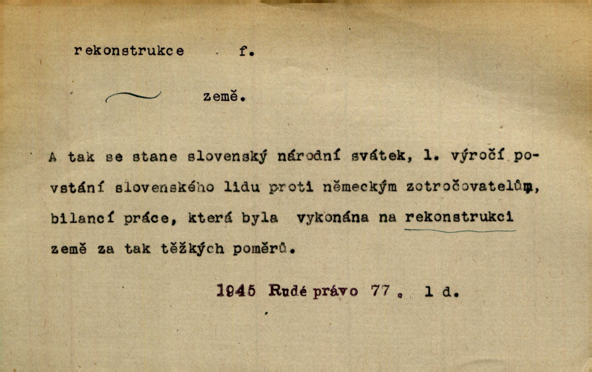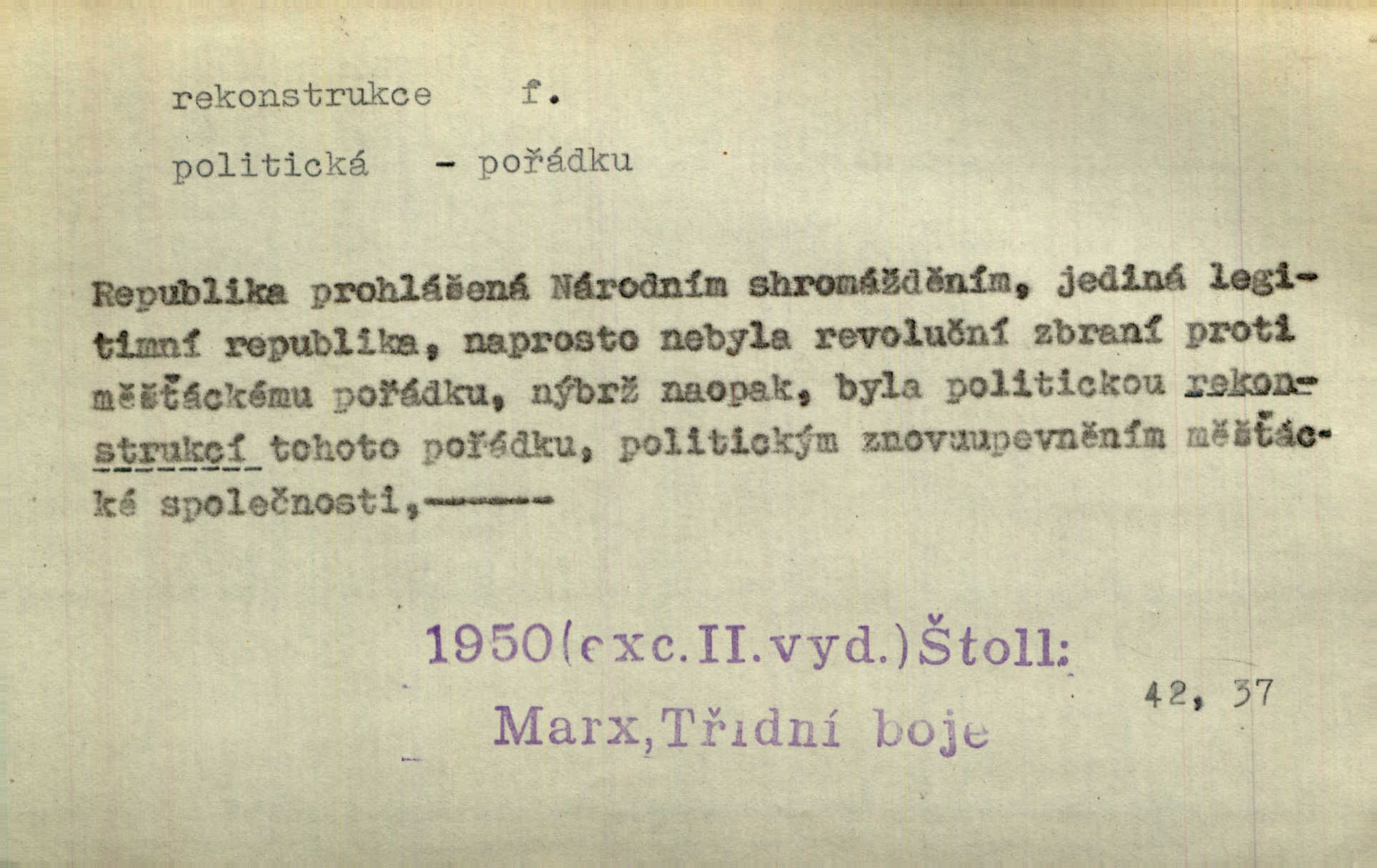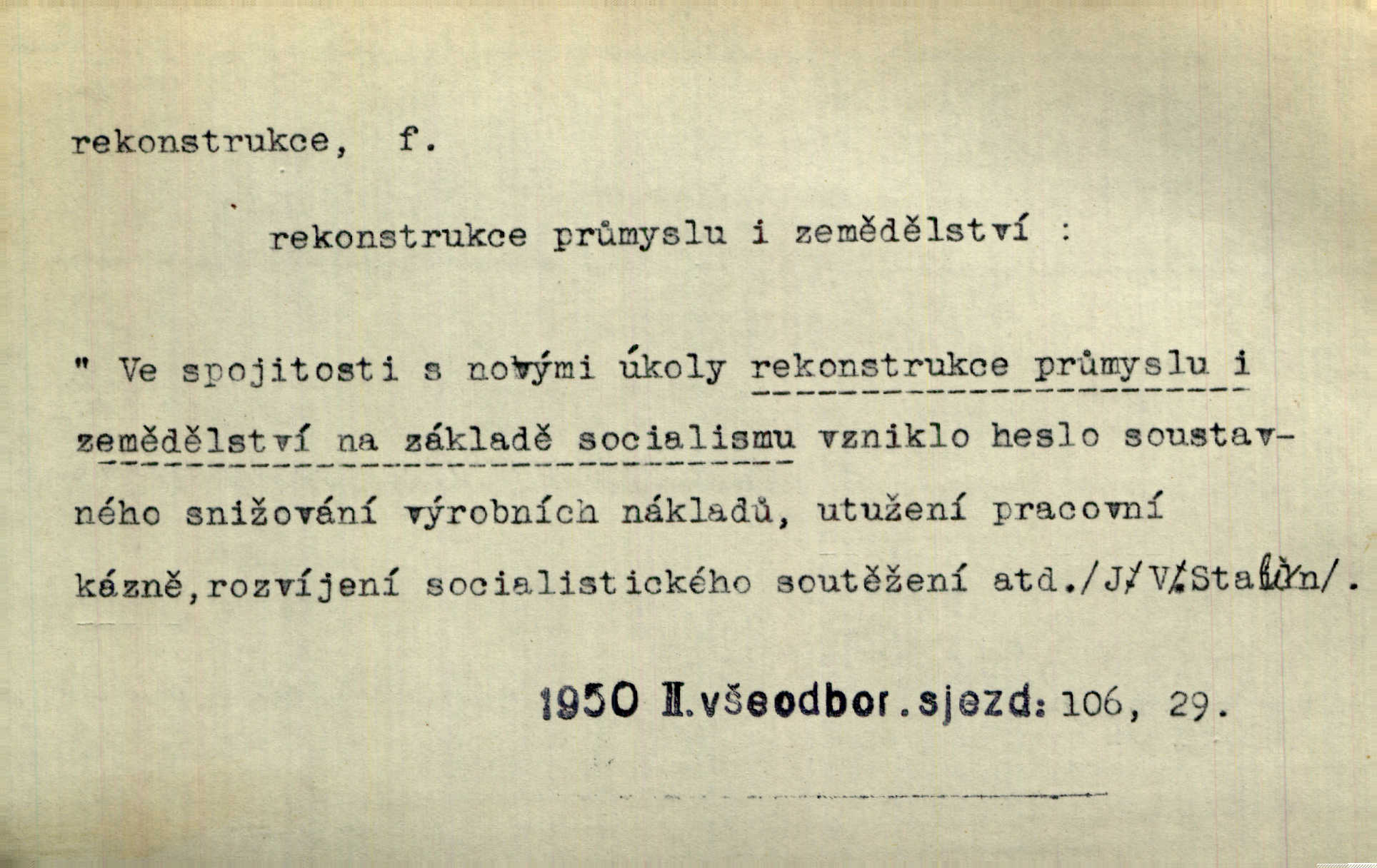 - rekonstrukce, -e f. opětné, nové sestrojení, sestavení, uvedení do původní podoby n. do původního průběhu. Nově provedená rekonstrukce [činu] znovu potvrdila, že šlo o sebevraždu. Nár. p. Státní zástupce navrhoval rekonstrukci na místě samotném. Lid. nov. Jsou to [kritisované hry] výseče z bohatého vesnického života koncipované jako rozhlasová pásma, výjevy a dějové rekonstrukce skutečnosti. Týd. rozhl. Napřed ne malou, ale rychlou rekonstrukci Václavského náměstí do let 1786—1790. Jir. Je to [kritisovaná kniha] víc než trpné vyvolávání minulých vznětů a zas to je méně nežli poetická rekonstrukce dětství. Sez. Srovnání všech recensí [„Vévody Arnošta“] a rekonstrukci nejst. textu provedl Bartsch. Tille. Geod. (ve fotogrammetrii) provedení základního úkolu, t. j. sestrojení pravoúhlých průmětů z daných perspektiv jakožto obráceného úkolu perspektivy. V mikroskopické technice hotovení prostorových modelů na základě řezových preparátů. D přestavba budovy n. pod. díla. [Stavitel] provedl rekonstrukci částí obou zámků, vystavěných Jindřichem IV. a Kateřinou de Medicis. Klost. Jak neměla mne [stavitele] vábiti rekonstrukce chrámu, v němž před tím sotva dovolil jsem si dýchati? Hilb. Bezmála tisíc dělníků zaměstnává nyní obec na svých podnicích, na rekonstrukci vodovodů a souvislé s tím úpravě rybníků i jiných vodních poměrů. Lier. D vůbec upravení něčeho jinak, předělání, přepracování. Jde o rekonstrukci celého stylu veřejného našeho života. V. Mrš. Rekonstrukce filmového podnikání však pokračovala dál. Smrž. Došlo k rekonstrukci vlády. Přít. Poválečná rekonstrukce.