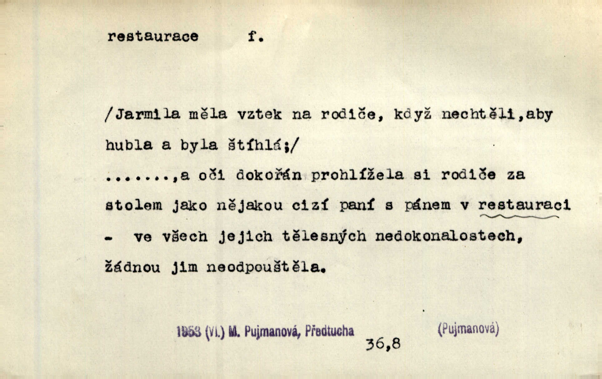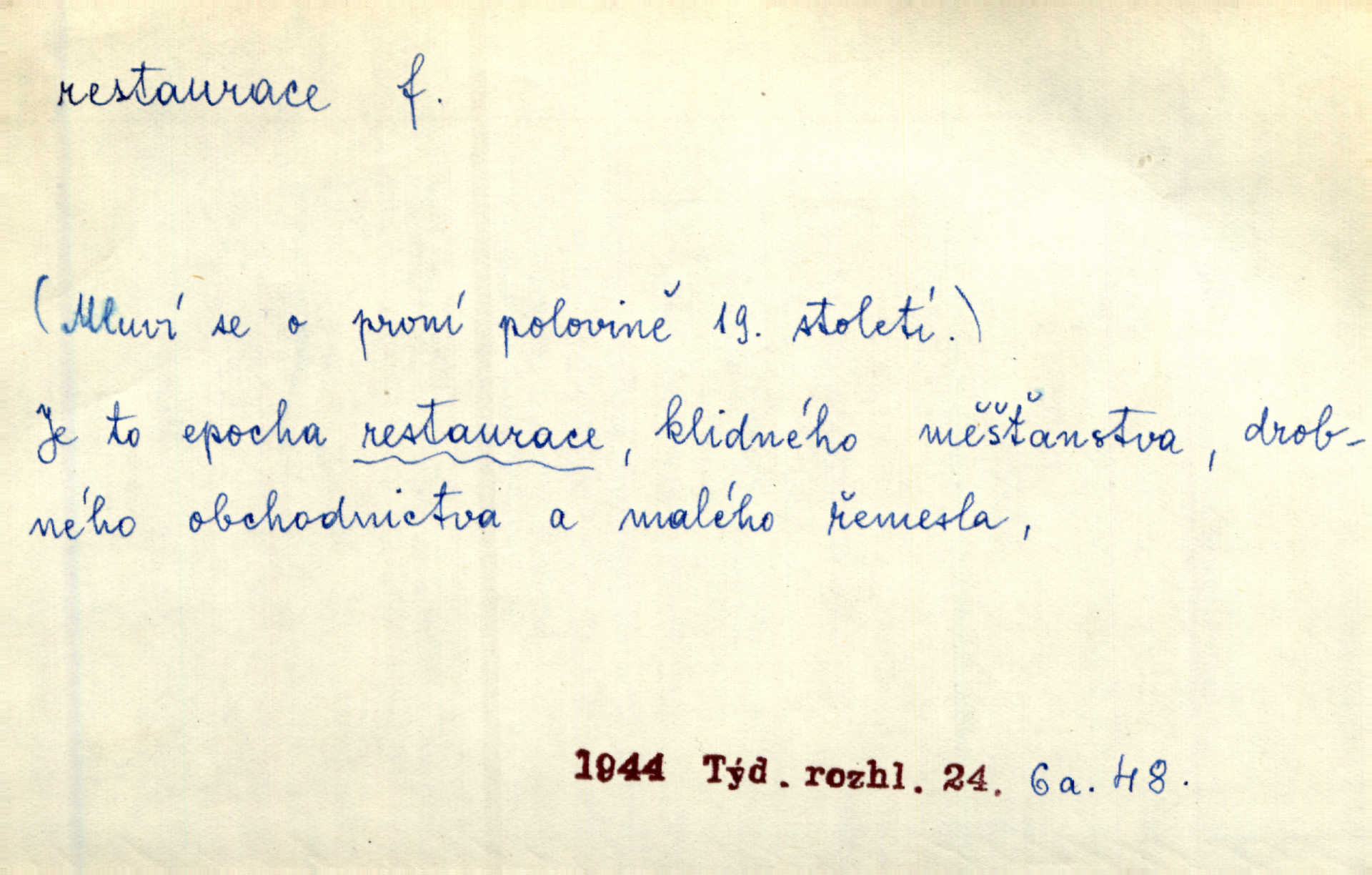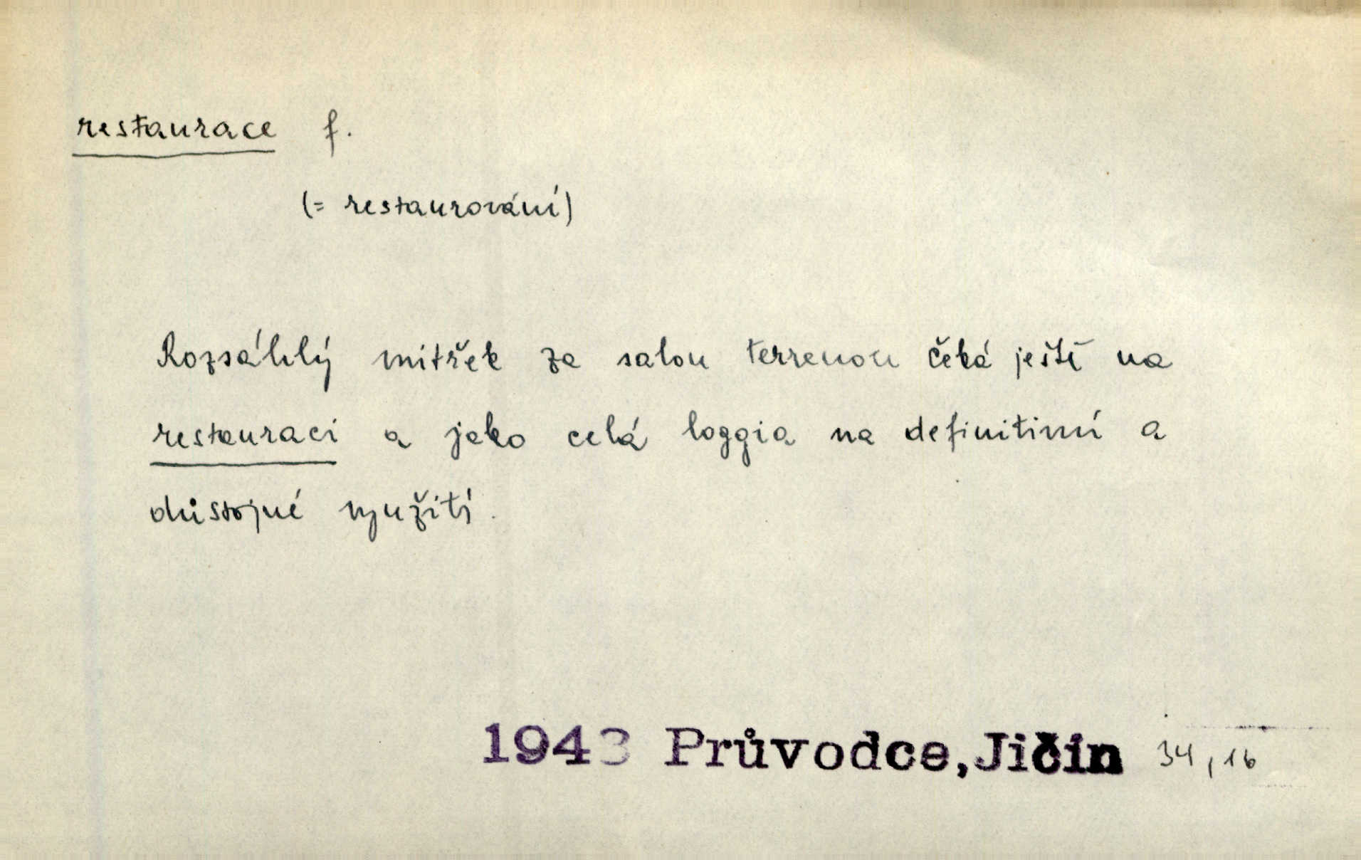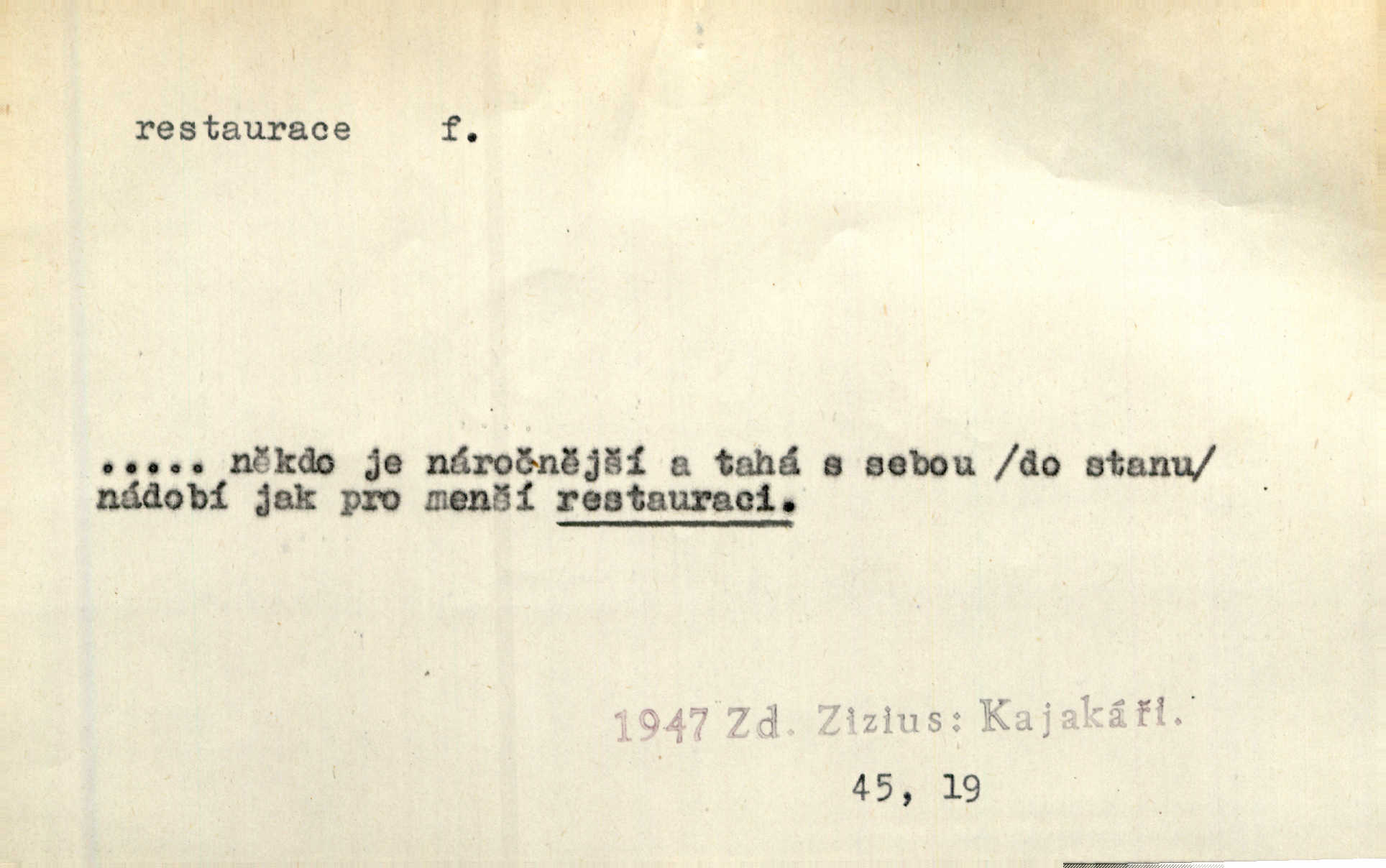 - restaurace, -e f. 1. lepší hostinská živnost, určená k podávání pokrmů i nápojů, lepší hostinec. Seděl jsem v restauraci smíchovského nádraží. Čap. Ch. Však se bude večeřet v dolejší restauraci Měšťanské besedy. Herrm.