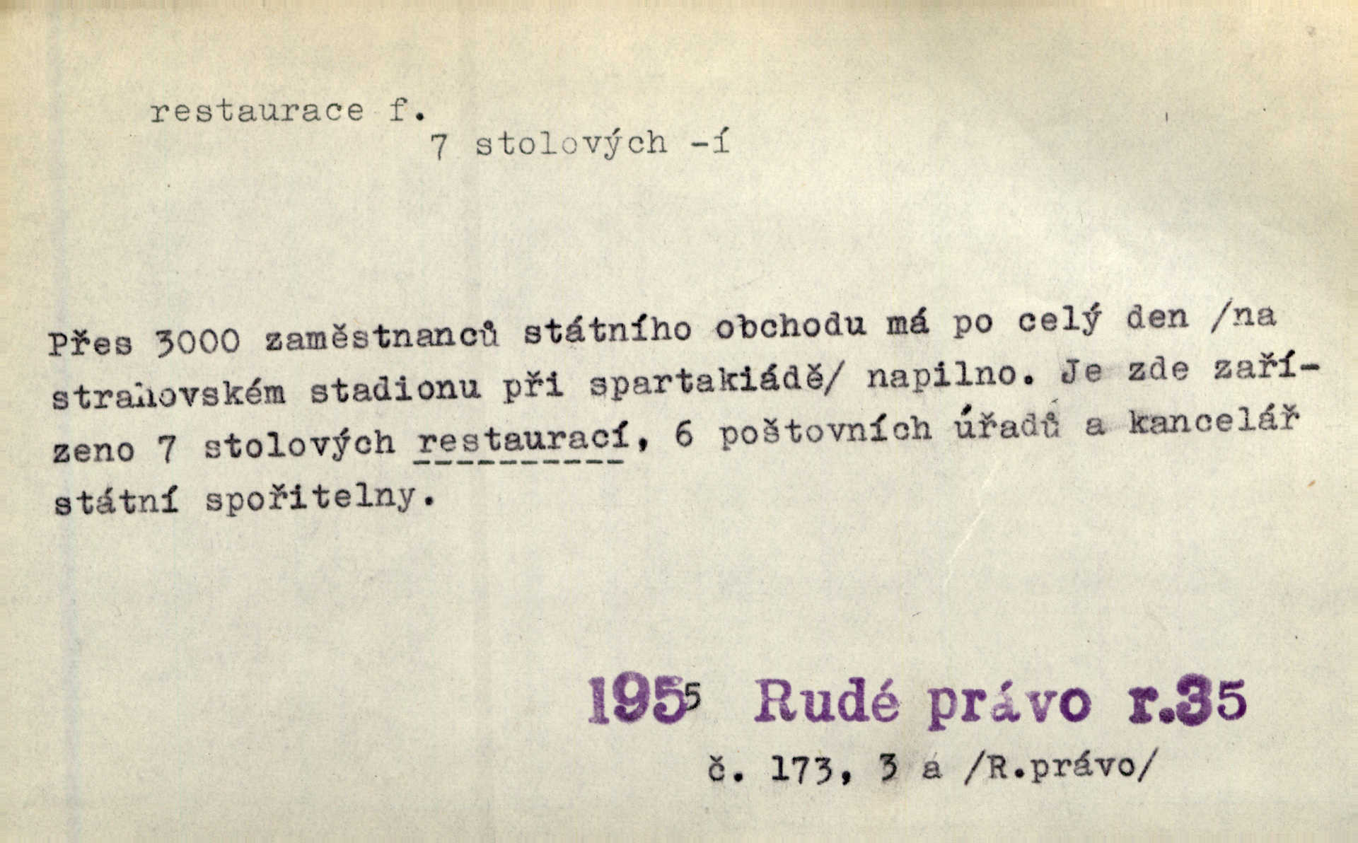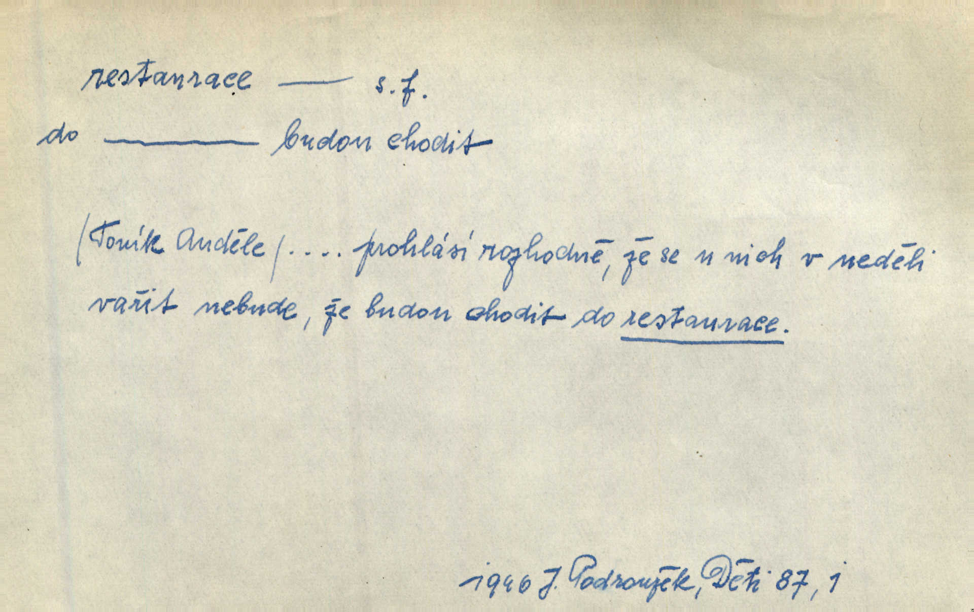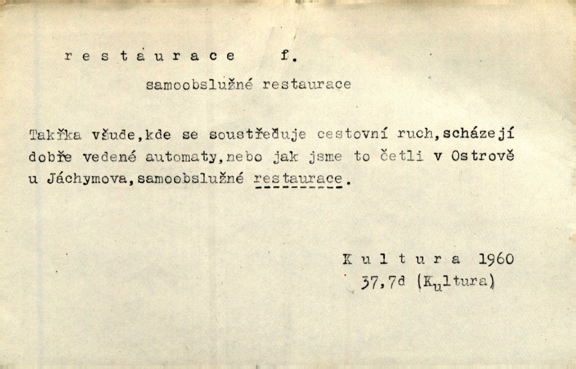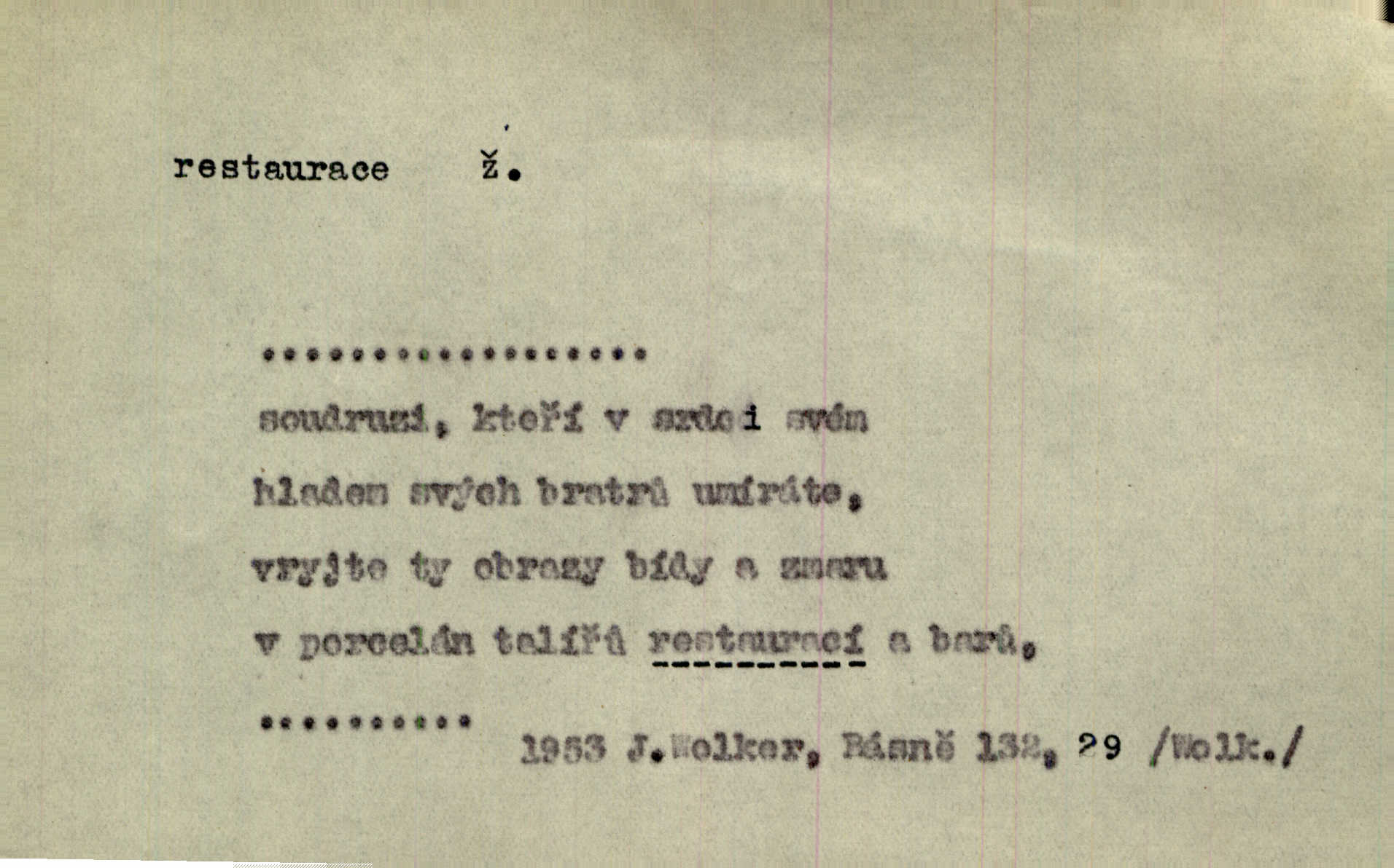 - restaurace, -e f. 1. lepší hostinská živnost, určená k podávání pokrmů i nápojů, lepší hostinec. Seděl jsem v restauraci smíchovského nádraží. Čap. Ch. Však se bude večeřet v dolejší restauraci Měšťanské besedy. Herrm.