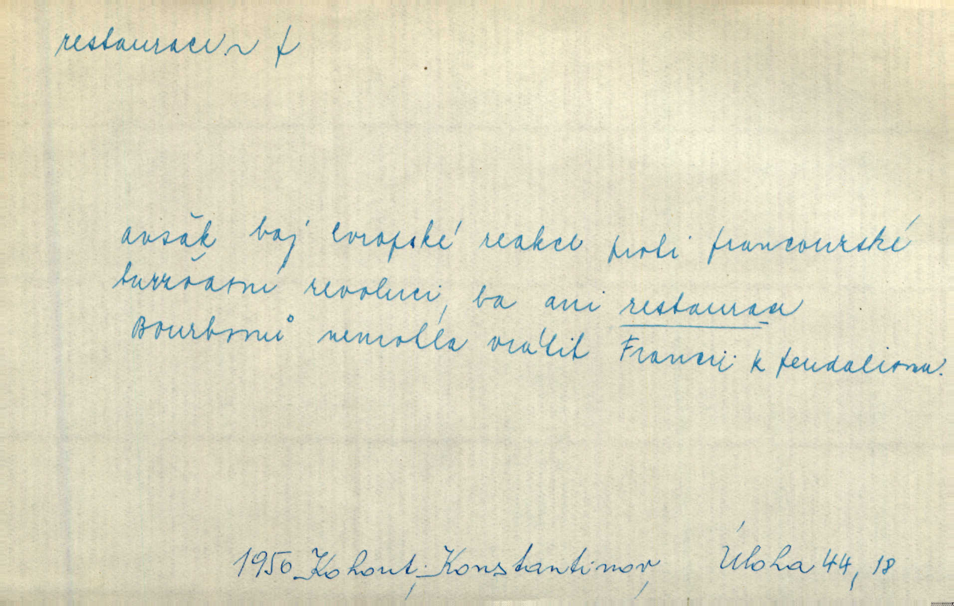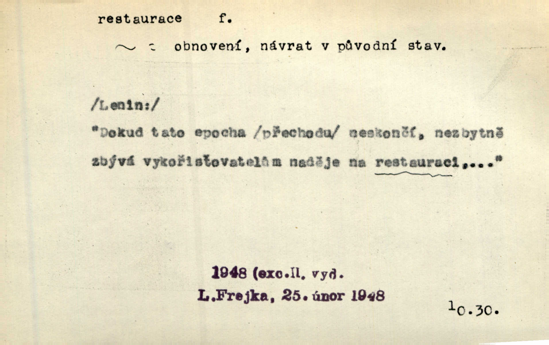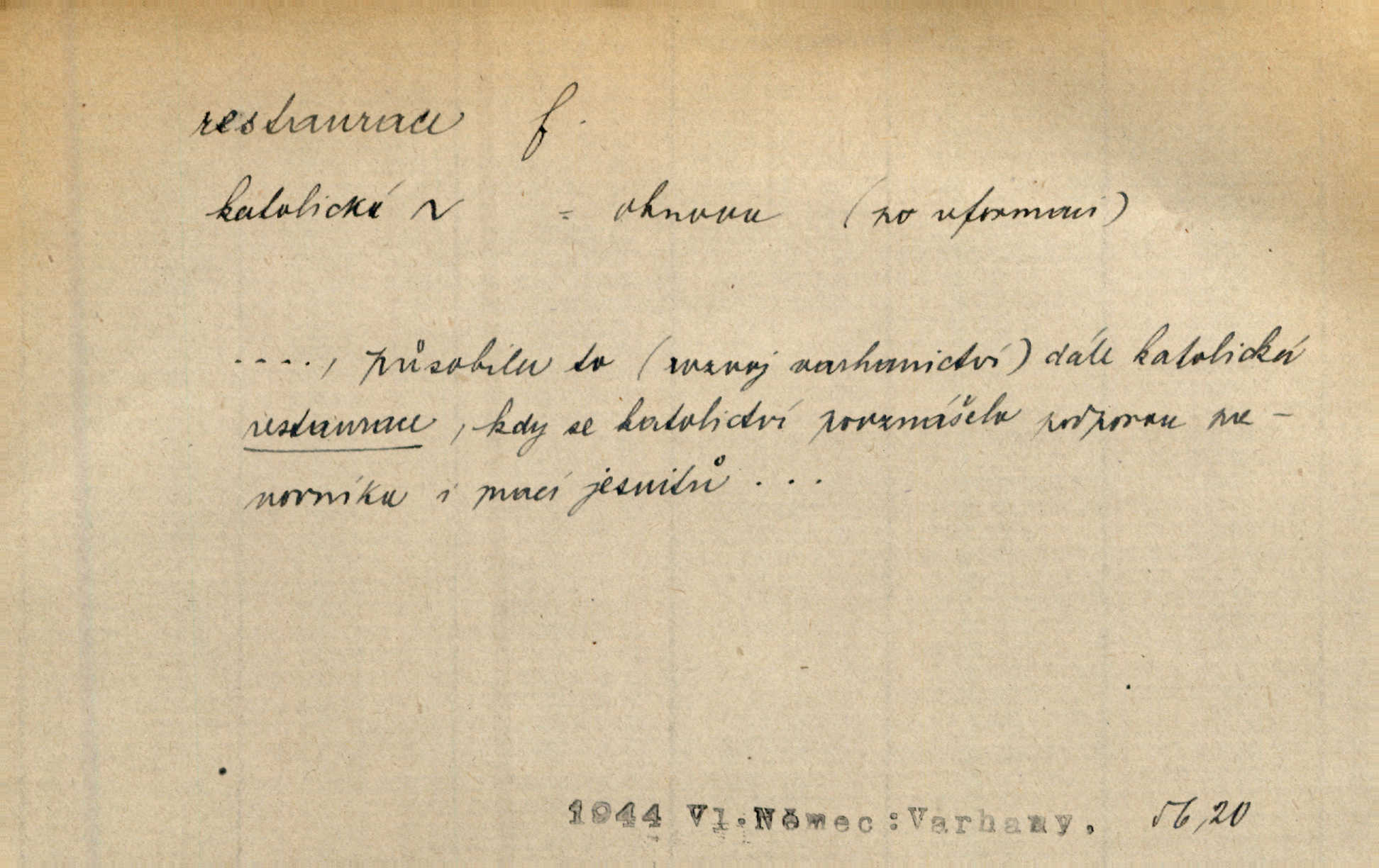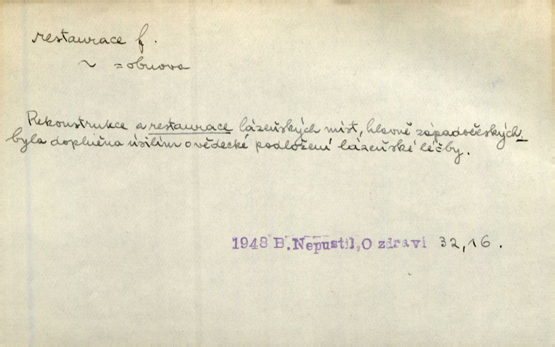 - restaurace (zast. restaurací, -í) f. 2. důkladná oprava, přestavba, úprava, zvl. uměleckého díla. Co se dá zachovat z minulosti [staré Prahy] bez ujmy požadavků živých — dobrá, zachovejme. Ale i při takových restauracích pozor! Mach. Tehdy byla Riedlovi zadána restaurace obrazů jistého starobylého zámku blízko Prahy. Matějček. Restaurace nového kostela po požáru trvala pět let. Pek. Restaurace zpustošených krajů a nedostatek pracovních sil zaviněný depopulací učinily po několik let z Francie mocné středisko immigrační. Boh. Obch. znovuzřízení, obnovení podniku jako celku n. jeho částí n. zařízení. D opětné přivedení k platnosti, moci, zvl. obnovení státního útvaru předtím násilím odstraněného. Mezi nimi [poslanci] známý podporovatel revisionismu a restaurace Habsburků. Přít. Chtěli proti vůli svých přátel stavovských provésti restaurací moci královské a tím povznésti zemi z úpadku. Rez. Po pádu Napoleona zavedena jest přičiněním mocnářů restaurace, to jest obnovení staré vlády. Havl. Pod hesly restaurace, po případě i reakce vraceli se [po francouzské revoluci] ke starším principiím. Mas. Lék je jen v restauraci intelektualismu. Šal.