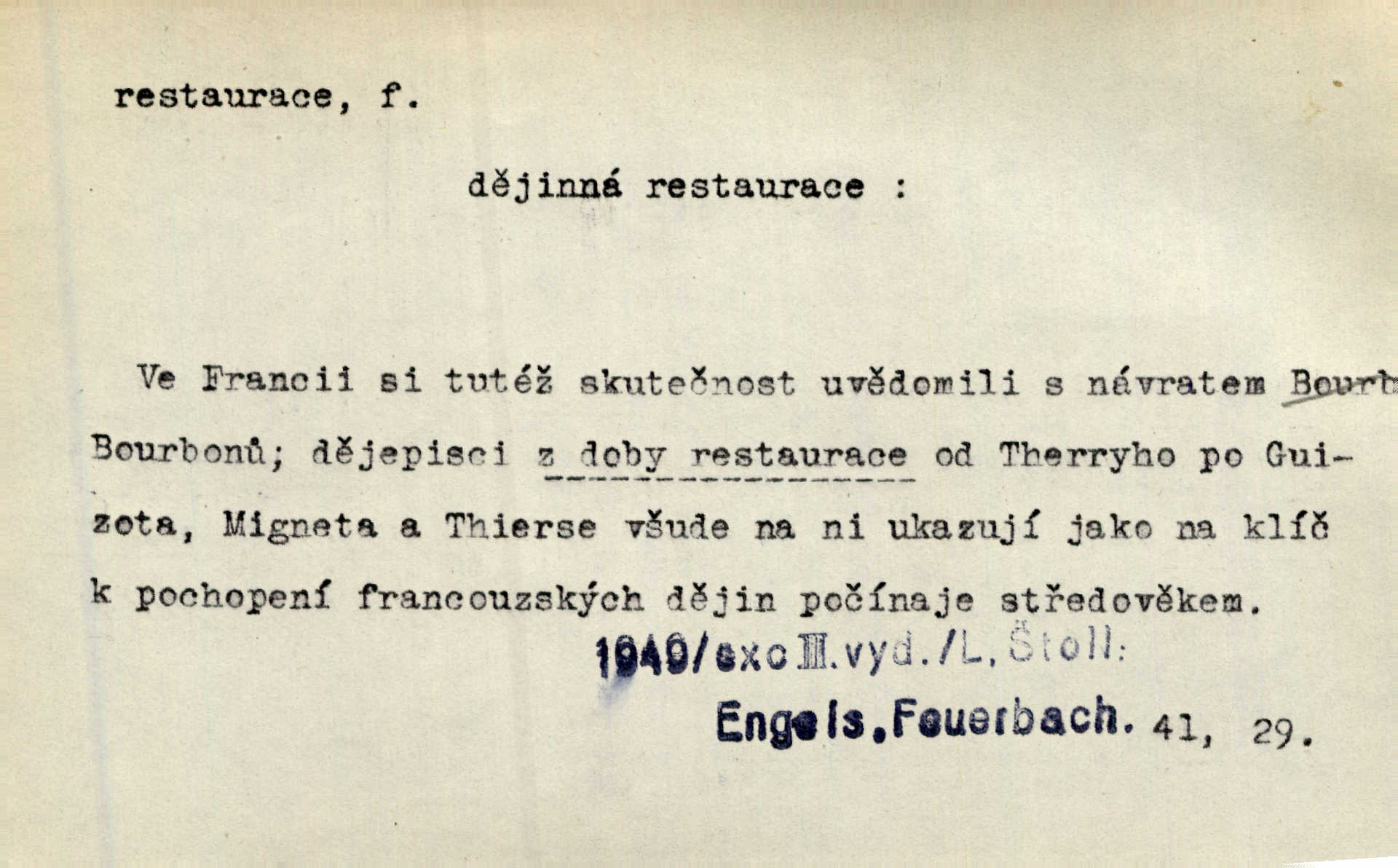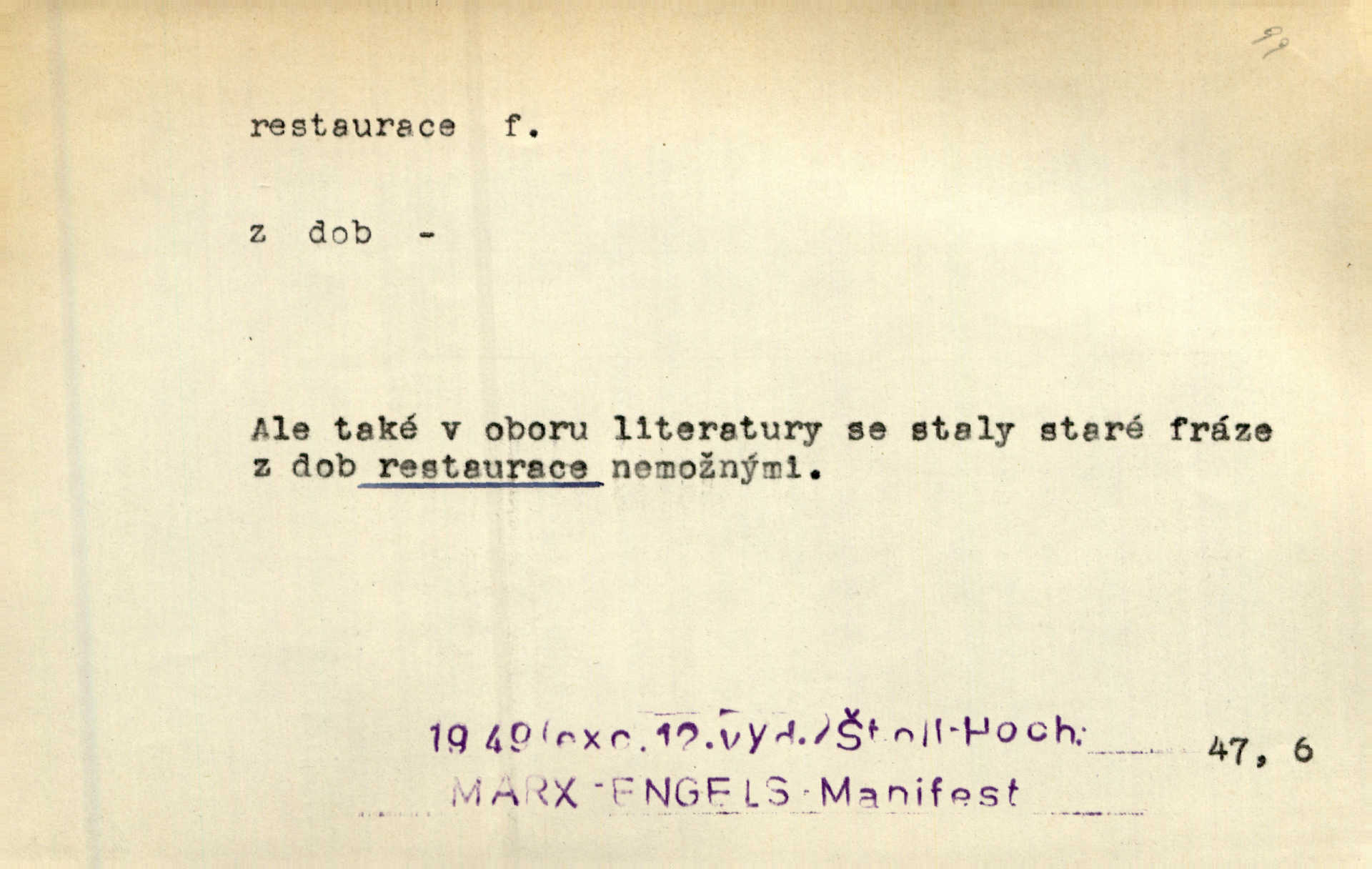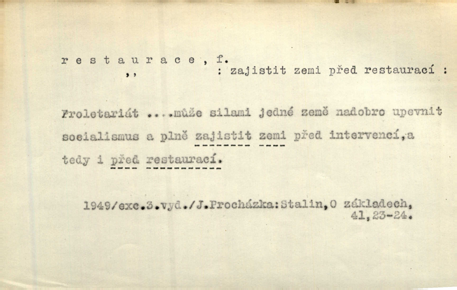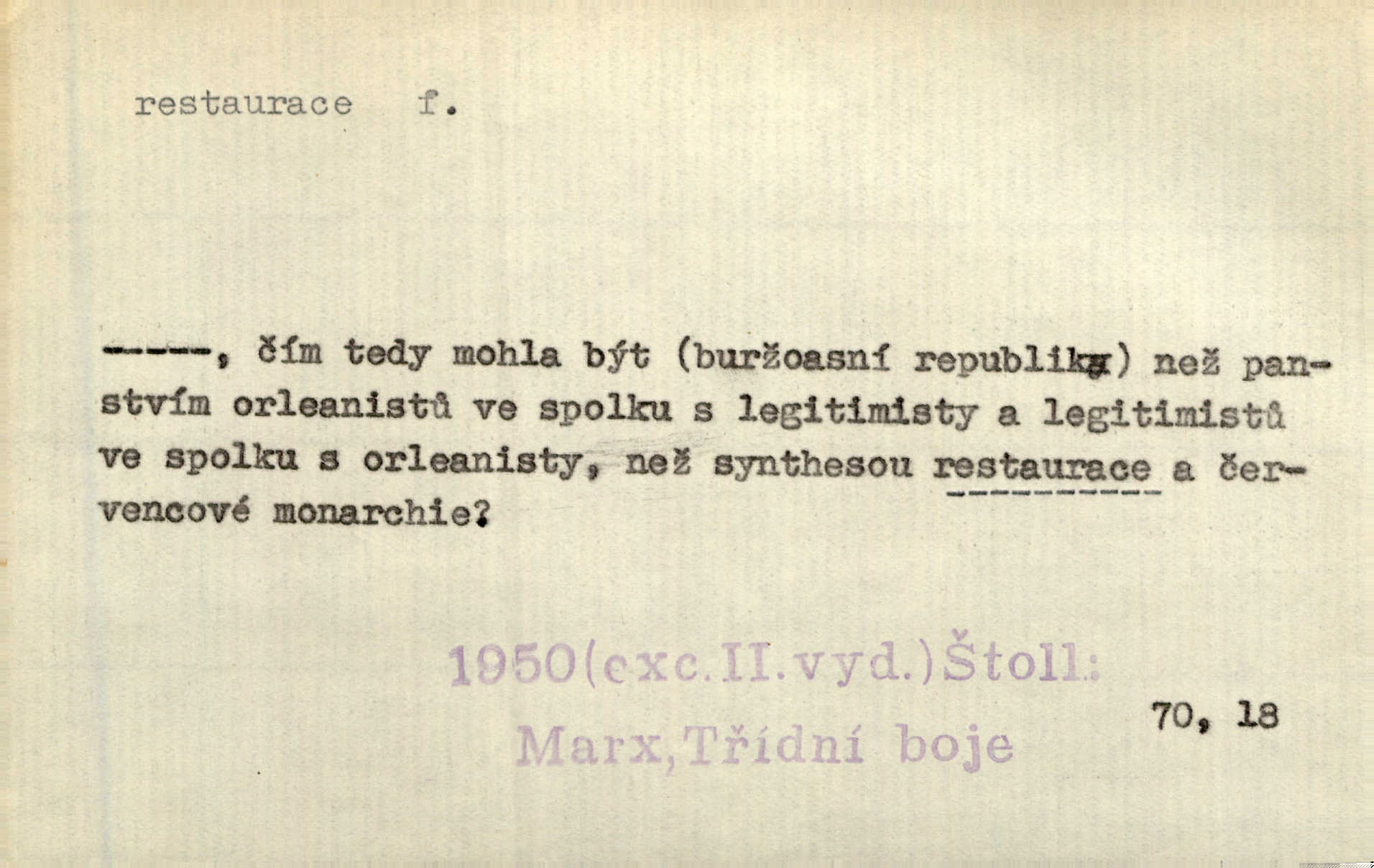- restaurace (zast. restaurací, -í) f. 2. důkladná oprava, přestavba, úprava, zvl. uměleckého díla. Co se dá zachovat z minulosti [staré Prahy] bez ujmy požadavků živých — dobrá, zachovejme. Ale i při takových restauracích pozor! Mach. Tehdy byla Riedlovi zadána restaurace obrazů jistého starobylého zámku blízko Prahy. Matějček. Restaurace nového kostela po požáru trvala pět let. Pek. Restaurace zpustošených krajů a nedostatek pracovních sil zaviněný depopulací učinily po několik let z Francie mocné středisko immigrační. Boh. Obch. znovuzřízení, obnovení podniku jako celku n. jeho částí n. zařízení. D opětné přivedení k platnosti, moci, zvl. obnovení státního útvaru předtím násilím odstraněného. Mezi nimi [poslanci] známý podporovatel revisionismu a restaurace Habsburků. Přít. Chtěli proti vůli svých přátel stavovských provésti restaurací moci královské a tím povznésti zemi z úpadku. Rez. Po pádu Napoleona zavedena jest přičiněním mocnářů restaurace, to jest obnovení staré vlády. Havl. Pod hesly restaurace, po případě i reakce vraceli se [po francouzské revoluci] ke starším principiím. Mas. Lék je jen v restauraci intelektualismu. Šal.