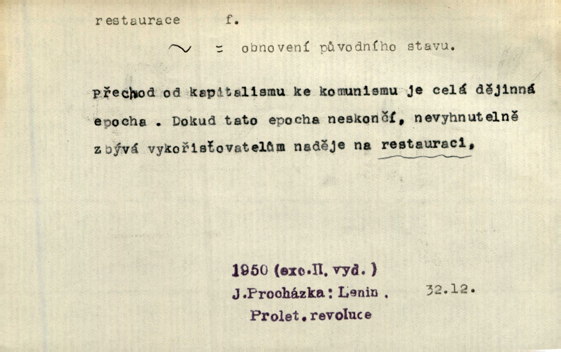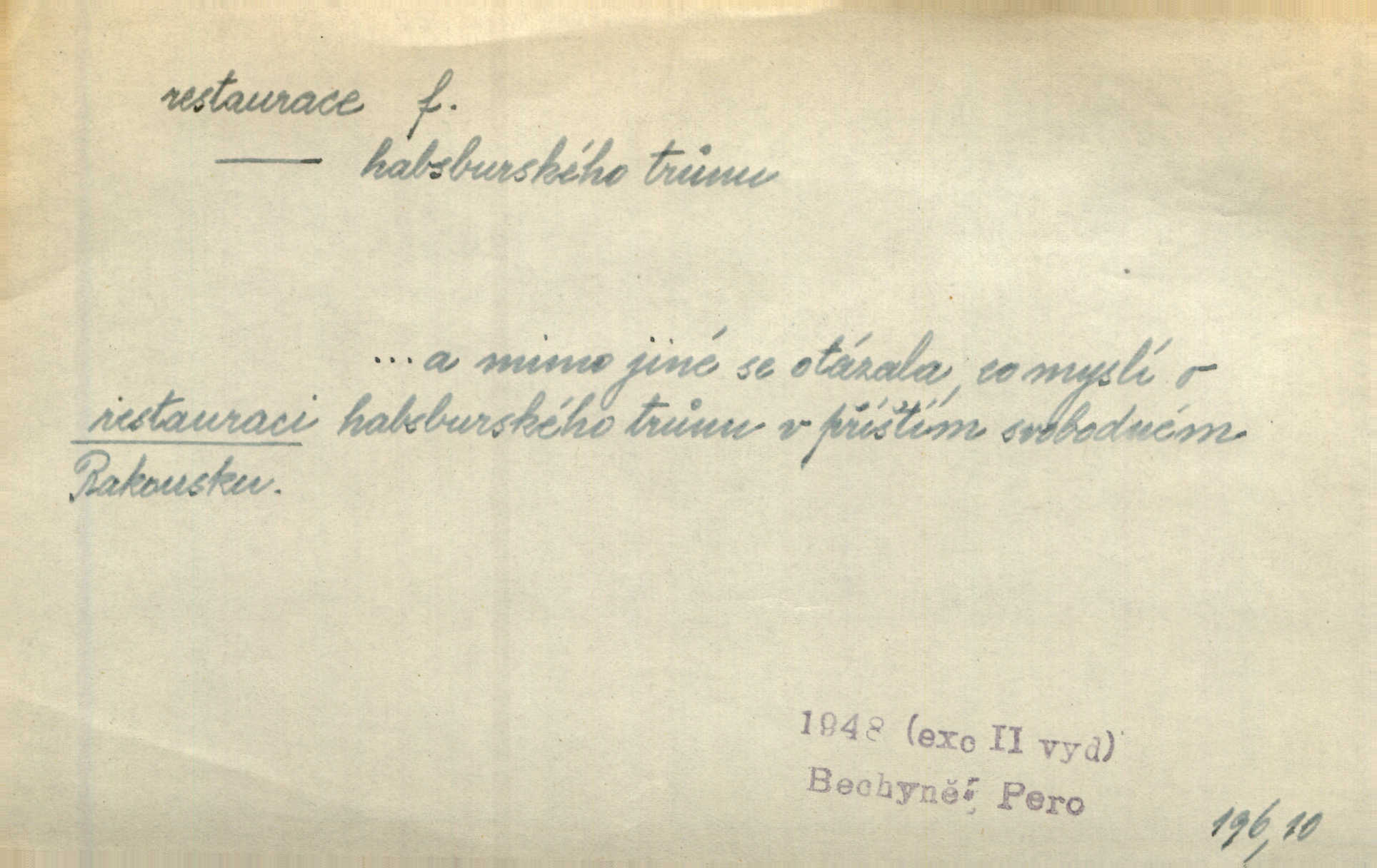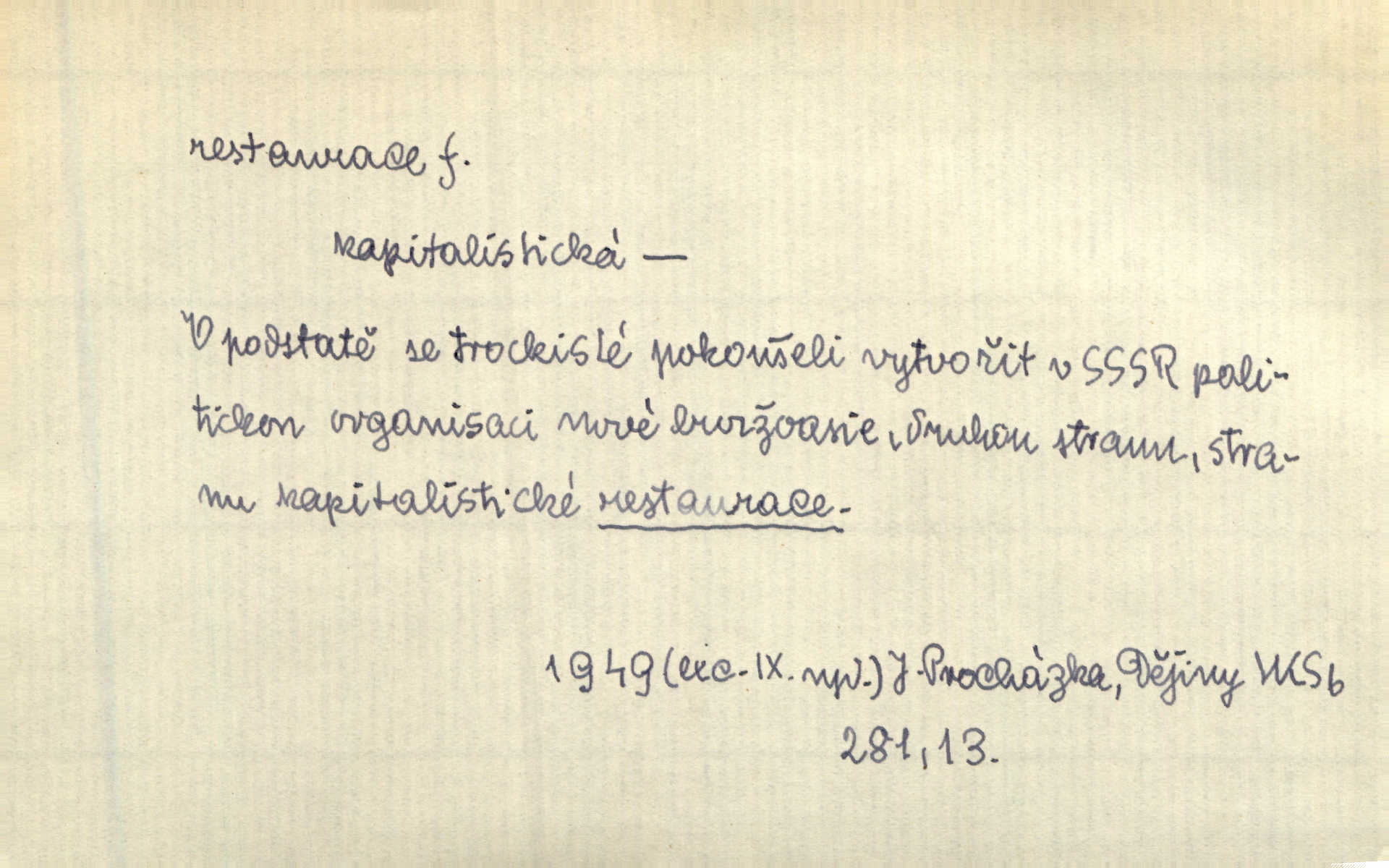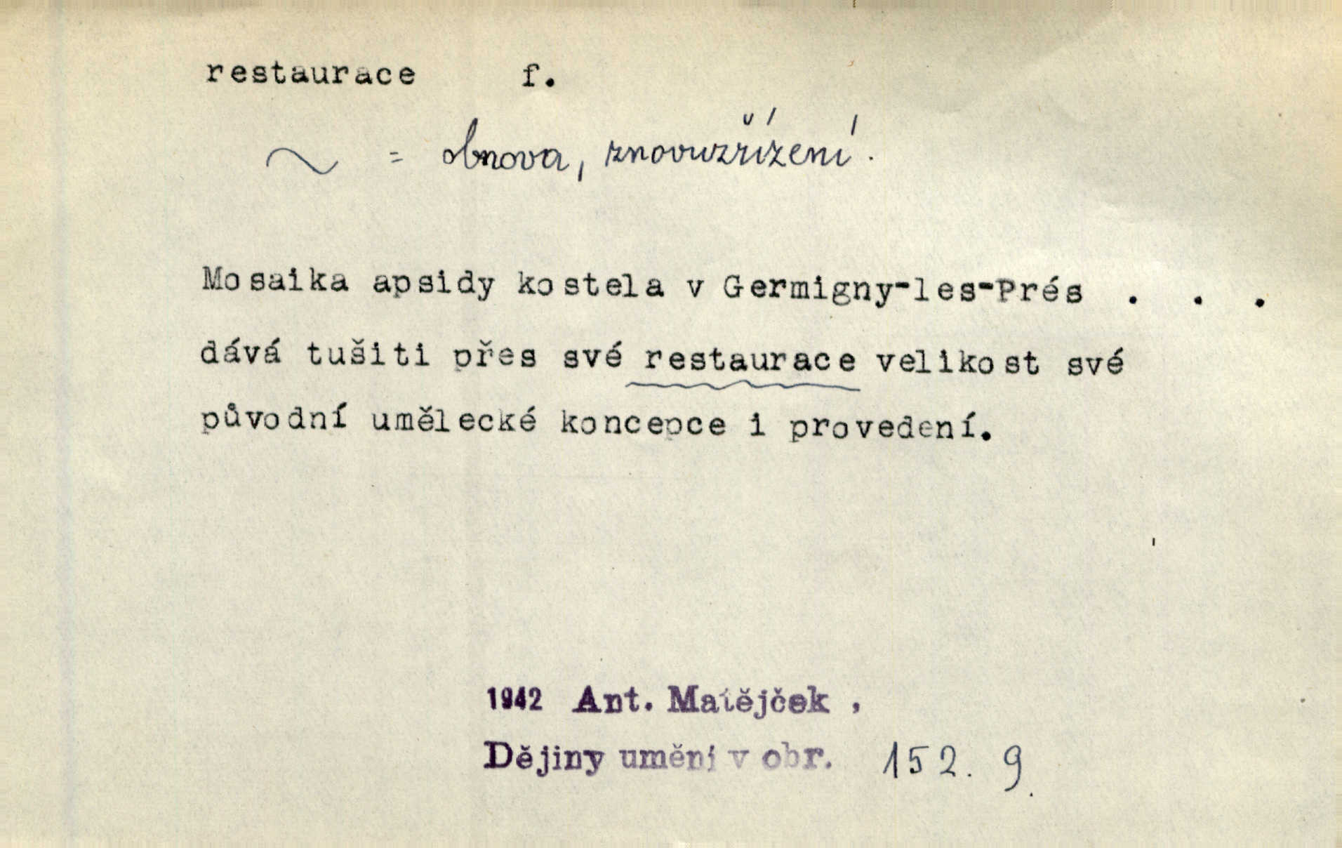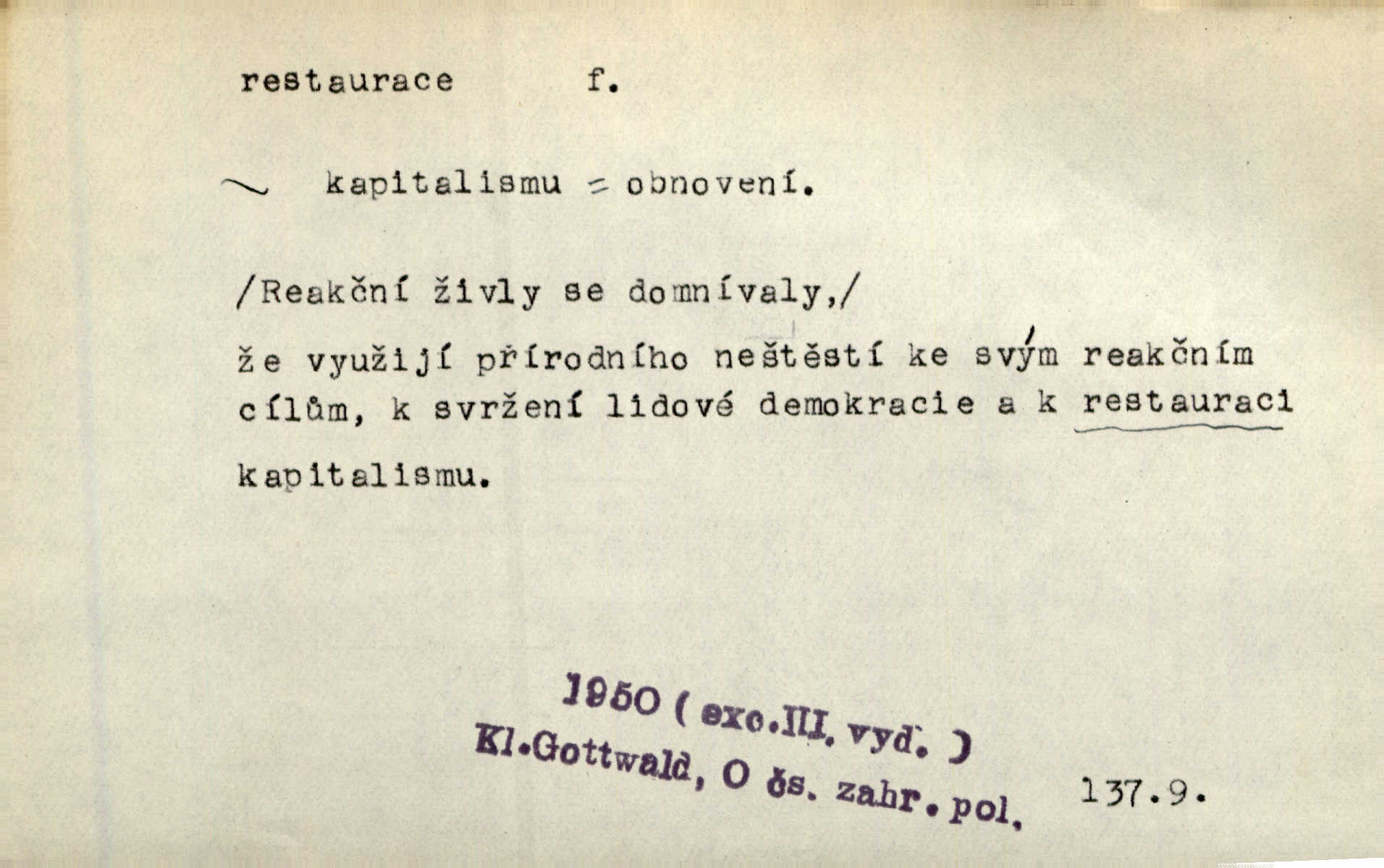 - restaurace (zast. restaurací, -í) f. 2. důkladná oprava, přestavba, úprava, zvl. uměleckého díla. Co se dá zachovat z minulosti [staré Prahy] bez ujmy požadavků živých — dobrá, zachovejme. Ale i při takových restauracích pozor! Mach. Tehdy byla Riedlovi zadána restaurace obrazů jistého starobylého zámku blízko Prahy. Matějček. Restaurace nového kostela po požáru trvala pět let. Pek. Restaurace zpustošených krajů a nedostatek pracovních sil zaviněný depopulací učinily po několik let z Francie mocné středisko immigrační. Boh. Obch. znovuzřízení, obnovení podniku jako celku n. jeho částí n. zařízení. D opětné přivedení k platnosti, moci, zvl. obnovení státního útvaru předtím násilím odstraněného. Mezi nimi [poslanci] známý podporovatel revisionismu a restaurace Habsburků. Přít. Chtěli proti vůli svých přátel stavovských provésti restaurací moci královské a tím povznésti zemi z úpadku. Rez. Po pádu Napoleona zavedena jest přičiněním mocnářů restaurace, to jest obnovení staré vlády. Havl. Pod hesly restaurace, po případě i reakce vraceli se [po francouzské revoluci] ke starším principiím. Mas. Lék je jen v restauraci intelektualismu. Šal.