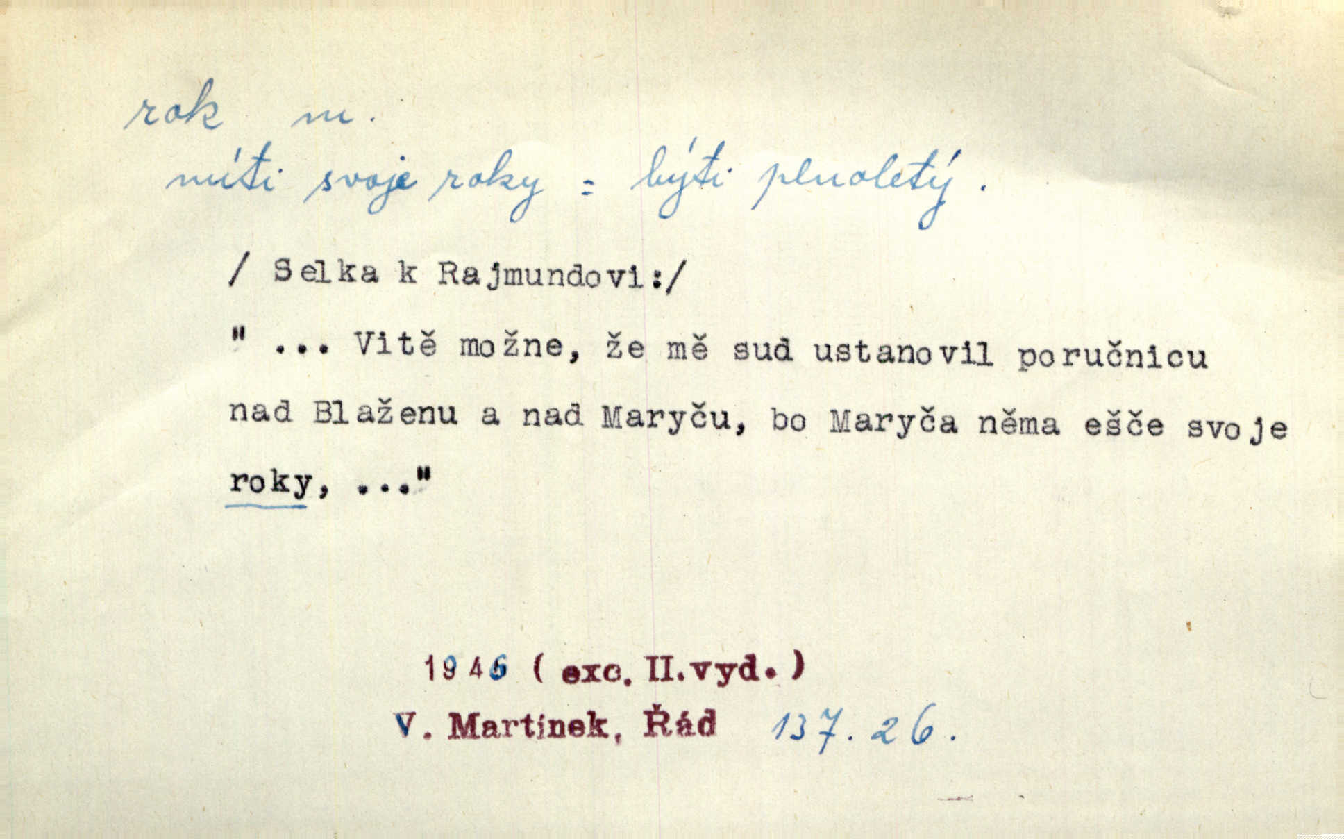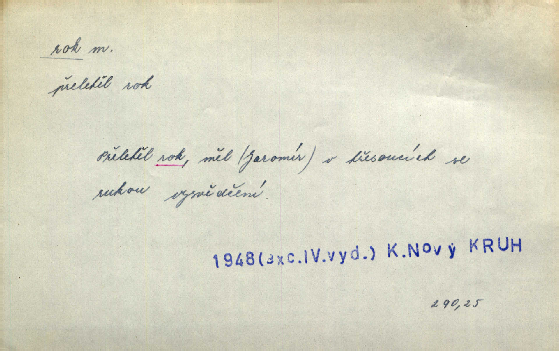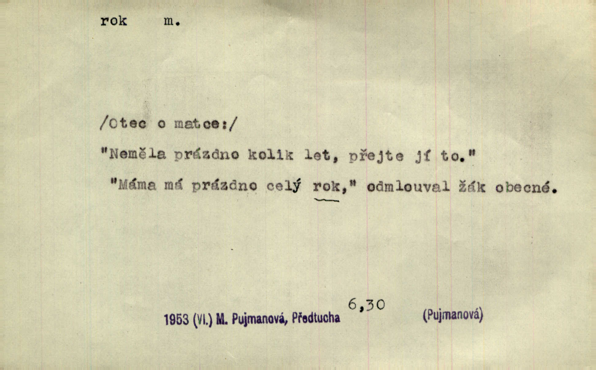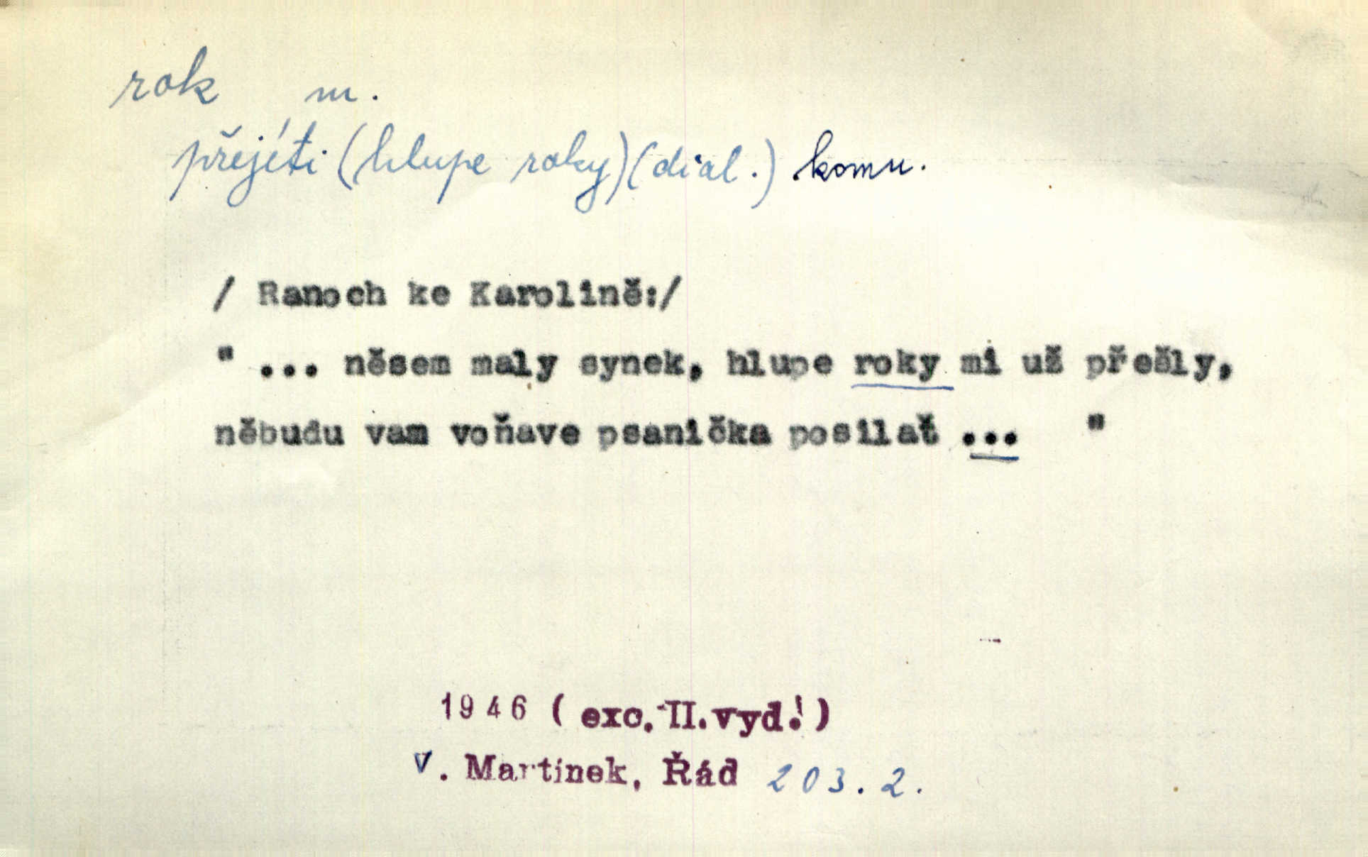 - rok, -u (ale do roka) m. (pl. roky, léta) doba dvanácti měsíců neboli 365 dnů, počítaná od 1. ledna do 31. prosince; doba dvanácti měsíců počítaná od daného okamžiku. Osm let, jeden rok stejný jako druhý, odešlo do minulosti. Šmil. Běží časy, běží, rok jako hodina. Erb. Na letošní rok bude mnoho lidí pamatovat. V. Mrš. Děvčátka písničky zpívají tištěné tohoto roku. Ner. Porozuměl [arcibiskup] svému přísnému zpovědníku, kterého si oblíbil od loňského roku. Jir. Rokem 1827 počal vycházeti Časopis vlastenského Museum čtvrtletně. Kal. Konec roku se blíží. Dyk. S půlnocí nový rok právě se počínal. Mácha. Změní Zora od Nového roku redaktora od 1. ledna. Havl. Příští týden obdržíme opět nového roku, až se budem ponocní děliti novoročné. Zschokke. Zlý je letos rok. Klášt. Píše [autor] opravdovou kroniku, přísně zaokrouhlený a členěný rok na vsi. Lid. nov. Zbojníci čtvrť roku ze svých skrýší nevycházeli. Herb. Rozpomeň se, Antoníne, že jsi o sedm roků starší. Lier. Do školy musíš, dokud ti není dvanáct roků. Hál. Byloť mu [Jungmannovi] v druhé třídě již na šestnáctý rok. V. Zel. Ač jí šlo už na 19tý rok, ještě milostpaničkou nebyla. Rub. Od dvanáctého svého roku přestala [královská dcera] mluvit. Erb. Během mladých roků čet’, psal jsem o ní [lásce] verše nadšené. Mach. Nezamlčel jsem mu, že mám hubený rok že trpím nouzí. Šmil. V nedalekém zámku meškala vrchnost téměř po celý rok. Jir. Jindy ji [Ebbu] člověk celý boží rok na ulici nespatřil. Bozd. Kvete [růže] na krátko, trní jen zůstává jak rok dlouhý po celý rok, stále. Šmil. S takovým mužem [jako Rozumec] nesetká se člověk každý rok často. Šmil. Síla rostla každým dnem a rokem ustavičně. Ner. Rozvášněnost rostla co rok. Bílý. Jednou za rok v kapličce se konávaly [bohoslužby]. Šmil. Sedlák má posvícení jednou do roka, pán každý den. Hol. Rok na to porodila Amalije syna příští rok, za rok. Pfleg. Mělť jsem jíti přes rok k odvodu napřesrok. Herrm. Na rok dám Anežku do města. Just. Pán byl již v roku, dost svých zažil svátků v letech, letitý. Svob. Asi před rokem vrátil se [Maťocha] z Vídně. Rais. Dnes rok byla [vdova] ještě s pantátou. Jir. Poslední rok před svou smrtí procházel se čáp za městysem na louce. Just. Zdaleka jak babičku spatřily [děti]‚ na ni volaly, úprkem k ní se ženouce, jakoby rok ji byly neviděly dlouhou dobu. Něm. Sestra do roka nežila, bratra mi koule zabila než rok uplynul. Erb. Naši lidé raději do roka sto zlatých prochlastají, nežli by dali něco na noviny za rok, během roku. Praž. pos. [Voral] začal počítat, co mohli [Haňákovi] rokem vydělat za rok, ročně. Rais. Nežli se rok s rokem sešel, vyrovnal se mladík nejstaršímu [tovaryšovi]. Tyl. Než rok s rokem minul, nechtěli [páni] ani mne ani Nány k práci. Šmil. Rok co rok plynul v Libějicích bez mrzutostí, bez soudů každý rok. Podl. Pan Melichar a jeho choť odvraceli se od roku k roku pořád více ode světa každým rokem. Svět. Kdo od roku k roku mezi nimi [sedláky] je, ten je zná stále. Praž. pos. Tomuto patentu, kterýž rok po roce byl obnovován, přísnosti upříti nelze. Rez. Tak byl jsem okrádán rok za rok o tebe [dceru]. Podl. [Zelenka ženě:] Já vím, že dobře spočítané máš ty šerky a kanafasy, ježto rok za rokem do truhel pro Marianku ukládáš? Prav. Rok k roku přibývá jí [paní] nových dětí. Prav. Rok do roka na sta lidí umírá účinkem zkaženého vzduchu. Svět. Věc horšila se rok od roku. Rez. Tak se věc táhla z roku na rok dlouho, se stálými odklady. Prav. Sedláci mnoho nerozuměli jednotlivým slovům [patentu]‚ ale že robota do dne a do roka přestane, tolik pochopili. Herb. [Matka synovi:] Víš, že jsme chudí, budeš se učit rok za rok s podmínkou, že za každý rok učení bude pracovati rok zdarma jako tovaryš. Čap. Ch. V dnešní škole jest jednotkou školské práce školní rok. J. Klíma. V školním roce 1806/7 přijat byl Václav na gymnasiu staroměstském v Praze. Ner. Astron. rok hvězdný, siderický doba, za kterou se slunce vrátí k témuž bodu oblohy (365 dní, 6 hodin, 9 minut, 9,5 vt.). Rok tropický doba mezi dvěma průchody slunce jarním bodem (365 dní, 5 hodin, 48 minut, 46 vteřin). Rok světelný astronomická jednotka mezihvězdných vzdáleností. Rok občanský mající celistvý počet 365 dní. Rok přestupný mající 366 dní. Rok gregoriánský, juliánský, přestupný a j. Círk. církevní rok. Veř. spr. správní rok. Obch. obchodní rok roční období, neshodující se vždy s rokem občanským, v kterém podnikatel zjišťuje a srovnává výsledky svého hospodaření a podle nich sestavuje bilanci. Škol. zkušební rok, školní rok. D Řidč. ročník. Posluchači prvního roku [práv] povinni jsou poslouchati „Praktickou filosofii“. Herb. Po výtečně přestálé zkoušce hned do druhého roku přijat byl. Obr. živ. Zř. Odpustíte, že počínám rok [Květů] oumrtní památkou. Tyl. D Práv. stání ustanovené soudcem pro jednotlivé úkony, k projednání určité záležitosti. D Zast. lhůta, termín. Poněvadž k roku danému nestal, právem staným byl odsouzen. Helf. Dáme vám [Turkům] čtyrdenní rok, abyste si mohli přivolati posilu. Hol. Výsadní list, jehož rok vyplynul, podnes ještě obnoven není. ČČM. K obchodu s poddanými vyznačeny jim [národům] i místa i roky. Pal. Za příčinou záležitostí uherských složil byl Albrecht rok zvláštní ku dni 2. února do Prešpurka ustanovil lhůtu sněmu, jednání. Pal. D Zast. rokování, porada, schůze. Kněží Táborští měli rok s mistry Pražskými na hradě. Pal. Polékli jsou pyšní svá osidla na mne, o mé bezživotí uložili roky. Erb. Mistři [universitní] v rok se pon
