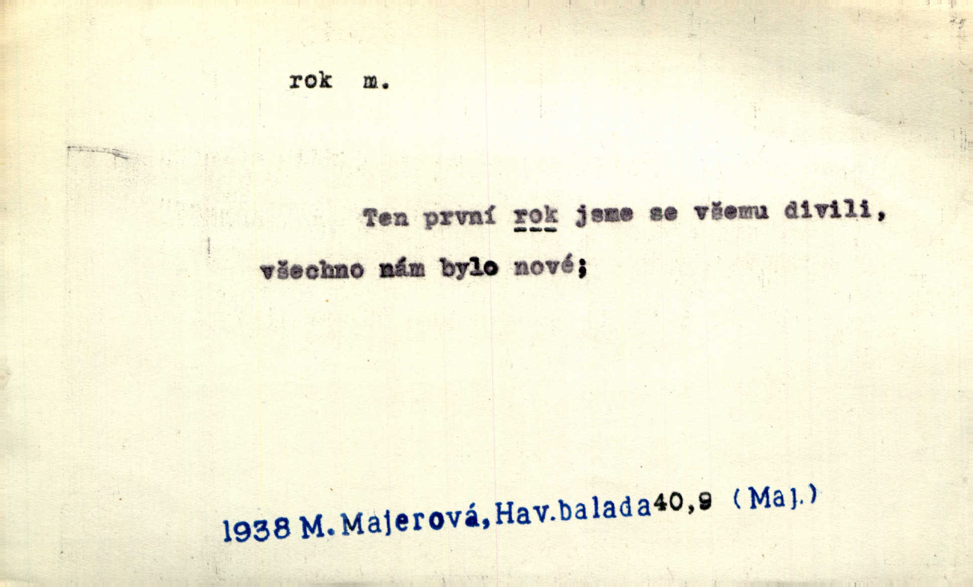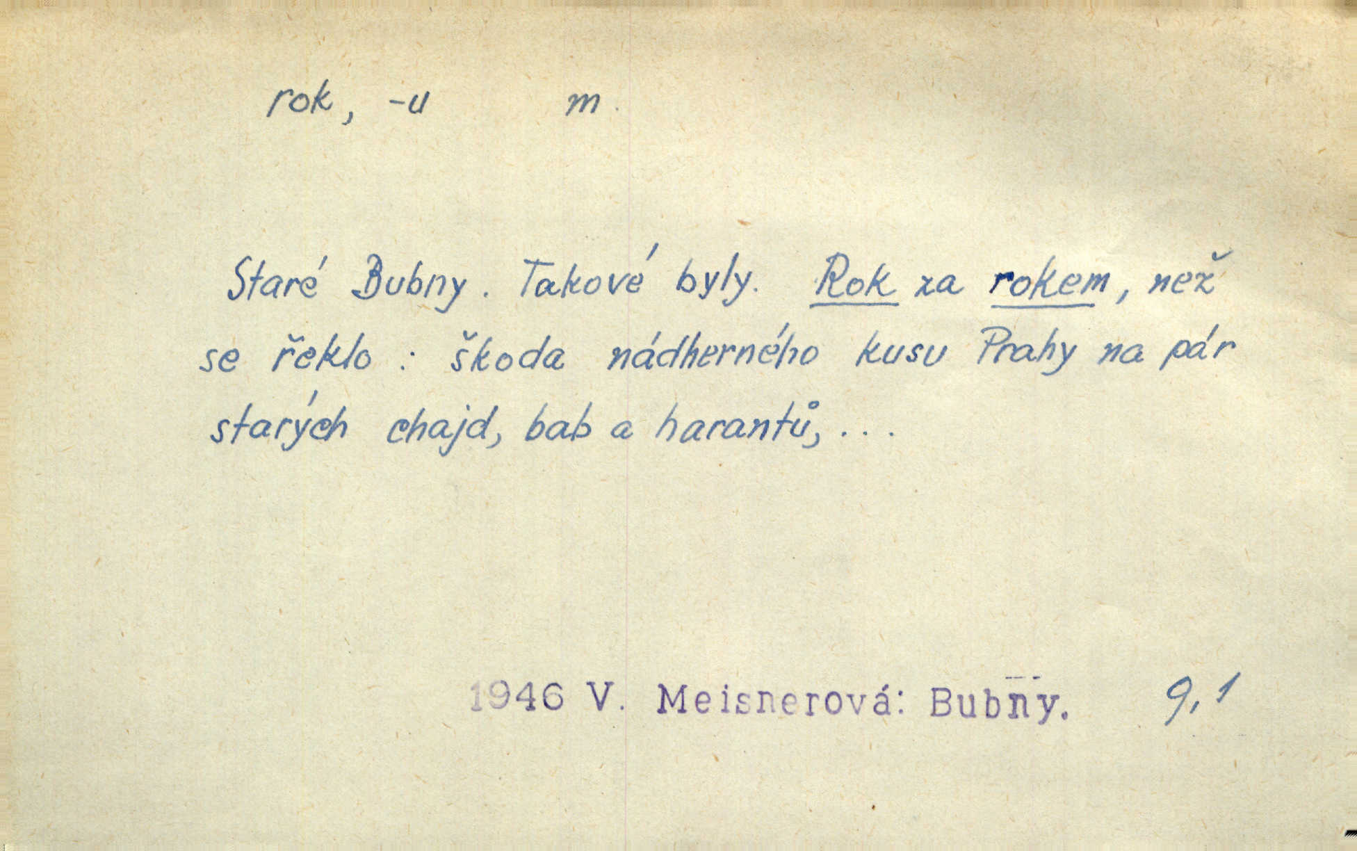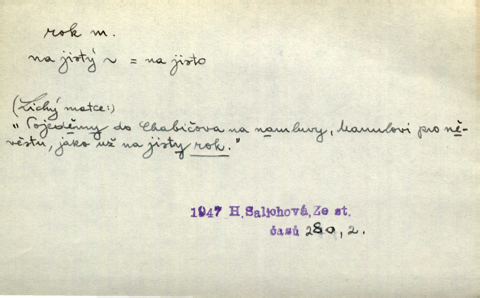 - rok, -u (ale do roka) m. (pl. roky, léta) doba dvanácti měsíců neboli 365 dnů, počítaná od 1. ledna do 31. prosince; doba dvanácti měsíců počítaná od daného okamžiku. Osm let, jeden rok stejný jako druhý, odešlo do minulosti. Šmil. Běží časy, běží, rok jako hodina. Erb. Na letošní rok bude mnoho lidí pamatovat. V. Mrš. Děvčátka písničky zpívají tištěné tohoto roku. Ner. Porozuměl [arcibiskup] svému přísnému zpovědníku, kterého si oblíbil od loňského roku. Jir. Rokem 1827 počal vycházeti Časopis vlastenského Museum čtvrtletně. Kal. Konec roku se blíží. Dyk. S půlnocí nový rok právě se počínal. Mácha. Změní Zora od Nového roku redaktora od 1. ledna. Havl. Příští týden obdržíme opět nového roku, až se budem ponocní děliti novoročné. Zschokke. Zlý je letos rok. Klášt. Píše [autor] opravdovou kroniku, přísně zaokrouhlený a členěný rok na vsi. Lid. nov. Zbojníci čtvrť roku ze svých skrýší nevycházeli. Herb. Rozpomeň se, Antoníne, že jsi o sedm roků starší. Lier. Do školy musíš, dokud ti není dvanáct roků. Hál. Byloť mu [Jungmannovi] v druhé třídě již na šestnáctý rok. V. Zel. Ač jí šlo už na 19tý rok, ještě milostpaničkou nebyla. Rub. Od dvanáctého svého roku přestala [královská dcera] mluvit. Erb. Během mladých roků čet’, psal jsem o ní [lásce] verše nadšené. Mach. Nezamlčel jsem mu, že mám hubený rok že trpím nouzí. Šmil. V nedalekém zámku meškala vrchnost téměř po celý rok. Jir. Jindy ji [Ebbu] člověk celý boží rok na ulici nespatřil. Bozd. Kvete [růže] na krátko, trní jen zůstává jak rok dlouhý po celý rok, stále. Šmil. S takovým mužem [jako Rozumec] nesetká se člověk každý rok často. Šmil. Síla rostla každým dnem a rokem ustavičně. Ner. Rozvášněnost rostla co rok. Bílý. Jednou za rok v kapličce se konávaly [bohoslužby]. Šmil. Sedlák má posvícení jednou do roka, pán každý den. Hol. Rok na to porodila Amalije syna příští rok, za rok. Pfleg. Mělť jsem jíti přes rok k odvodu napřesrok. Herrm. Na rok dám Anežku do města. Just. Pán byl již v roku, dost svých zažil svátků v letech, letitý. Svob. Asi před rokem vrátil se [Maťocha] z Vídně. Rais. Dnes rok byla [vdova] ještě s pantátou. Jir. Poslední rok před svou smrtí procházel se čáp za městysem na louce. Just. Zdaleka jak babičku spatřily [děti]‚ na ni volaly, úprkem k ní se ženouce, jakoby rok ji byly neviděly dlouhou dobu. Něm. Sestra do roka nežila, bratra mi koule zabila než rok uplynul. Erb. Naši lidé raději do roka sto zlatých prochlastají, nežli by dali něco na noviny za rok, během roku. Praž. pos. [Voral] začal počítat, co mohli [Haňákovi] rokem vydělat za rok, ročně. Rais. Nežli se rok s rokem sešel, vyrovnal se mladík nejstaršímu [tovaryšovi]. Tyl. Než rok s rokem minul, nechtěli [páni] ani mne ani Nány k práci. Šmil. Rok co rok plynul v Libějicích bez mrzutostí, bez soudů každý rok. Podl. Pan Melichar a jeho choť odvraceli se od roku k roku pořád více ode světa každým rokem. Svět. Kdo od roku k roku mezi nimi [sedláky] je, ten je zná stále. Praž. pos. Tomuto patentu, kterýž rok po roce byl obnovován, přísnosti upříti nelze. Rez. Tak byl jsem okrádán rok za rok o tebe [dceru]. Podl. [Zelenka ženě:] Já vím, že dobře spočítané máš ty šerky a kanafasy, ježto rok za rokem do truhel pro Marianku ukládáš? Prav. Rok k roku přibývá jí [paní] nových dětí. Prav. Rok do roka na sta lidí umírá účinkem zkaženého vzduchu. Svět. Věc horšila se rok od roku. Rez. Tak se věc táhla z roku na rok dlouho, se stálými odklady. Prav. Sedláci mnoho nerozuměli jednotlivým slovům [patentu]‚ ale že robota do dne a do roka přestane, tolik pochopili. Herb. [Matka synovi:] Víš, že jsme chudí, budeš se učit rok za rok s podmínkou, že za každý rok učení bude pracovati rok zdarma jako tovaryš. Čap. Ch. V dnešní škole jest jednotkou školské práce školní rok. J. Klíma. V školním roce 1806/7 přijat byl Václav na gymnasiu staroměstském v Praze. Ner. Astron. rok hvězdný, siderický doba, za kterou se slunce vrátí k témuž bodu oblohy (365 dní, 6 hodin, 9 minut, 9,5 vt.). Rok tropický doba mezi dvěma průchody slunce jarním bodem (365 dní, 5 hodin, 48 minut, 46 vteřin). Rok světelný astronomická jednotka mezihvězdných vzdáleností. Rok občanský mající celistvý počet 365 dní. Rok přestupný mající 366 dní. Rok gregoriánský, juliánský, přestupný a j. Círk. církevní rok. Veř. spr. správní rok. Obch. obchodní rok roční období, neshodující se vždy s rokem občanským, v kterém podnikatel zjišťuje a srovnává výsledky svého hospodaření a podle nich sestavuje bilanci. Škol. zkušební rok, školní rok. D Řidč. ročník. Posluchači prvního roku [práv] povinni jsou poslouchati „Praktickou filosofii“. Herb. Po výtečně přestálé zkoušce hned do druhého roku přijat byl. Obr. živ. Zř. Odpustíte, že počínám rok [Květů] oumrtní památkou. Tyl. D Práv. stání ustanovené soudcem pro jednotlivé úkony, k projednání určité záležitosti. D Zast. lhůta, termín. Poněvadž k roku danému nestal, právem staným byl odsouzen. Helf. Dáme vám [Turkům] čtyrdenní rok, abyste si mohli přivolati posilu. Hol. Výsadní list, jehož rok vyplynul, podnes ještě obnoven není. ČČM. K obchodu s poddanými vyznačeny jim [národům] i místa i roky. Pal. Za příčinou záležitostí uherských složil byl Albrecht rok zvláštní ku dni 2. února do Prešpurka ustanovil lhůtu sněmu, jednání. Pal. D Zast. rokování, porada, schůze. Kněží Táborští měli rok s mistry Pražskými na hradě. Pal. Polékli jsou pyšní svá osidla na mne, o mé bezživotí uložili roky. Erb. Mistři [universitní] v rok se pon