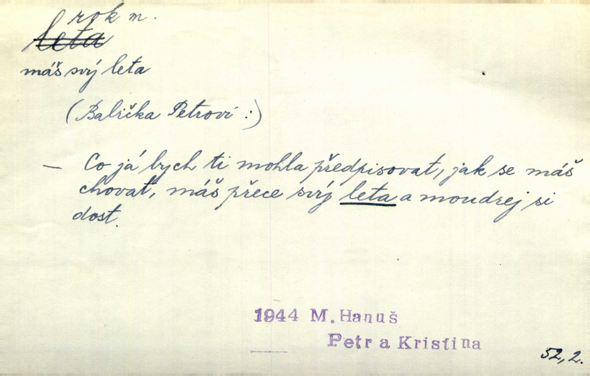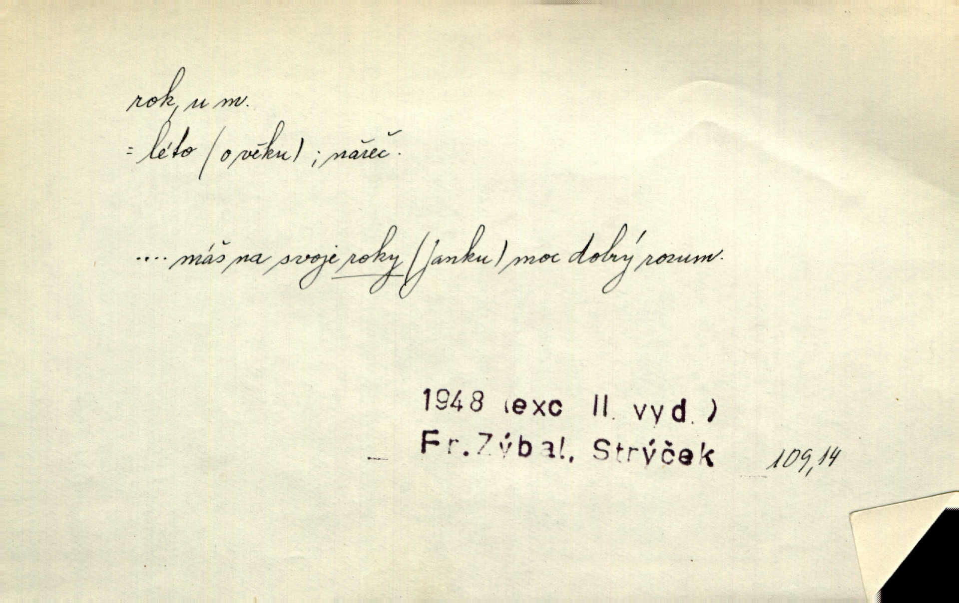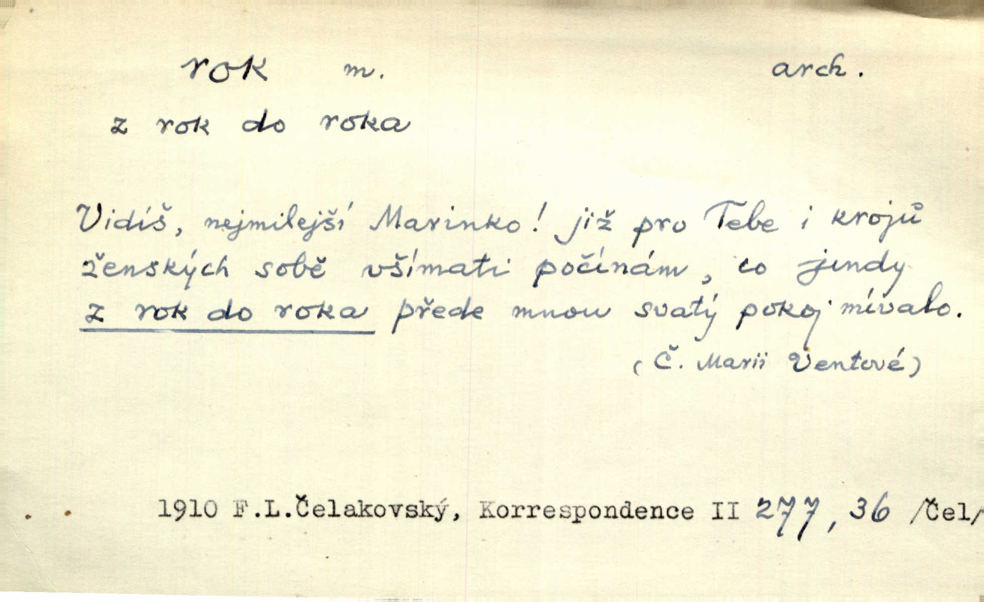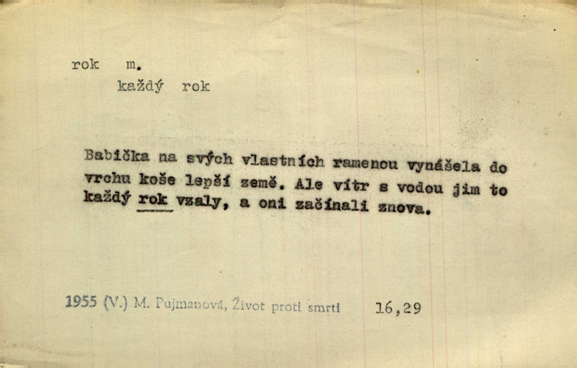 - rok, -u (ale do roka) m. (pl. roky, léta) doba dvanácti měsíců neboli 365 dnů, počítaná od 1. ledna do 31. prosince; doba dvanácti měsíců počítaná od daného okamžiku. Osm let, jeden rok stejný jako druhý, odešlo do minulosti. Šmil. Běží časy, běží, rok jako hodina. Erb. Na letošní rok bude mnoho lidí pamatovat. V. Mrš. Děvčátka písničky zpívají tištěné tohoto roku. Ner. Porozuměl [arcibiskup] svému přísnému zpovědníku, kterého si oblíbil od loňského roku. Jir. Rokem 1827 počal vycházeti Časopis vlastenského Museum čtvrtletně. Kal. Konec roku se blíží. Dyk. S půlnocí nový rok právě se počínal. Mácha. Změní Zora od Nového roku redaktora od 1. ledna. Havl. Příští týden obdržíme opět nového roku, až se budem ponocní děliti novoročné. Zschokke. Zlý je letos rok. Klášt. Píše [autor] opravdovou kroniku, přísně zaokrouhlený a členěný rok na vsi. Lid. nov. Zbojníci čtvrť roku ze svých skrýší nevycházeli. Herb. Rozpomeň se, Antoníne, že jsi o sedm roků starší. Lier. Do školy musíš, dokud ti není dvanáct roků. Hál. Byloť mu [Jungmannovi] v druhé třídě již na šestnáctý rok. V. Zel. Ač jí šlo už na 19tý rok, ještě milostpaničkou nebyla. Rub. Od dvanáctého svého roku přestala [královská dcera] mluvit. Erb. Během mladých roků čet’, psal jsem o ní [lásce] verše nadšené. Mach. Nezamlčel jsem mu, že mám hubený rok že trpím nouzí. Šmil. V nedalekém zámku meškala vrchnost téměř po celý rok. Jir. Jindy ji [Ebbu] člověk celý boží rok na ulici nespatřil. Bozd. Kvete [růže] na krátko, trní jen zůstává jak rok dlouhý po celý rok, stále. Šmil. S takovým mužem [jako Rozumec] nesetká se člověk každý rok často. Šmil. Síla rostla každým dnem a rokem ustavičně. Ner. Rozvášněnost rostla co rok. Bílý. Jednou za rok v kapličce se konávaly [bohoslužby]. Šmil. Sedlák má posvícení jednou do roka, pán každý den. Hol. Rok na to porodila Amalije syna příští rok, za rok. Pfleg. Mělť jsem jíti přes rok k odvodu napřesrok. Herrm. Na rok dám Anežku do města. Just. Pán byl již v roku, dost svých zažil svátků v letech, letitý. Svob. Asi před rokem vrátil se [Maťocha] z Vídně. Rais. Dnes rok byla [vdova] ještě s pantátou. Jir. Poslední rok před svou smrtí procházel se čáp za městysem na louce. Just. Zdaleka jak babičku spatřily [děti]‚ na ni volaly, úprkem k ní se ženouce, jakoby rok ji byly neviděly dlouhou dobu. Něm. Sestra do roka nežila, bratra mi koule zabila než rok uplynul. Erb. Naši lidé raději do roka sto zlatých prochlastají, nežli by dali něco na noviny za rok, během roku. Praž. pos. [Voral] začal počítat, co mohli [Haňákovi] rokem vydělat za rok, ročně. Rais. Nežli se rok s rokem sešel, vyrovnal se mladík nejstaršímu [tovaryšovi]. Tyl. Než rok s rokem minul, nechtěli [páni] ani mne ani Nány k práci. Šmil. Rok co rok plynul v Libějicích bez mrzutostí, bez soudů každý rok. Podl. Pan Melichar a jeho choť odvraceli se od roku k roku pořád více ode světa každým rokem. Svět. Kdo od roku k roku mezi nimi [sedláky] je, ten je zná stále. Praž. pos. Tomuto patentu, kterýž rok po roce byl obnovován, přísnosti upříti nelze. Rez. Tak byl jsem okrádán rok za rok o tebe [dceru]. Podl. [Zelenka ženě:] Já vím, že dobře spočítané máš ty šerky a kanafasy, ježto rok za rokem do truhel pro Marianku ukládáš? Prav. Rok k roku přibývá jí [paní] nových dětí. Prav. Rok do roka na sta lidí umírá účinkem zkaženého vzduchu. Svět. Věc horšila se rok od roku. Rez. Tak se věc táhla z roku na rok dlouho, se stálými odklady. Prav. Sedláci mnoho nerozuměli jednotlivým slovům [patentu]‚ ale že robota do dne a do roka přestane, tolik pochopili. Herb. [Matka synovi:] Víš, že jsme chudí, budeš se učit rok za rok s podmínkou, že za každý rok učení bude pracovati rok zdarma jako tovaryš. Čap. Ch. V dnešní škole jest jednotkou školské práce školní rok. J. Klíma. V školním roce 1806/7 přijat byl Václav na gymnasiu staroměstském v Praze. Ner. Astron. rok hvězdný, siderický doba, za kterou se slunce vrátí k témuž bodu oblohy (365 dní, 6 hodin, 9 minut, 9,5 vt.). Rok tropický doba mezi dvěma průchody slunce jarním bodem (365 dní, 5 hodin, 48 minut, 46 vteřin). Rok světelný astronomická jednotka mezihvězdných vzdáleností. Rok občanský mající celistvý počet 365 dní. Rok přestupný mající 366 dní. Rok gregoriánský, juliánský, přestupný a j. Círk. církevní rok. Veř. spr. správní rok. Obch. obchodní rok roční období, neshodující se vždy s rokem občanským, v kterém podnikatel zjišťuje a srovnává výsledky svého hospodaření a podle nich sestavuje bilanci. Škol. zkušební rok, školní rok. D Řidč. ročník. Posluchači prvního roku [práv] povinni jsou poslouchati „Praktickou filosofii“. Herb. Po výtečně přestálé zkoušce hned do druhého roku přijat byl. Obr. živ. Zř. Odpustíte, že počínám rok [Květů] oumrtní památkou. Tyl. D Práv. stání ustanovené soudcem pro jednotlivé úkony, k projednání určité záležitosti. D Zast. lhůta, termín. Poněvadž k roku danému nestal, právem staným byl odsouzen. Helf. Dáme vám [Turkům] čtyrdenní rok, abyste si mohli přivolati posilu. Hol. Výsadní list, jehož rok vyplynul, podnes ještě obnoven není. ČČM. K obchodu s poddanými vyznačeny jim [národům] i místa i roky. Pal. Za příčinou záležitostí uherských složil byl Albrecht rok zvláštní ku dni 2. února do Prešpurka ustanovil lhůtu sněmu, jednání. Pal. D Zast. rokování, porada, schůze. Kněží Táborští měli rok s mistry Pražskými na hradě. Pal. Polékli jsou pyšní svá osidla na mne, o mé bezživotí uložili roky. Erb. Mistři [universitní] v rok se pon