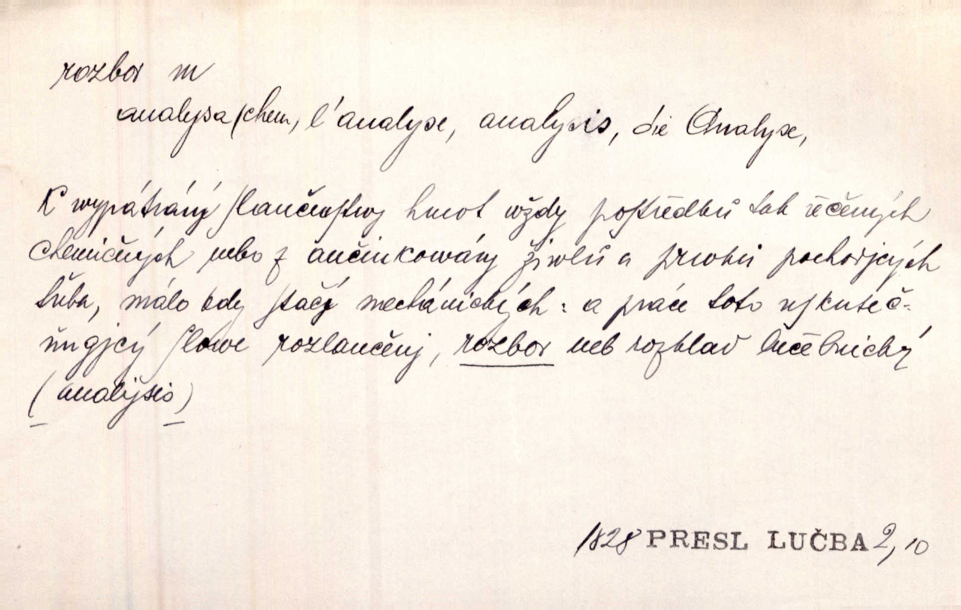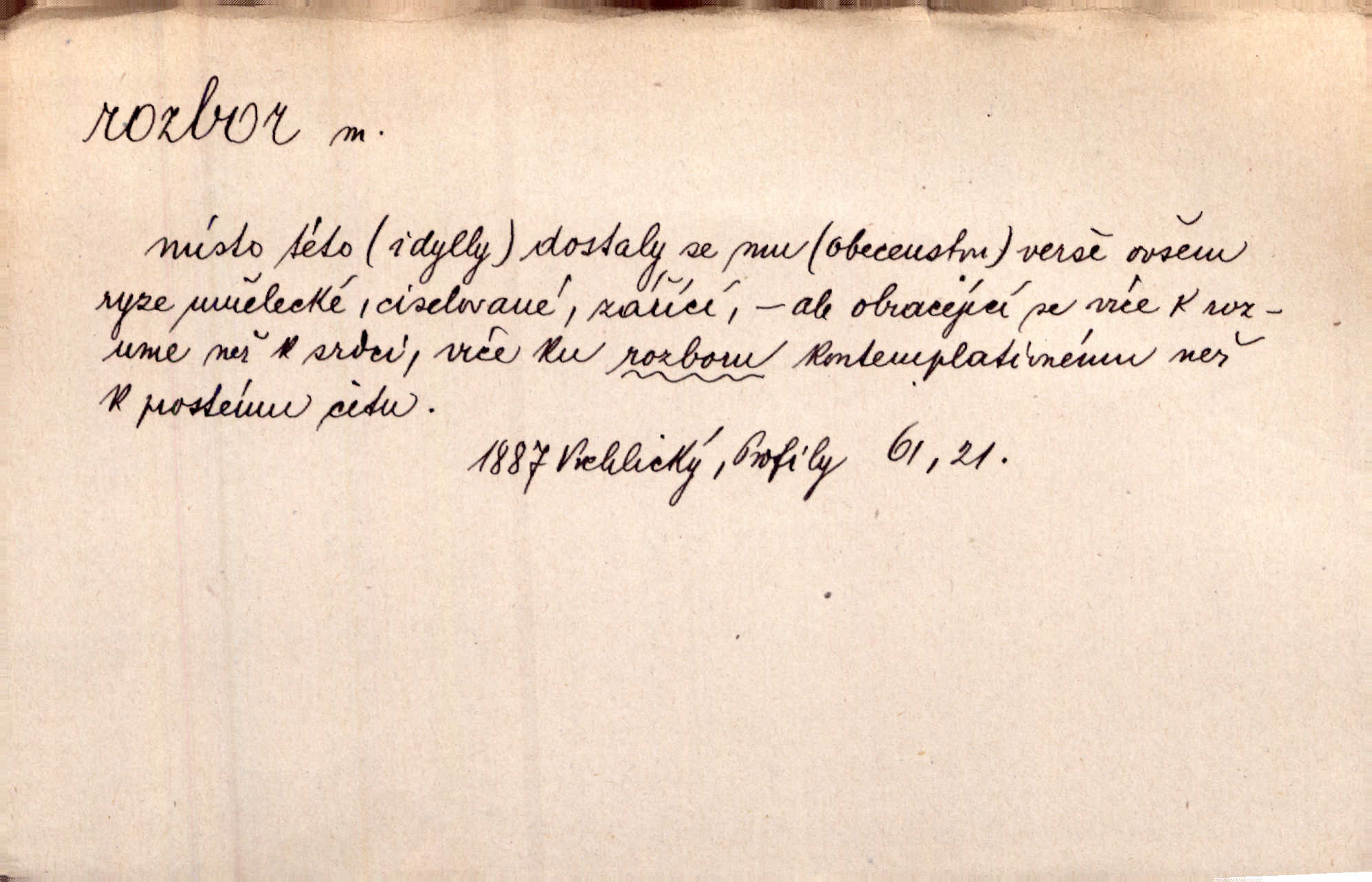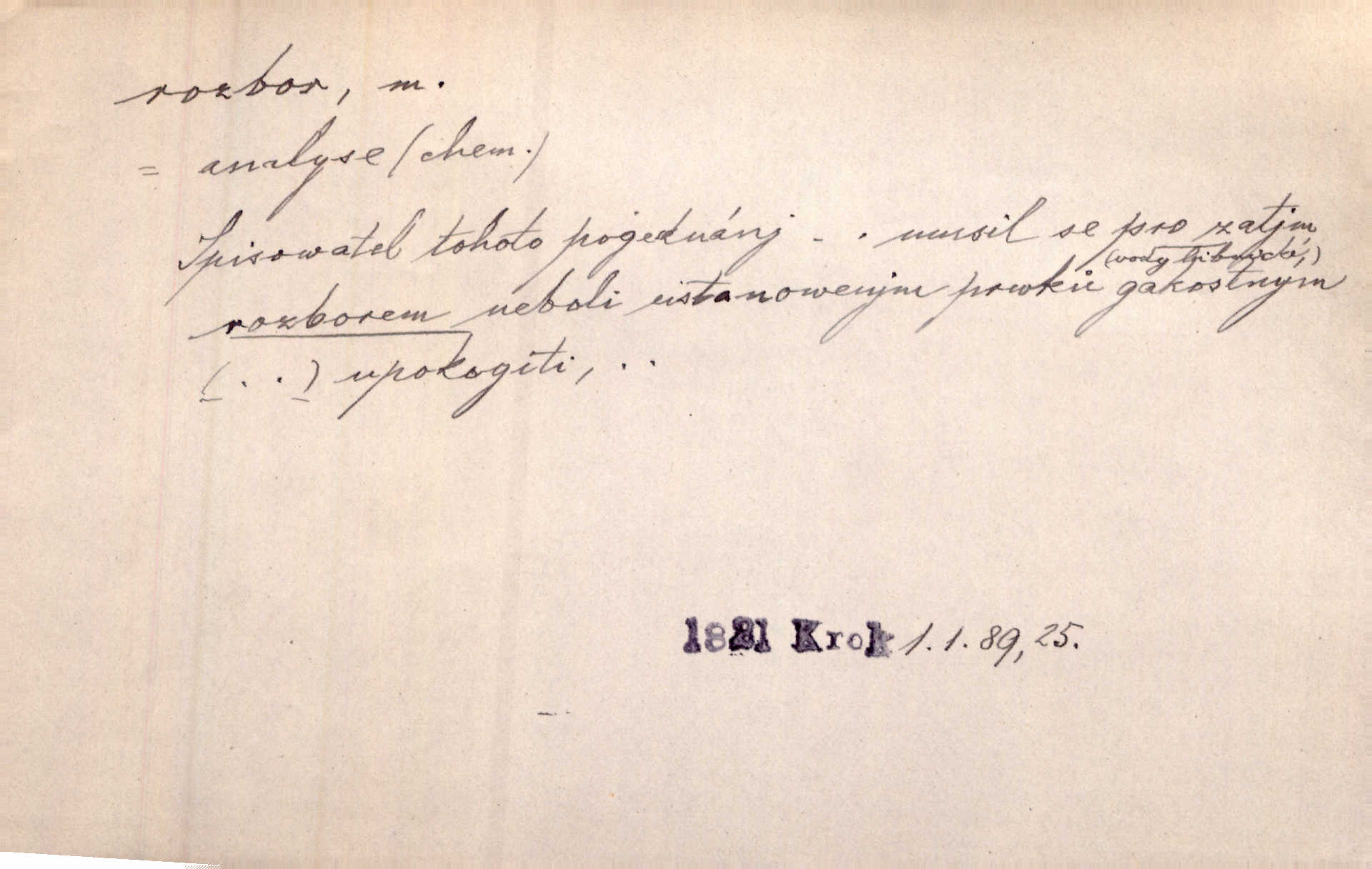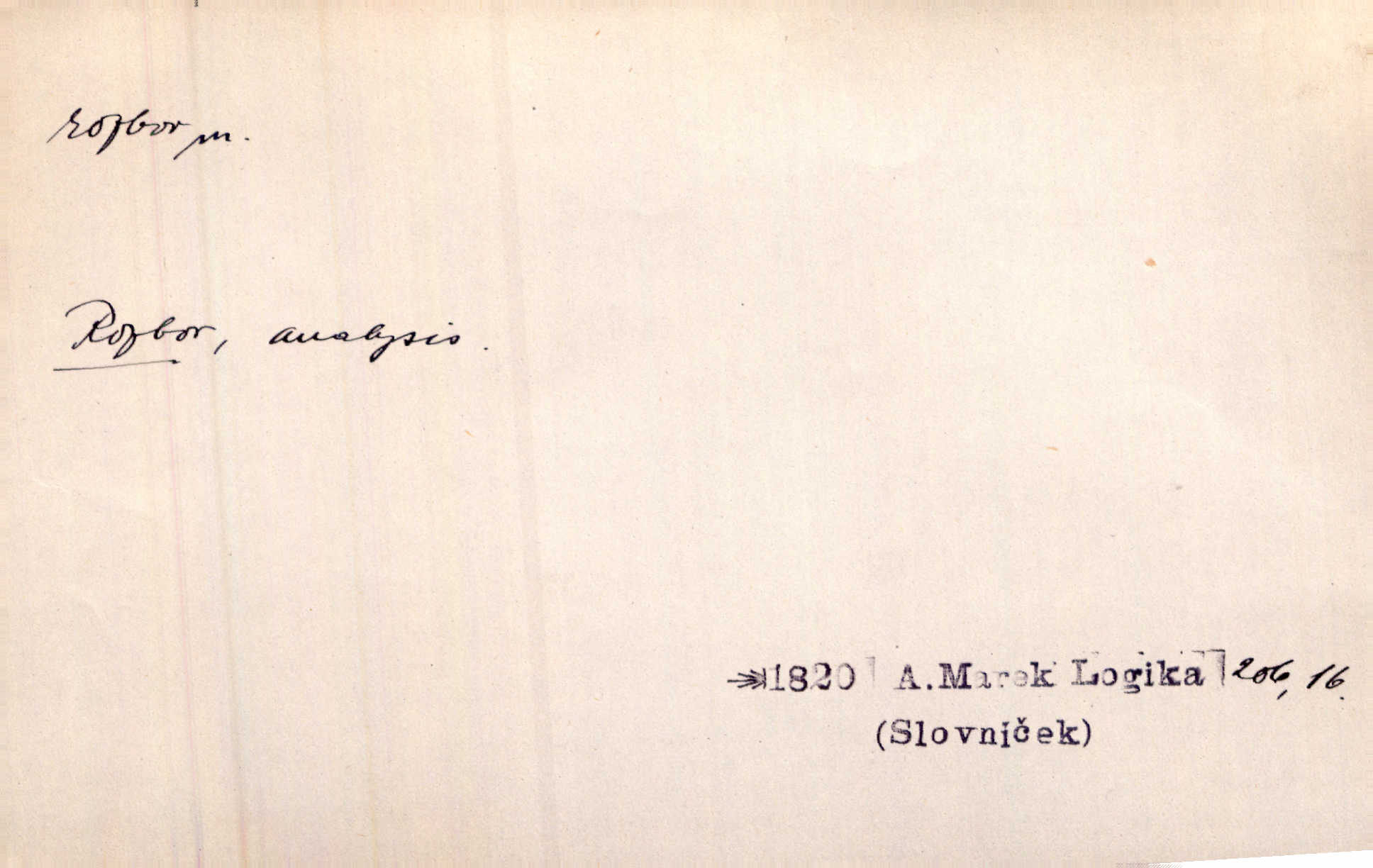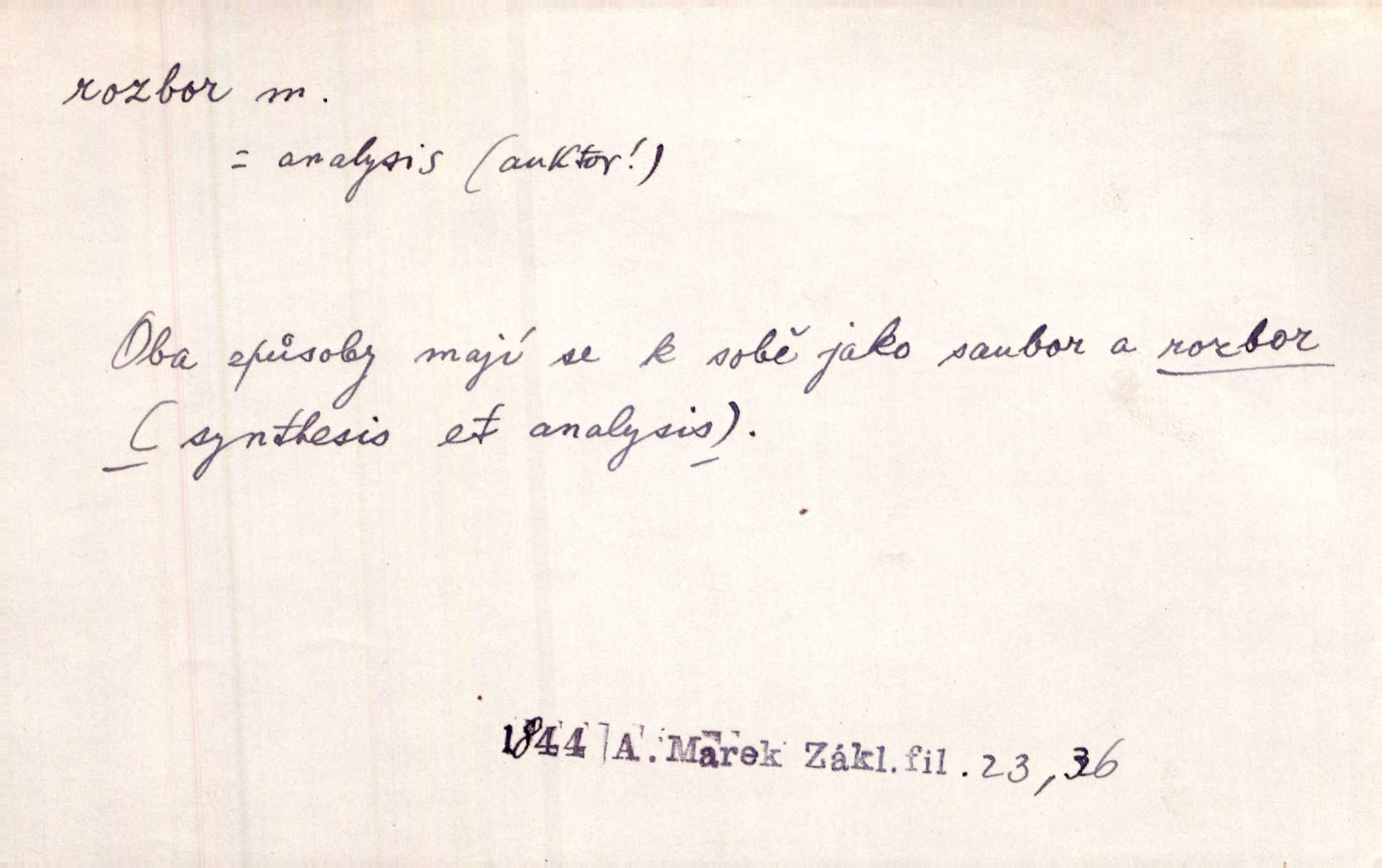 - rozbor, -u m. rozložení něčeho v jednodušší složky a vytčení podstatných znaků, analysa. Ačkoli mistr Kondelík jakživ se nezabýval rozborem duševních stavů kohokoli, cítil přece, že chování milé choti nemá příčiny ani v hněvu ani ve vzdoru. Herrm. Parnassie tak se zahloubala do rozboru svého postavení, že nemohla více usnouti. Šmil. Nechceme psáti rozbor jeho [Pravdova] díla. Jir. Nepustím se v nijaký literárně kritický rozbor. Čech. Obch. rozbor trhu soustavné zkoumání odbytových poměrů na trhu zboží. Hud. výklad hudebního díla, zejména po stránce motivické a formální. V hudbě programní též vysvětlení obsahu. Mat. úvaha o možnosti řešení, diskuse. Chem. analysa chemická. Rozbor kvalitativní, kvantitativní, vážkový, odměrný a j. Gram. rozbor slovní, větný a p. Tech. přehledné sepsání součástí a údajů výrobku znázorněného v dílenském výkresu.