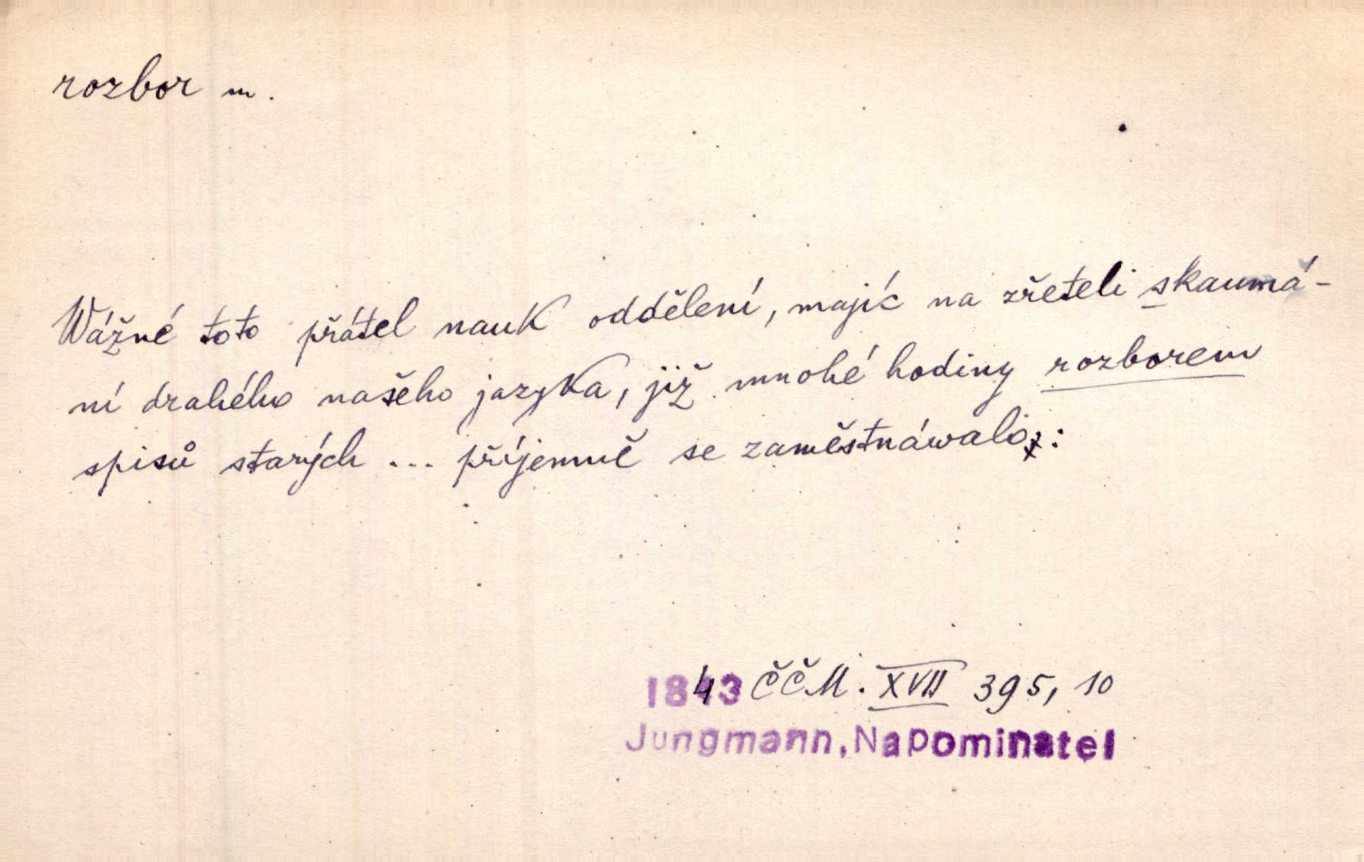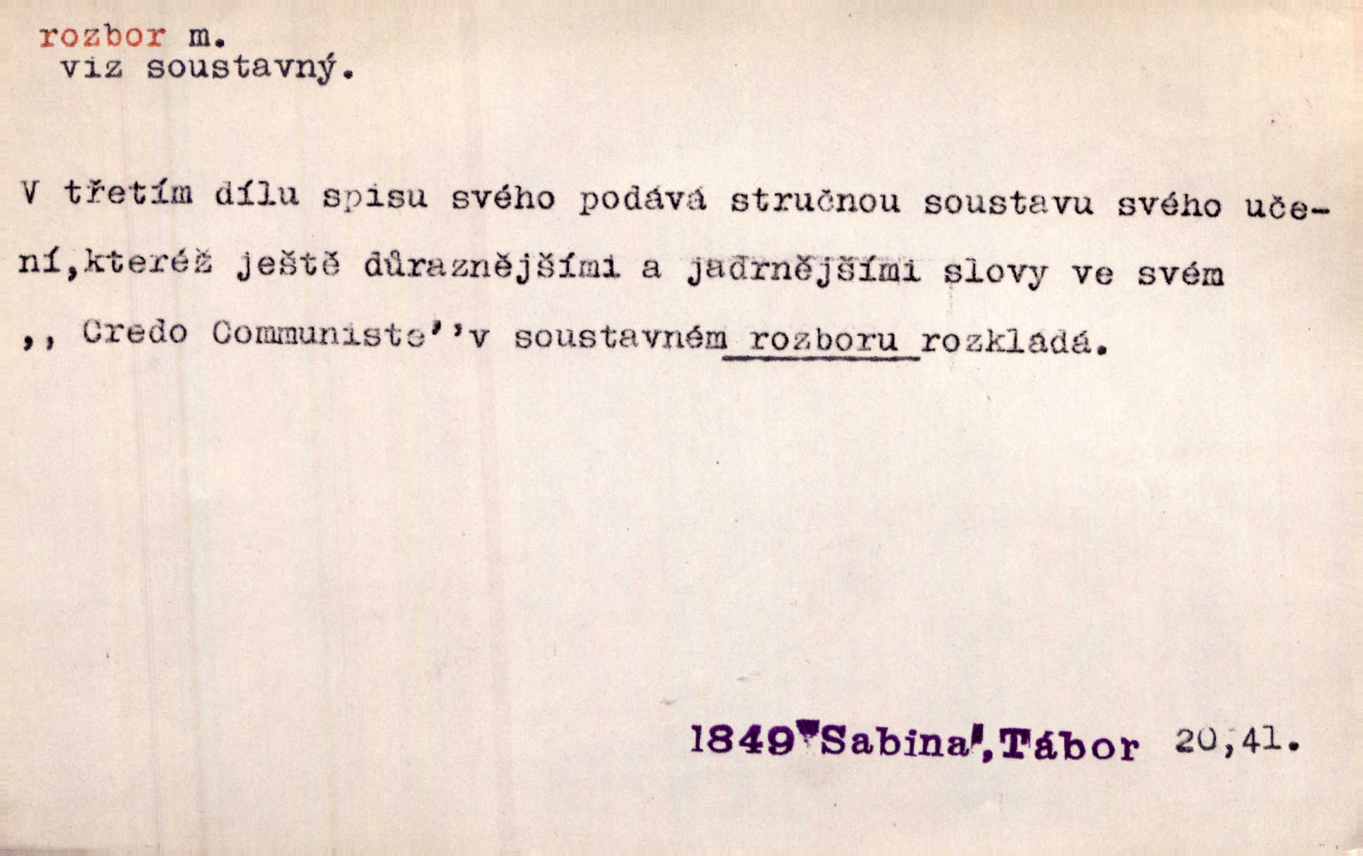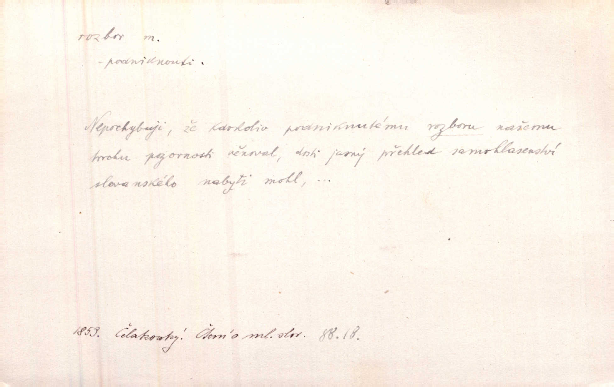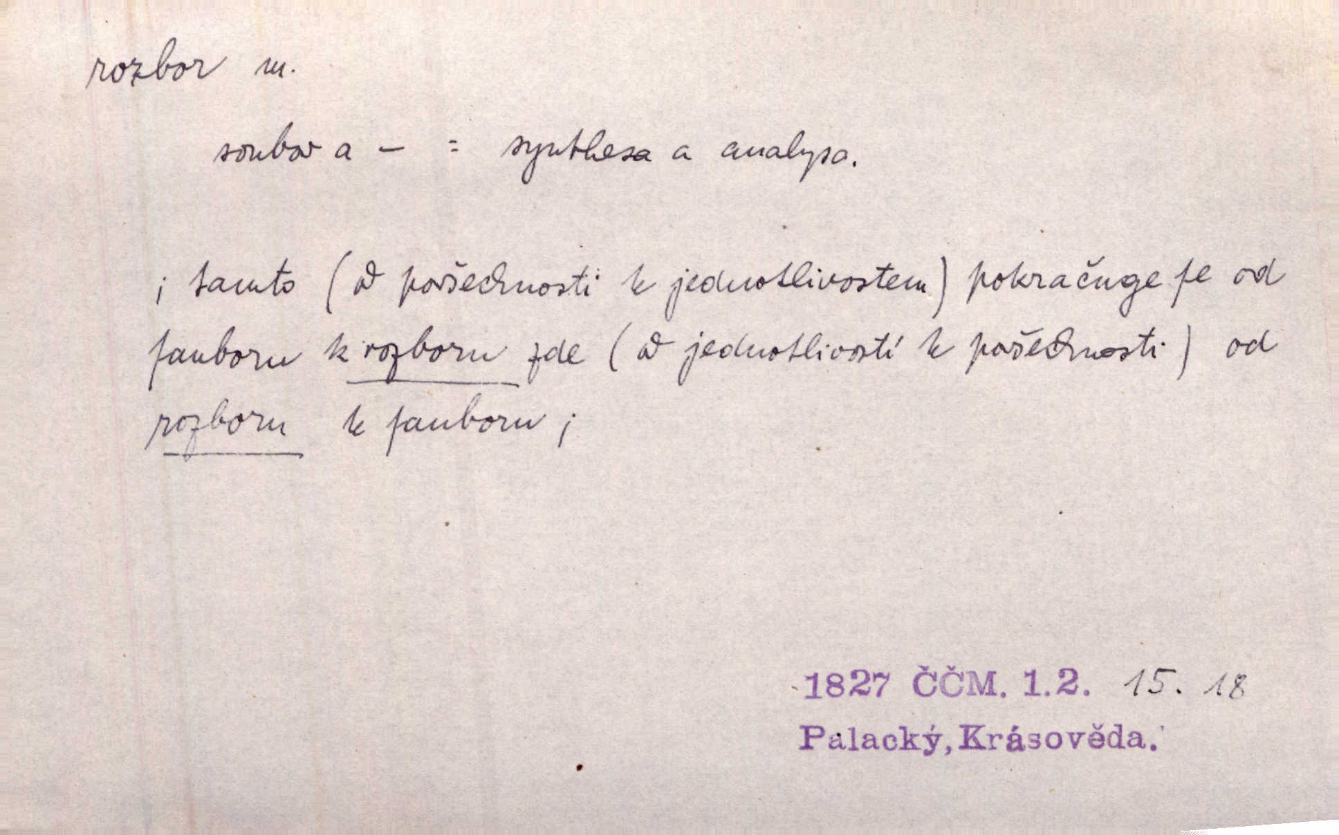 - rozbor, -u m. rozložení něčeho v jednodušší složky a vytčení podstatných znaků, analysa. Ačkoli mistr Kondelík jakživ se nezabýval rozborem duševních stavů kohokoli, cítil přece, že chování milé choti nemá příčiny ani v hněvu ani ve vzdoru. Herrm. Parnassie tak se zahloubala do rozboru svého postavení, že nemohla více usnouti. Šmil. Nechceme psáti rozbor jeho [Pravdova] díla. Jir. Nepustím se v nijaký literárně kritický rozbor. Čech. Obch. rozbor trhu soustavné zkoumání odbytových poměrů na trhu zboží. Hud. výklad hudebního díla, zejména po stránce motivické a formální. V hudbě programní též vysvětlení obsahu. Mat. úvaha o možnosti řešení, diskuse. Chem. analysa chemická. Rozbor kvalitativní, kvantitativní, vážkový, odměrný a j. Gram. rozbor slovní, větný a p. Tech. přehledné sepsání součástí a údajů výrobku znázorněného v dílenském výkresu.