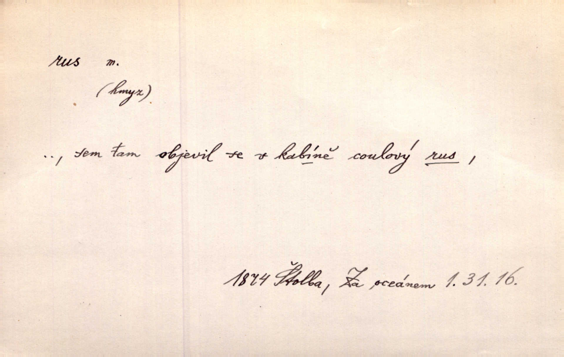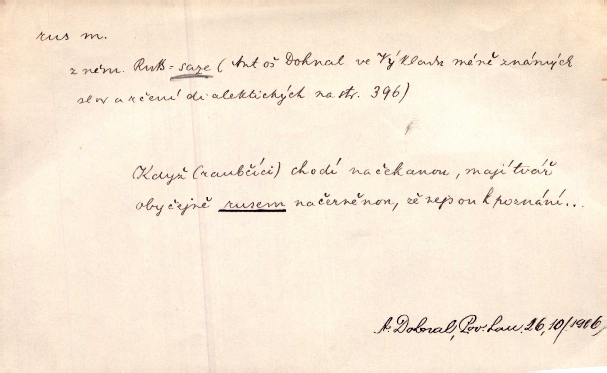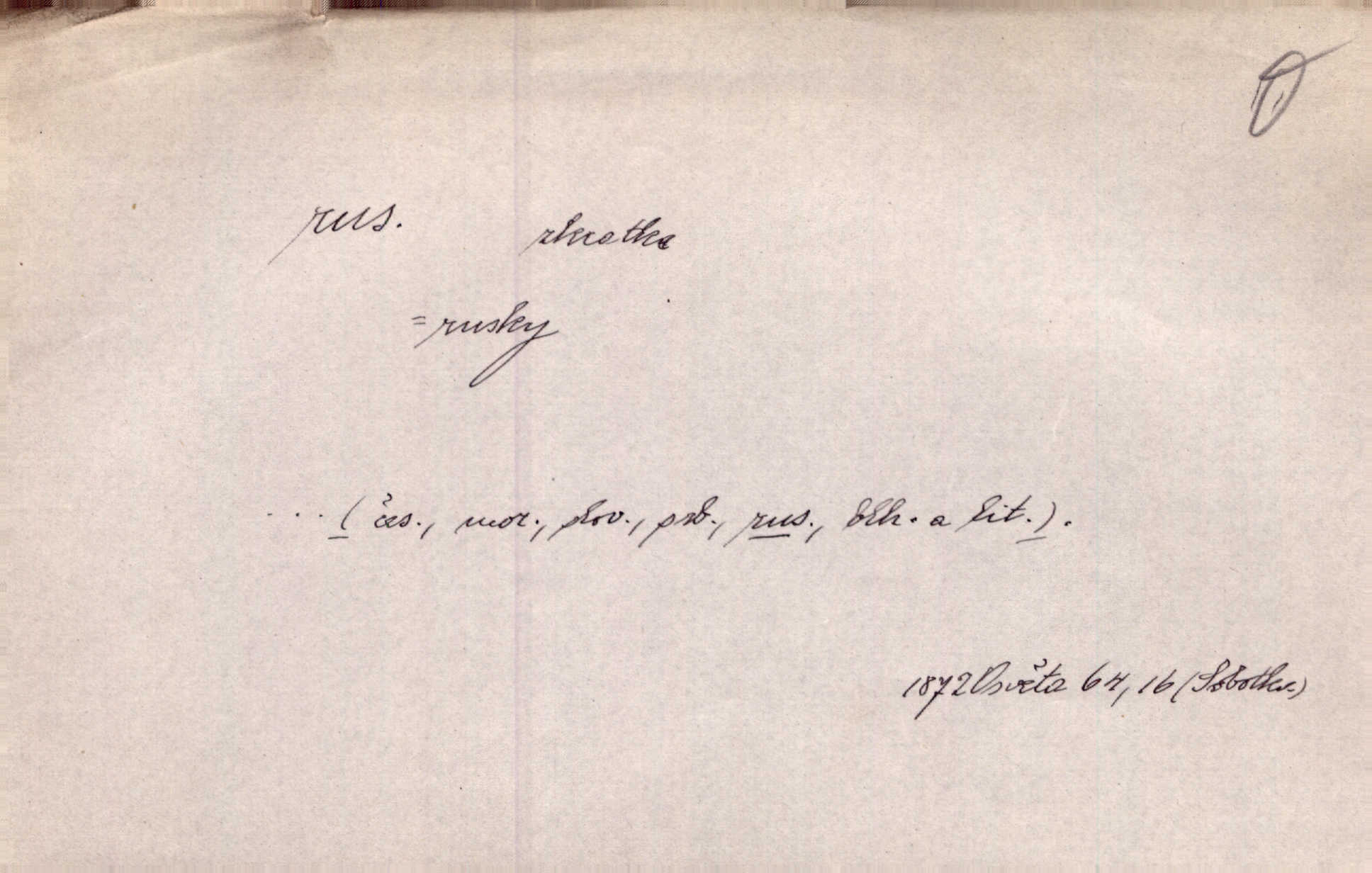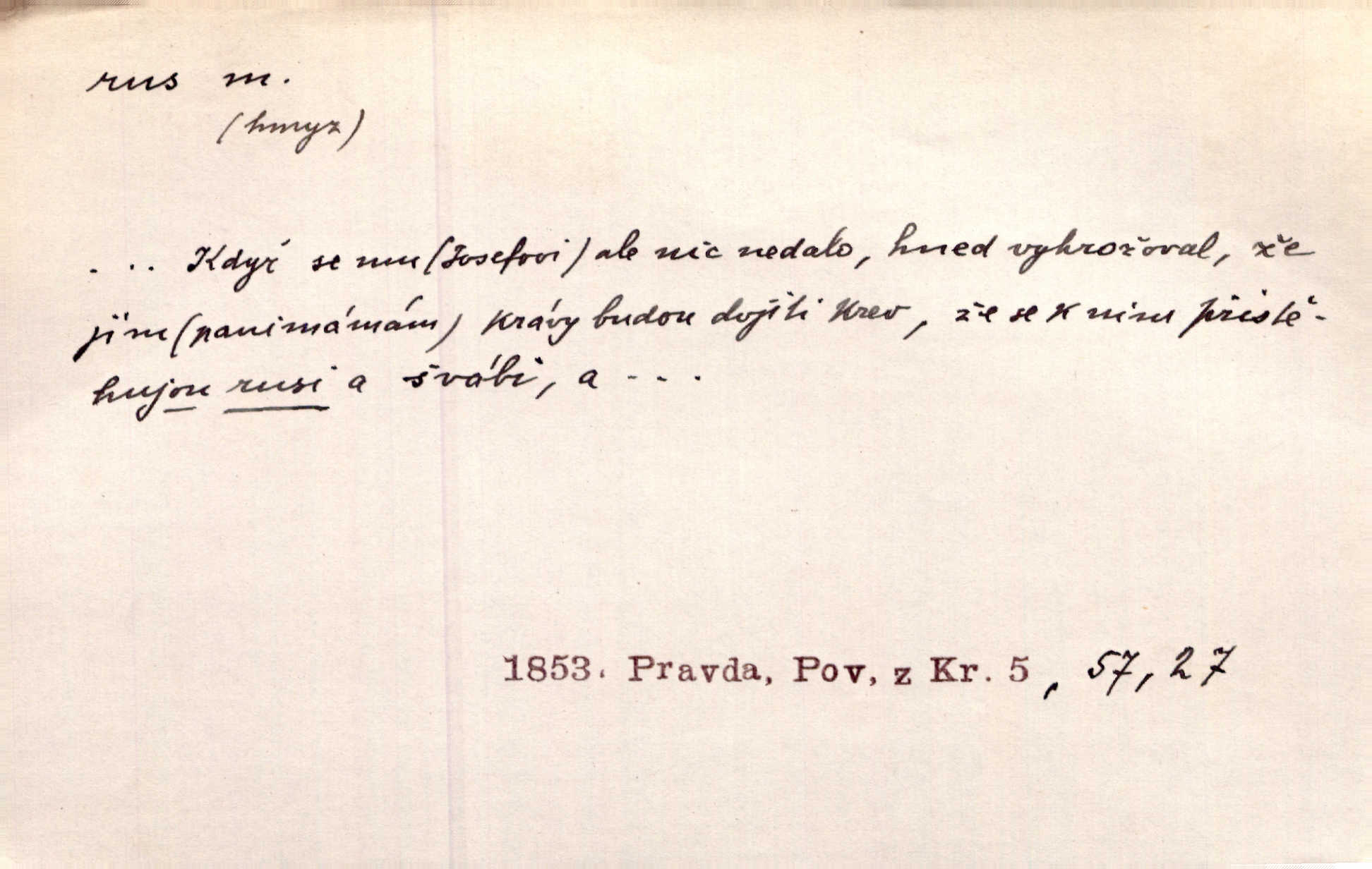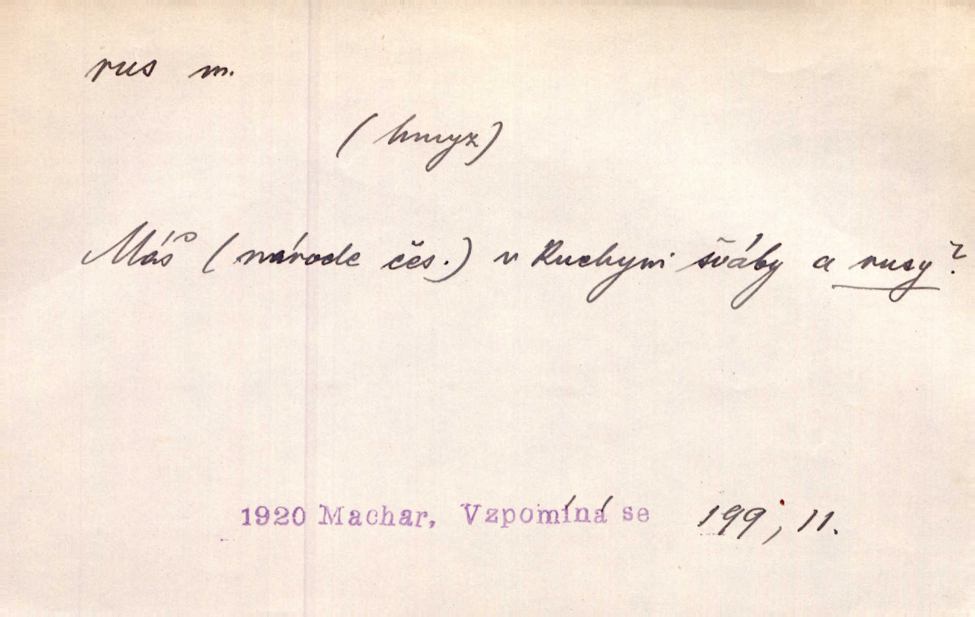 - rus, -u m. lid. saze. Když chodí [raubčíci] na čekanou, mají tvář obyčejně rusem načerněnou. Dohn. Malíř-kolorista dovede malovati i popelem, sazemi, rusem. Šal.