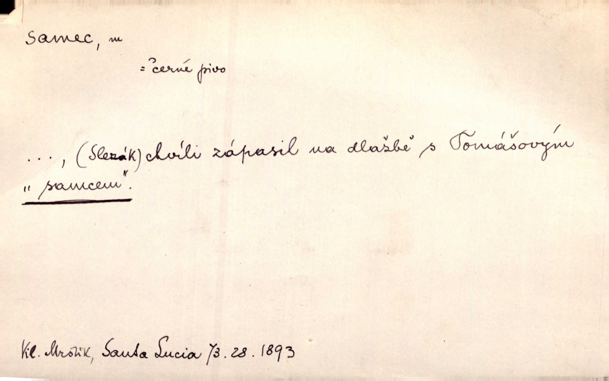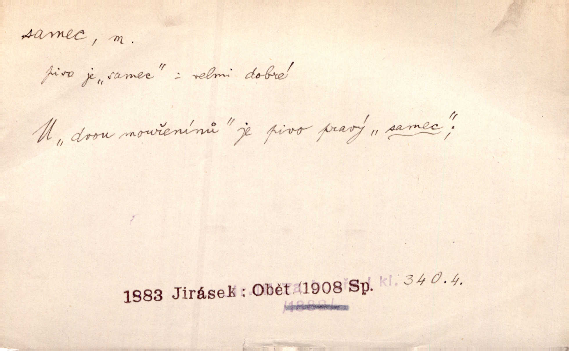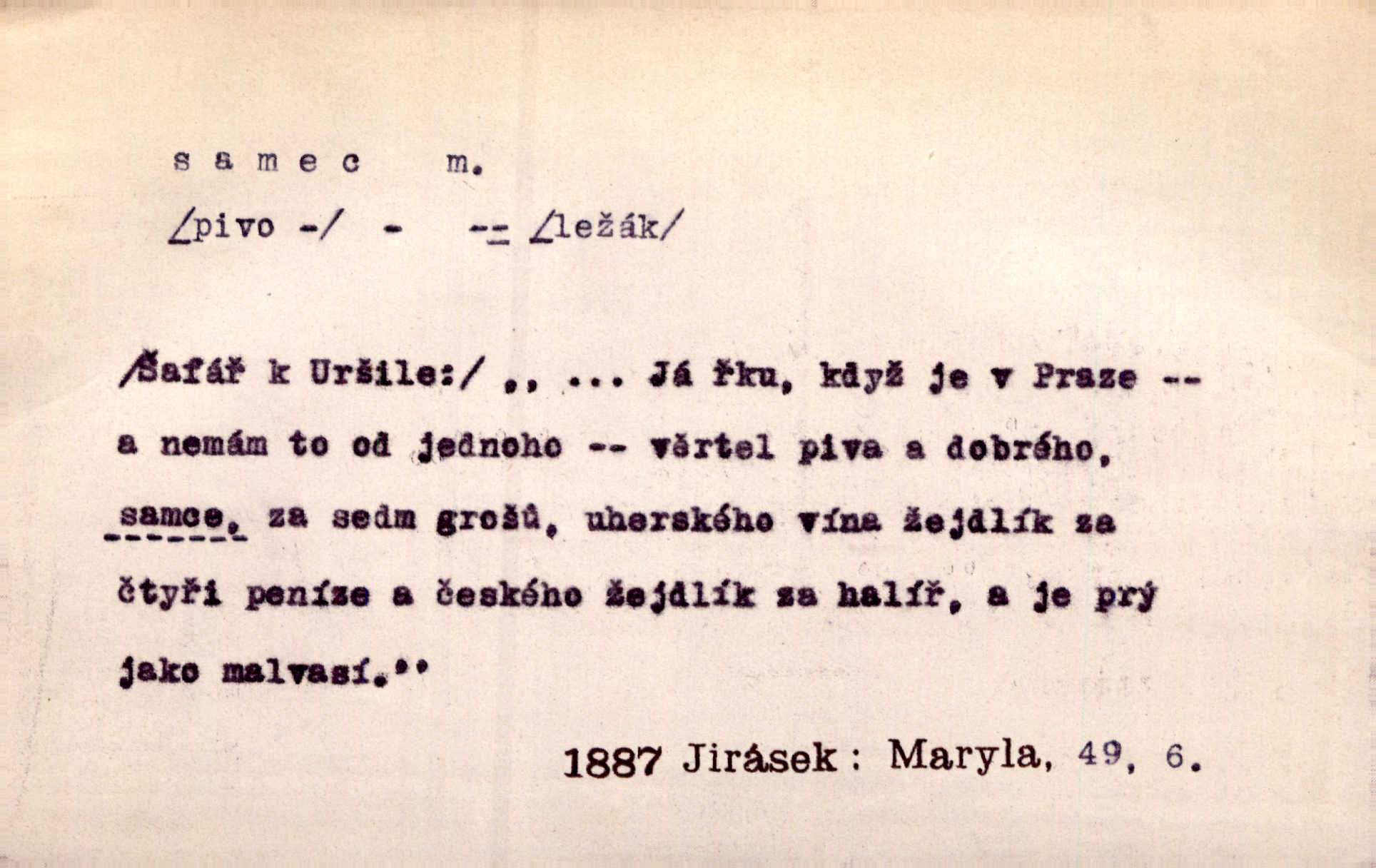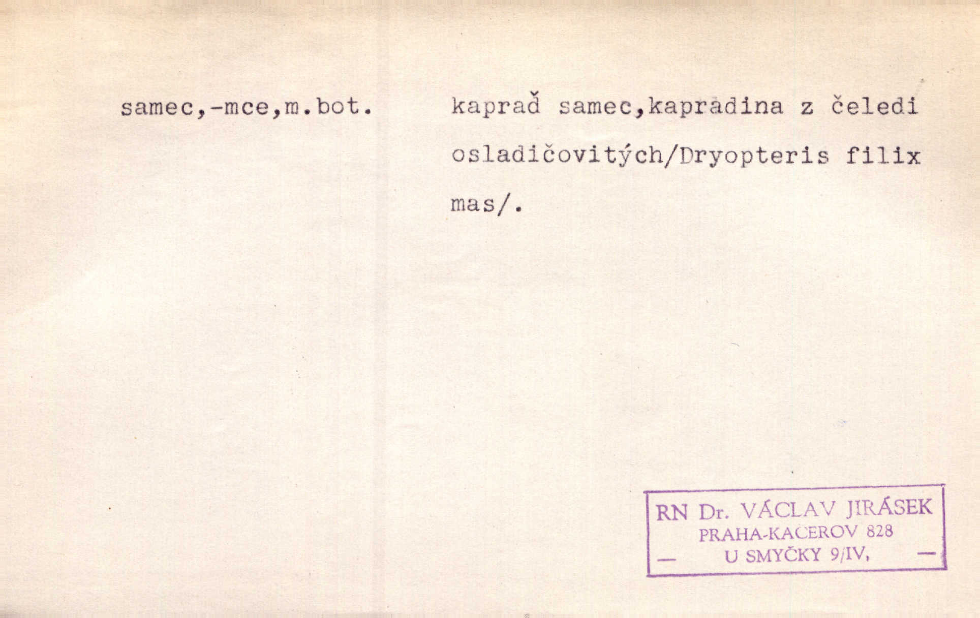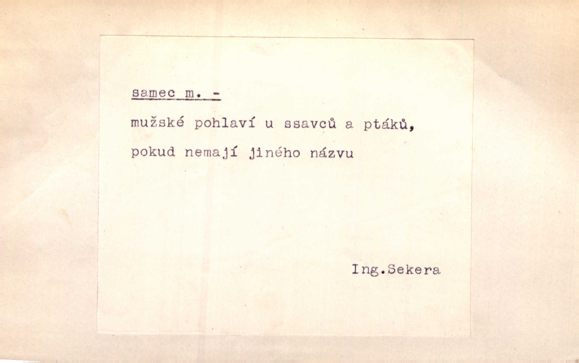- samec, -mce m. živočich mužského rodu. Kdesi v dálce zažalovala naříkáním soví samice, a samec jí odpověděl houkáním. Vrba. Jen jeden samec a jedna stará samice vždy [v králíkárně] zbyla. A. Mrš. Jsi hezká jako tygřice, když se tulí k samci. Staš. Expr. Zírala na ně [oba nápadníky] s dychtivou, cynickou zvědavostí holky, pro niž se pustili dva samci do křížku. Hlad. Bot. kapraď samec kapradina z čeledi osladičovitých, Dryopteris filix. D Ob. něco velkého, důkladného, silného. Zapálil si viržinko — samce jako uhel černého. Vrba. Vojenský soud, to je samec! soudí, jen se práší. Havl. Přijel [generál] na autu, samci pořádným. John. Krindofindo, to byla zábava samec! Bass. Včera v noci byl opět „samec — mráz“. Nár. p. My tu máme dnes takový „samec“ se sněhem po kolena silný mráz. Venk. D Ob. dobré pivo, ležák. Jak živ takového v Praze nepil [student]‚ ani když „u modré lišky“ nalévali i to nejlepší staré pivo, pravého samce. Jir. „Děkuji a přijdu hned — já jen skočím pro džbánek samce!“ O. Han. D V mírném zaklení. Dědoušek tak se rozjařil, že udeřil na stůl a zvolal: „Samec! To je historie!“ Hol. „Ale vy jste si uměl vybrat posluhu, Alois, aby vám to šťastně dopadlo, pardie samec!“ Herrm. Na severní točně prý panuje noc půl leta dlouhá. Mordie samec! tam bych nechtěl být ponocným. Paleč.