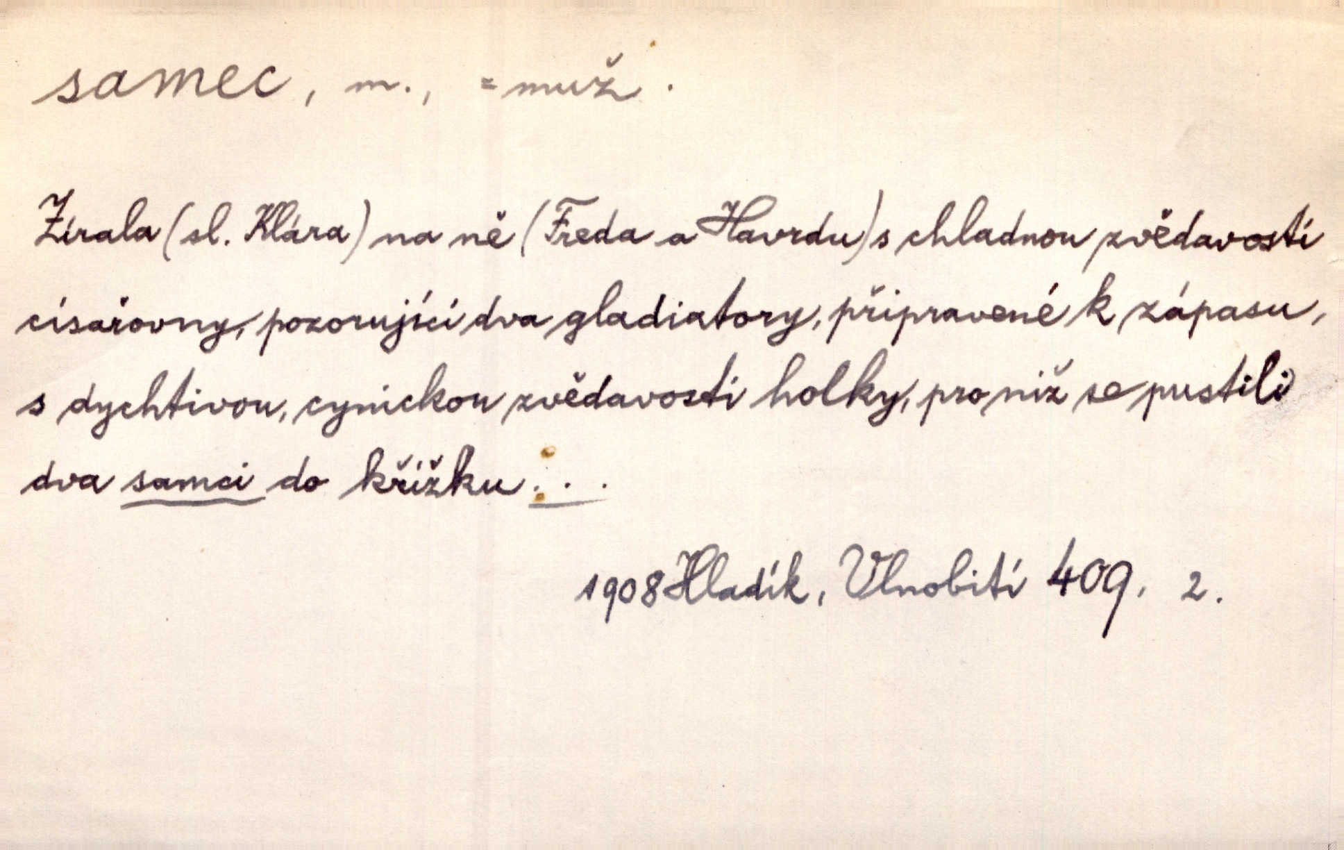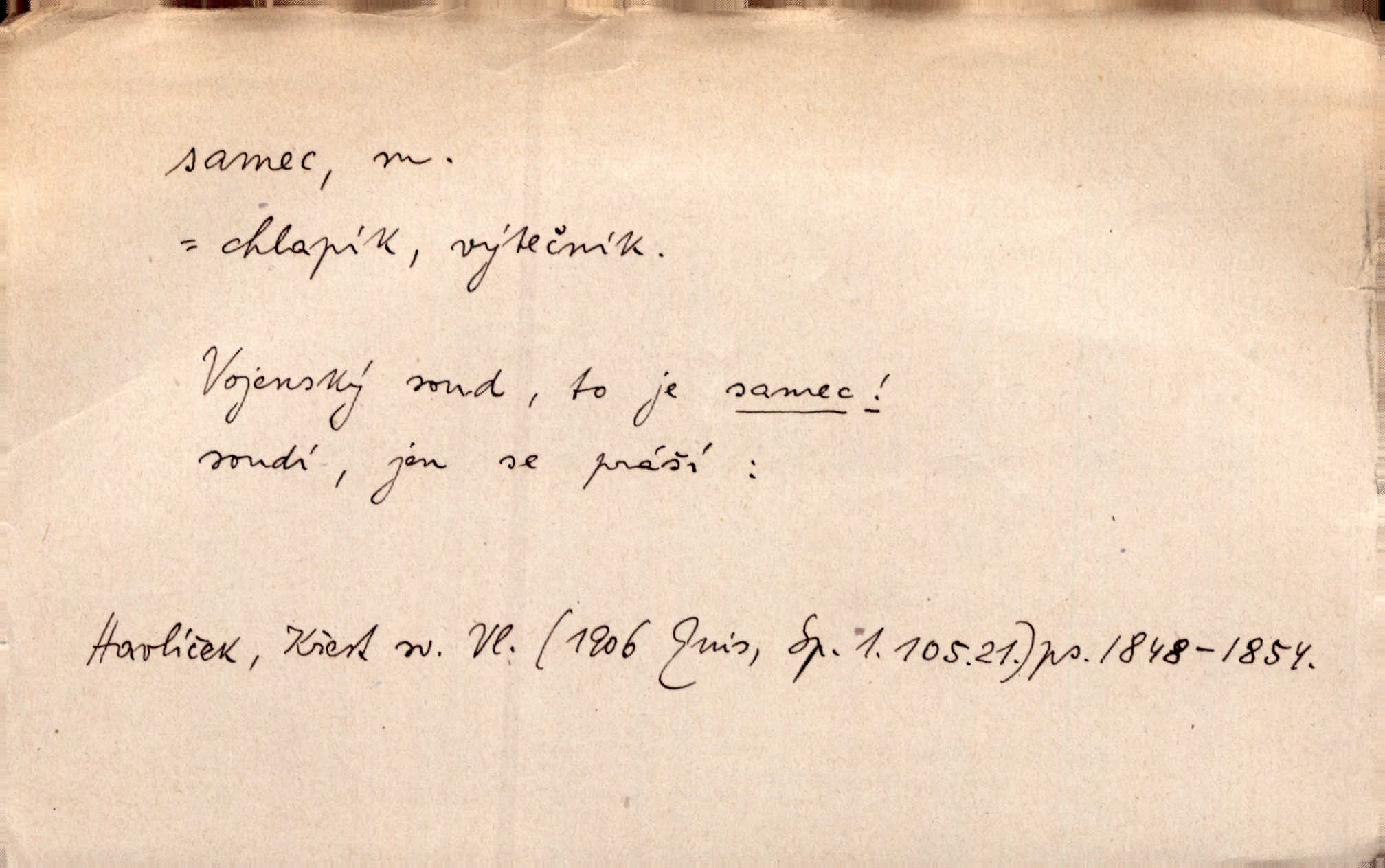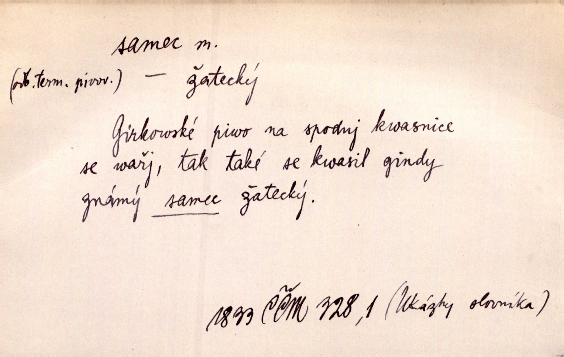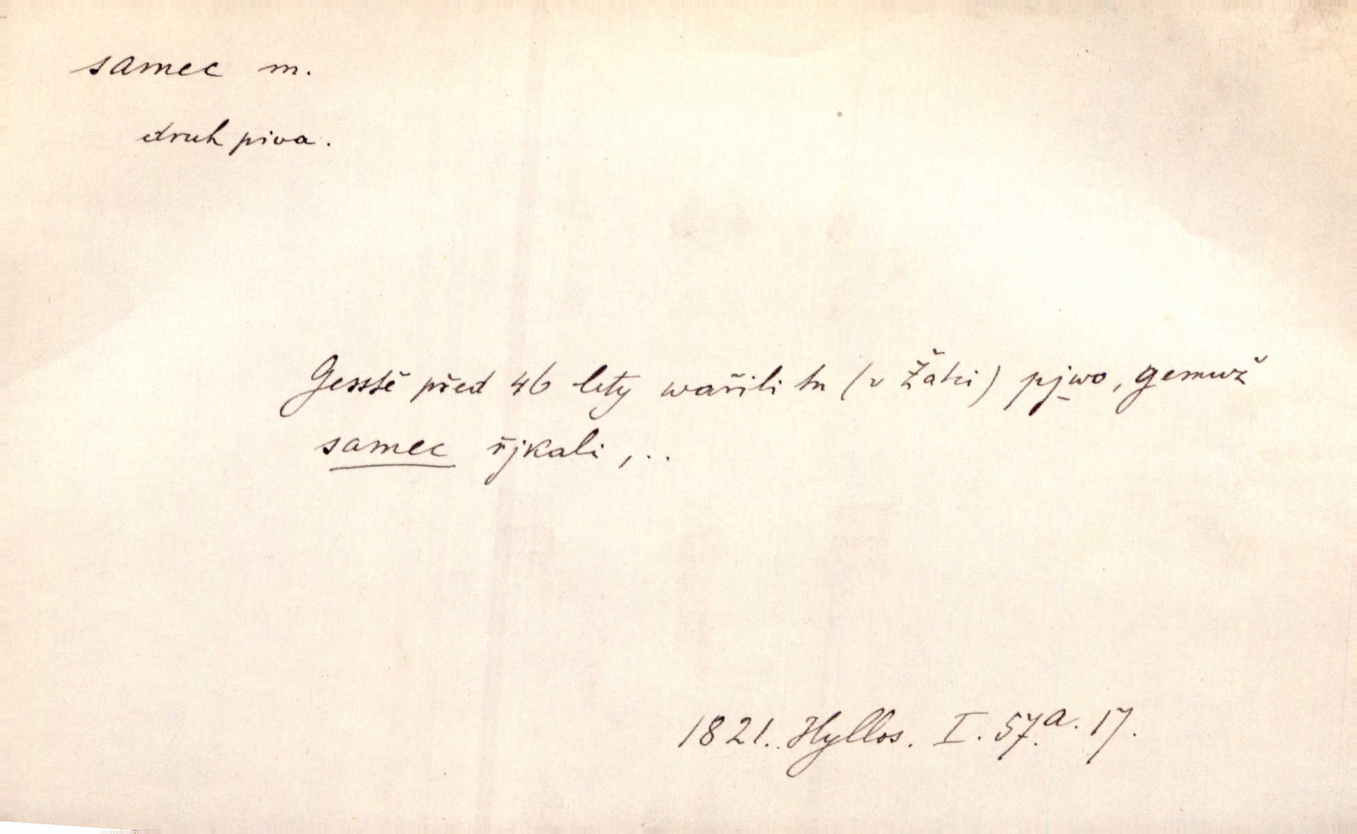 - samec, -mce m. živočich mužského rodu. Kdesi v dálce zažalovala naříkáním soví samice, a samec jí odpověděl houkáním. Vrba. Jen jeden samec a jedna stará samice vždy [v králíkárně] zbyla. A. Mrš. Jsi hezká jako tygřice, když se tulí k samci. Staš. Expr. Zírala na ně [oba nápadníky] s dychtivou, cynickou zvědavostí holky, pro niž se pustili dva samci do křížku. Hlad. Bot. kapraď samec kapradina z čeledi osladičovitých, Dryopteris filix. D Ob. něco velkého, důkladného, silného. Zapálil si viržinko — samce jako uhel černého. Vrba. Vojenský soud, to je samec! soudí, jen se práší. Havl. Přijel [generál] na autu, samci pořádným. John. Krindofindo, to byla zábava samec! Bass. Včera v noci byl opět „samec — mráz“. Nár. p. My tu máme dnes takový „samec“ se sněhem po kolena silný mráz. Venk. D Ob. dobré pivo, ležák. Jak živ takového v Praze nepil [student]‚ ani když „u modré lišky“ nalévali i to nejlepší staré pivo, pravého samce. Jir. „Děkuji a přijdu hned — já jen skočím pro džbánek samce!“ O. Han. D V mírném zaklení. Dědoušek tak se rozjařil, že udeřil na stůl a zvolal: „Samec! To je historie!“ Hol. „Ale vy jste si uměl vybrat posluhu, Alois, aby vám to šťastně dopadlo, pardie samec!“ Herrm. Na severní točně prý panuje noc půl leta dlouhá. Mordie samec! tam bych nechtěl být ponocným. Paleč.