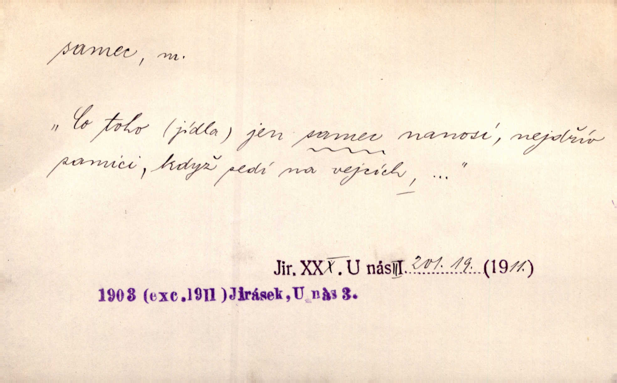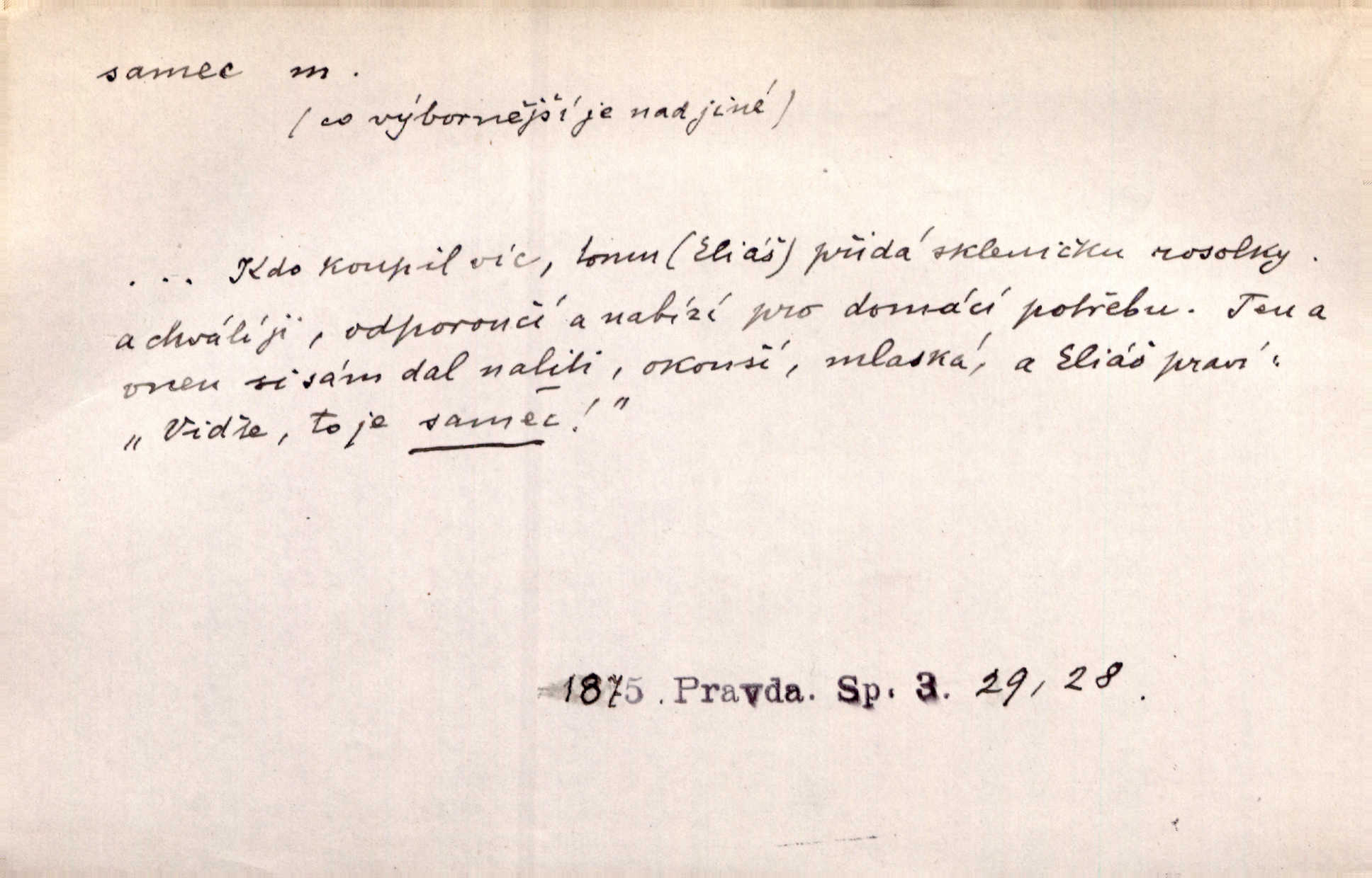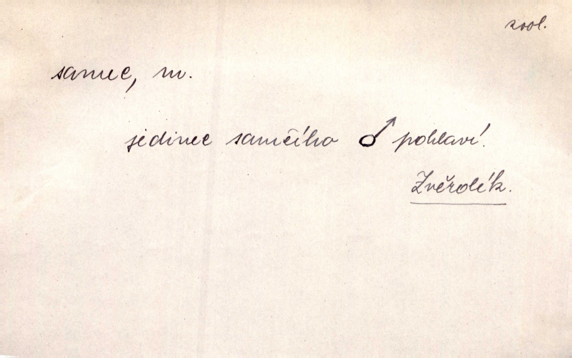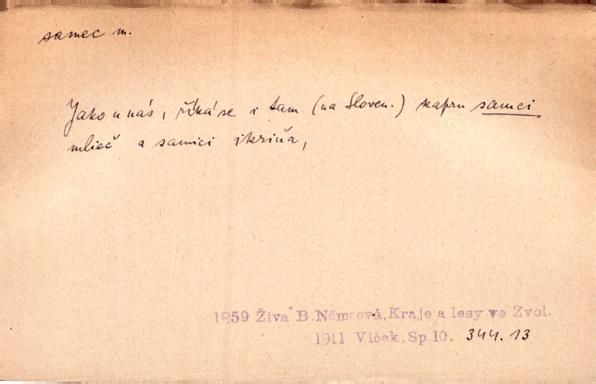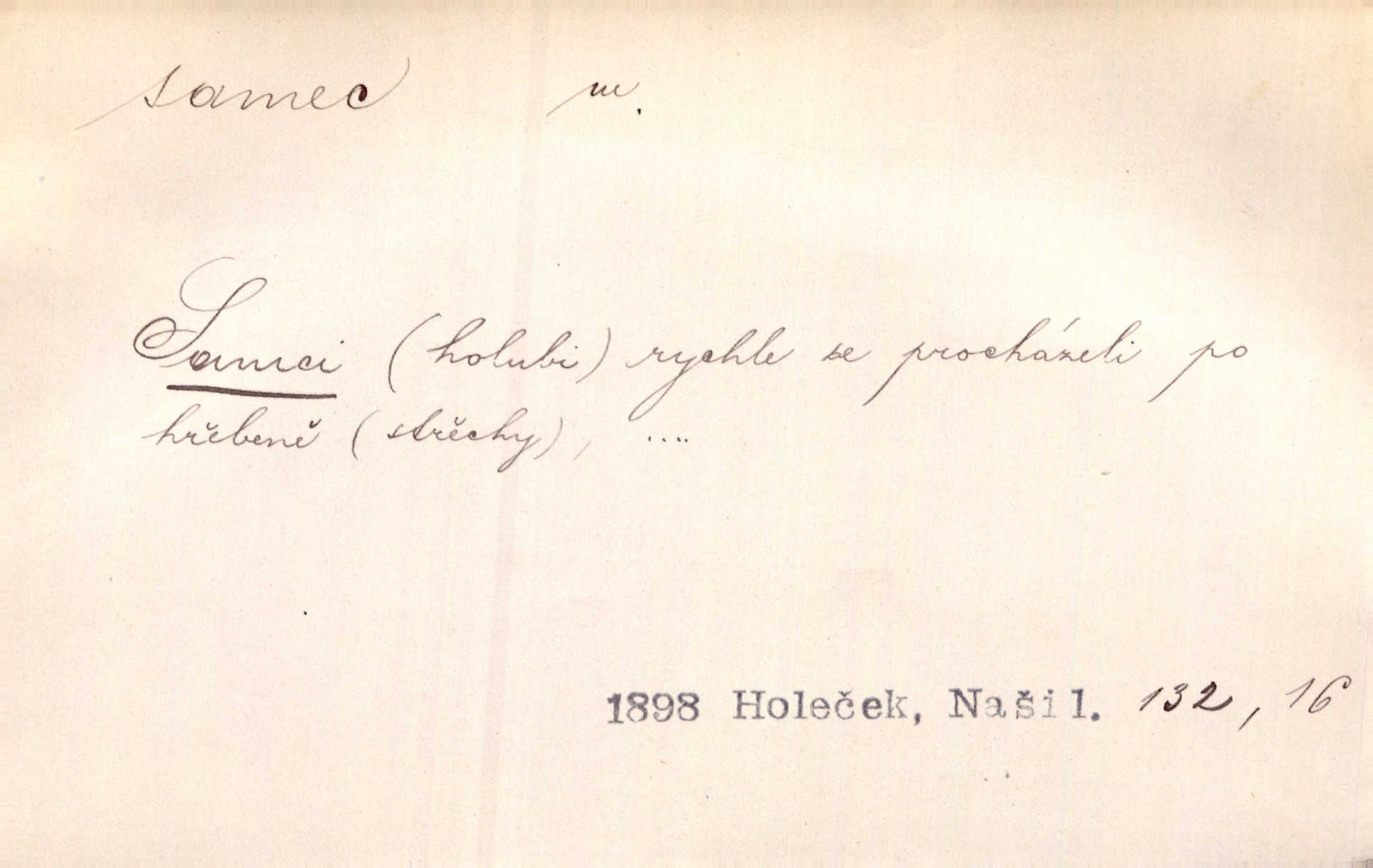 - samec, -mce m. živočich mužského rodu. Kdesi v dálce zažalovala naříkáním soví samice, a samec jí odpověděl houkáním. Vrba. Jen jeden samec a jedna stará samice vždy [v králíkárně] zbyla. A. Mrš. Jsi hezká jako tygřice, když se tulí k samci. Staš. Expr. Zírala na ně [oba nápadníky] s dychtivou, cynickou zvědavostí holky, pro niž se pustili dva samci do křížku. Hlad. Bot. kapraď samec kapradina z čeledi osladičovitých, Dryopteris filix. D Ob. něco velkého, důkladného, silného. Zapálil si viržinko — samce jako uhel černého. Vrba. Vojenský soud, to je samec! soudí, jen se práší. Havl. Přijel [generál] na autu, samci pořádným. John. Krindofindo, to byla zábava samec! Bass. Včera v noci byl opět „samec — mráz“. Nár. p. My tu máme dnes takový „samec“ se sněhem po kolena silný mráz. Venk. D Ob. dobré pivo, ležák. Jak živ takového v Praze nepil [student]‚ ani když „u modré lišky“ nalévali i to nejlepší staré pivo, pravého samce. Jir. „Děkuji a přijdu hned — já jen skočím pro džbánek samce!“ O. Han. D V mírném zaklení. Dědoušek tak se rozjařil, že udeřil na stůl a zvolal: „Samec! To je historie!“ Hol. „Ale vy jste si uměl vybrat posluhu, Alois, aby vám to šťastně dopadlo, pardie samec!“ Herrm. Na severní točně prý panuje noc půl leta dlouhá. Mordie samec! tam bych nechtěl být ponocným. Paleč.