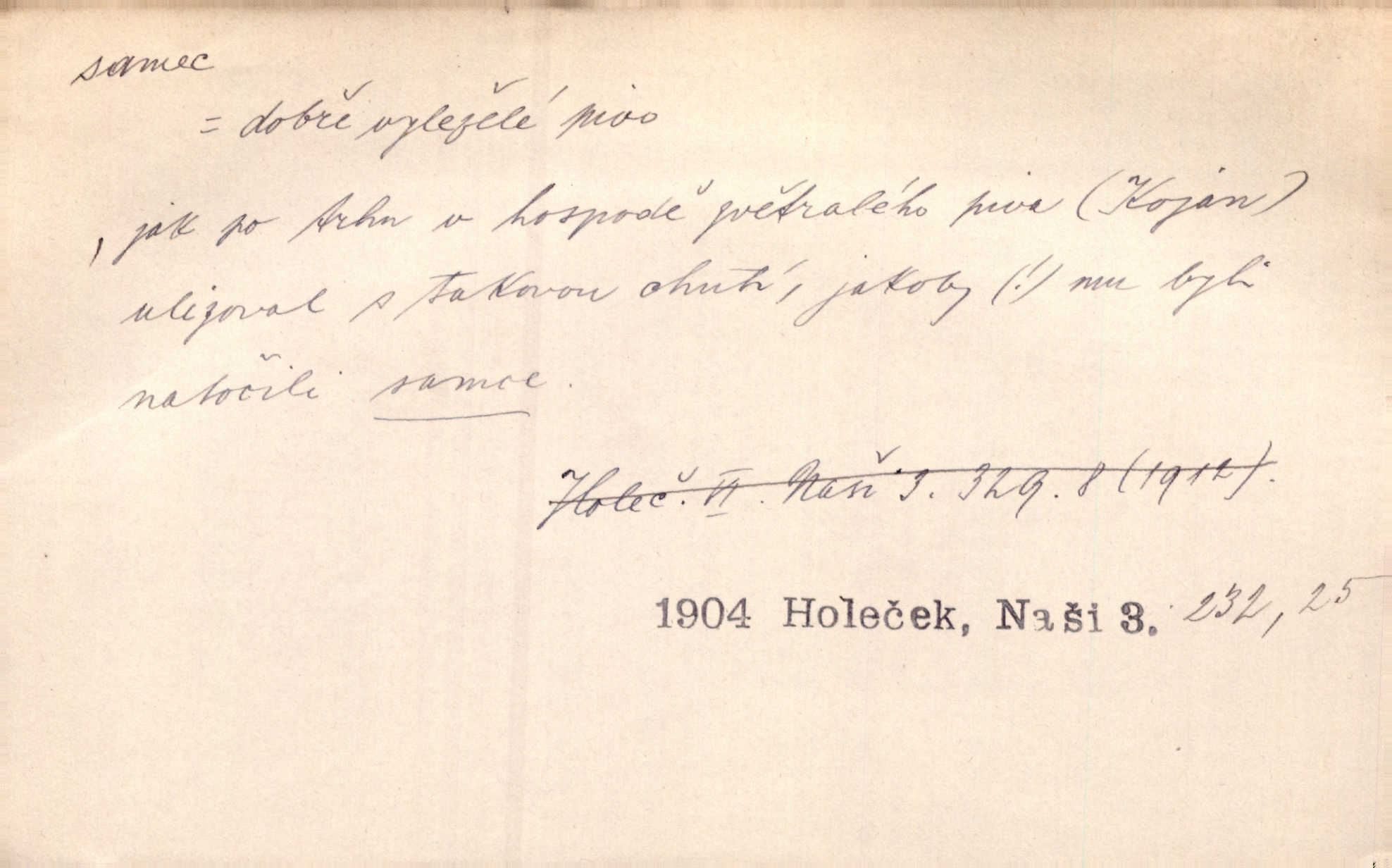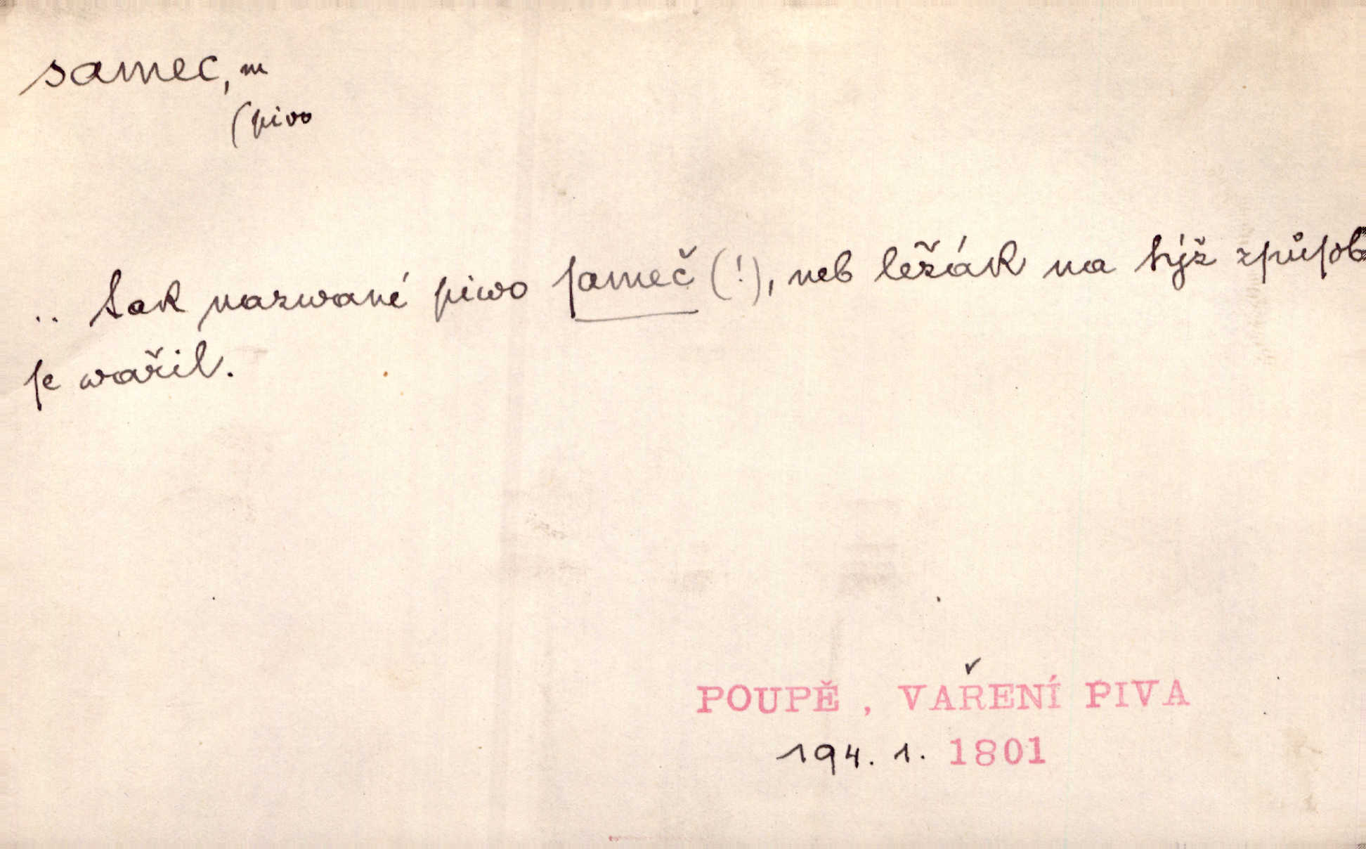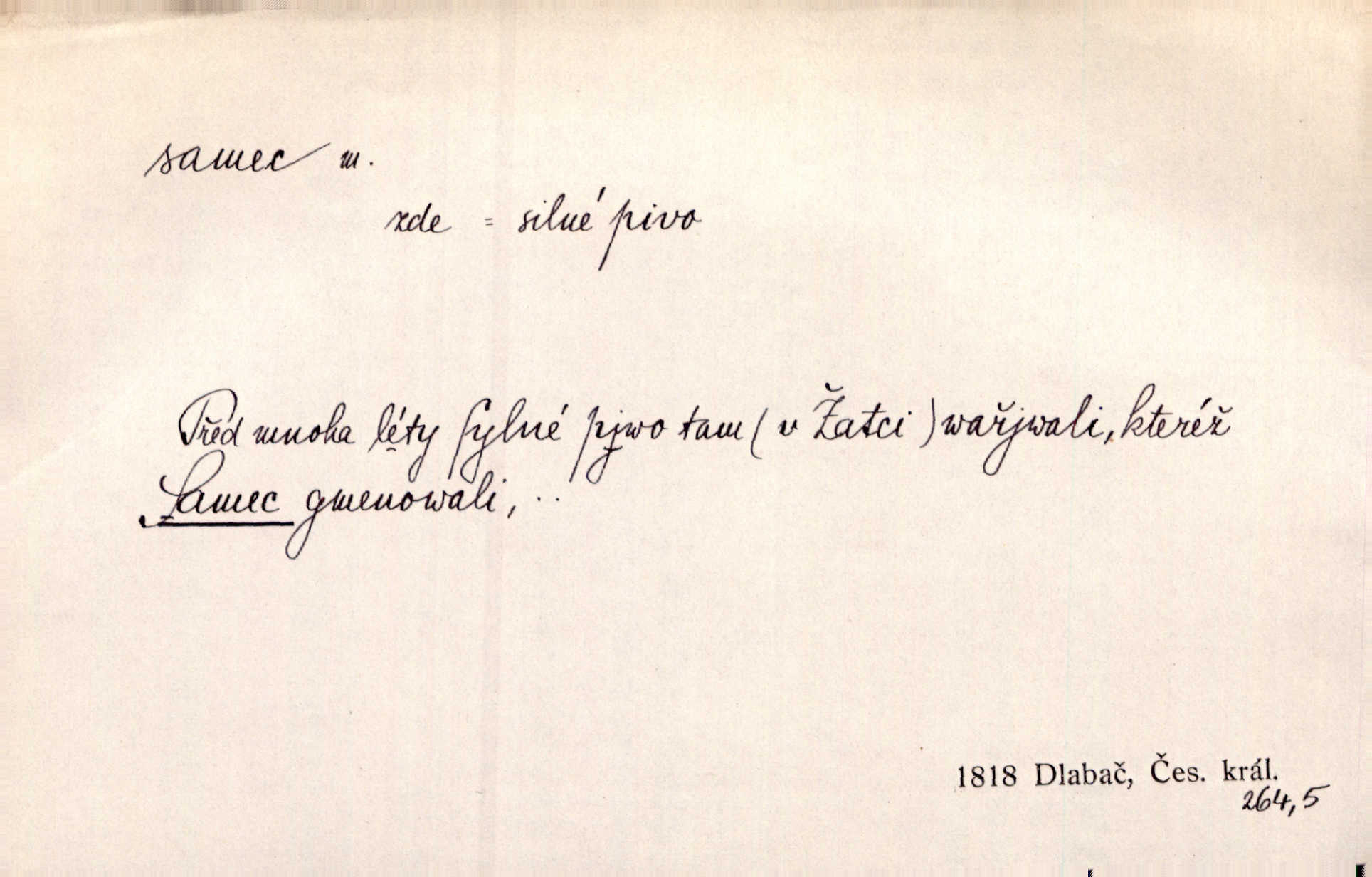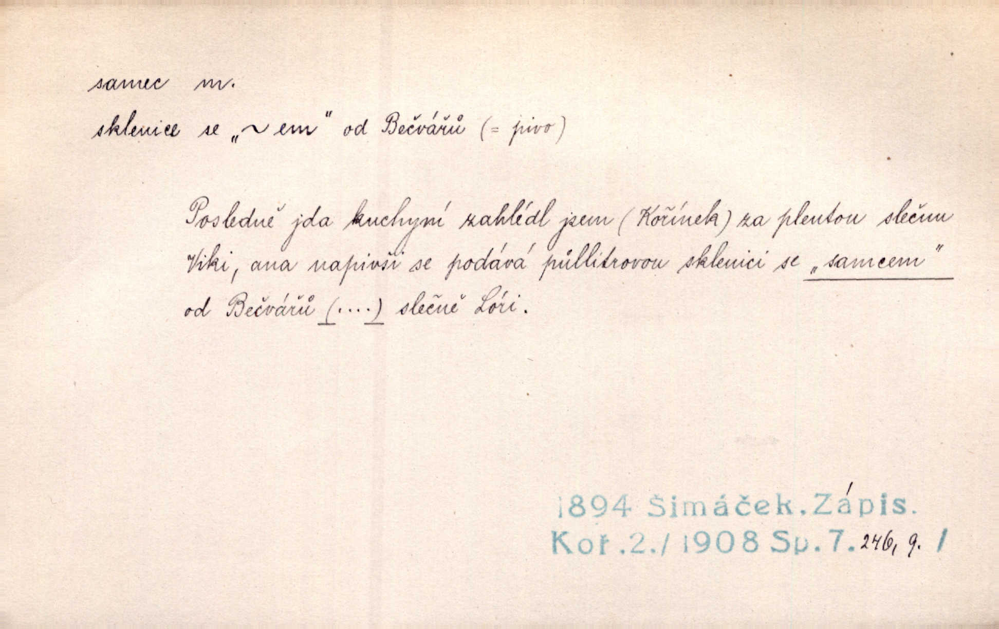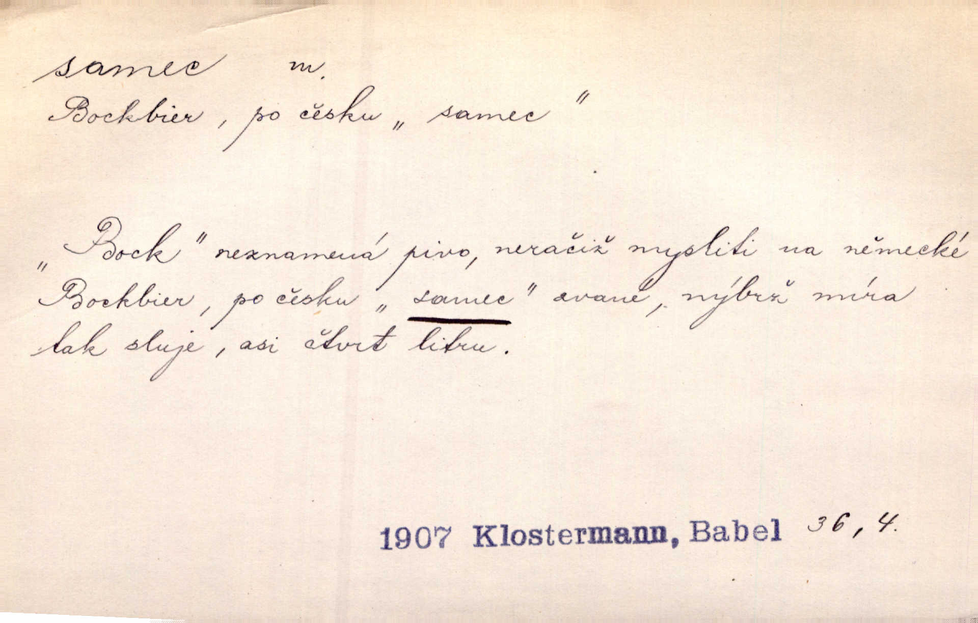 - samec, -mce m. živočich mužského rodu. Kdesi v dálce zažalovala naříkáním soví samice, a samec jí odpověděl houkáním. Vrba. Jen jeden samec a jedna stará samice vždy [v králíkárně] zbyla. A. Mrš. Jsi hezká jako tygřice, když se tulí k samci. Staš. Expr. Zírala na ně [oba nápadníky] s dychtivou, cynickou zvědavostí holky, pro niž se pustili dva samci do křížku. Hlad. Bot. kapraď samec kapradina z čeledi osladičovitých, Dryopteris filix. D Ob. něco velkého, důkladného, silného. Zapálil si viržinko — samce jako uhel černého. Vrba. Vojenský soud, to je samec! soudí, jen se práší. Havl. Přijel [generál] na autu, samci pořádným. John. Krindofindo, to byla zábava samec! Bass. Včera v noci byl opět „samec — mráz“. Nár. p. My tu máme dnes takový „samec“ se sněhem po kolena silný mráz. Venk. D Ob. dobré pivo, ležák. Jak živ takového v Praze nepil [student]‚ ani když „u modré lišky“ nalévali i to nejlepší staré pivo, pravého samce. Jir. „Děkuji a přijdu hned — já jen skočím pro džbánek samce!“ O. Han. D V mírném zaklení. Dědoušek tak se rozjařil, že udeřil na stůl a zvolal: „Samec! To je historie!“ Hol. „Ale vy jste si uměl vybrat posluhu, Alois, aby vám to šťastně dopadlo, pardie samec!“ Herrm. Na severní točně prý panuje noc půl leta dlouhá. Mordie samec! tam bych nechtěl být ponocným. Paleč.