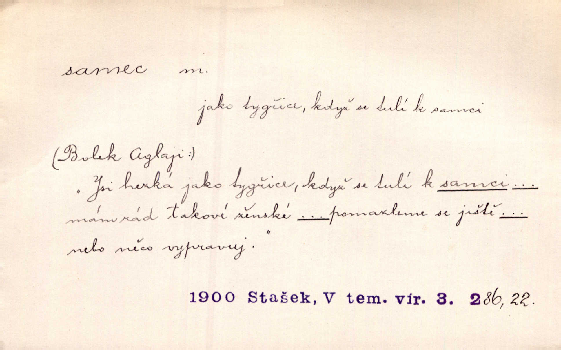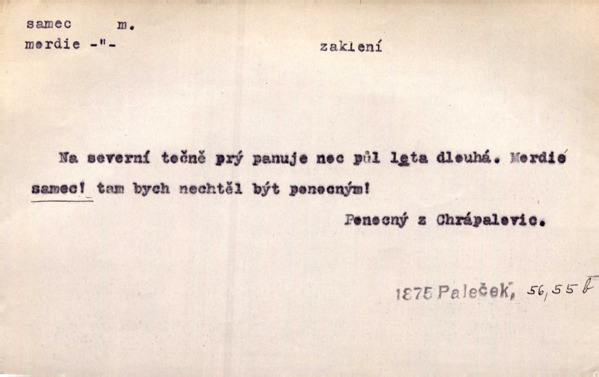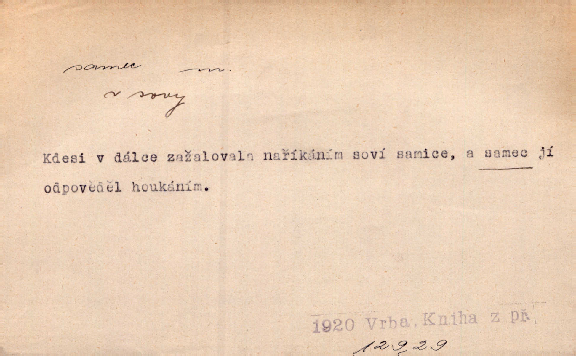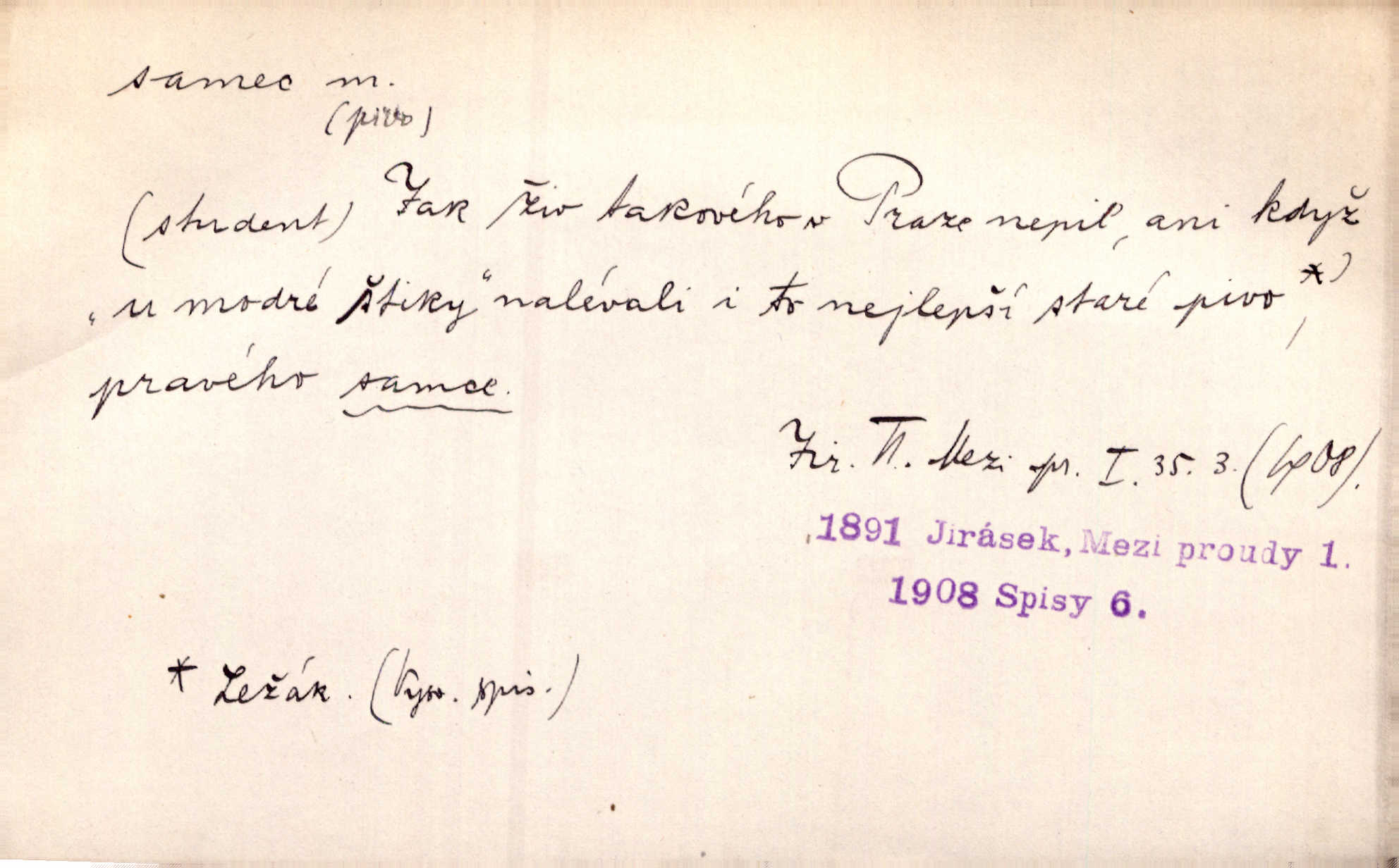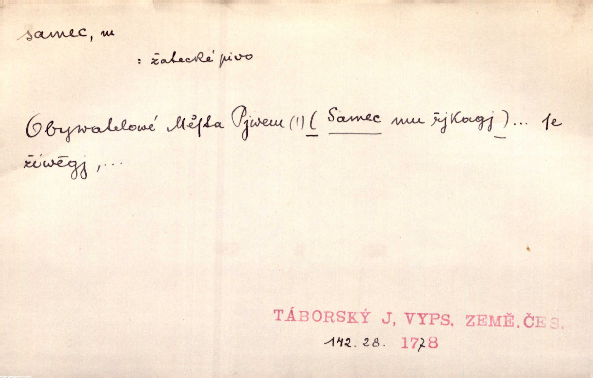 - samec, -mce m. živočich mužského rodu. Kdesi v dálce zažalovala naříkáním soví samice, a samec jí odpověděl houkáním. Vrba. Jen jeden samec a jedna stará samice vždy [v králíkárně] zbyla. A. Mrš. Jsi hezká jako tygřice, když se tulí k samci. Staš. Expr. Zírala na ně [oba nápadníky] s dychtivou, cynickou zvědavostí holky, pro niž se pustili dva samci do křížku. Hlad. Bot. kapraď samec kapradina z čeledi osladičovitých, Dryopteris filix. D Ob. něco velkého, důkladného, silného. Zapálil si viržinko — samce jako uhel černého. Vrba. Vojenský soud, to je samec! soudí, jen se práší. Havl. Přijel [generál] na autu, samci pořádným. John. Krindofindo, to byla zábava samec! Bass. Včera v noci byl opět „samec — mráz“. Nár. p. My tu máme dnes takový „samec“ se sněhem po kolena silný mráz. Venk. D Ob. dobré pivo, ležák. Jak živ takového v Praze nepil [student]‚ ani když „u modré lišky“ nalévali i to nejlepší staré pivo, pravého samce. Jir. „Děkuji a přijdu hned — já jen skočím pro džbánek samce!“ O. Han. D V mírném zaklení. Dědoušek tak se rozjařil, že udeřil na stůl a zvolal: „Samec! To je historie!“ Hol. „Ale vy jste si uměl vybrat posluhu, Alois, aby vám to šťastně dopadlo, pardie samec!“ Herrm. Na severní točně prý panuje noc půl leta dlouhá. Mordie samec! tam bych nechtěl být ponocným. Paleč.