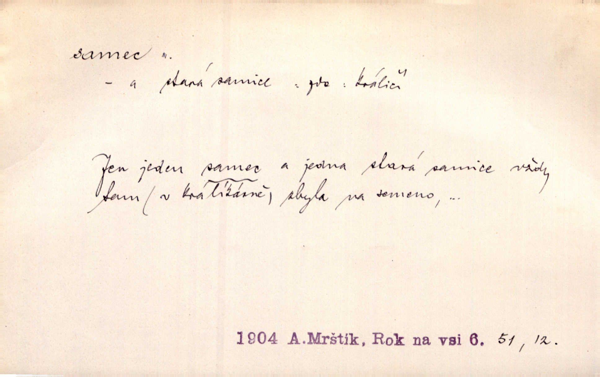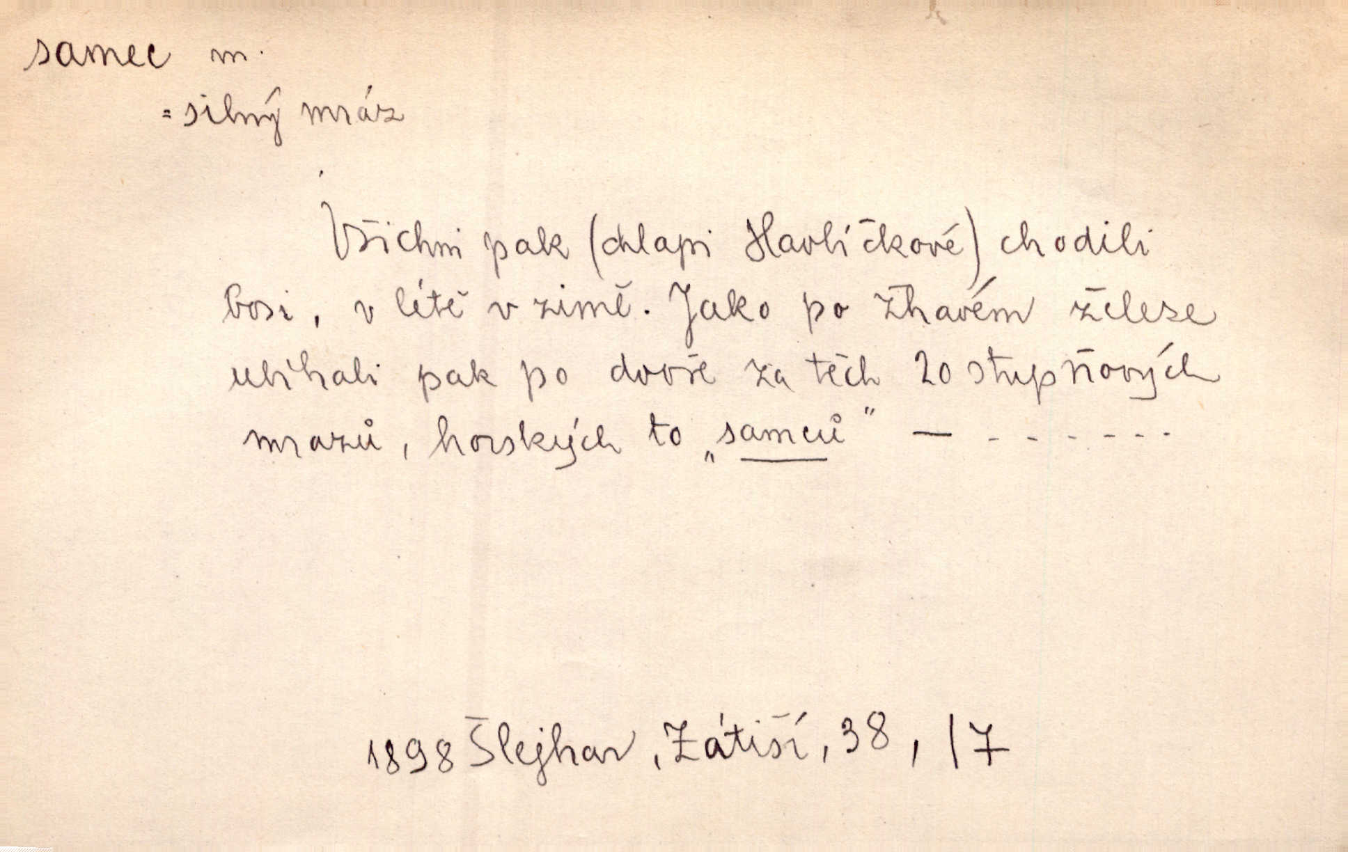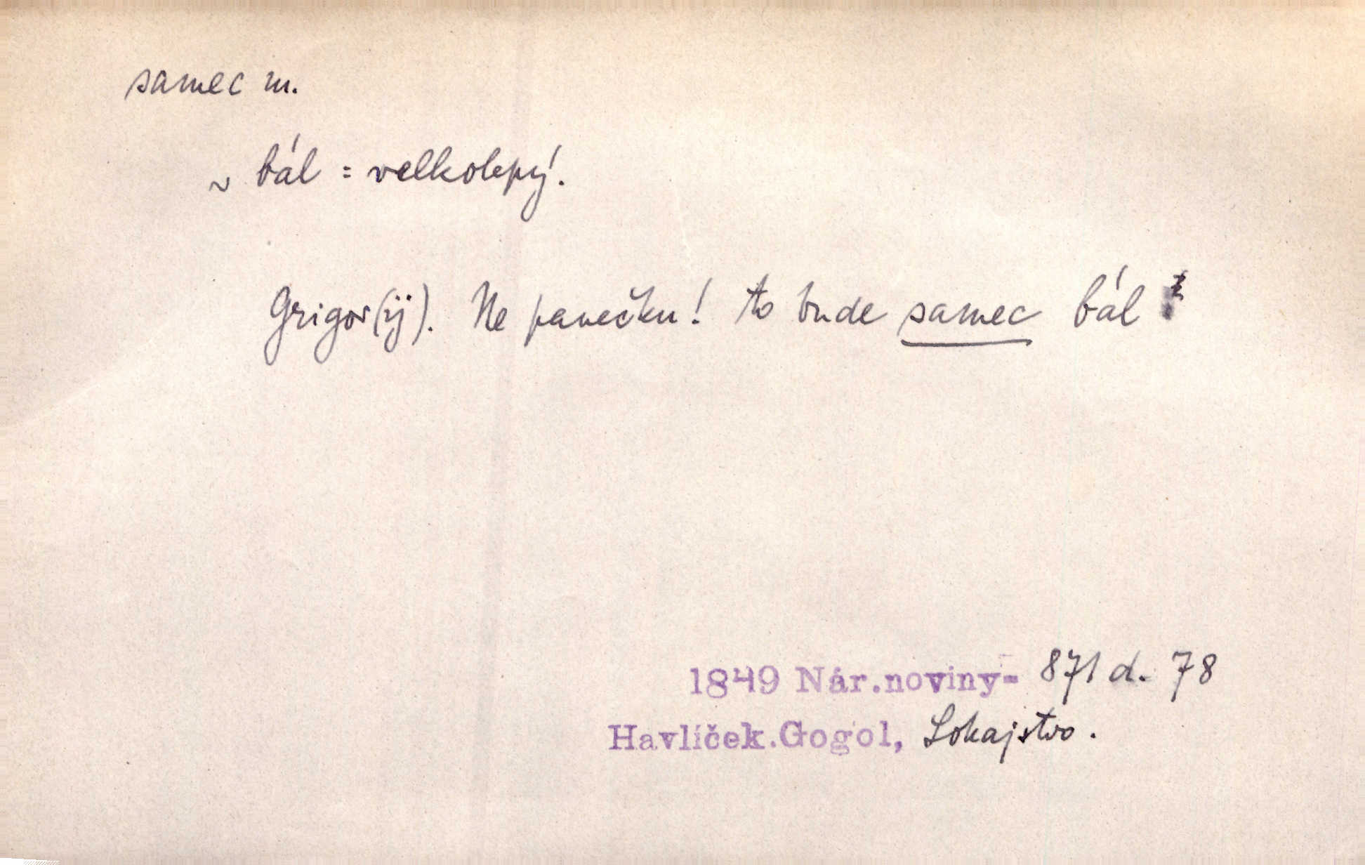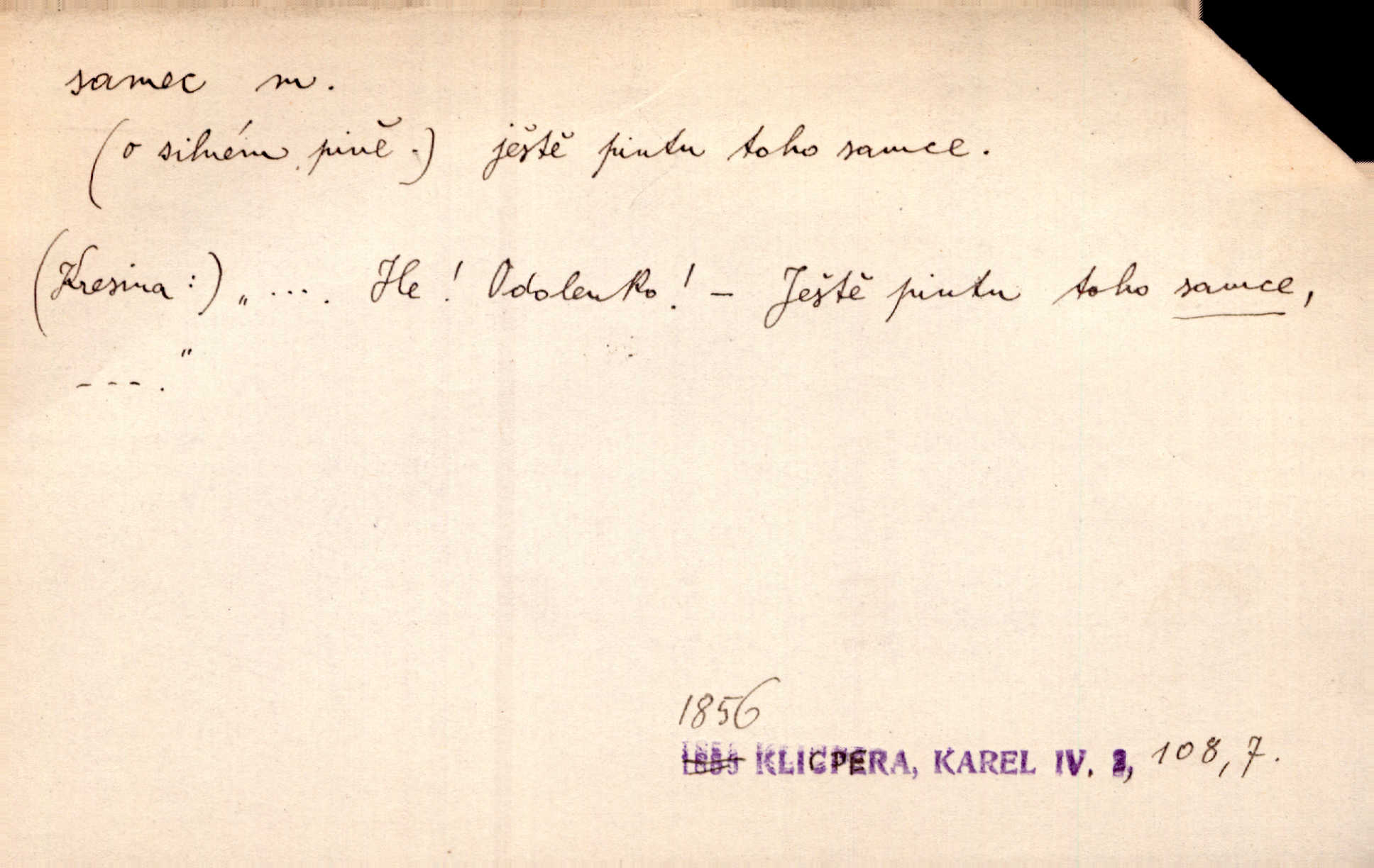 - samec, -mce m. živočich mužského rodu. Kdesi v dálce zažalovala naříkáním soví samice, a samec jí odpověděl houkáním. Vrba. Jen jeden samec a jedna stará samice vždy [v králíkárně] zbyla. A. Mrš. Jsi hezká jako tygřice, když se tulí k samci. Staš. Expr. Zírala na ně [oba nápadníky] s dychtivou, cynickou zvědavostí holky, pro niž se pustili dva samci do křížku. Hlad. Bot. kapraď samec kapradina z čeledi osladičovitých, Dryopteris filix. D Ob. něco velkého, důkladného, silného. Zapálil si viržinko — samce jako uhel černého. Vrba. Vojenský soud, to je samec! soudí, jen se práší. Havl. Přijel [generál] na autu, samci pořádným. John. Krindofindo, to byla zábava samec! Bass. Včera v noci byl opět „samec — mráz“. Nár. p. My tu máme dnes takový „samec“ se sněhem po kolena silný mráz. Venk. D Ob. dobré pivo, ležák. Jak živ takového v Praze nepil [student]‚ ani když „u modré lišky“ nalévali i to nejlepší staré pivo, pravého samce. Jir. „Děkuji a přijdu hned — já jen skočím pro džbánek samce!“ O. Han. D V mírném zaklení. Dědoušek tak se rozjařil, že udeřil na stůl a zvolal: „Samec! To je historie!“ Hol. „Ale vy jste si uměl vybrat posluhu, Alois, aby vám to šťastně dopadlo, pardie samec!“ Herrm. Na severní točně prý panuje noc půl leta dlouhá. Mordie samec! tam bych nechtěl být ponocným. Paleč.