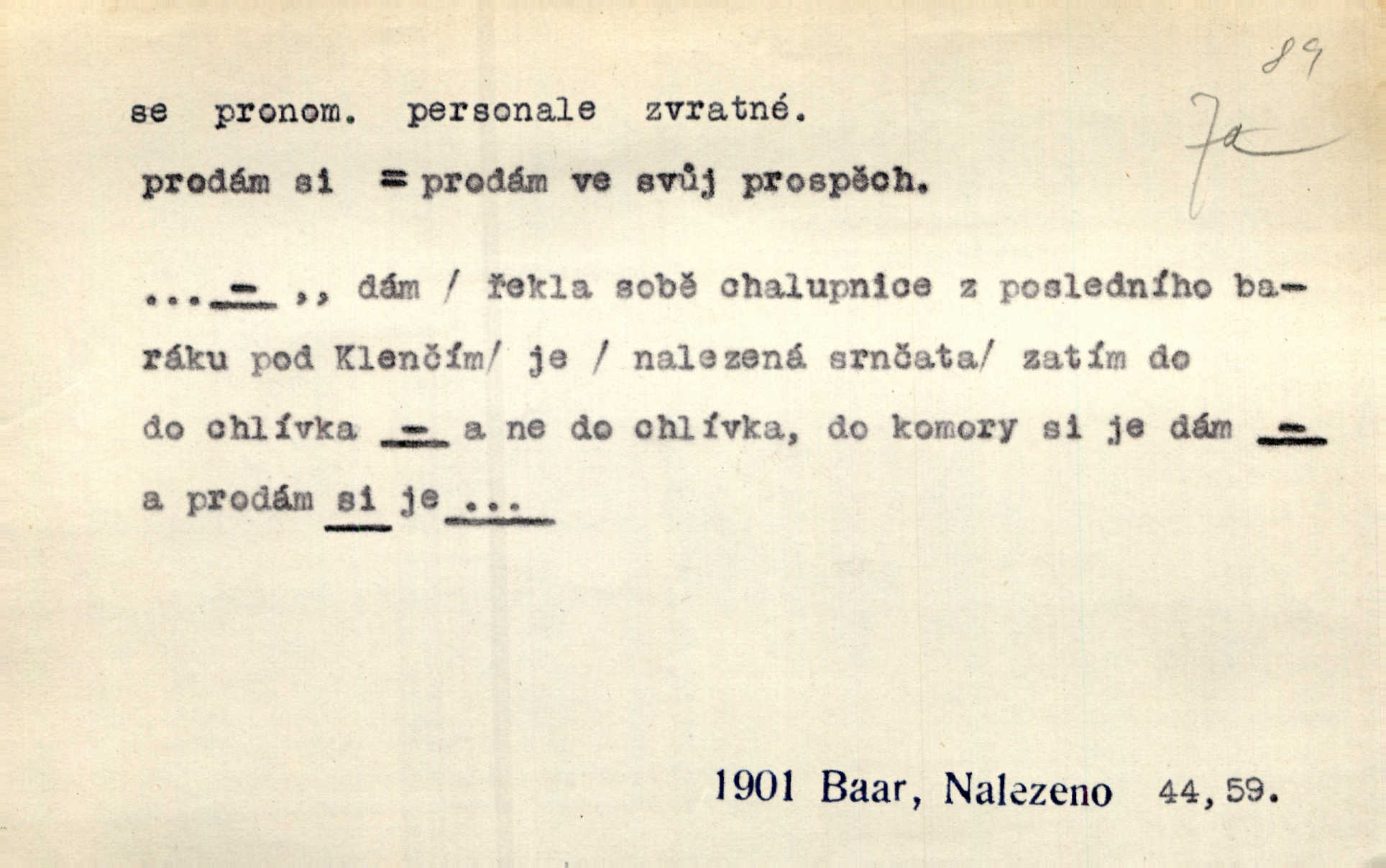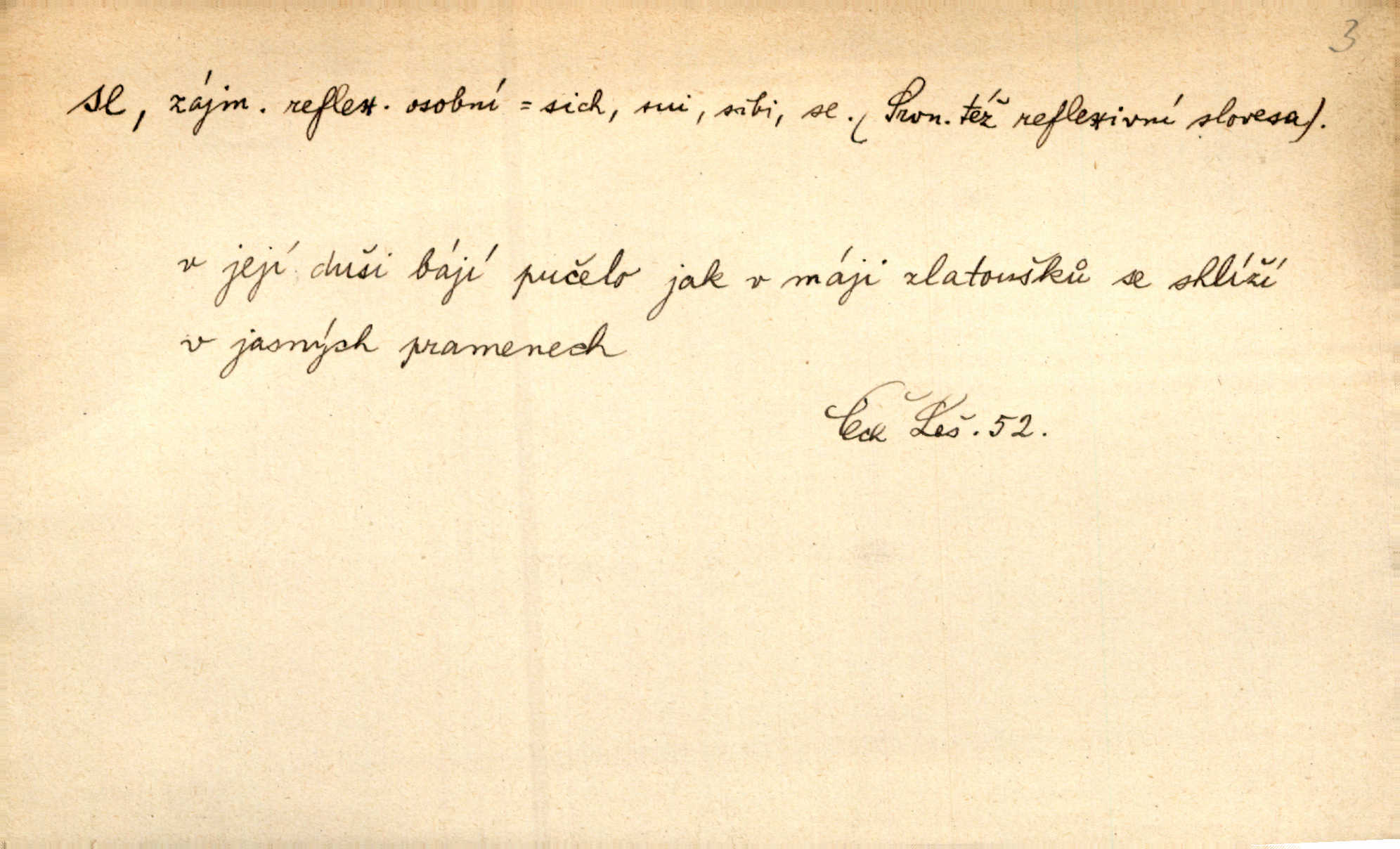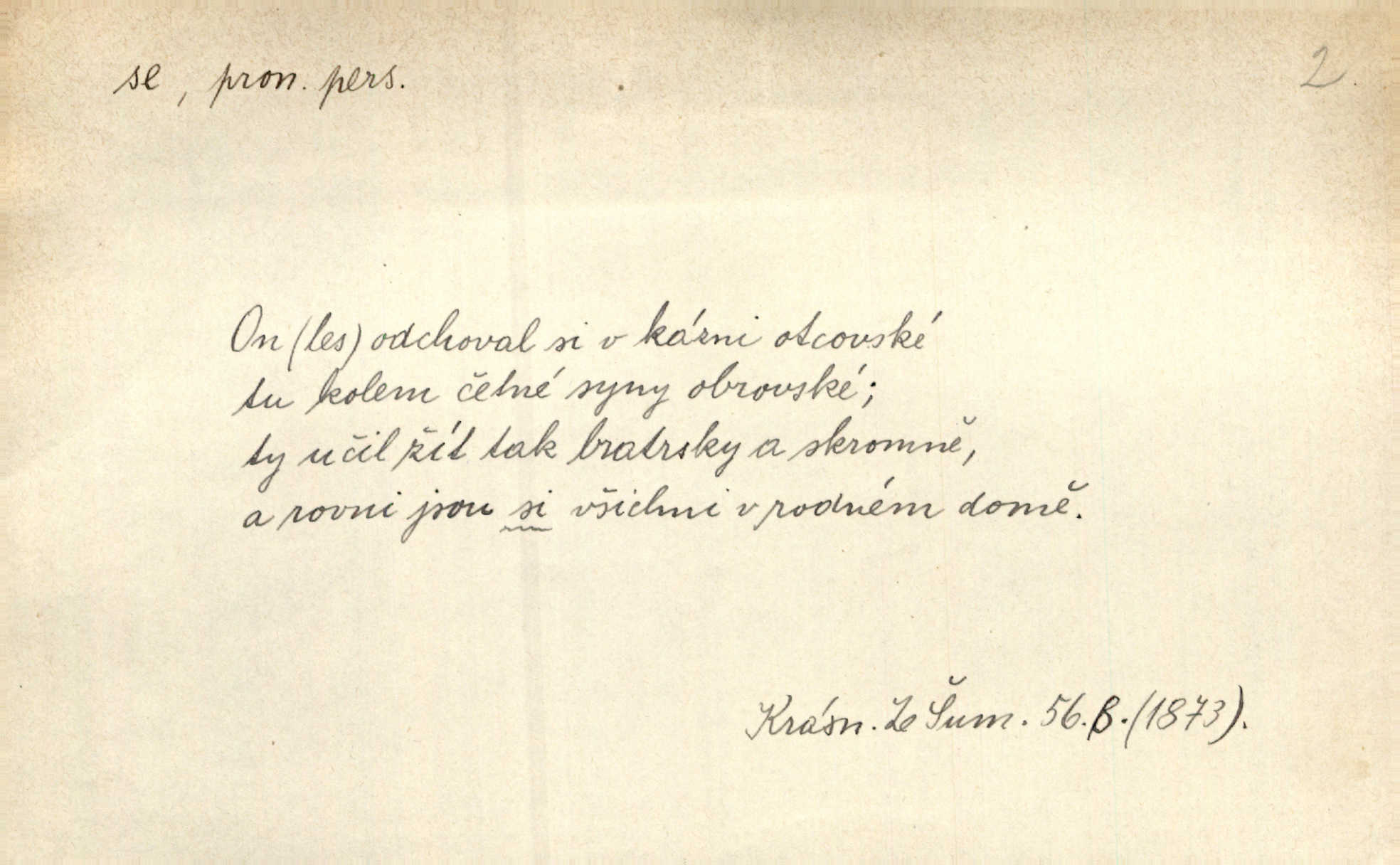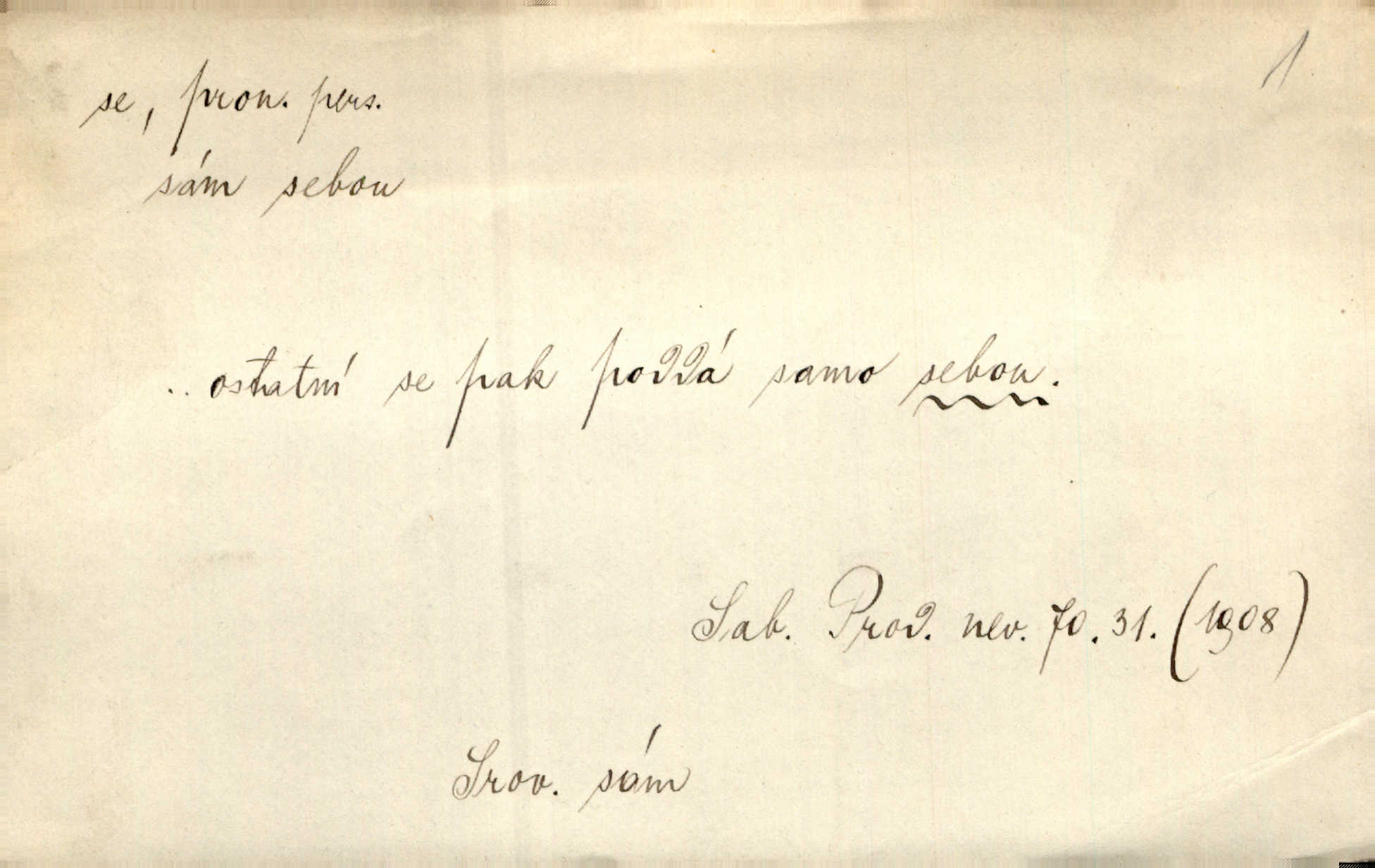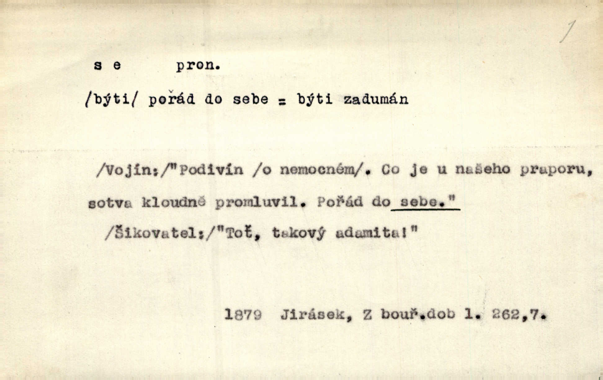 - se zájm. zvr. (bez nom.: gen. sebe, dat. sobě, si, akus. sebe, se, lok. sobě, instr. sebou) označuje jako osobní zájmeno předmět n. jiné bližší určení slovesného děje tehdy, když jsou totožné s podmětem tohoto děje. Lítost nad sebou samou změkčila ji; politovala se jako cizí osobu. Maj. Oči rukou si protírá. Erb. Ouředníci jarmareční povolali před sebe na radní dům stráže. Win. Sám sebe [vrah] se děsí, leká se vlastního stínu. Kal. Nemohu za sebe, nejsem z těch, kteří by na Magdalenu kámen zdvihali. Zey. Od vás, padouchové, ruce na se vložiti nedám. Ehrenb. Nebyl více pánem sama sebe. Šmil. Obroční vylil do sebe sklenici vína, aby si dodal kuráže. Šmil. Nevěděl ani, jak to ze sebe dostal, otevřel prostě ústa a slovo vyklopýtalo za slovem. Čap. Přišed do čeledníka vrhl sebou do pohodlné lenošky. Šmil. Zardi se sám před sebou, boží bojovníku. Ehrenb. To nemám ze sebe, to je z komisaře Špalka. Šmil. Slova její všechna měla ráz úplné pravdy do sebe. Sab. Dvéře jako by se samy od sebe otevřely. Hál. Císař Josef vydal leccos, co samo sebou muselo padnouti pod stůl. Šmil. Ostatní se pak poddá samo sebou. Sab. Ale tohle není samo sebou, to je mně naschvál, někdo se na mně chtěl schladit. Rais. Nakládání dříví šlo rychle před se. O. Červ. Já mám teď sedm lidí pod sebou podřízených. Štech. Mám pod sebou magacín. Klost. Co je u našeho praporu, sotva kloudně promluvil. Pořád do sebe je zamyšlen. Jir. Na stará kolena jdeme teď do sebe, činíme pokání, tuze jsme se polepšili. Baar. Mocně ji zdvihli — tu teprvé ó nastojte! zpozorovali, že je bez sebe v bezvědomí. Svět. Když jsem opět k sobě přišel, ležela mrtvola Petrova posud na zemi. Zey. Spolčení otce se synem nebylo samo o sobě nic zlého. Pal. Kdyby ji nebyl hajný k tomu upomínal, byla by sama o sobě šla vyhledat Šimáka. Šmil. Pec o sobě stojíc, překážela, když za Břetislava I. přestavována zeď hradu pražského zvlášť, sama. Jir. Bylť on příliš pro sebe a nevlídník samotář. Šmil. [Vojáci] pěkné ženy a dívky pryč s sebou odvedli. Ehrenb. Černohorci měli s sebou všeho všudy čtyry horská děla. Hol. Náhodou byl tehdy s sebou dr. Deloqueva. Přít. Matka vzala dítě do nůše, jeden člověk od úřadu šel s sebou. Hál. Byla by si také ráda pro žert sebou „zaholíkala“. Svět. Dále zaznamenání hodno jest vydávání almanachu „Máje“, který měl býti časopisem pro sebe, ale dlouho se neudržel samostatným, zvláštním. Vrch. Hovor. Já se tu udělám pro sebe zařídím si samostatnou živnost. Kronb. D u sloves zpr. plurálních vyjadřuje reciprocitu, vzájemnost, totiž to, že slovesný děj vychází jen od dílčího subjektu a týká se dílčích subjektů jiných. A my si všichni s plesem v náruč padli a líbali se. Vrch. Nesčíslněkráte, dávno, dávno, dívával jsem si s koňmi v oči. Hilb. Oba vůdcové rovnali se sobě co do ducha, srdnatosti a zkušenosti. Pal. Ti [milenci] jsou jako pro sebe stvořeni! Ehrenb. Dělali si mezi sebou z něho žerty. Prav. Nerada bych, aby se dostali nějak do sebe do sporu. Herrm. Ústa i srdce nemá daleko od sebe. Šmil. Naposled si věrnost přísahali. Čech. Rovni jsou si všichni v rodném domě. Krás. Odpusťme si, co jsme si! Vanč. Půda zaduněla jako od běhu mnoha mužů za sebou se ženoucích. Ehrenb. Vojtěch volen r. 1168 na probošství Mělnické, na biskupství Pasovské a arcibiskupství Salcburské rychle po sobě. Pal. [Stanislav] tisíckráte po sobě sladce a vášnivě to jméno vyslovuje. Lada N. [Kostelník] oprašoval tři dni po sobě oltář. Pfleg. Vojenské okřikování a vyměňování hesla zavznívalo po sobě z rozličných míst cimbuří. Ritt. Sousedův učedník se pral s nějakým klukem. Jir. D u sloves přechodných vyjadřuje stavový význam. Za dvě léta se navrátil z cest. Rad. Spadl s lešení a potloukl se. Sab. [Kuchařka] naříkala zle, že se spálila. Šmil. Je to pravda, že se Jäkl včera u Císařského mlýna topil? Ner. Kdo hraje s ohněm, popálí se. Herold. Zdá se, že [dítě] odhozeno pádem se zabilo. Rozl. [Medvěd] leknutím bác se stromu, div se nezabil. Herb. D ve spojení se slovesem jinak přechodným vyjadřuje osobní passivum. Přednášely se výtečné písně a sbory, deklamovalo se, čtly se básnické i jiné plody. Sab. Za careviče se nyní čte černá mše. Bendl. Daně i napotom se platiti budou. Pal. Po vyučování vodí se dítky, každé pohlaví zvlášť, na záchod. V. Svob. Ten chlapec by se měl vzít pryč. Čap. Ch. Vypravovalo se, že se ukryl rychle do staré jarmary. Mel. D ve spojení se slovesem, zpr. nepřechodným, vyjadřuje passivum neosobní a neosobní predikaci stavů i pocitů tělesných a volních. Na konci měsíce se pracovalo o senách. Rais. Tu k popovi se běželo. Kal. Chtěl se podívat, jak se hospodaří ve svobodné republice. Baar. I k doktorům chodilo se jen do Žitavy. Svět. Čím více se maže, tím lépe se jede. Hum. kal. Šlo se mu dobře po mezích. Jir. Podkomoří začal hned o cestě, jak se jim jelo z Moravy. Jir. Na podlaze se to chodilo jako po sametě. Preis. Tak vám dej Pánbůh dobrou noc a ty, maličká, mi dej hubičku, aby se mi pěkně spalo! Rais. To se ti řekne — nezlob se. Rais. D u slovesa pozměňuje jeho význam a zpr. i vazbu. Kluk se drží křečovitě sukně jak tonoucí břehu. Herb. Odsouzence kat už chápal se. Zey. Člunek se zachvěl, dámy křečovitě se chytaly okraje. Herrm. Zakousnuv se do špičky [dýmky]‚ tuze zvědavě pohlížel na Tonku. Rais. Procházela se na kvetoucích lučinách. Svět. Již hnal se kůň dále bez jezdce. Vlč. Ty se na mne hněváš? Třeb. D u slovesa dodává slovesnému významu expresivního i intensivního zabarvení. Budu já se vás prosit! Snězte si to všecko. Rais. K