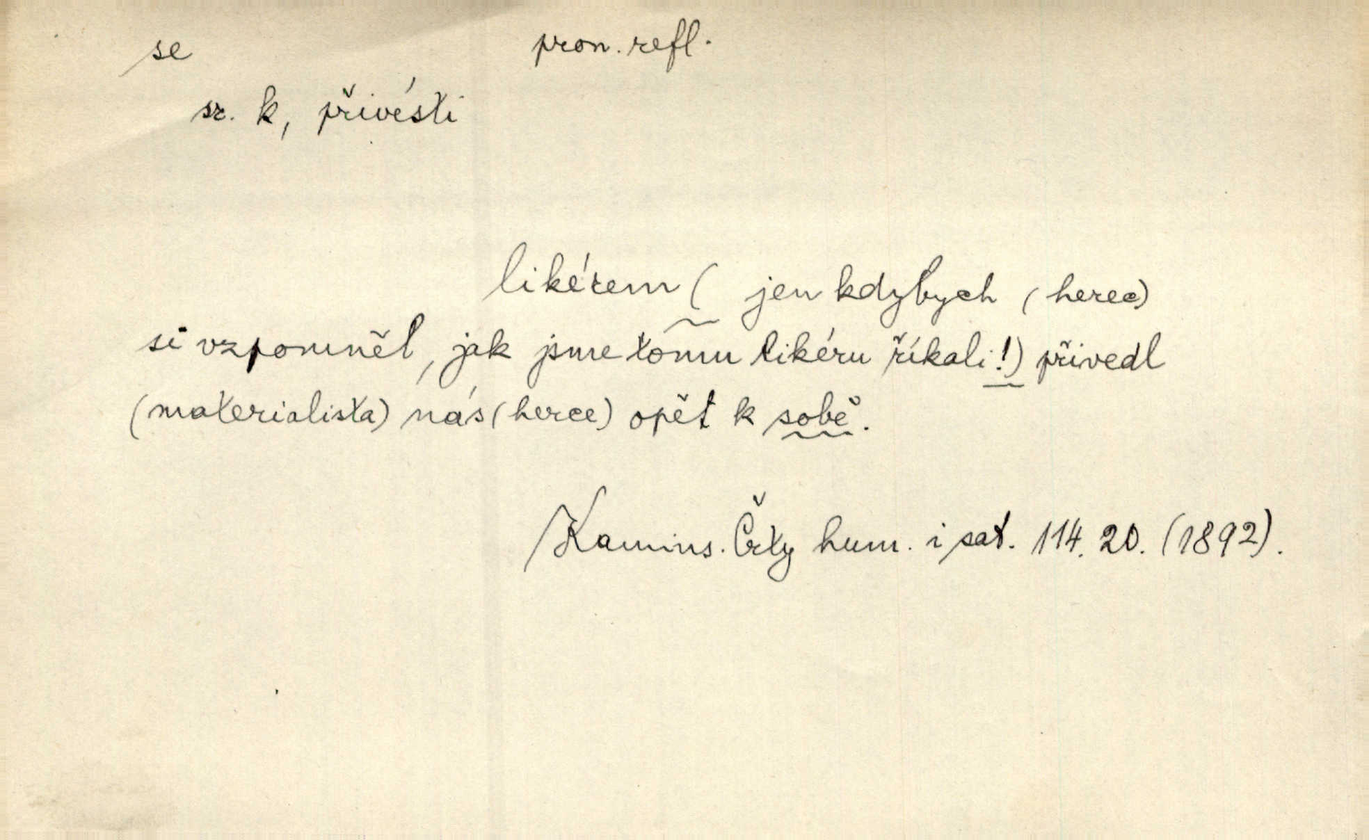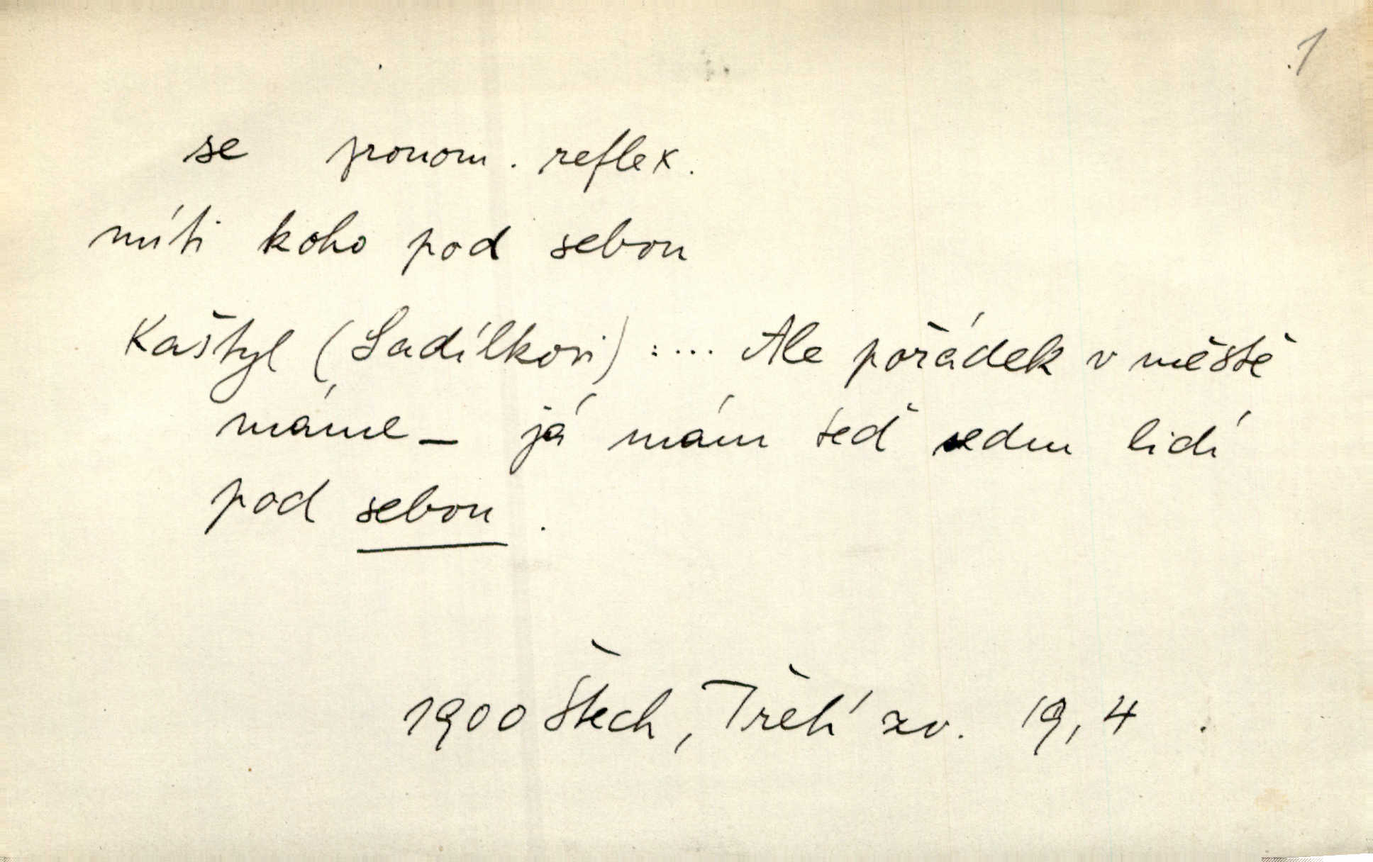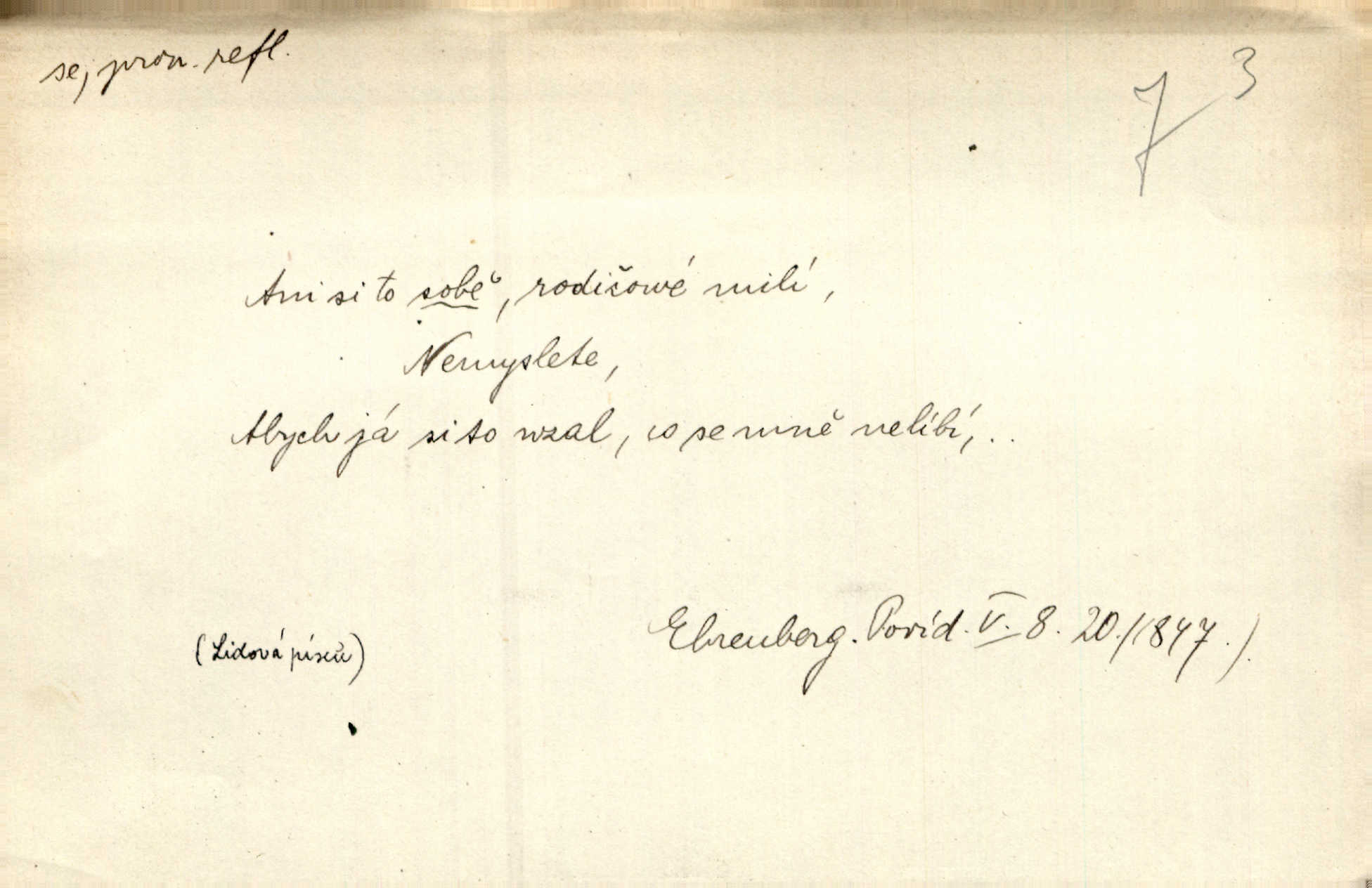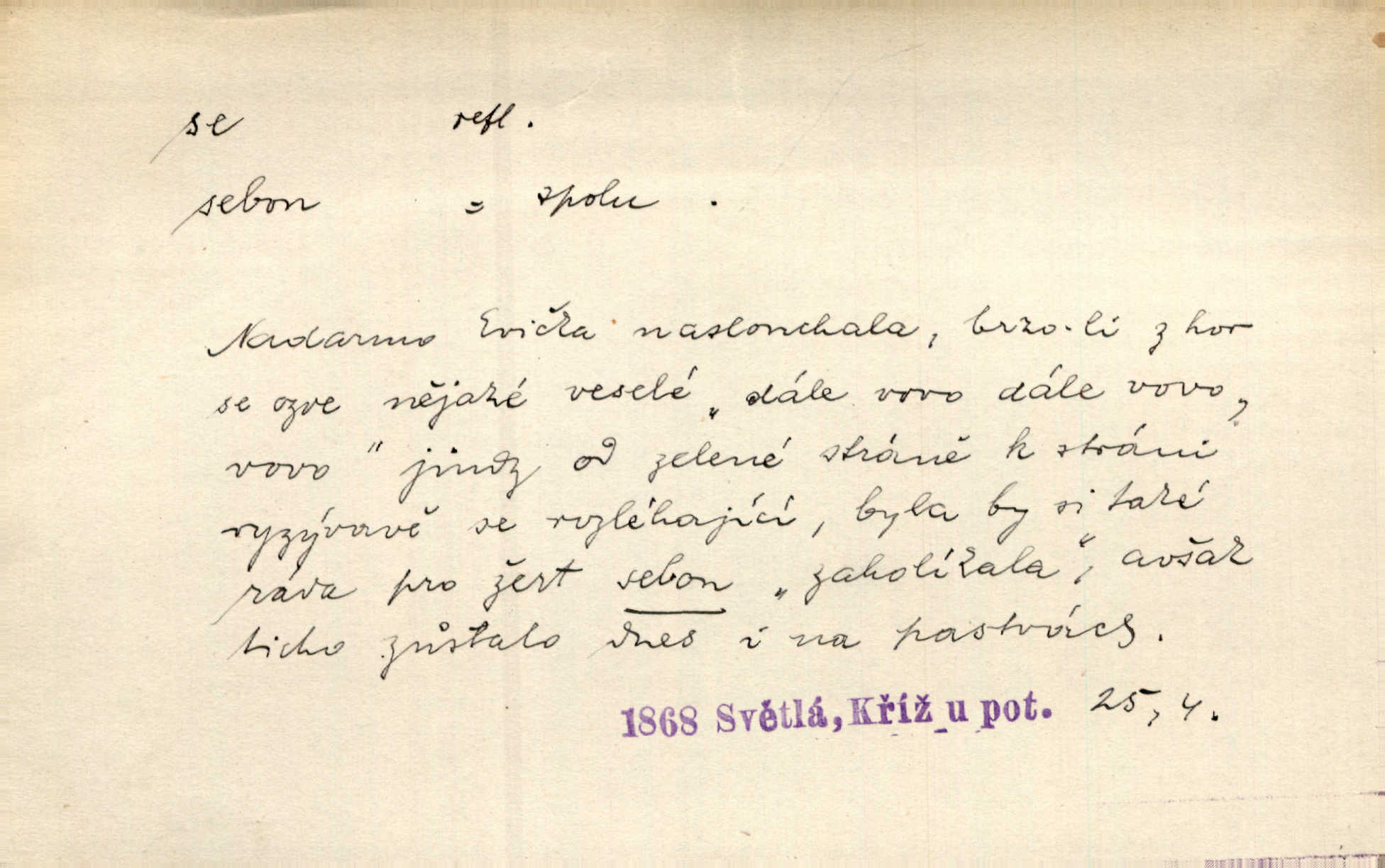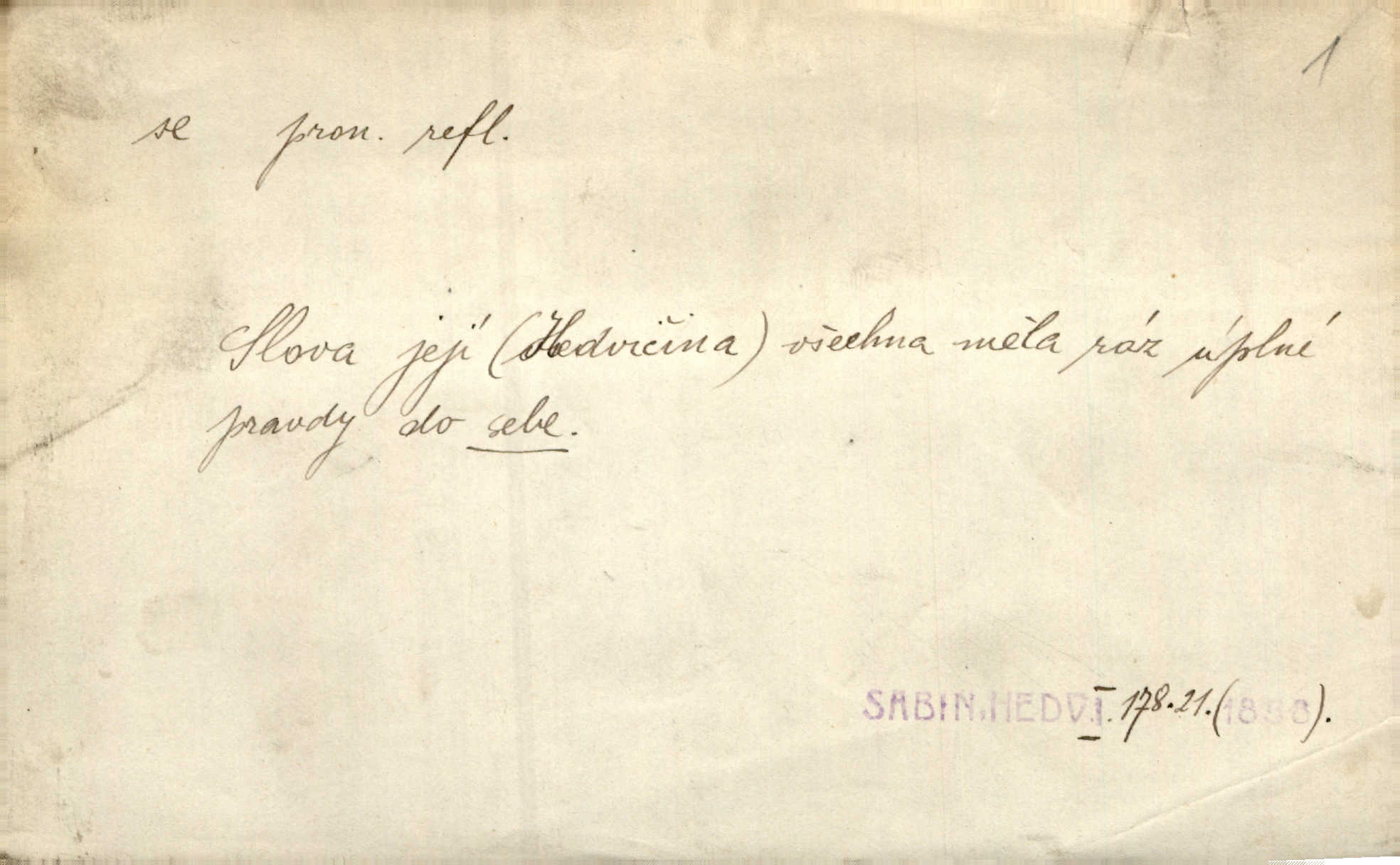 - se zájm. zvr. (bez nom.: gen. sebe, dat. sobě, si, akus. sebe, se, lok. sobě, instr. sebou) označuje jako osobní zájmeno předmět n. jiné bližší určení slovesného děje tehdy, když jsou totožné s podmětem tohoto děje. Lítost nad sebou samou změkčila ji; politovala se jako cizí osobu. Maj. Oči rukou si protírá. Erb. Ouředníci jarmareční povolali před sebe na radní dům stráže. Win. Sám sebe [vrah] se děsí, leká se vlastního stínu. Kal. Nemohu za sebe, nejsem z těch, kteří by na Magdalenu kámen zdvihali. Zey. Od vás, padouchové, ruce na se vložiti nedám. Ehrenb. Nebyl více pánem sama sebe. Šmil. Obroční vylil do sebe sklenici vína, aby si dodal kuráže. Šmil. Nevěděl ani, jak to ze sebe dostal, otevřel prostě ústa a slovo vyklopýtalo za slovem. Čap. Přišed do čeledníka vrhl sebou do pohodlné lenošky. Šmil. Zardi se sám před sebou, boží bojovníku. Ehrenb. To nemám ze sebe, to je z komisaře Špalka. Šmil. Slova její všechna měla ráz úplné pravdy do sebe. Sab. Dvéře jako by se samy od sebe otevřely. Hál. Císař Josef vydal leccos, co samo sebou muselo padnouti pod stůl. Šmil. Ostatní se pak poddá samo sebou. Sab. Ale tohle není samo sebou, to je mně naschvál, někdo se na mně chtěl schladit. Rais. Nakládání dříví šlo rychle před se. O. Červ. Já mám teď sedm lidí pod sebou podřízených. Štech. Mám pod sebou magacín. Klost. Co je u našeho praporu, sotva kloudně promluvil. Pořád do sebe je zamyšlen. Jir. Na stará kolena jdeme teď do sebe, činíme pokání, tuze jsme se polepšili. Baar. Mocně ji zdvihli — tu teprvé ó nastojte! zpozorovali, že je bez sebe v bezvědomí. Svět. Když jsem opět k sobě přišel, ležela mrtvola Petrova posud na zemi. Zey. Spolčení otce se synem nebylo samo o sobě nic zlého. Pal. Kdyby ji nebyl hajný k tomu upomínal, byla by sama o sobě šla vyhledat Šimáka. Šmil. Pec o sobě stojíc, překážela, když za Břetislava I. přestavována zeď hradu pražského zvlášť, sama. Jir. Bylť on příliš pro sebe a nevlídník samotář. Šmil. [Vojáci] pěkné ženy a dívky pryč s sebou odvedli. Ehrenb. Černohorci měli s sebou všeho všudy čtyry horská děla. Hol. Náhodou byl tehdy s sebou dr. Deloqueva. Přít. Matka vzala dítě do nůše, jeden člověk od úřadu šel s sebou. Hál. Byla by si také ráda pro žert sebou „zaholíkala“. Svět. Dále zaznamenání hodno jest vydávání almanachu „Máje“, který měl býti časopisem pro sebe, ale dlouho se neudržel samostatným, zvláštním. Vrch. Hovor. Já se tu udělám pro sebe zařídím si samostatnou živnost. Kronb. D u sloves zpr. plurálních vyjadřuje reciprocitu, vzájemnost, totiž to, že slovesný děj vychází jen od dílčího subjektu a týká se dílčích subjektů jiných. A my si všichni s plesem v náruč padli a líbali se. Vrch. Nesčíslněkráte, dávno, dávno, dívával jsem si s koňmi v oči. Hilb. Oba vůdcové rovnali se sobě co do ducha, srdnatosti a zkušenosti. Pal. Ti [milenci] jsou jako pro sebe stvořeni! Ehrenb. Dělali si mezi sebou z něho žerty. Prav. Nerada bych, aby se dostali nějak do sebe do sporu. Herrm. Ústa i srdce nemá daleko od sebe. Šmil. Naposled si věrnost přísahali. Čech. Rovni jsou si všichni v rodném domě. Krás. Odpusťme si, co jsme si! Vanč. Půda zaduněla jako od běhu mnoha mužů za sebou se ženoucích. Ehrenb. Vojtěch volen r. 1168 na probošství Mělnické, na biskupství Pasovské a arcibiskupství Salcburské rychle po sobě. Pal. [Stanislav] tisíckráte po sobě sladce a vášnivě to jméno vyslovuje. Lada N. [Kostelník] oprašoval tři dni po sobě oltář. Pfleg. Vojenské okřikování a vyměňování hesla zavznívalo po sobě z rozličných míst cimbuří. Ritt. Sousedův učedník se pral s nějakým klukem. Jir. D u sloves přechodných vyjadřuje stavový význam. Za dvě léta se navrátil z cest. Rad. Spadl s lešení a potloukl se. Sab. [Kuchařka] naříkala zle, že se spálila. Šmil. Je to pravda, že se Jäkl včera u Císařského mlýna topil? Ner. Kdo hraje s ohněm, popálí se. Herold. Zdá se, že [dítě] odhozeno pádem se zabilo. Rozl. [Medvěd] leknutím bác se stromu, div se nezabil. Herb. D ve spojení se slovesem jinak přechodným vyjadřuje osobní passivum. Přednášely se výtečné písně a sbory, deklamovalo se, čtly se básnické i jiné plody. Sab. Za careviče se nyní čte černá mše. Bendl. Daně i napotom se platiti budou. Pal. Po vyučování vodí se dítky, každé pohlaví zvlášť, na záchod. V. Svob. Ten chlapec by se měl vzít pryč. Čap. Ch. Vypravovalo se, že se ukryl rychle do staré jarmary. Mel. D ve spojení se slovesem, zpr. nepřechodným, vyjadřuje passivum neosobní a neosobní predikaci stavů i pocitů tělesných a volních. Na konci měsíce se pracovalo o senách. Rais. Tu k popovi se běželo. Kal. Chtěl se podívat, jak se hospodaří ve svobodné republice. Baar. I k doktorům chodilo se jen do Žitavy. Svět. Čím více se maže, tím lépe se jede. Hum. kal. Šlo se mu dobře po mezích. Jir. Podkomoří začal hned o cestě, jak se jim jelo z Moravy. Jir. Na podlaze se to chodilo jako po sametě. Preis. Tak vám dej Pánbůh dobrou noc a ty, maličká, mi dej hubičku, aby se mi pěkně spalo! Rais. To se ti řekne — nezlob se. Rais. D u slovesa pozměňuje jeho význam a zpr. i vazbu. Kluk se drží křečovitě sukně jak tonoucí břehu. Herb. Odsouzence kat už chápal se. Zey. Člunek se zachvěl, dámy křečovitě se chytaly okraje. Herrm. Zakousnuv se do špičky [dýmky]‚ tuze zvědavě pohlížel na Tonku. Rais. Procházela se na kvetoucích lučinách. Svět. Již hnal se kůň dále bez jezdce. Vlč. Ty se na mne hněváš? Třeb. D u slovesa dodává slovesnému významu expresivního i intensivního zabarvení. Budu já se vás prosit! Snězte si to všecko. Rais. K