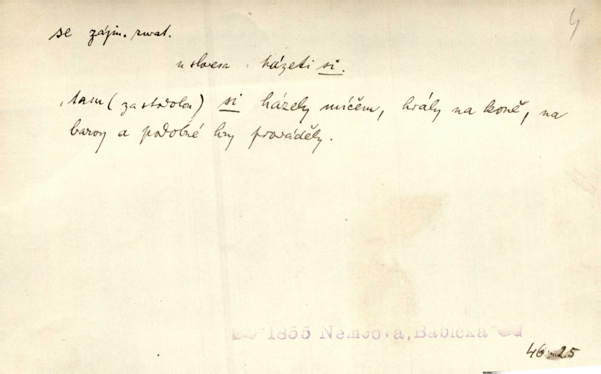 - s, se předl. s gen. (někdy se směšuje a splývá s předl. z). D vyjadřuje směřování od povrchu n. východiska něčeho, shora. Děvčata taktak že uklidila se stolu a poumývala nádobí. Čap. Strhla s hlavy klobouček. Jir. Rada si utíral pot s čela. Svět. A proč si as můj tatíček stírá slzy s očí? Něm. Kamenotisky sundány se stěn. Šmil. S vozu slézá žena v bílé plachetce, v selském obleku. Něm. „Panenko Maria loretánská!“ divil a radoval se polousmířený mydlář, zdvihaje svého jedináčka se země. Stroup. Povídám vám, jíst se země by u Cimburů mohli. Baar. Longinus zvolňounka se povznesl se svého křesla. Kos. Svrhneme tě s trůnu. Zey. Začal [spisovatel] práci, nevěděl s místa. R. Svob. Chodila s místa na místo. Pfleg. Se všech stran hrnuly se dotazy. V. Mrš. Jí [hlavou student] kýval v chůzi se strany na stranu. R. Svob. „Slávy dcera“ přese všecko, co se jí s různých hledisk vytýkati může, je básnickým skutkem prvního řádu. Vrch. Jedna pozdvižené měla ruce vzhůru, nespustila oči s obrazu Ukřižovaného. Prav. Žádný učený nespadl s nebe. Baar. Sníh se sypal se zataženého nebe. Šmil. Helenka už klidně dívala se s jedné osoby na druhou. V. Mrš. Jsme od Prahy trochu s cesty. Hol. Kladla s vysoka svou pravici do rozevřené dlaně. V. Mrš. Nebylať hlouběji zasvěcena do záležitostí mužových, jen s povrchu je znala povrchně. Hol. I vyprávělo se v městečku veřejně na náměstí i v hospodách, že to jde s panstvím s kopce schází. Vrba. Beztoho se nemůžu dočkat, až budu mít tu školu s krku zbavím se jí. Herrm. Kleofášovi spadl kámen se srdce. Šmil. D vyjadřuje vůbec opouštění. Jděte mi s očí. Šim. Ačkoli s Isabellou mluvila, nepustila přece tchyni ani na okamžik s oka. Zey. Krám se dědil s otce na syna. Ner. I on sešel se studií. Prav. Nemíti bystrou ženu, byl by hospodařil s krávy na kozu. Baar. Se svatby sešlo. Hál. Zast. Někteří [poslové] již ve Plzni přikročiti chtěli k novému volení, a pan Rosenberk s tíží svedl je s úmyslu takového. Pal. Evička přec se svého se nehnula, že od dítěte nepůjde. Svět. Kdybys přišel s chleba, bude z tebe žebrák. Herb. D Zř. lid. n. zast. vyjadřuje blízkou časovou následnost n. místní blízkost. Bylo po druhé hodině s poledne po poledni. Rais. Bila už hodina s půlnoci po půlnoci. V. Mrš. Prodám [krávu]‚ s neděle ji vedu do Hořic po neděli. Rais. Co ti mám s večera přinést, aby tě potěšilo? zvečera. Něm. Bylo asi deset hodin s rána zrána. Pfleg. S počátku tančilo se již dobře z počátku. Ner. S počátku sedmnáctého století saská tato kaple tak tuze sešla. Mik. Tak polehounku míjela zima s roku třicátého sedmého na osmý z roku. Kos. S těch časů, co jsem přestal chodit na honbu, jsem potkal jedva dvakrát srnce v lese od těch časů. Klost. A přec málo uplynulo roků s oněch dob. Čech. Odkládal strýček i pouť na Hostýn, kamž podle zvyku rok s roku dojížděl s tetičkou každoročně. M. Jahn. Papež Eugenius nové koncilium do města Ferrary rozepsal, kamž i skutečně s nového léta množství prelátův ze všelikých zemí a sám také kardinál Julian se odebrali začátkem nového léta. Pal. Na prvním prý voze seděl s kraje statný cikán s temněčerným okem z kraje. Heyd. Hned s kraje u prostředního stolu sedal mistr Blovský. V. Mrš.