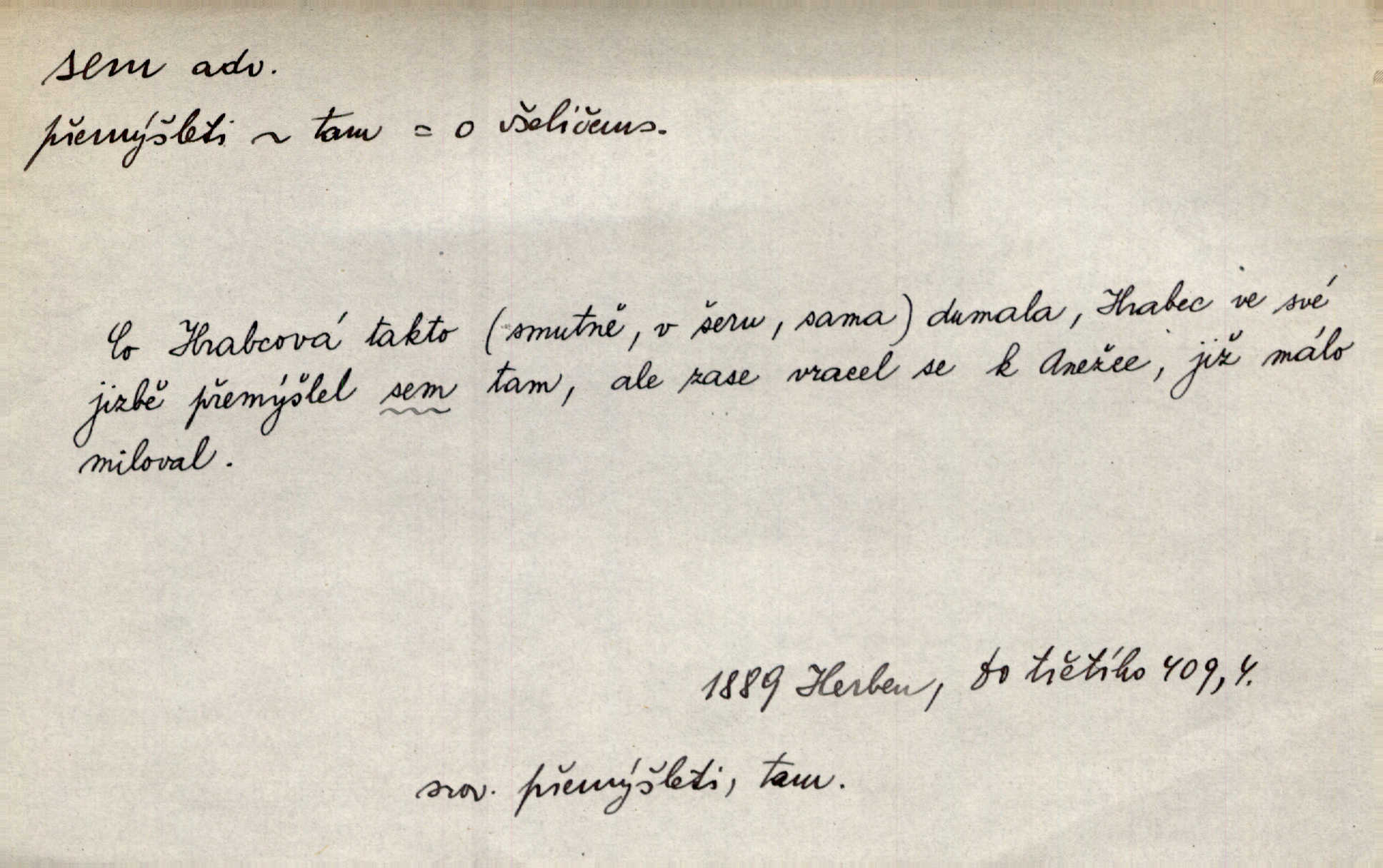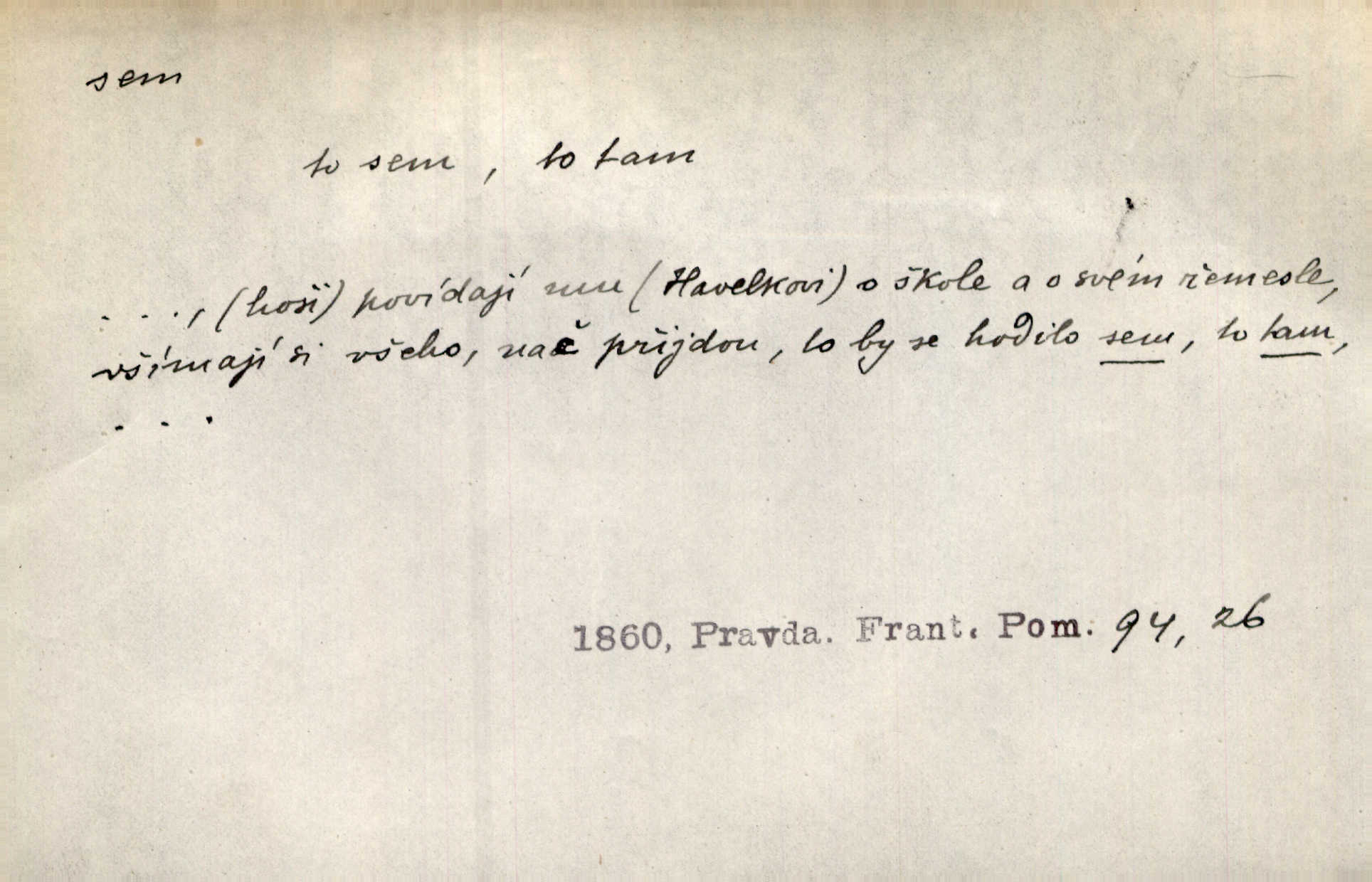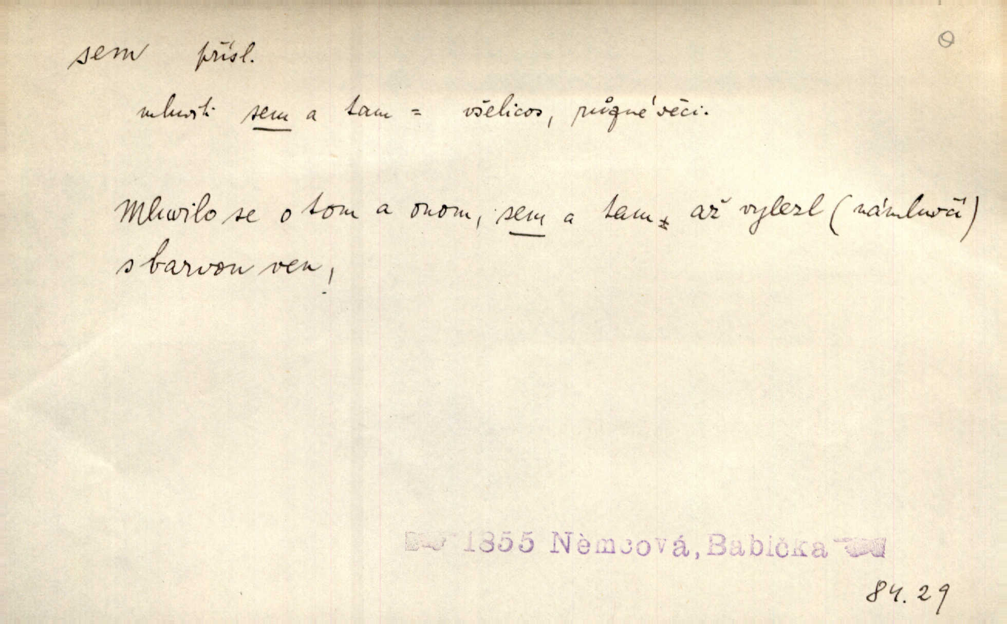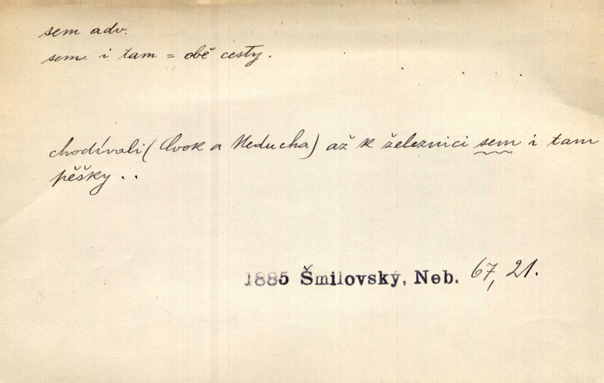 - sem (zast. semo) adv. na toto místo. „Jeníku, Vilíme, pojďte sem!“ volala [babička]. Něm. Pojď, Míno, sem a na klín můj. Ner. To jste vy prve zpívali, než jsme sem přijeli? Jir. Od panské zahrady dolehl sem hlučný smích chasy. A. Mrš. Před dvaceti lety se odněkud od Slaného sem přiženil. Třeb. Hezké to tu máte, hned bych se sem odstěhovala. Rais. Čelo bílým šátkem si utíraje, kvapným krokem semo přicházel. Čech. Snads přivedl mě semo k zavraždění! Frič. Zda taky někdo odtamtud [s hvězd] se k nám sem dolů dívá. Hál. Podivné přirovnání s milionářstvím docela sem nepatří do uvedené souvislosti. Havl. „Ale už toho mám zrovna až sem,“ a přejela rukou krk. Šim. „Až sem a ne dále!“ zněl jeho osud po určitou hranici. Prav. Peníze sem, nebo jste syn smrti vydejte je. Hajn. [Nejedlý:] „Chcete-li mít trpělivost něco poslechnout —“ „Sem s tím, sem s tím!“ řekl Hněvkovský. Tyl. Chodívali až k železnici sem i tam pěšky na toto místo i zpátky. Šmil. Vždyť jsem to věděla, že bude ta cesta za půl dne sem a tam pro ni mnoho. Svět. Ustanoven krátký výlet do Prahy za den sem a tam. Podl. Dívka koukala sem, hoch tam, jakoby k sobě ani nenáleželi na jednu stranu — na opačnou. Svět. Co je do obce, kde jeden chodí sem a druhý tam každý jinam, opačně. Šmil. Shlíží se v ní zrovna [v ženě] — jenom stále „Marjánko sem — Marjánko tam“ na ni mluví stále se k ní obrací. Baar. V Orientě se to nebere s číslicemi tak příliš přesně. Nula sem, nula tam na nule nezáleží. Rozhlas. Pár let sem, pár let tam, to se vyrovná, když se mají dva rádi. Něm. D sem tam (řidč. sem a tam, sem i tam, tam sem), semo tamo (řidč. semo tam) se strany na stranu, s místa na místo. Starý Frnčala přecházel jizbou sem tam. Jir. Jányš rozčileně přecházel semotamo od okna k oknu. Baud. Panošové kvapně semo tam pobíhali. Zl. Praha. Jeho přemítání kolísalo se semotam. Podl. Davy lidstva se procházejí sem tam. Bozd. Bělostné koule lítaly sem tam. Jir. Sem tam klonily se rozhodnutí vážky. Čech. D tu a tam, místy, leckde, pořídku. Seděli tu [v hospodě] vozkové, sedláci, sem tam nějaký tkadlec. Jir. Sem tam, kudy jeli, viděli ohnutého kopáče. Herb. Sem tam zdvihl se lid sedlský proti svým utiskovatelům. Tomek. Starý Růžička byl muž — jak se ještě semtam říká — ze starého zákona. Tyl. Obyvatelstvo sem a tam činí nádržky a kopá cisterny. Hol. Po písčitých planinách vyrážela semotam tráva s některým kvítkem. Ehrenb. Paprsek svobody občanské semo tamo prorážel. Šmil. D časem, občas, leckdy, chvílemi. Vácovský biskup hodil sem tam latinské slovo. Jir. Také si [Vrba] sem tam pro sebe zabroukl. Jir. Sem tam přidal nemastné, neslané slovo. Vrba. Nevedli tak ukrutně kajícího života, žeby si nebyli semotam i nějakého chutnějšího pokrmu přávali. Ritt. D všelijak, lecjak. Mluvilo se o tom a onom, sem a tam, až vylezl [námluvčí] s barvou ven. Něm. Hrabec ve své jizbě přemýšlel sem tam, ale zase vracel se k Anežce. Herb. Slečny hádaly sem i tam, jmenujíce jména všelijaká. Choch. Ona začala sem a tam, co prý si myslím. Čap. Ch. Rokovalo se ještě semo tamo, ale proti návrhu Antonína Žiliny neozval se žádný hlas. O. Červ. — V. t. semhle, semka, semto, semže.