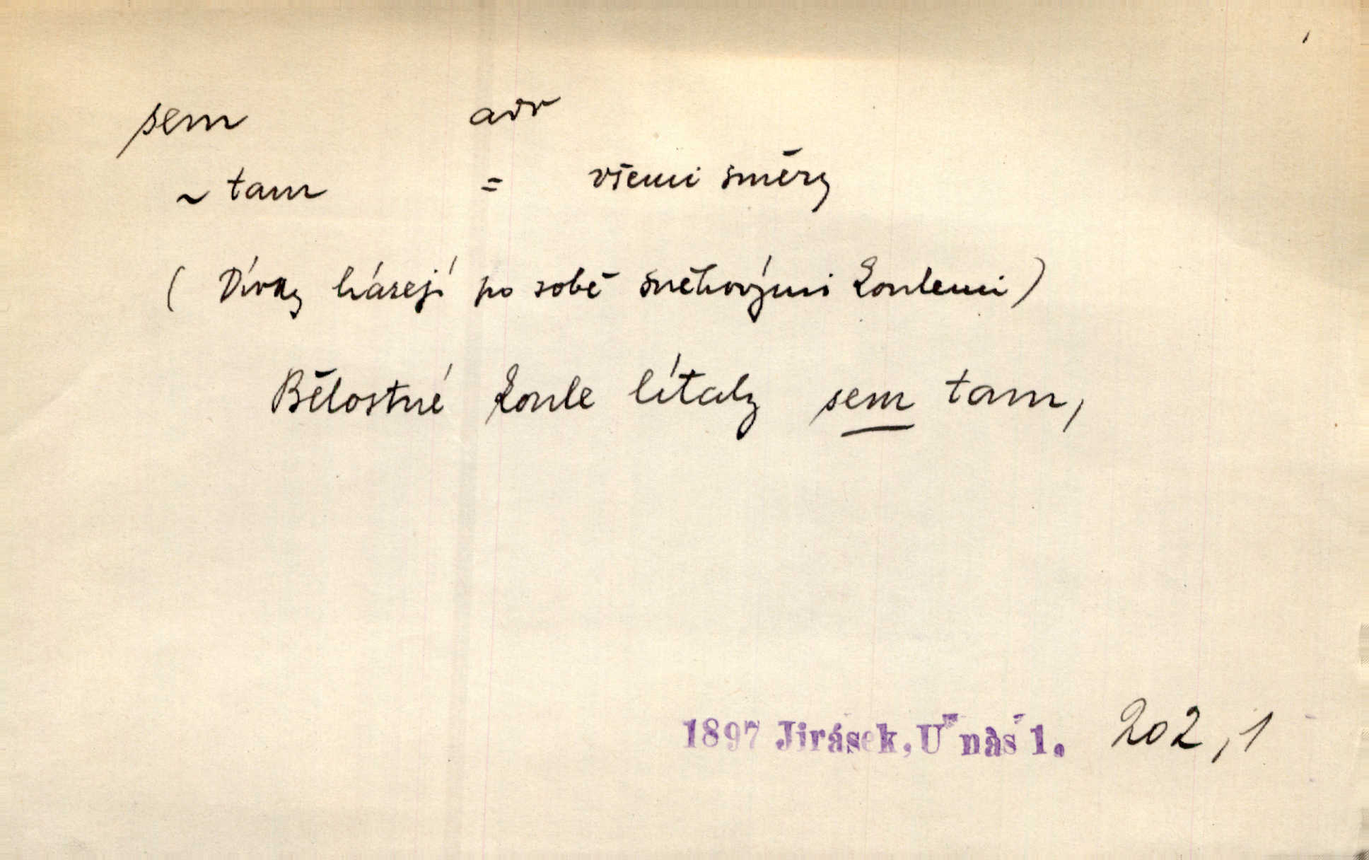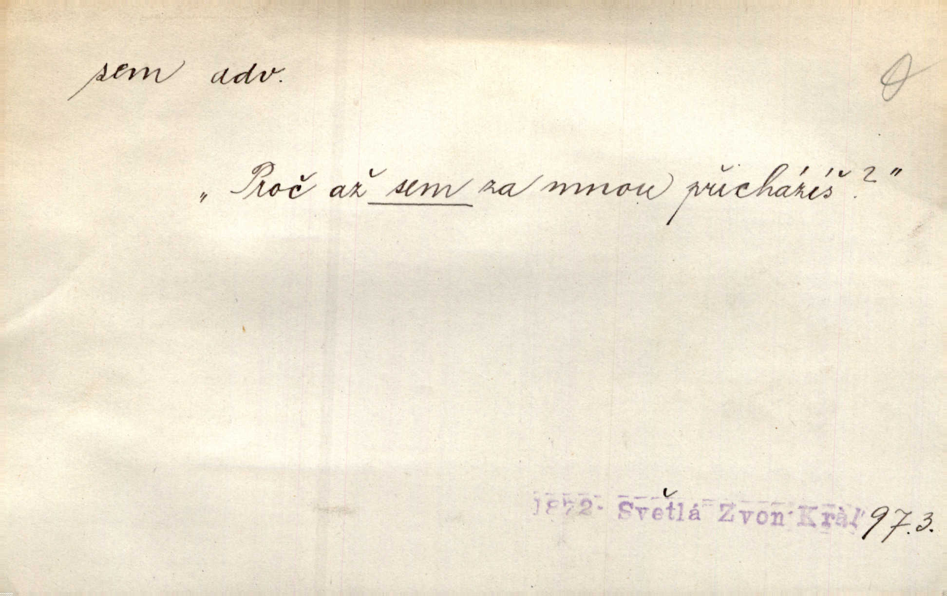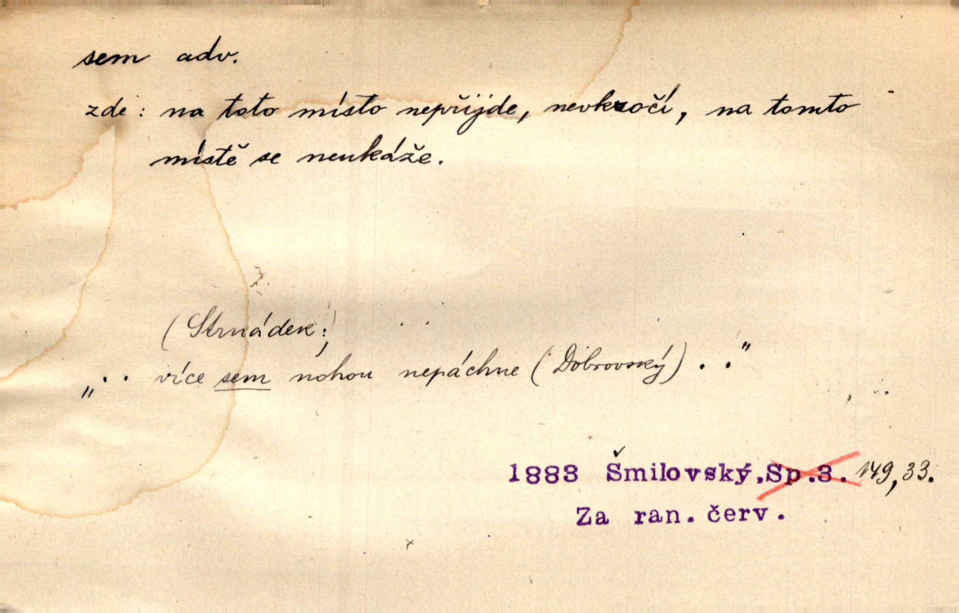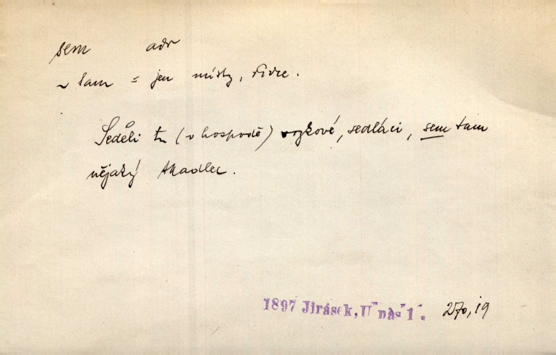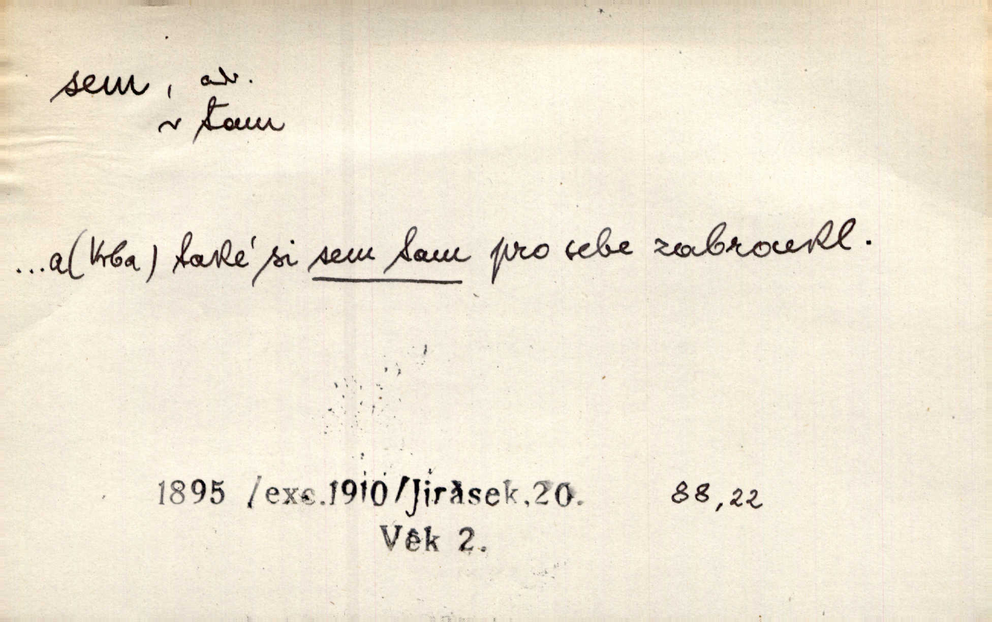 - sem (zast. semo) adv. na toto místo. „Jeníku, Vilíme, pojďte sem!“ volala [babička]. Něm. Pojď, Míno, sem a na klín můj. Ner. To jste vy prve zpívali, než jsme sem přijeli? Jir. Od panské zahrady dolehl sem hlučný smích chasy. A. Mrš. Před dvaceti lety se odněkud od Slaného sem přiženil. Třeb. Hezké to tu máte, hned bych se sem odstěhovala. Rais. Čelo bílým šátkem si utíraje, kvapným krokem semo přicházel. Čech. Snads přivedl mě semo k zavraždění! Frič. Zda taky někdo odtamtud [s hvězd] se k nám sem dolů dívá. Hál. Podivné přirovnání s milionářstvím docela sem nepatří do uvedené souvislosti. Havl. „Ale už toho mám zrovna až sem,“ a přejela rukou krk. Šim. „Až sem a ne dále!“ zněl jeho osud po určitou hranici. Prav. Peníze sem, nebo jste syn smrti vydejte je. Hajn. [Nejedlý:] „Chcete-li mít trpělivost něco poslechnout —“ „Sem s tím, sem s tím!“ řekl Hněvkovský. Tyl. Chodívali až k železnici sem i tam pěšky na toto místo i zpátky. Šmil. Vždyť jsem to věděla, že bude ta cesta za půl dne sem a tam pro ni mnoho. Svět. Ustanoven krátký výlet do Prahy za den sem a tam. Podl. Dívka koukala sem, hoch tam, jakoby k sobě ani nenáleželi na jednu stranu — na opačnou. Svět. Co je do obce, kde jeden chodí sem a druhý tam každý jinam, opačně. Šmil. Shlíží se v ní zrovna [v ženě] — jenom stále „Marjánko sem — Marjánko tam“ na ni mluví stále se k ní obrací. Baar. V Orientě se to nebere s číslicemi tak příliš přesně. Nula sem, nula tam na nule nezáleží. Rozhlas. Pár let sem, pár let tam, to se vyrovná, když se mají dva rádi. Něm. D sem tam (řidč. sem a tam, sem i tam, tam sem), semo tamo (řidč. semo tam) se strany na stranu, s místa na místo. Starý Frnčala přecházel jizbou sem tam. Jir. Jányš rozčileně přecházel semotamo od okna k oknu. Baud. Panošové kvapně semo tam pobíhali. Zl. Praha. Jeho přemítání kolísalo se semotam. Podl. Davy lidstva se procházejí sem tam. Bozd. Bělostné koule lítaly sem tam. Jir. Sem tam klonily se rozhodnutí vážky. Čech. D tu a tam, místy, leckde, pořídku. Seděli tu [v hospodě] vozkové, sedláci, sem tam nějaký tkadlec. Jir. Sem tam, kudy jeli, viděli ohnutého kopáče. Herb. Sem tam zdvihl se lid sedlský proti svým utiskovatelům. Tomek. Starý Růžička byl muž — jak se ještě semtam říká — ze starého zákona. Tyl. Obyvatelstvo sem a tam činí nádržky a kopá cisterny. Hol. Po písčitých planinách vyrážela semotam tráva s některým kvítkem. Ehrenb. Paprsek svobody občanské semo tamo prorážel. Šmil. D časem, občas, leckdy, chvílemi. Vácovský biskup hodil sem tam latinské slovo. Jir. Také si [Vrba] sem tam pro sebe zabroukl. Jir. Sem tam přidal nemastné, neslané slovo. Vrba. Nevedli tak ukrutně kajícího života, žeby si nebyli semotam i nějakého chutnějšího pokrmu přávali. Ritt. D všelijak, lecjak. Mluvilo se o tom a onom, sem a tam, až vylezl [námluvčí] s barvou ven. Něm. Hrabec ve své jizbě přemýšlel sem tam, ale zase vracel se k Anežce. Herb. Slečny hádaly sem i tam, jmenujíce jména všelijaká. Choch. Ona začala sem a tam, co prý si myslím. Čap. Ch. Rokovalo se ještě semo tamo, ale proti návrhu Antonína Žiliny neozval se žádný hlas. O. Červ. — V. t. semhle, semka, semto, semže.