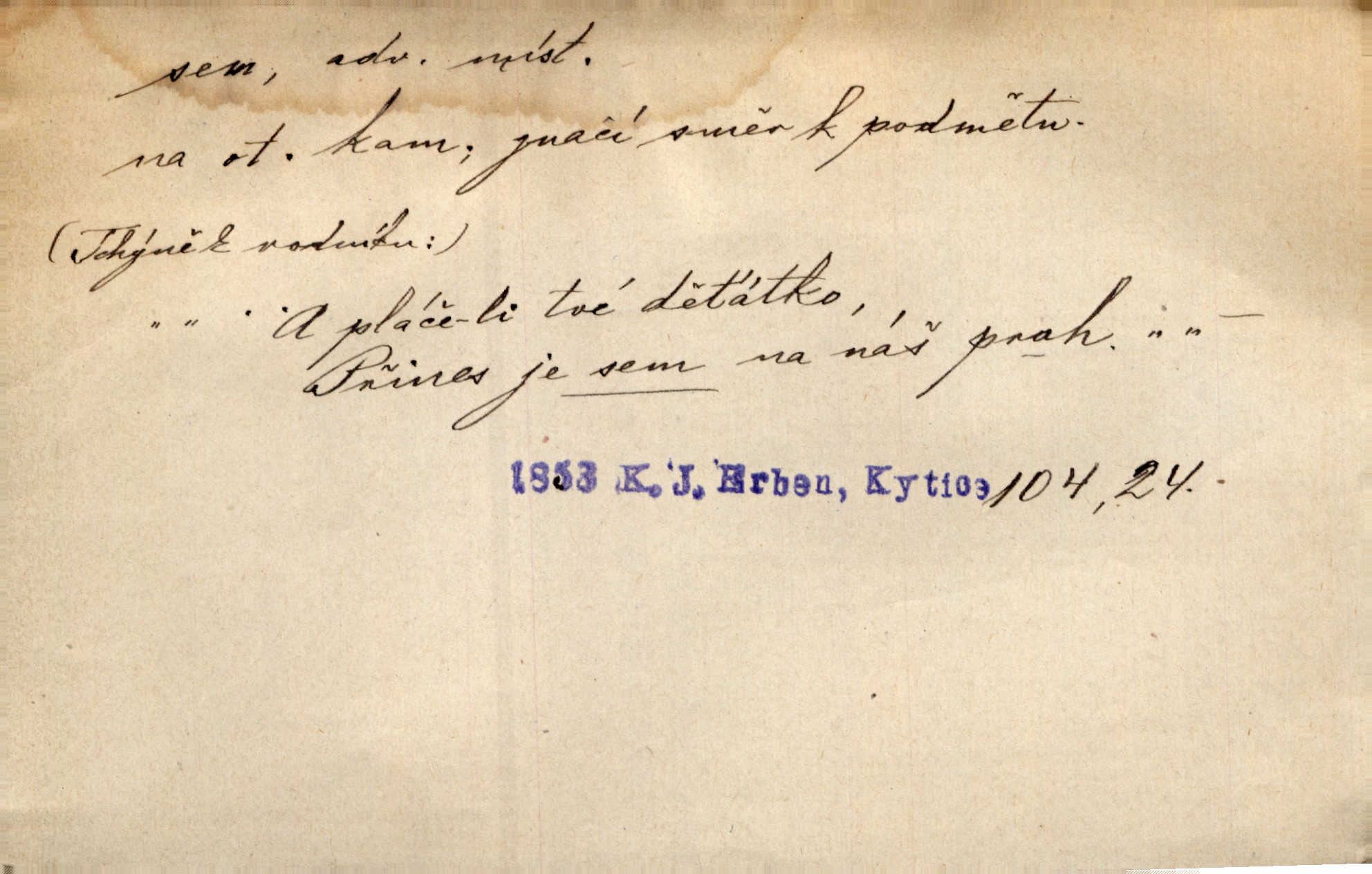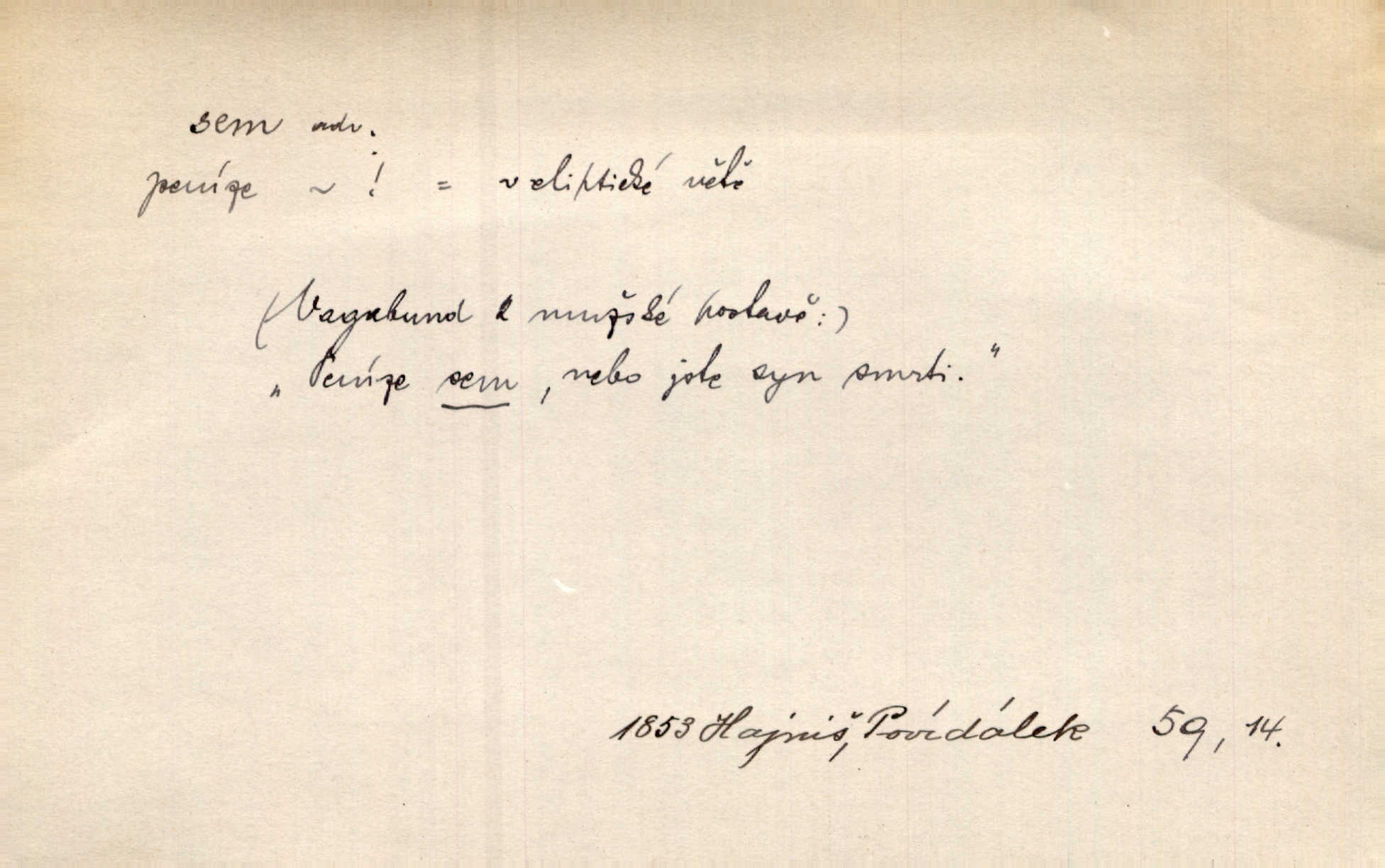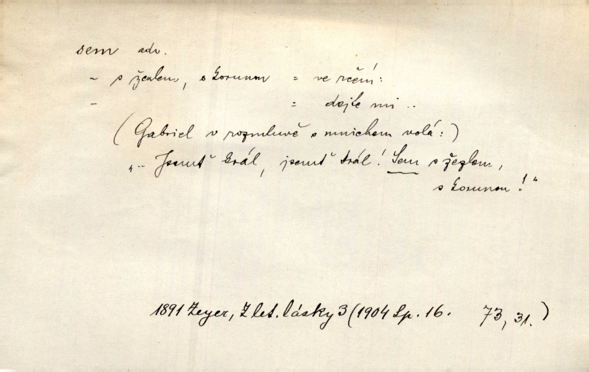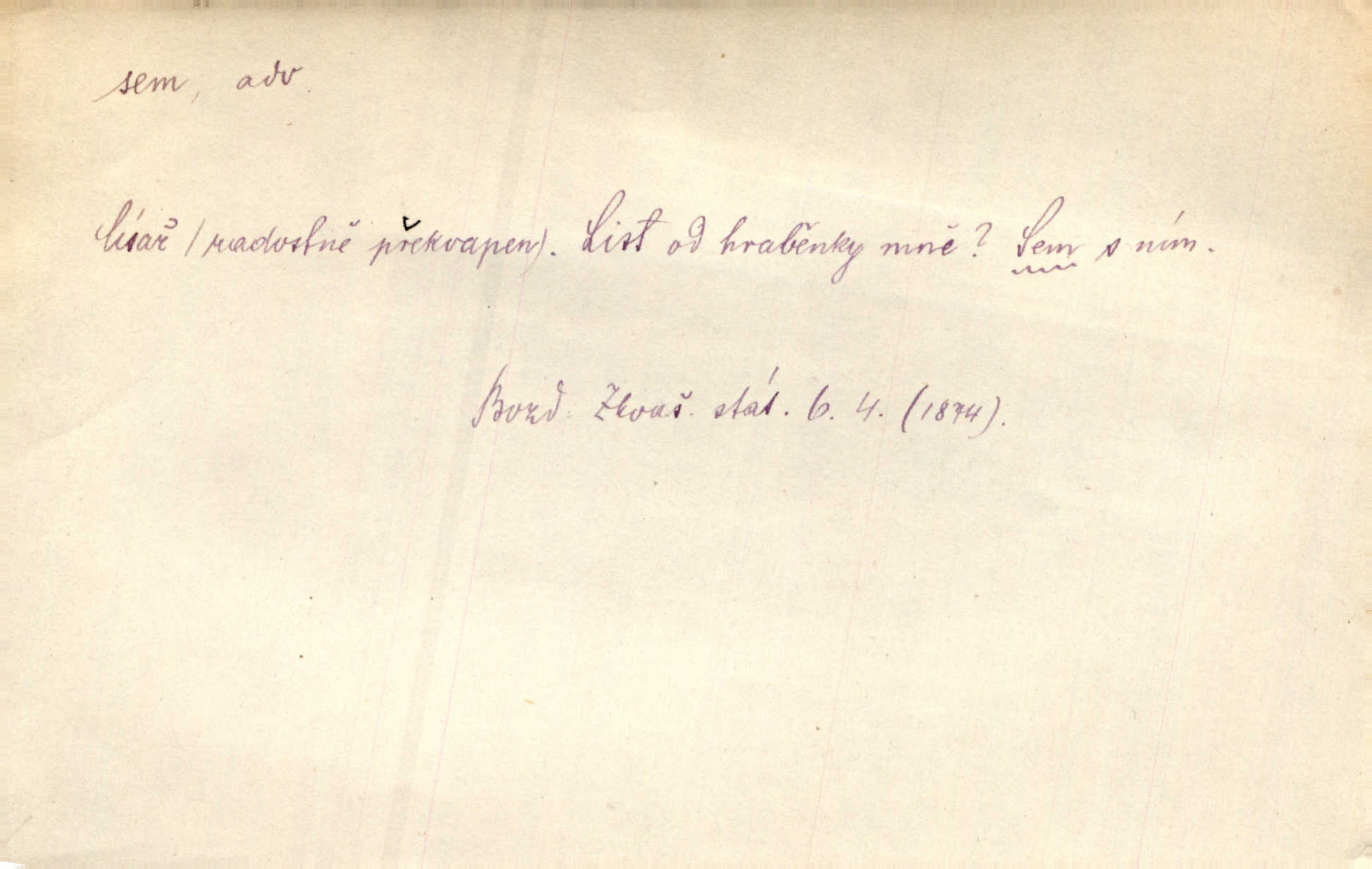 - sem (zast. semo) adv. na toto místo. „Jeníku, Vilíme, pojďte sem!“ volala [babička]. Něm. Pojď, Míno, sem a na klín můj. Ner. To jste vy prve zpívali, než jsme sem přijeli? Jir. Od panské zahrady dolehl sem hlučný smích chasy. A. Mrš. Před dvaceti lety se odněkud od Slaného sem přiženil. Třeb. Hezké to tu máte, hned bych se sem odstěhovala. Rais. Čelo bílým šátkem si utíraje, kvapným krokem semo přicházel. Čech. Snads přivedl mě semo k zavraždění! Frič. Zda taky někdo odtamtud [s hvězd] se k nám sem dolů dívá. Hál. Podivné přirovnání s milionářstvím docela sem nepatří do uvedené souvislosti. Havl. „Ale už toho mám zrovna až sem,“ a přejela rukou krk. Šim. „Až sem a ne dále!“ zněl jeho osud po určitou hranici. Prav. Peníze sem, nebo jste syn smrti vydejte je. Hajn. [Nejedlý:] „Chcete-li mít trpělivost něco poslechnout —“ „Sem s tím, sem s tím!“ řekl Hněvkovský. Tyl. Chodívali až k železnici sem i tam pěšky na toto místo i zpátky. Šmil. Vždyť jsem to věděla, že bude ta cesta za půl dne sem a tam pro ni mnoho. Svět. Ustanoven krátký výlet do Prahy za den sem a tam. Podl. Dívka koukala sem, hoch tam, jakoby k sobě ani nenáleželi na jednu stranu — na opačnou. Svět. Co je do obce, kde jeden chodí sem a druhý tam každý jinam, opačně. Šmil. Shlíží se v ní zrovna [v ženě] — jenom stále „Marjánko sem — Marjánko tam“ na ni mluví stále se k ní obrací. Baar. V Orientě se to nebere s číslicemi tak příliš přesně. Nula sem, nula tam na nule nezáleží. Rozhlas. Pár let sem, pár let tam, to se vyrovná, když se mají dva rádi. Něm. D sem tam (řidč. sem a tam, sem i tam, tam sem), semo tamo (řidč. semo tam) se strany na stranu, s místa na místo. Starý Frnčala přecházel jizbou sem tam. Jir. Jányš rozčileně přecházel semotamo od okna k oknu. Baud. Panošové kvapně semo tam pobíhali. Zl. Praha. Jeho přemítání kolísalo se semotam. Podl. Davy lidstva se procházejí sem tam. Bozd. Bělostné koule lítaly sem tam. Jir. Sem tam klonily se rozhodnutí vážky. Čech. D tu a tam, místy, leckde, pořídku. Seděli tu [v hospodě] vozkové, sedláci, sem tam nějaký tkadlec. Jir. Sem tam, kudy jeli, viděli ohnutého kopáče. Herb. Sem tam zdvihl se lid sedlský proti svým utiskovatelům. Tomek. Starý Růžička byl muž — jak se ještě semtam říká — ze starého zákona. Tyl. Obyvatelstvo sem a tam činí nádržky a kopá cisterny. Hol. Po písčitých planinách vyrážela semotam tráva s některým kvítkem. Ehrenb. Paprsek svobody občanské semo tamo prorážel. Šmil. D časem, občas, leckdy, chvílemi. Vácovský biskup hodil sem tam latinské slovo. Jir. Také si [Vrba] sem tam pro sebe zabroukl. Jir. Sem tam přidal nemastné, neslané slovo. Vrba. Nevedli tak ukrutně kajícího života, žeby si nebyli semotam i nějakého chutnějšího pokrmu přávali. Ritt. D všelijak, lecjak. Mluvilo se o tom a onom, sem a tam, až vylezl [námluvčí] s barvou ven. Něm. Hrabec ve své jizbě přemýšlel sem tam, ale zase vracel se k Anežce. Herb. Slečny hádaly sem i tam, jmenujíce jména všelijaká. Choch. Ona začala sem a tam, co prý si myslím. Čap. Ch. Rokovalo se ještě semo tamo, ale proti návrhu Antonína Žiliny neozval se žádný hlas. O. Červ. — V. t. semhle, semka, semto, semže.