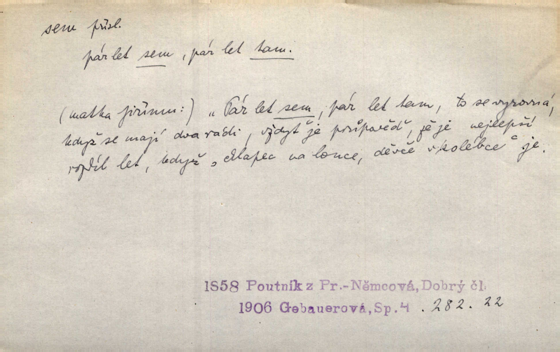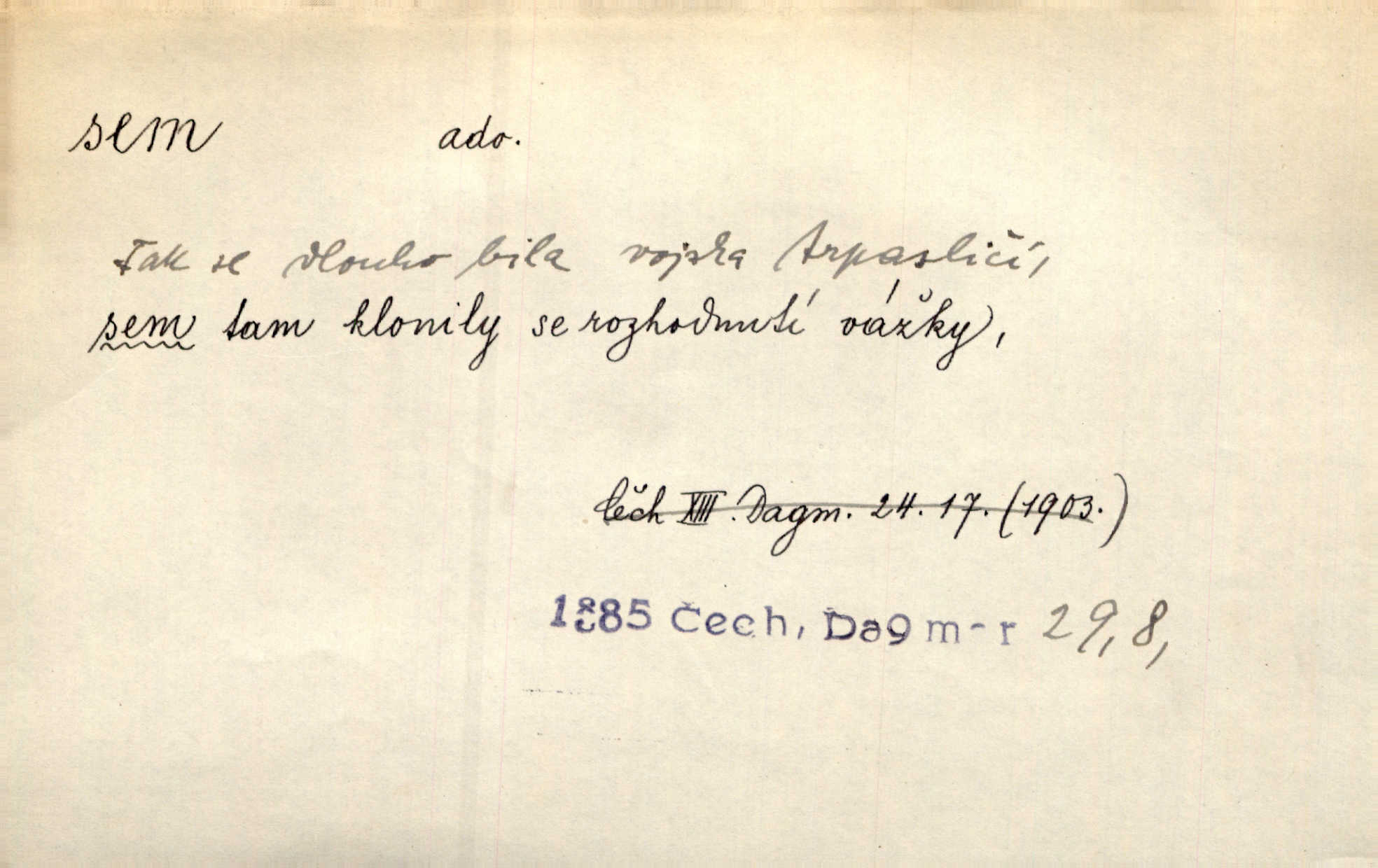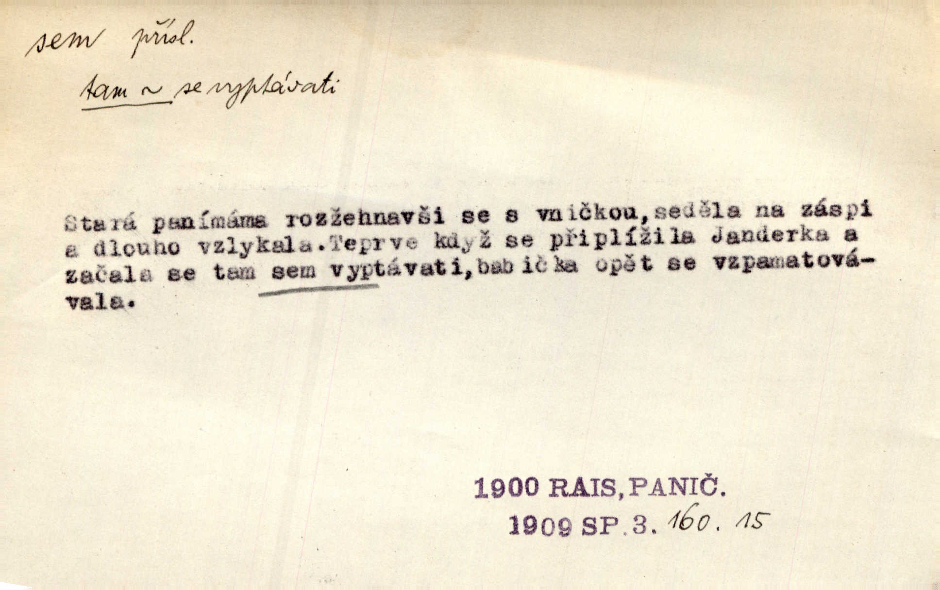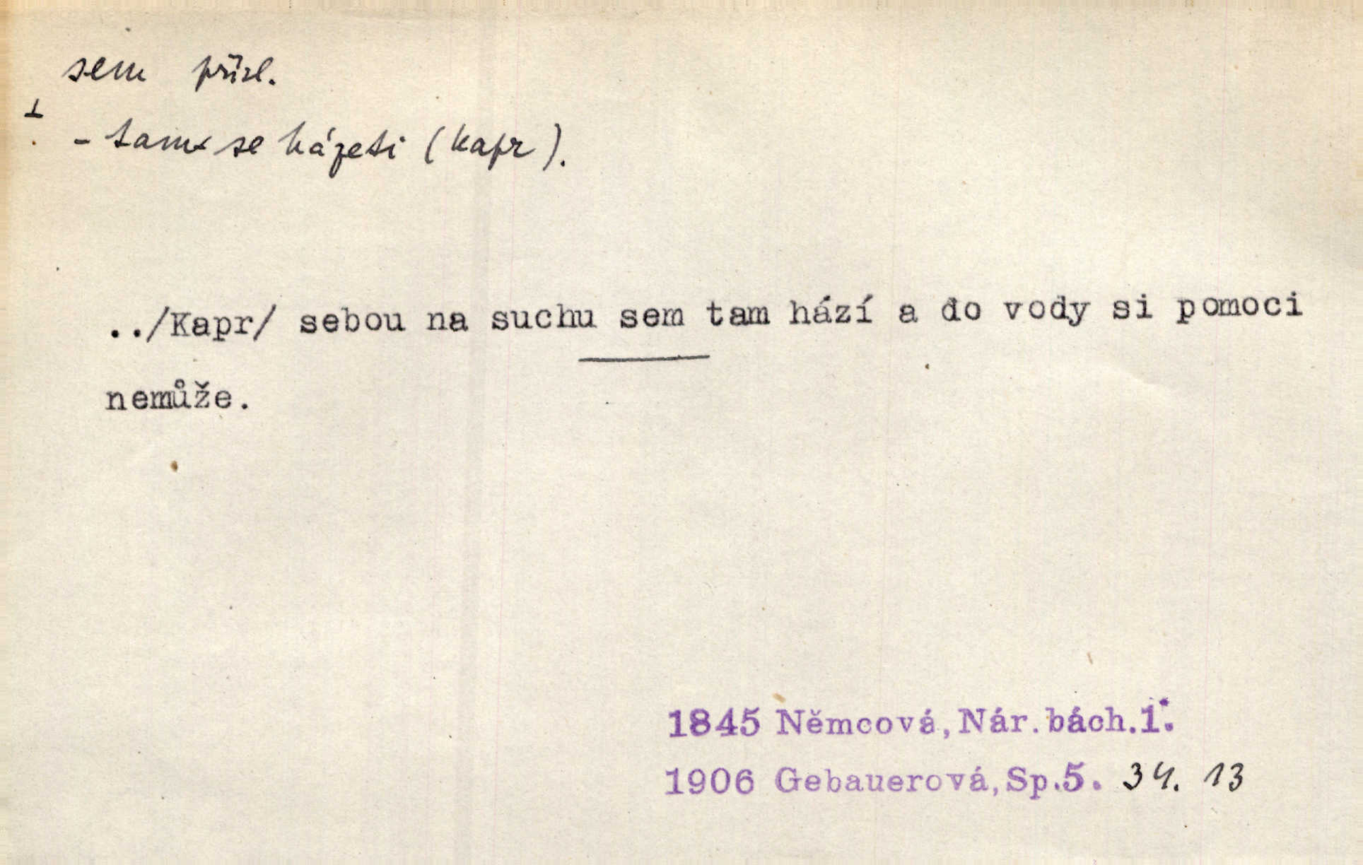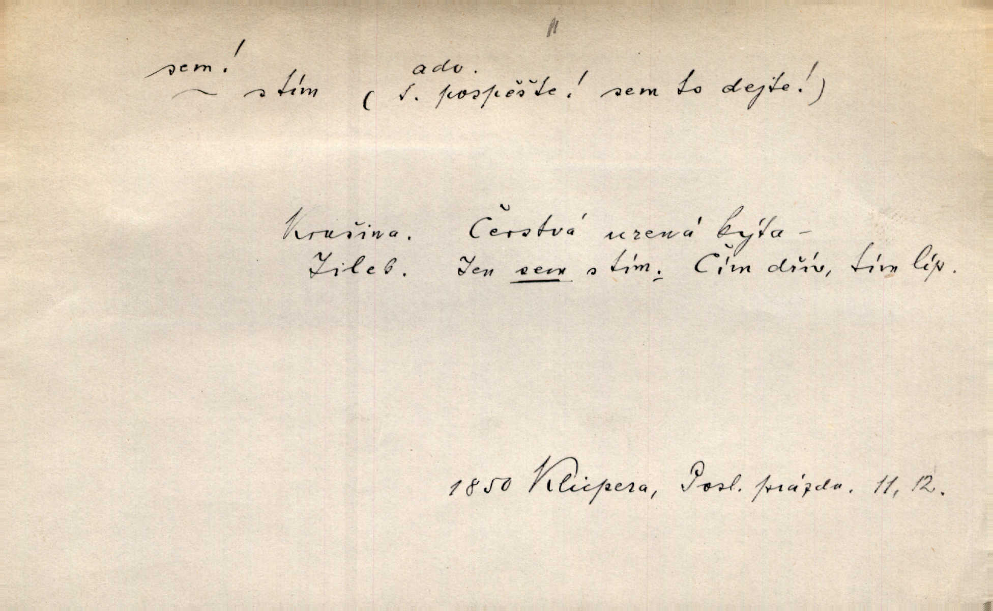 - sem (zast. semo) adv. na toto místo. „Jeníku, Vilíme, pojďte sem!“ volala [babička]. Něm. Pojď, Míno, sem a na klín můj. Ner. To jste vy prve zpívali, než jsme sem přijeli? Jir. Od panské zahrady dolehl sem hlučný smích chasy. A. Mrš. Před dvaceti lety se odněkud od Slaného sem přiženil. Třeb. Hezké to tu máte, hned bych se sem odstěhovala. Rais. Čelo bílým šátkem si utíraje, kvapným krokem semo přicházel. Čech. Snads přivedl mě semo k zavraždění! Frič. Zda taky někdo odtamtud [s hvězd] se k nám sem dolů dívá. Hál. Podivné přirovnání s milionářstvím docela sem nepatří do uvedené souvislosti. Havl. „Ale už toho mám zrovna až sem,“ a přejela rukou krk. Šim. „Až sem a ne dále!“ zněl jeho osud po určitou hranici. Prav. Peníze sem, nebo jste syn smrti vydejte je. Hajn. [Nejedlý:] „Chcete-li mít trpělivost něco poslechnout —“ „Sem s tím, sem s tím!“ řekl Hněvkovský. Tyl. Chodívali až k železnici sem i tam pěšky na toto místo i zpátky. Šmil. Vždyť jsem to věděla, že bude ta cesta za půl dne sem a tam pro ni mnoho. Svět. Ustanoven krátký výlet do Prahy za den sem a tam. Podl. Dívka koukala sem, hoch tam, jakoby k sobě ani nenáleželi na jednu stranu — na opačnou. Svět. Co je do obce, kde jeden chodí sem a druhý tam každý jinam, opačně. Šmil. Shlíží se v ní zrovna [v ženě] — jenom stále „Marjánko sem — Marjánko tam“ na ni mluví stále se k ní obrací. Baar. V Orientě se to nebere s číslicemi tak příliš přesně. Nula sem, nula tam na nule nezáleží. Rozhlas. Pár let sem, pár let tam, to se vyrovná, když se mají dva rádi. Něm. D sem tam (řidč. sem a tam, sem i tam, tam sem), semo tamo (řidč. semo tam) se strany na stranu, s místa na místo. Starý Frnčala přecházel jizbou sem tam. Jir. Jányš rozčileně přecházel semotamo od okna k oknu. Baud. Panošové kvapně semo tam pobíhali. Zl. Praha. Jeho přemítání kolísalo se semotam. Podl. Davy lidstva se procházejí sem tam. Bozd. Bělostné koule lítaly sem tam. Jir. Sem tam klonily se rozhodnutí vážky. Čech. D tu a tam, místy, leckde, pořídku. Seděli tu [v hospodě] vozkové, sedláci, sem tam nějaký tkadlec. Jir. Sem tam, kudy jeli, viděli ohnutého kopáče. Herb. Sem tam zdvihl se lid sedlský proti svým utiskovatelům. Tomek. Starý Růžička byl muž — jak se ještě semtam říká — ze starého zákona. Tyl. Obyvatelstvo sem a tam činí nádržky a kopá cisterny. Hol. Po písčitých planinách vyrážela semotam tráva s některým kvítkem. Ehrenb. Paprsek svobody občanské semo tamo prorážel. Šmil. D časem, občas, leckdy, chvílemi. Vácovský biskup hodil sem tam latinské slovo. Jir. Také si [Vrba] sem tam pro sebe zabroukl. Jir. Sem tam přidal nemastné, neslané slovo. Vrba. Nevedli tak ukrutně kajícího života, žeby si nebyli semotam i nějakého chutnějšího pokrmu přávali. Ritt. D všelijak, lecjak. Mluvilo se o tom a onom, sem a tam, až vylezl [námluvčí] s barvou ven. Něm. Hrabec ve své jizbě přemýšlel sem tam, ale zase vracel se k Anežce. Herb. Slečny hádaly sem i tam, jmenujíce jména všelijaká. Choch. Ona začala sem a tam, co prý si myslím. Čap. Ch. Rokovalo se ještě semo tamo, ale proti návrhu Antonína Žiliny neozval se žádný hlas. O. Červ. — V. t. semhle, semka, semto, semže.