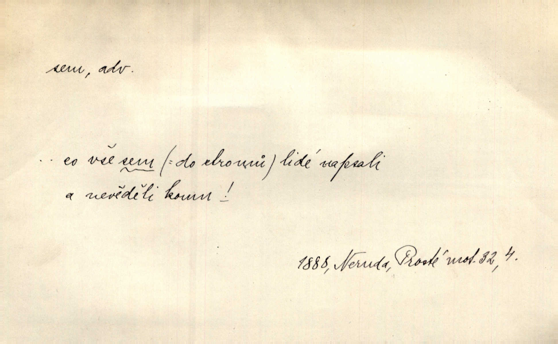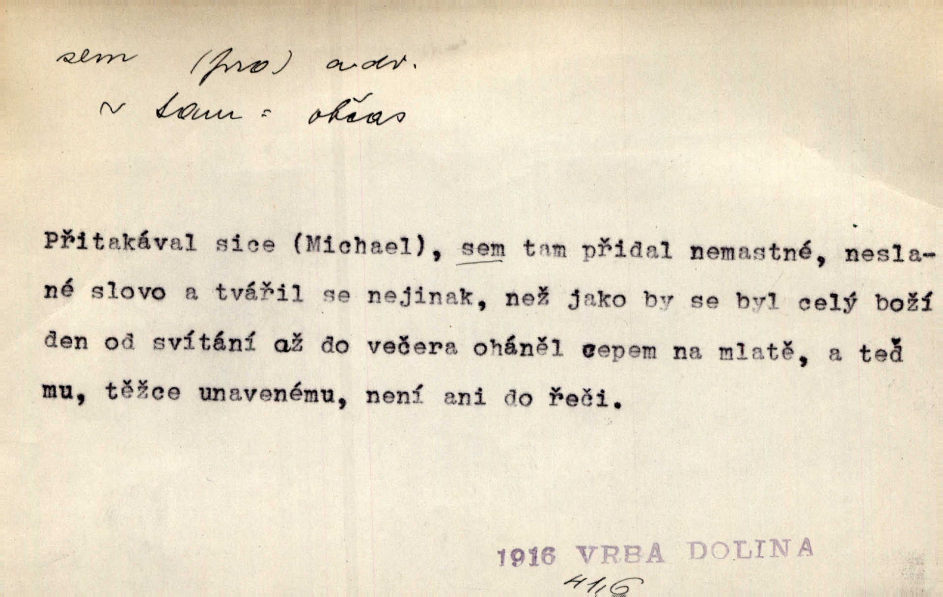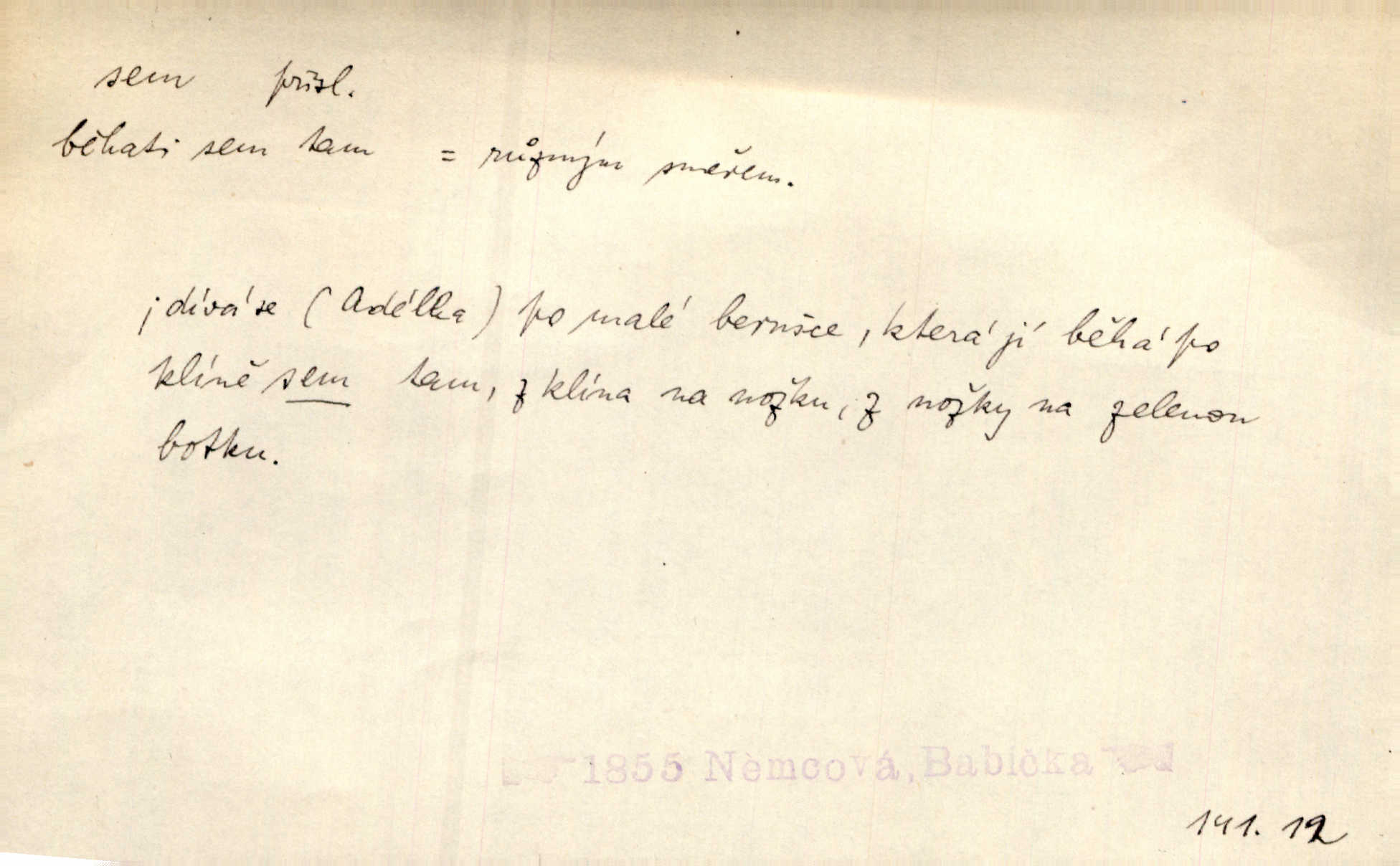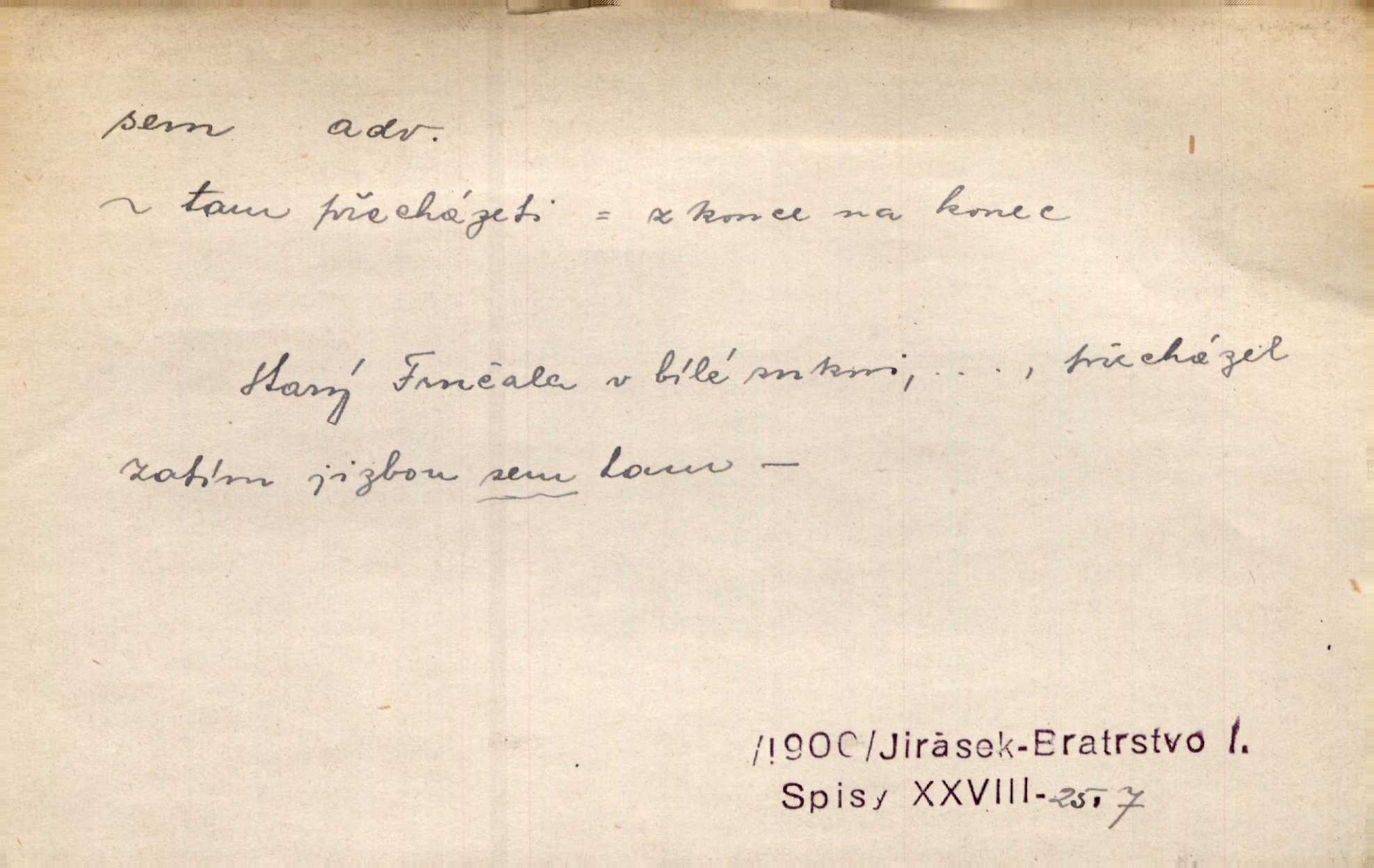 - sem (zast. semo) adv. na toto místo. „Jeníku, Vilíme, pojďte sem!“ volala [babička]. Něm. Pojď, Míno, sem a na klín můj. Ner. To jste vy prve zpívali, než jsme sem přijeli? Jir. Od panské zahrady dolehl sem hlučný smích chasy. A. Mrš. Před dvaceti lety se odněkud od Slaného sem přiženil. Třeb. Hezké to tu máte, hned bych se sem odstěhovala. Rais. Čelo bílým šátkem si utíraje, kvapným krokem semo přicházel. Čech. Snads přivedl mě semo k zavraždění! Frič. Zda taky někdo odtamtud [s hvězd] se k nám sem dolů dívá. Hál. Podivné přirovnání s milionářstvím docela sem nepatří do uvedené souvislosti. Havl. „Ale už toho mám zrovna až sem,“ a přejela rukou krk. Šim. „Až sem a ne dále!“ zněl jeho osud po určitou hranici. Prav. Peníze sem, nebo jste syn smrti vydejte je. Hajn. [Nejedlý:] „Chcete-li mít trpělivost něco poslechnout —“ „Sem s tím, sem s tím!“ řekl Hněvkovský. Tyl. Chodívali až k železnici sem i tam pěšky na toto místo i zpátky. Šmil. Vždyť jsem to věděla, že bude ta cesta za půl dne sem a tam pro ni mnoho. Svět. Ustanoven krátký výlet do Prahy za den sem a tam. Podl. Dívka koukala sem, hoch tam, jakoby k sobě ani nenáleželi na jednu stranu — na opačnou. Svět. Co je do obce, kde jeden chodí sem a druhý tam každý jinam, opačně. Šmil. Shlíží se v ní zrovna [v ženě] — jenom stále „Marjánko sem — Marjánko tam“ na ni mluví stále se k ní obrací. Baar. V Orientě se to nebere s číslicemi tak příliš přesně. Nula sem, nula tam na nule nezáleží. Rozhlas. Pár let sem, pár let tam, to se vyrovná, když se mají dva rádi. Něm. D sem tam (řidč. sem a tam, sem i tam, tam sem), semo tamo (řidč. semo tam) se strany na stranu, s místa na místo. Starý Frnčala přecházel jizbou sem tam. Jir. Jányš rozčileně přecházel semotamo od okna k oknu. Baud. Panošové kvapně semo tam pobíhali. Zl. Praha. Jeho přemítání kolísalo se semotam. Podl. Davy lidstva se procházejí sem tam. Bozd. Bělostné koule lítaly sem tam. Jir. Sem tam klonily se rozhodnutí vážky. Čech. D tu a tam, místy, leckde, pořídku. Seděli tu [v hospodě] vozkové, sedláci, sem tam nějaký tkadlec. Jir. Sem tam, kudy jeli, viděli ohnutého kopáče. Herb. Sem tam zdvihl se lid sedlský proti svým utiskovatelům. Tomek. Starý Růžička byl muž — jak se ještě semtam říká — ze starého zákona. Tyl. Obyvatelstvo sem a tam činí nádržky a kopá cisterny. Hol. Po písčitých planinách vyrážela semotam tráva s některým kvítkem. Ehrenb. Paprsek svobody občanské semo tamo prorážel. Šmil. D časem, občas, leckdy, chvílemi. Vácovský biskup hodil sem tam latinské slovo. Jir. Také si [Vrba] sem tam pro sebe zabroukl. Jir. Sem tam přidal nemastné, neslané slovo. Vrba. Nevedli tak ukrutně kajícího života, žeby si nebyli semotam i nějakého chutnějšího pokrmu přávali. Ritt. D všelijak, lecjak. Mluvilo se o tom a onom, sem a tam, až vylezl [námluvčí] s barvou ven. Něm. Hrabec ve své jizbě přemýšlel sem tam, ale zase vracel se k Anežce. Herb. Slečny hádaly sem i tam, jmenujíce jména všelijaká. Choch. Ona začala sem a tam, co prý si myslím. Čap. Ch. Rokovalo se ještě semo tamo, ale proti návrhu Antonína Žiliny neozval se žádný hlas. O. Červ. — V. t. semhle, semka, semto, semže.