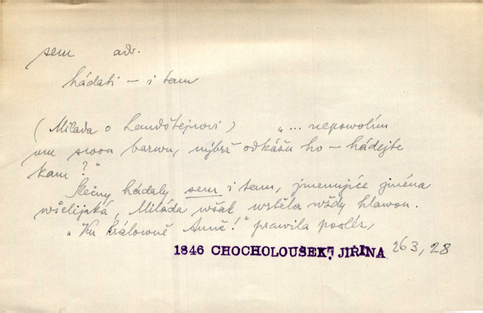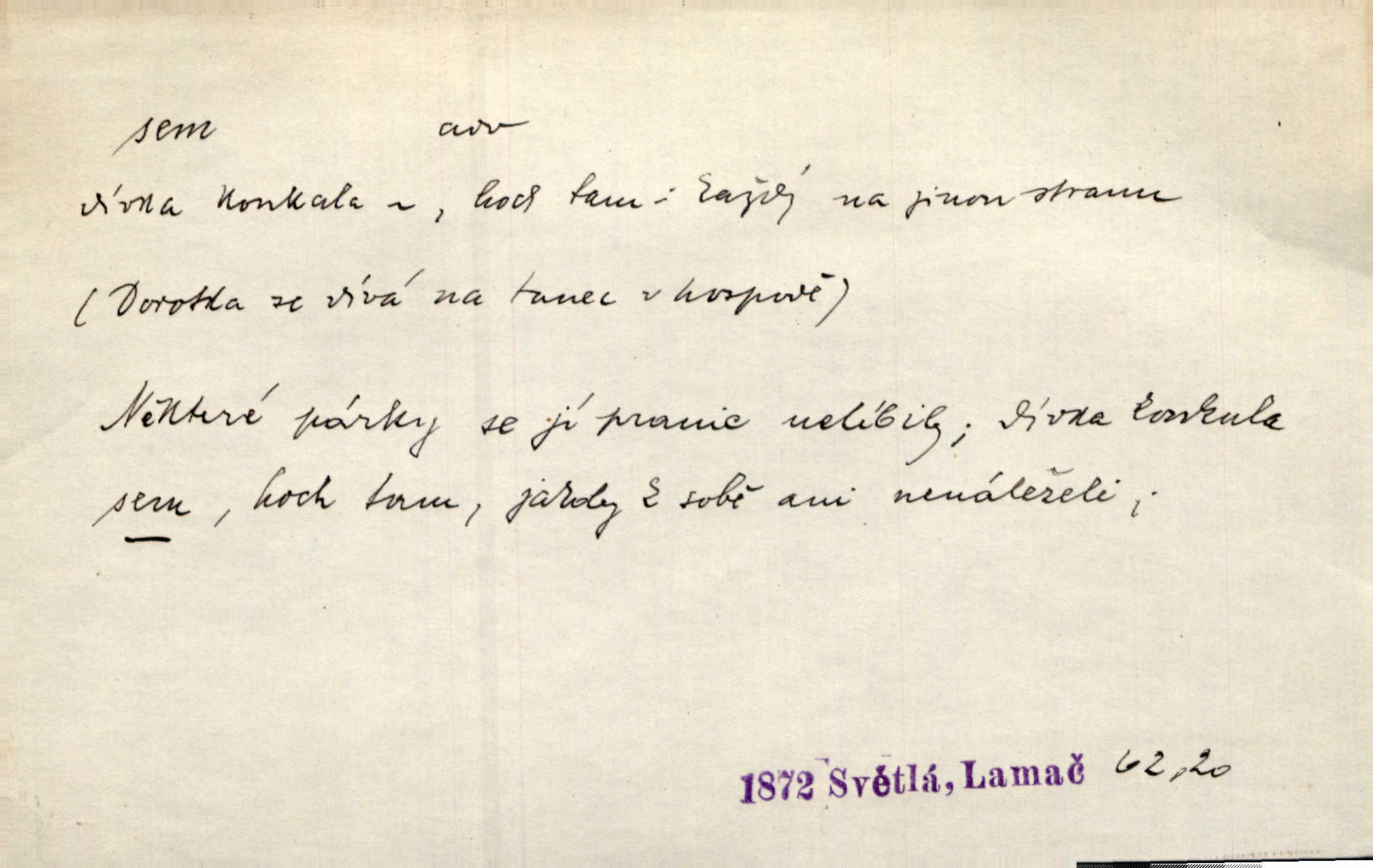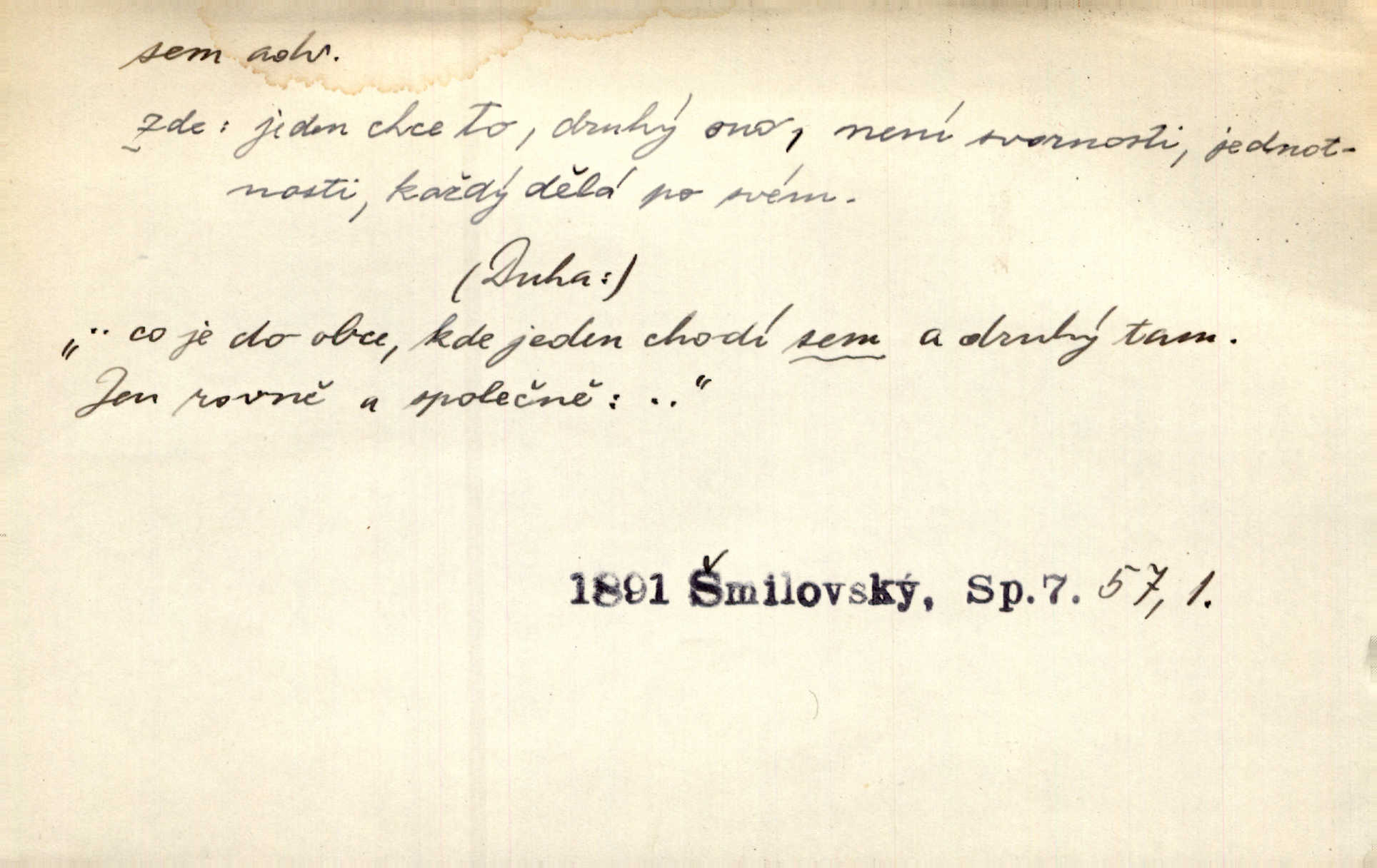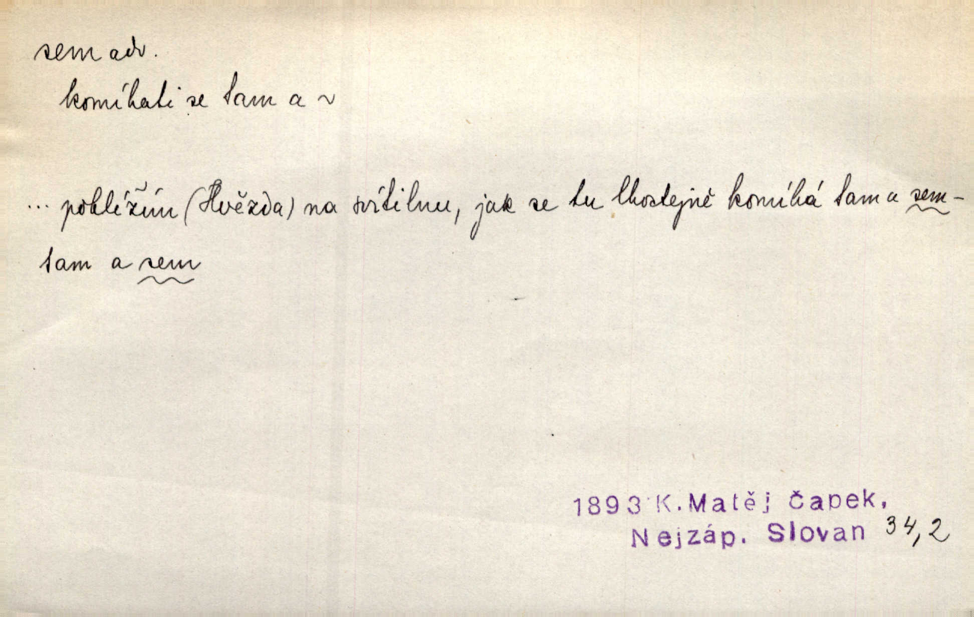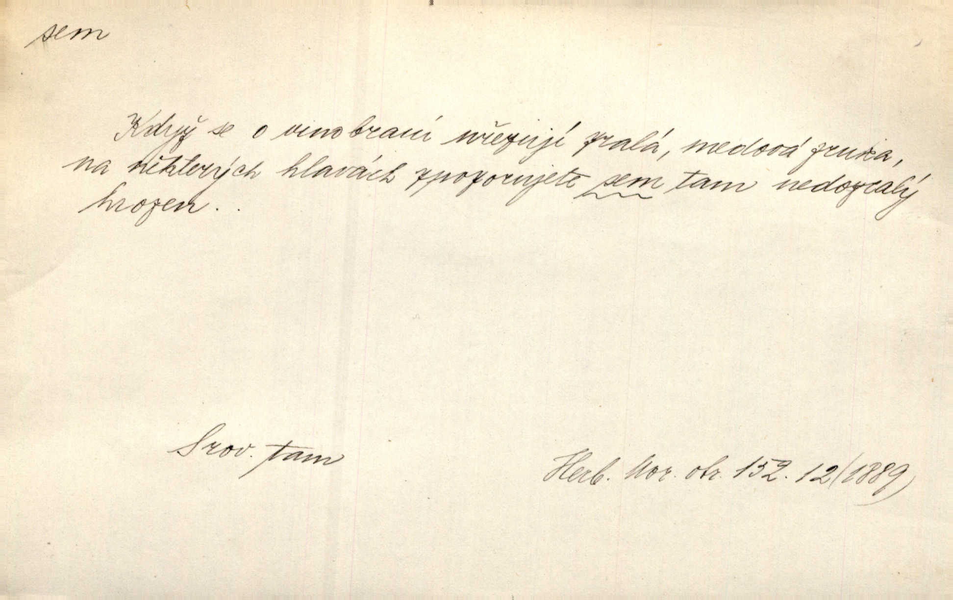 - sem (zast. semo) adv. na toto místo. „Jeníku, Vilíme, pojďte sem!“ volala [babička]. Něm. Pojď, Míno, sem a na klín můj. Ner. To jste vy prve zpívali, než jsme sem přijeli? Jir. Od panské zahrady dolehl sem hlučný smích chasy. A. Mrš. Před dvaceti lety se odněkud od Slaného sem přiženil. Třeb. Hezké to tu máte, hned bych se sem odstěhovala. Rais. Čelo bílým šátkem si utíraje, kvapným krokem semo přicházel. Čech. Snads přivedl mě semo k zavraždění! Frič. Zda taky někdo odtamtud [s hvězd] se k nám sem dolů dívá. Hál. Podivné přirovnání s milionářstvím docela sem nepatří do uvedené souvislosti. Havl. „Ale už toho mám zrovna až sem,“ a přejela rukou krk. Šim. „Až sem a ne dále!“ zněl jeho osud po určitou hranici. Prav. Peníze sem, nebo jste syn smrti vydejte je. Hajn. [Nejedlý:] „Chcete-li mít trpělivost něco poslechnout —“ „Sem s tím, sem s tím!“ řekl Hněvkovský. Tyl. Chodívali až k železnici sem i tam pěšky na toto místo i zpátky. Šmil. Vždyť jsem to věděla, že bude ta cesta za půl dne sem a tam pro ni mnoho. Svět. Ustanoven krátký výlet do Prahy za den sem a tam. Podl. Dívka koukala sem, hoch tam, jakoby k sobě ani nenáleželi na jednu stranu — na opačnou. Svět. Co je do obce, kde jeden chodí sem a druhý tam každý jinam, opačně. Šmil. Shlíží se v ní zrovna [v ženě] — jenom stále „Marjánko sem — Marjánko tam“ na ni mluví stále se k ní obrací. Baar. V Orientě se to nebere s číslicemi tak příliš přesně. Nula sem, nula tam na nule nezáleží. Rozhlas. Pár let sem, pár let tam, to se vyrovná, když se mají dva rádi. Něm. D sem tam (řidč. sem a tam, sem i tam, tam sem), semo tamo (řidč. semo tam) se strany na stranu, s místa na místo. Starý Frnčala přecházel jizbou sem tam. Jir. Jányš rozčileně přecházel semotamo od okna k oknu. Baud. Panošové kvapně semo tam pobíhali. Zl. Praha. Jeho přemítání kolísalo se semotam. Podl. Davy lidstva se procházejí sem tam. Bozd. Bělostné koule lítaly sem tam. Jir. Sem tam klonily se rozhodnutí vážky. Čech. D tu a tam, místy, leckde, pořídku. Seděli tu [v hospodě] vozkové, sedláci, sem tam nějaký tkadlec. Jir. Sem tam, kudy jeli, viděli ohnutého kopáče. Herb. Sem tam zdvihl se lid sedlský proti svým utiskovatelům. Tomek. Starý Růžička byl muž — jak se ještě semtam říká — ze starého zákona. Tyl. Obyvatelstvo sem a tam činí nádržky a kopá cisterny. Hol. Po písčitých planinách vyrážela semotam tráva s některým kvítkem. Ehrenb. Paprsek svobody občanské semo tamo prorážel. Šmil. D časem, občas, leckdy, chvílemi. Vácovský biskup hodil sem tam latinské slovo. Jir. Také si [Vrba] sem tam pro sebe zabroukl. Jir. Sem tam přidal nemastné, neslané slovo. Vrba. Nevedli tak ukrutně kajícího života, žeby si nebyli semotam i nějakého chutnějšího pokrmu přávali. Ritt. D všelijak, lecjak. Mluvilo se o tom a onom, sem a tam, až vylezl [námluvčí] s barvou ven. Něm. Hrabec ve své jizbě přemýšlel sem tam, ale zase vracel se k Anežce. Herb. Slečny hádaly sem i tam, jmenujíce jména všelijaká. Choch. Ona začala sem a tam, co prý si myslím. Čap. Ch. Rokovalo se ještě semo tamo, ale proti návrhu Antonína Žiliny neozval se žádný hlas. O. Červ. — V. t. semhle, semka, semto, semže.