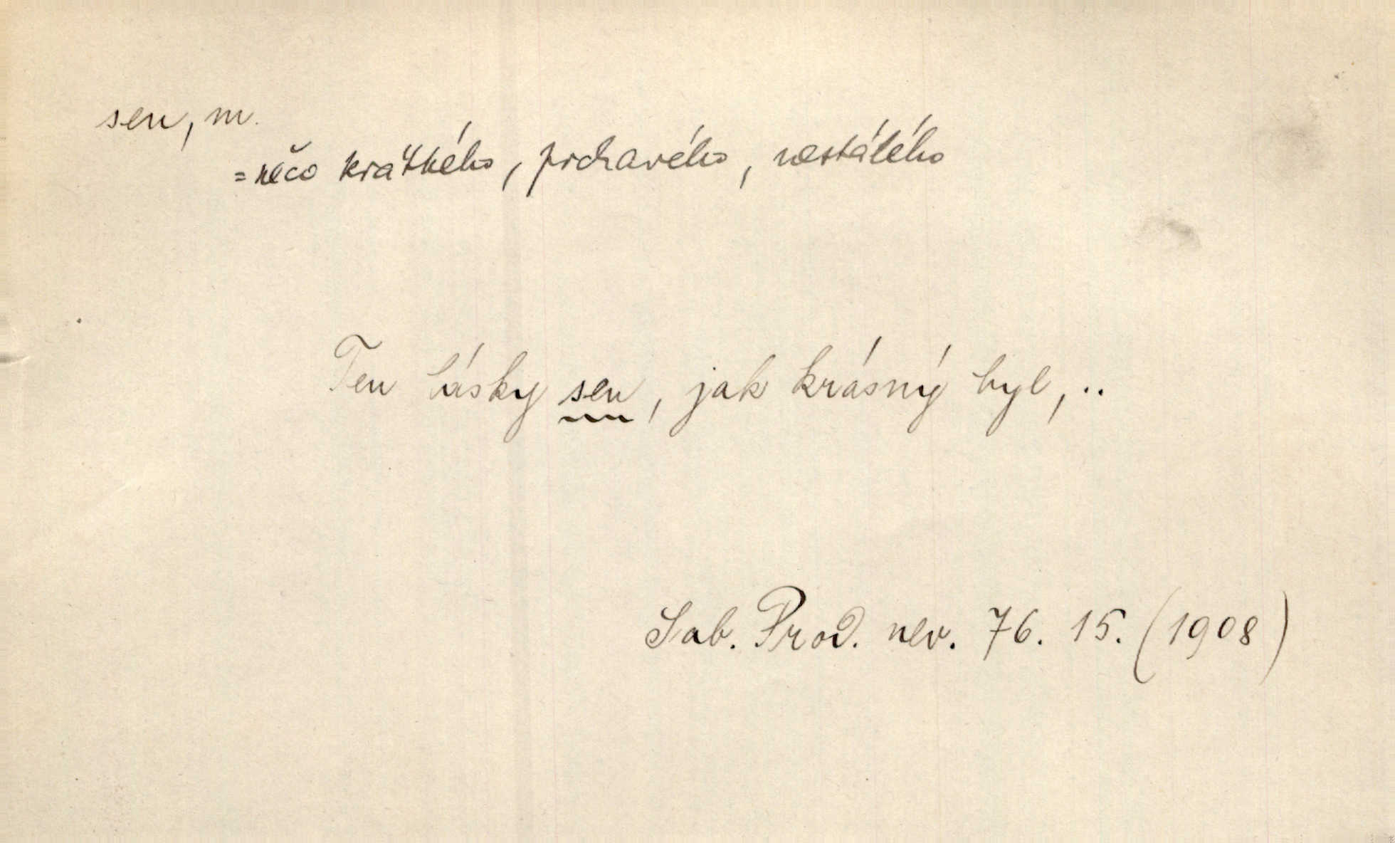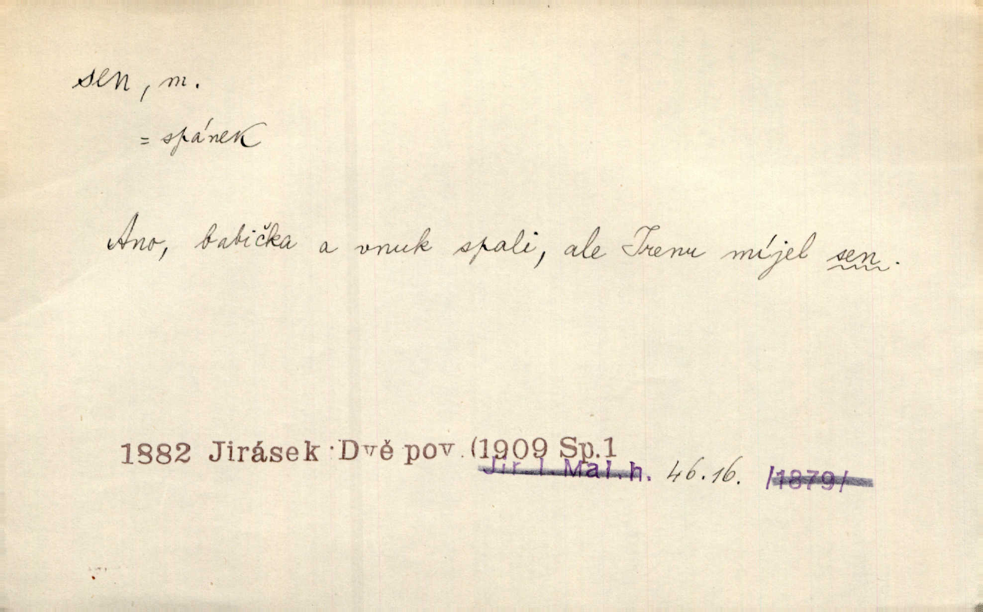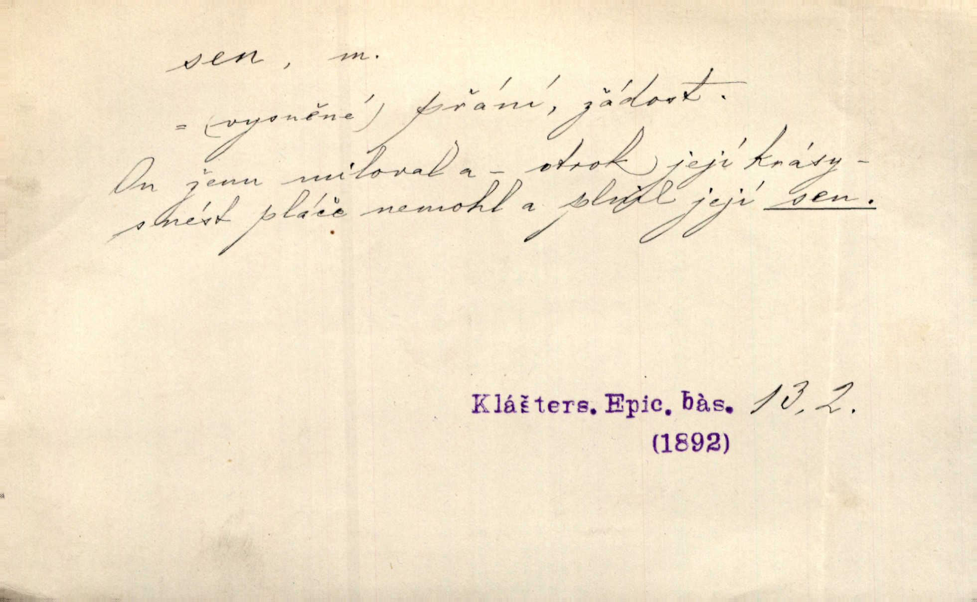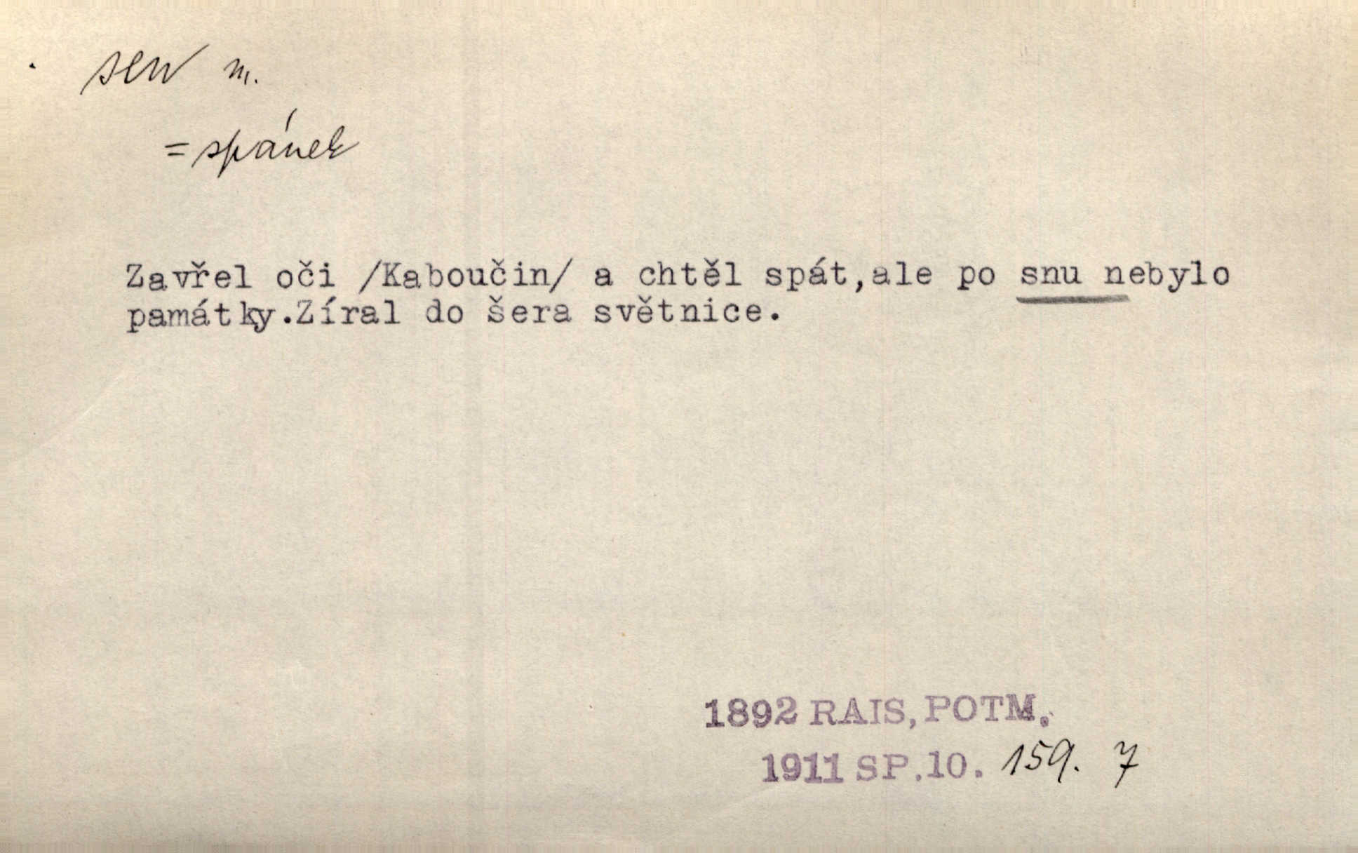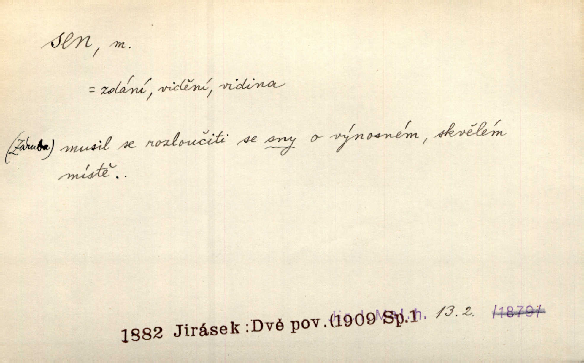 - sen, snu m. (2. sg. ve spoj. ze sna, 6. pl. též ve snách) poněk. kniž. spánek (op. bdění). Nežli by napočítal deset, spal jsem už snem spravedlivých. Kos. Nic už netísnilo tichý, zdravý jeho sen. V. Mrš. Zde odpočinu v pevném snu po dnešní pouti. Mácha. Bavívali se mezi sebou a zapuzovali tak sen. Šmil. Babička a vnuk spali, ale Irenu míjel sen. Jir. Zavřel oči a chtěl spát, ale po snu nebylo památky. Rais. Drůbež v hustých jejich [štěpů] korunách ze sna se pohnula. Rais. Ta bolest Stříhavku svírala, že nebude věčný sen dřímat vedle své nebožky že nebude pochován. Rais. Přen. V krajinu tichou kráčí sen. Mácha. Kolem ve snu dřímá luh i sad. Jan. Zasvitlo ráno, ze sna probudil se sad. Štulc. Vše dřímalo železným snem v náručí tuhého mrazu. Zey. Když byl již Přemysl vysoko v letech, usnul snem smrti zemřel. Jir. D bezděčné vybavování představ a prožívání dějů ve spánku; obrazy n. děje ve spánku viděné. Noc co noc spím krásně a beze sna. K. Čap. Ve snech se vyskytují nejčastěji dojmy zrakové. OSN Dod. Já měla zlý té noci sen: Nechoď dceruško k vodě ven. Erb. Jen zavřela oči, už se jí pletly sny, o bratru, o faráři. Jir. Voral i ve snu vídal ten dlouhý pás svých polí. Rais. Celou noc mluvil ze sna. Svět. K tvému otci přišel ve snách sv. Petr? Hol. Jdi, bláhová! Což na sny věříš? Špind. Vše tlačilo se k slunci ven, že snilo sen tak dlouhý. Hál. Jako po živém snu prochvívaly mu myslí ještě včerejší dojmy. Jir. Bylo mu, jakoby se probíral z ošklivého sna nepříjemně. Herb. Žil jako ve snu, v krásném, kypícím snu krásně, idylicky. Maj. Chodí jako ve snách a kale nemluví jako mátoha. Rais. Jako ve snách pamatoval se na popis krajiny neurčitě. Pfleg. Jako ve snu viděla jsem, že mne bral někdo do náručí ne v plném vědomí. Něm. Krásné to zjevení zmizelo jako sen rychle. Zey. Jemu ani ve snu nenapadlo, že by se vůbec kdy mohl mýlit vůbec ne. Klost. Něco takového matce Kulichové ani ve snách nepřipadlo. Herrm. D představa, kterou si někdo o něčem n. o někom vytvořil bez ohledu na skutečnost, výtvor obrazotvornosti, iluse, vidina; snění, blouznění, dumání. Nechoď vůbec do Athén, je-li ti milý sen! Ner. Nechme je doufati, neberme jim ten krásný sen! Rub. Snem se blažila, nebo skutečnost byla tak smutná. Jir. On viděl, za snem že byl putoval hned od počátku svého života. Zey. [Člověk] utíká se k blouznivým snům a vzpomínkám na doby lepší. V. Mrš. [Zeyer] uchyloval se do nádherných svých snů. V. Mrš. A ta Praha jeho snů a tužeb prchala před ním jako fantóm. Zey. Nikdy jí nebyla obrazotvornost její sny živé předváděla. Ner. On zase má své náboženské sny. J. z Hv. [Aleš] sen své duše podává, tedy vnitřní pravdu kreslí. V. Mrš. D vroucí, toužebné přání, těžko splnitelná n. dostupná tužba, naděje, plán. [Básník] mohl realisovati svůj dávný sen. Kar. Teď čte najednou, že se má splnit jeho krásný sen — rolnická škola. Baar. Národní divadlo náleželo k jeho (Chmelenského) zlatým snům. Tyl. A slýchala jsem o něm povídat, o smělých snech, jež uskutečnit chtěl. Zey. Rozhovořil se o svých snech a plánech. Hlad. Musil se rozloučiti se sny o výnosném místě. Jir. Kochala se v blahých snech, o jichž uskutečnění nepochybovala. Něm. D něco neskutečně krásného, prchavého, pomíjivého. Ten lásky sen, jak krásný byl. Sab. Žiltě [Hálek] v růžovém snu své první lásky. Jir. V života sen byl jsem já snad jen vyváben. Mácha. Jeho řeč, ať byla podstatná, ať pouhý sen, se šířila po celém kraji. Zey.