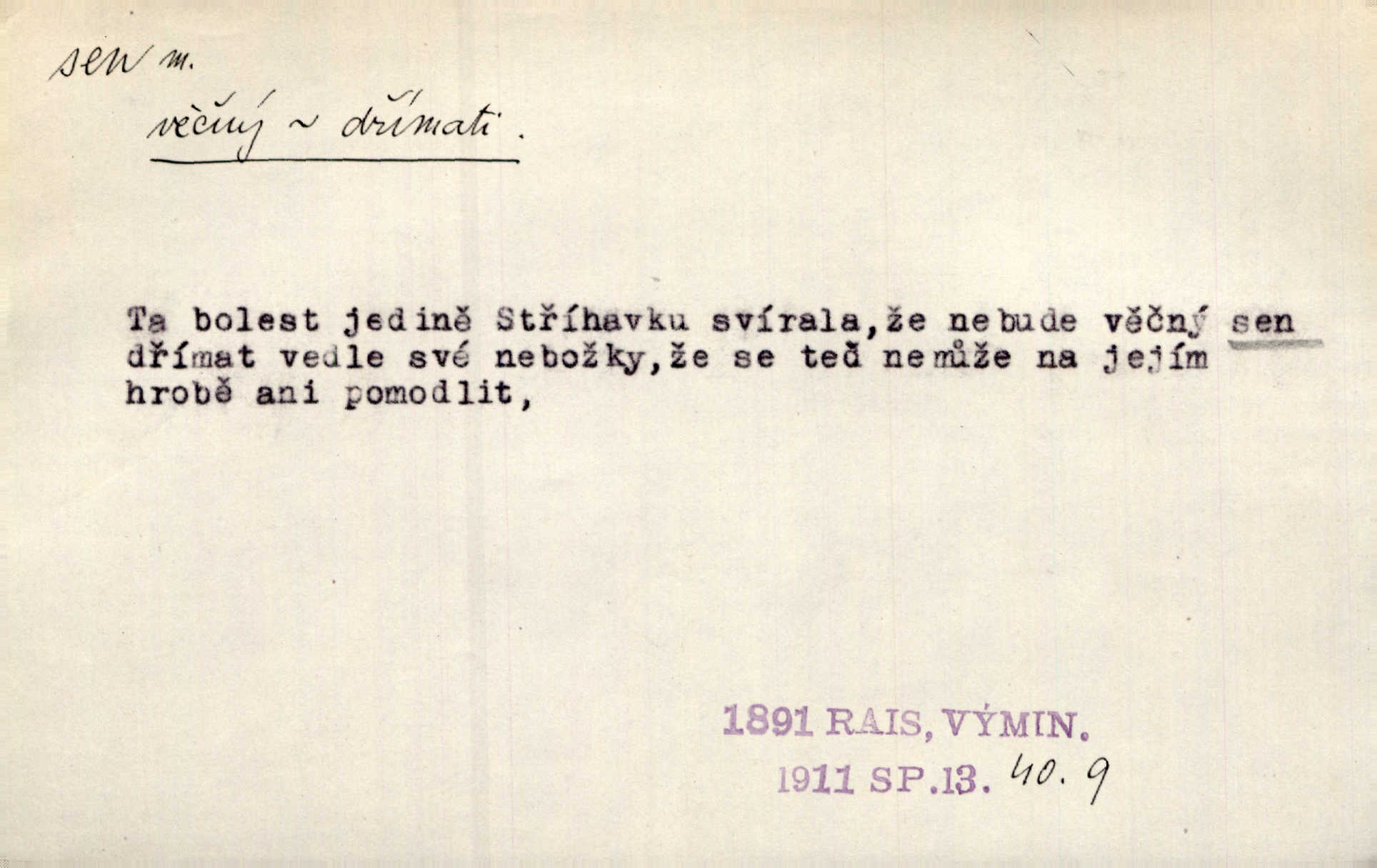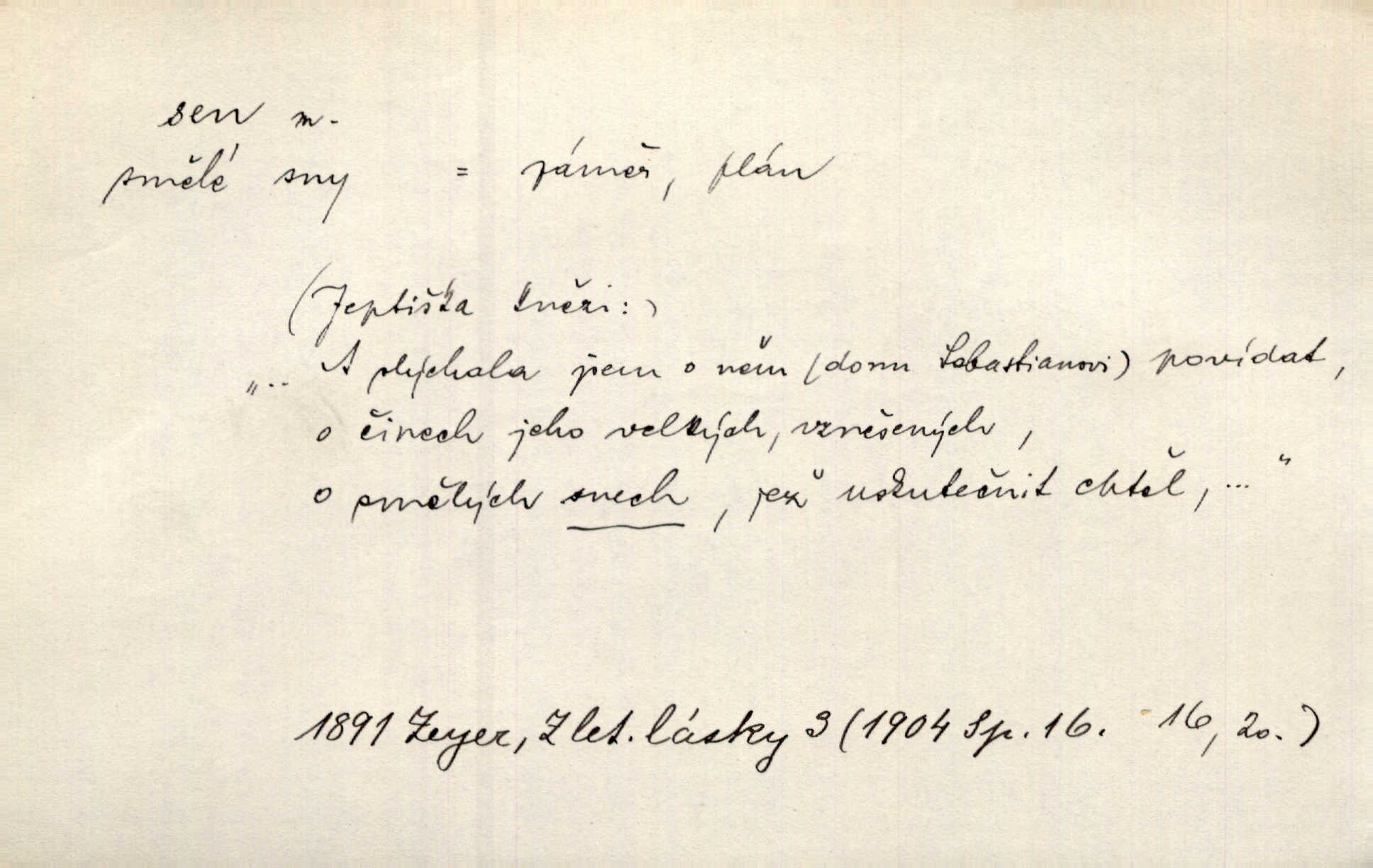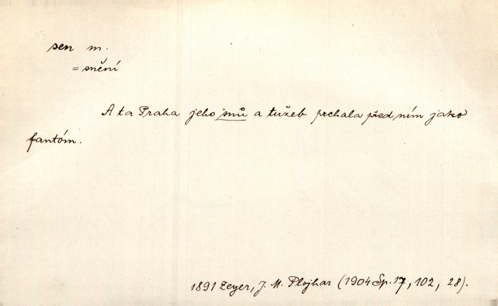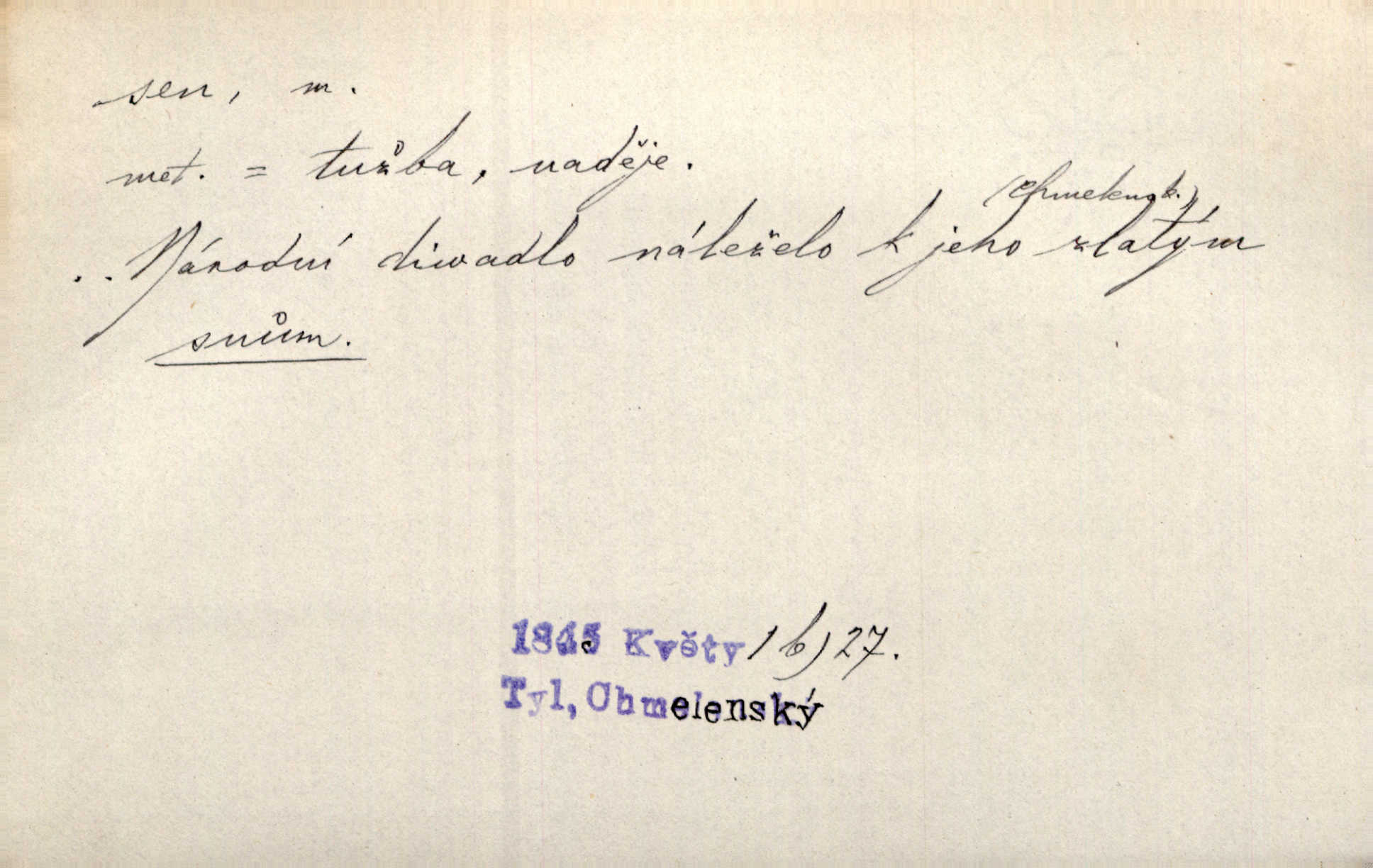 - sen, snu m. (2. sg. ve spoj. ze sna, 6. pl. též ve snách) poněk. kniž. spánek (op. bdění). Nežli by napočítal deset, spal jsem už snem spravedlivých. Kos. Nic už netísnilo tichý, zdravý jeho sen. V. Mrš. Zde odpočinu v pevném snu po dnešní pouti. Mácha. Bavívali se mezi sebou a zapuzovali tak sen. Šmil. Babička a vnuk spali, ale Irenu míjel sen. Jir. Zavřel oči a chtěl spát, ale po snu nebylo památky. Rais. Drůbež v hustých jejich [štěpů] korunách ze sna se pohnula. Rais. Ta bolest Stříhavku svírala, že nebude věčný sen dřímat vedle své nebožky že nebude pochován. Rais. Přen. V krajinu tichou kráčí sen. Mácha. Kolem ve snu dřímá luh i sad. Jan. Zasvitlo ráno, ze sna probudil se sad. Štulc. Vše dřímalo železným snem v náručí tuhého mrazu. Zey. Když byl již Přemysl vysoko v letech, usnul snem smrti zemřel. Jir. D bezděčné vybavování představ a prožívání dějů ve spánku; obrazy n. děje ve spánku viděné. Noc co noc spím krásně a beze sna. K. Čap. Ve snech se vyskytují nejčastěji dojmy zrakové. OSN Dod. Já měla zlý té noci sen: Nechoď dceruško k vodě ven. Erb. Jen zavřela oči, už se jí pletly sny, o bratru, o faráři. Jir. Voral i ve snu vídal ten dlouhý pás svých polí. Rais. Celou noc mluvil ze sna. Svět. K tvému otci přišel ve snách sv. Petr? Hol. Jdi, bláhová! Což na sny věříš? Špind. Vše tlačilo se k slunci ven, že snilo sen tak dlouhý. Hál. Jako po živém snu prochvívaly mu myslí ještě včerejší dojmy. Jir. Bylo mu, jakoby se probíral z ošklivého sna nepříjemně. Herb. Žil jako ve snu, v krásném, kypícím snu krásně, idylicky. Maj. Chodí jako ve snách a kale nemluví jako mátoha. Rais. Jako ve snách pamatoval se na popis krajiny neurčitě. Pfleg. Jako ve snu viděla jsem, že mne bral někdo do náručí ne v plném vědomí. Něm. Krásné to zjevení zmizelo jako sen rychle. Zey. Jemu ani ve snu nenapadlo, že by se vůbec kdy mohl mýlit vůbec ne. Klost. Něco takového matce Kulichové ani ve snách nepřipadlo. Herrm. D představa, kterou si někdo o něčem n. o někom vytvořil bez ohledu na skutečnost, výtvor obrazotvornosti, iluse, vidina; snění, blouznění, dumání. Nechoď vůbec do Athén, je-li ti milý sen! Ner. Nechme je doufati, neberme jim ten krásný sen! Rub. Snem se blažila, nebo skutečnost byla tak smutná. Jir. On viděl, za snem že byl putoval hned od počátku svého života. Zey. [Člověk] utíká se k blouznivým snům a vzpomínkám na doby lepší. V. Mrš. [Zeyer] uchyloval se do nádherných svých snů. V. Mrš. A ta Praha jeho snů a tužeb prchala před ním jako fantóm. Zey. Nikdy jí nebyla obrazotvornost její sny živé předváděla. Ner. On zase má své náboženské sny. J. z Hv. [Aleš] sen své duše podává, tedy vnitřní pravdu kreslí. V. Mrš. D vroucí, toužebné přání, těžko splnitelná n. dostupná tužba, naděje, plán. [Básník] mohl realisovati svůj dávný sen. Kar. Teď čte najednou, že se má splnit jeho krásný sen — rolnická škola. Baar. Národní divadlo náleželo k jeho (Chmelenského) zlatým snům. Tyl. A slýchala jsem o něm povídat, o smělých snech, jež uskutečnit chtěl. Zey. Rozhovořil se o svých snech a plánech. Hlad. Musil se rozloučiti se sny o výnosném místě. Jir. Kochala se v blahých snech, o jichž uskutečnění nepochybovala. Něm. D něco neskutečně krásného, prchavého, pomíjivého. Ten lásky sen, jak krásný byl. Sab. Žiltě [Hálek] v růžovém snu své první lásky. Jir. V života sen byl jsem já snad jen vyváben. Mácha. Jeho řeč, ať byla podstatná, ať pouhý sen, se šířila po celém kraji. Zey.