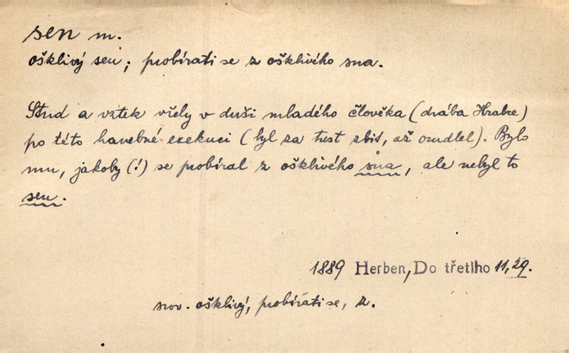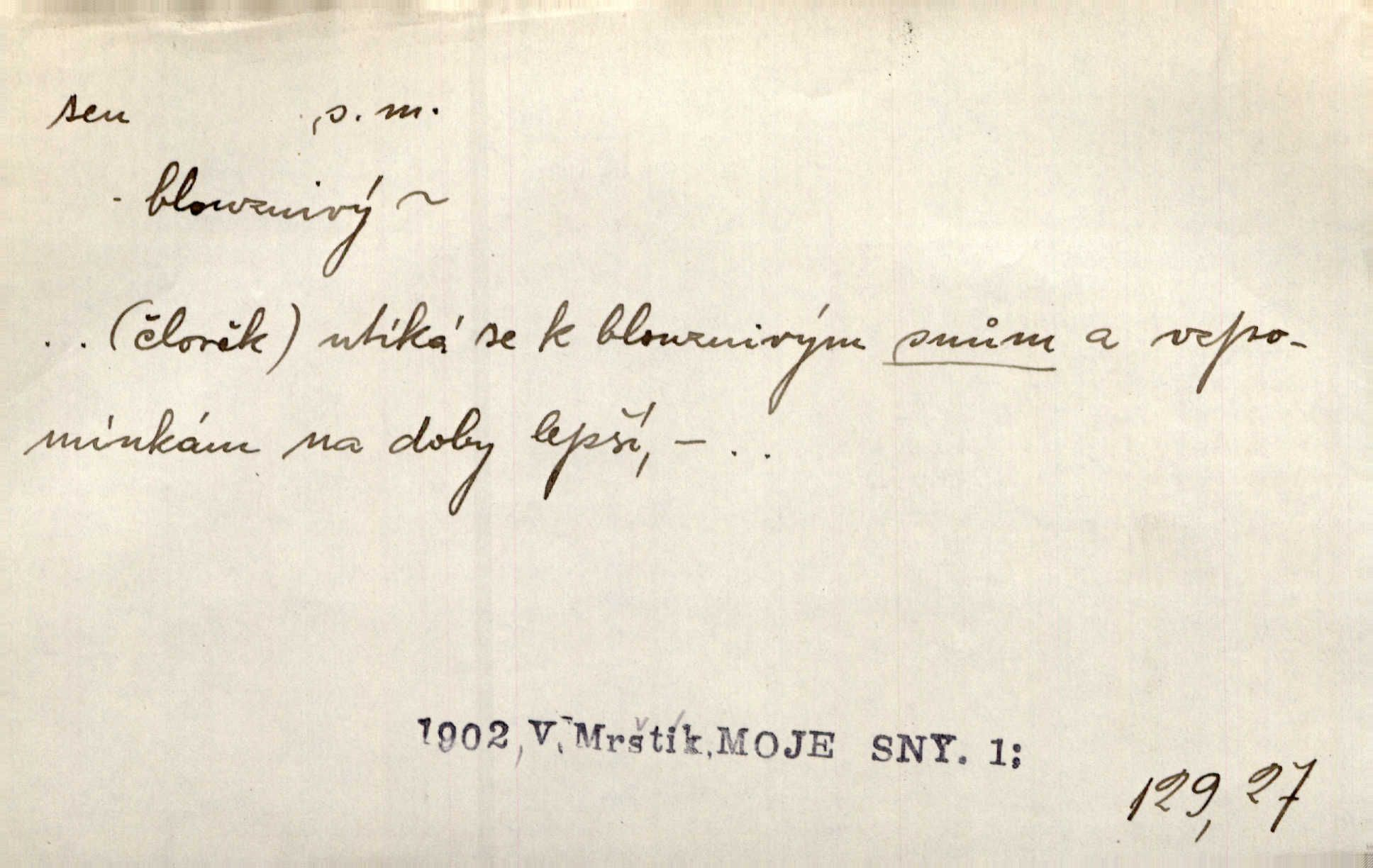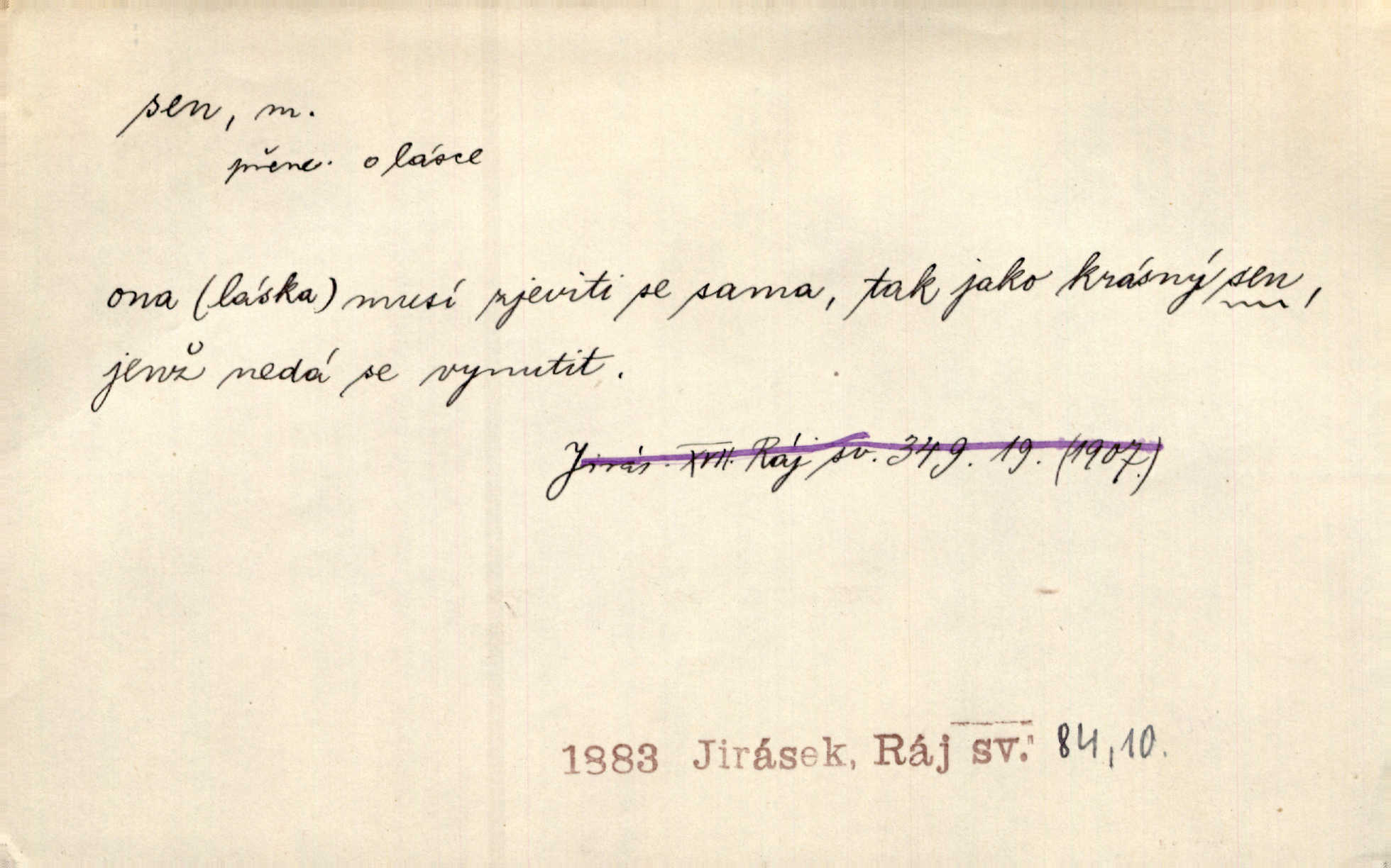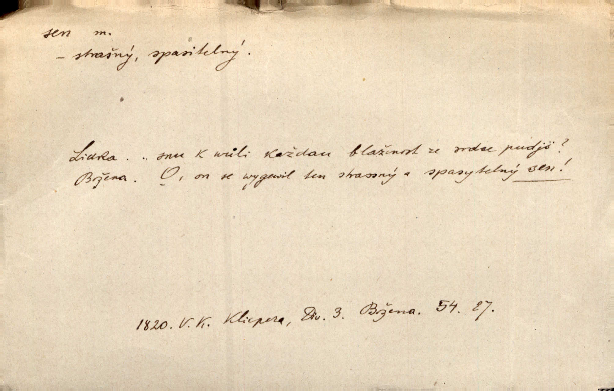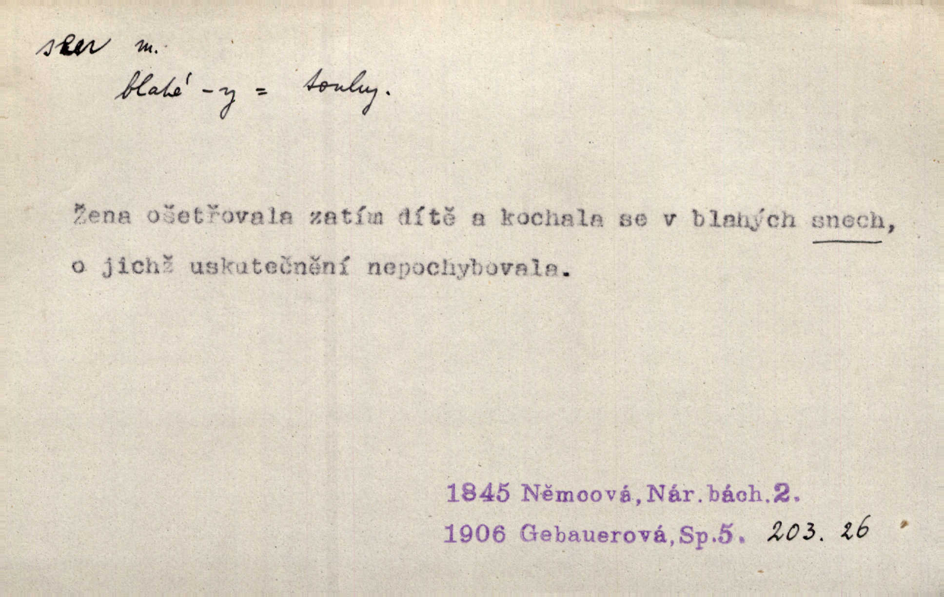 - sen, snu m. (2. sg. ve spoj. ze sna, 6. pl. též ve snách) poněk. kniž. spánek (op. bdění). Nežli by napočítal deset, spal jsem už snem spravedlivých. Kos. Nic už netísnilo tichý, zdravý jeho sen. V. Mrš. Zde odpočinu v pevném snu po dnešní pouti. Mácha. Bavívali se mezi sebou a zapuzovali tak sen. Šmil. Babička a vnuk spali, ale Irenu míjel sen. Jir. Zavřel oči a chtěl spát, ale po snu nebylo památky. Rais. Drůbež v hustých jejich [štěpů] korunách ze sna se pohnula. Rais. Ta bolest Stříhavku svírala, že nebude věčný sen dřímat vedle své nebožky že nebude pochován. Rais. Přen. V krajinu tichou kráčí sen. Mácha. Kolem ve snu dřímá luh i sad. Jan. Zasvitlo ráno, ze sna probudil se sad. Štulc. Vše dřímalo železným snem v náručí tuhého mrazu. Zey. Když byl již Přemysl vysoko v letech, usnul snem smrti zemřel. Jir. D bezděčné vybavování představ a prožívání dějů ve spánku; obrazy n. děje ve spánku viděné. Noc co noc spím krásně a beze sna. K. Čap. Ve snech se vyskytují nejčastěji dojmy zrakové. OSN Dod. Já měla zlý té noci sen: Nechoď dceruško k vodě ven. Erb. Jen zavřela oči, už se jí pletly sny, o bratru, o faráři. Jir. Voral i ve snu vídal ten dlouhý pás svých polí. Rais. Celou noc mluvil ze sna. Svět. K tvému otci přišel ve snách sv. Petr? Hol. Jdi, bláhová! Což na sny věříš? Špind. Vše tlačilo se k slunci ven, že snilo sen tak dlouhý. Hál. Jako po živém snu prochvívaly mu myslí ještě včerejší dojmy. Jir. Bylo mu, jakoby se probíral z ošklivého sna nepříjemně. Herb. Žil jako ve snu, v krásném, kypícím snu krásně, idylicky. Maj. Chodí jako ve snách a kale nemluví jako mátoha. Rais. Jako ve snách pamatoval se na popis krajiny neurčitě. Pfleg. Jako ve snu viděla jsem, že mne bral někdo do náručí ne v plném vědomí. Něm. Krásné to zjevení zmizelo jako sen rychle. Zey. Jemu ani ve snu nenapadlo, že by se vůbec kdy mohl mýlit vůbec ne. Klost. Něco takového matce Kulichové ani ve snách nepřipadlo. Herrm. D představa, kterou si někdo o něčem n. o někom vytvořil bez ohledu na skutečnost, výtvor obrazotvornosti, iluse, vidina; snění, blouznění, dumání. Nechoď vůbec do Athén, je-li ti milý sen! Ner. Nechme je doufati, neberme jim ten krásný sen! Rub. Snem se blažila, nebo skutečnost byla tak smutná. Jir. On viděl, za snem že byl putoval hned od počátku svého života. Zey. [Člověk] utíká se k blouznivým snům a vzpomínkám na doby lepší. V. Mrš. [Zeyer] uchyloval se do nádherných svých snů. V. Mrš. A ta Praha jeho snů a tužeb prchala před ním jako fantóm. Zey. Nikdy jí nebyla obrazotvornost její sny živé předváděla. Ner. On zase má své náboženské sny. J. z Hv. [Aleš] sen své duše podává, tedy vnitřní pravdu kreslí. V. Mrš. D vroucí, toužebné přání, těžko splnitelná n. dostupná tužba, naděje, plán. [Básník] mohl realisovati svůj dávný sen. Kar. Teď čte najednou, že se má splnit jeho krásný sen — rolnická škola. Baar. Národní divadlo náleželo k jeho (Chmelenského) zlatým snům. Tyl. A slýchala jsem o něm povídat, o smělých snech, jež uskutečnit chtěl. Zey. Rozhovořil se o svých snech a plánech. Hlad. Musil se rozloučiti se sny o výnosném místě. Jir. Kochala se v blahých snech, o jichž uskutečnění nepochybovala. Něm. D něco neskutečně krásného, prchavého, pomíjivého. Ten lásky sen, jak krásný byl. Sab. Žiltě [Hálek] v růžovém snu své první lásky. Jir. V života sen byl jsem já snad jen vyváben. Mácha. Jeho řeč, ať byla podstatná, ať pouhý sen, se šířila po celém kraji. Zey.