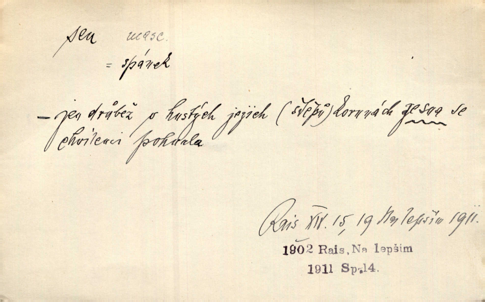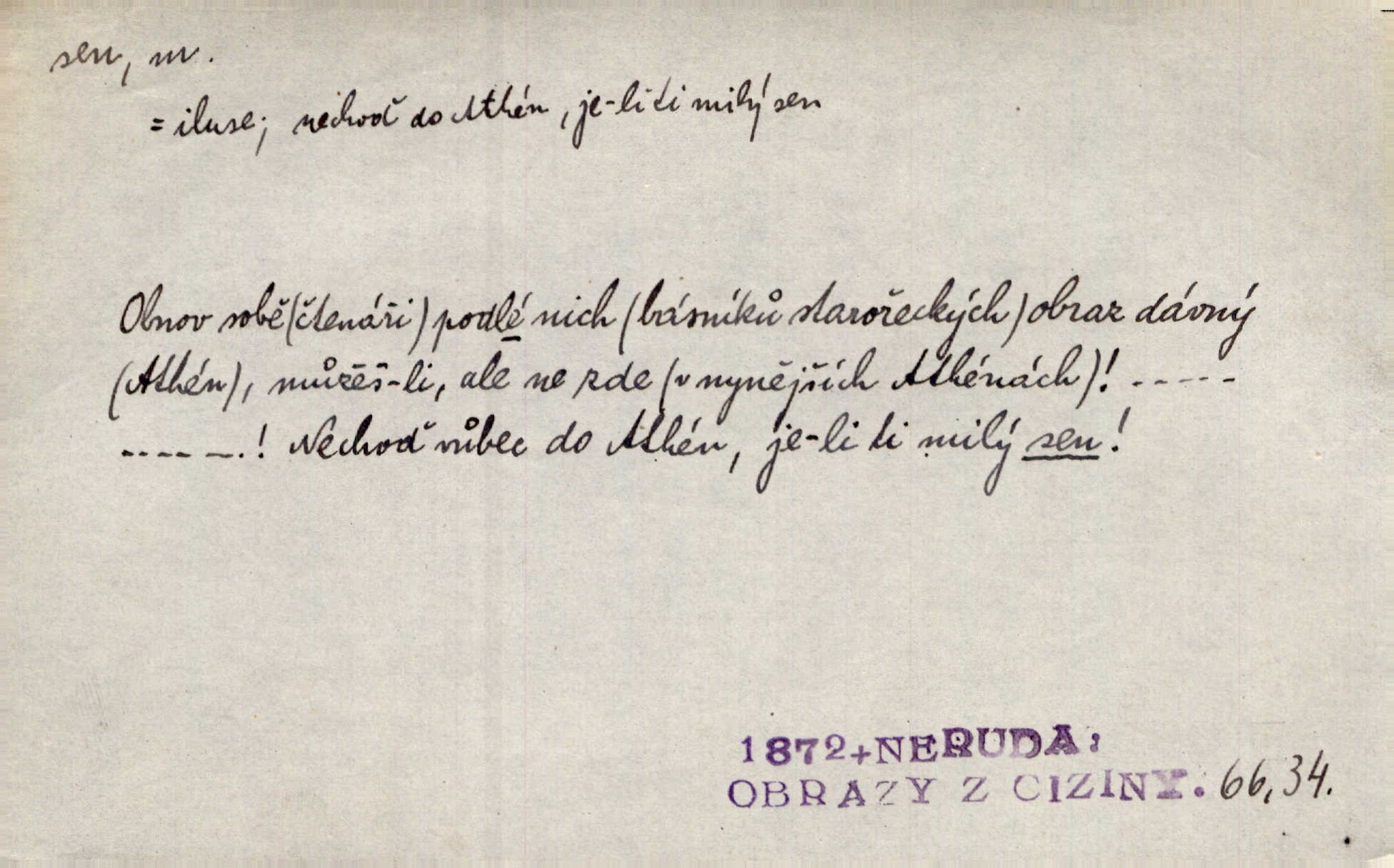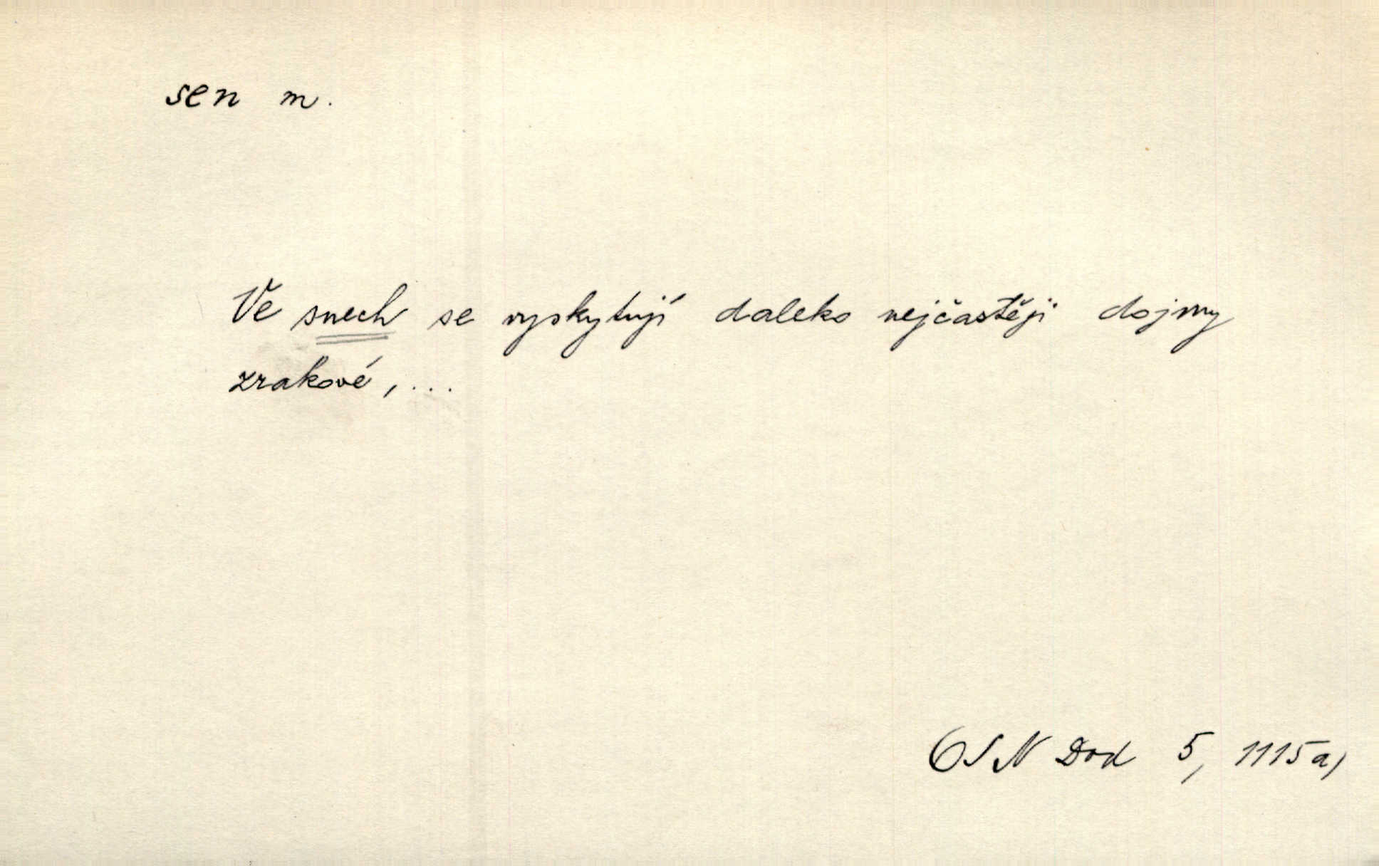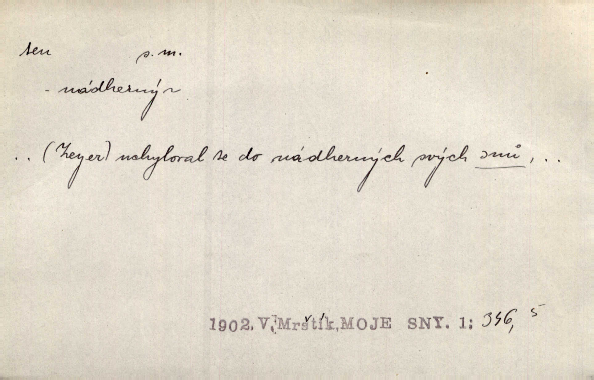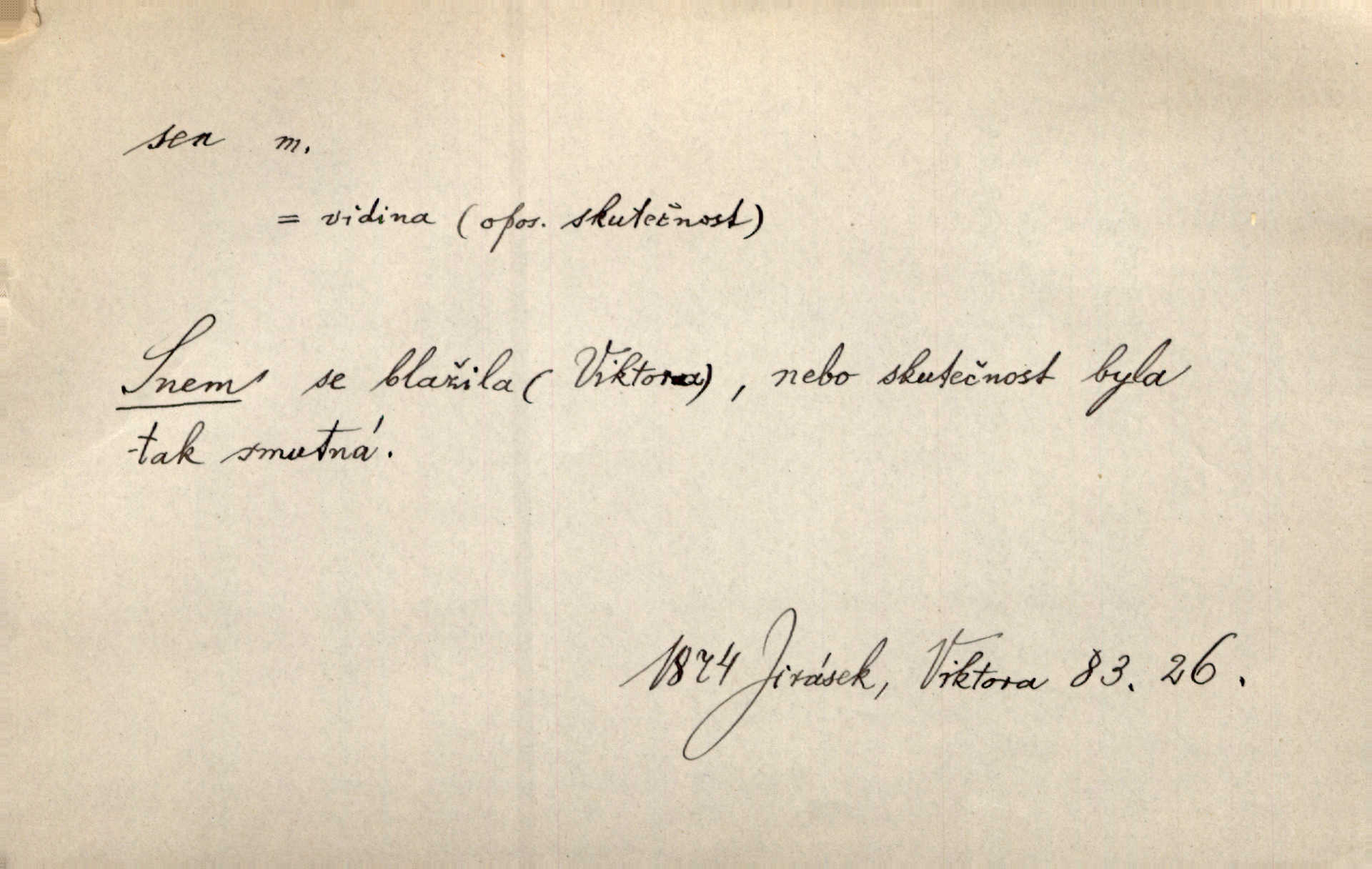 - sen, snu m. (2. sg. ve spoj. ze sna, 6. pl. též ve snách) poněk. kniž. spánek (op. bdění). Nežli by napočítal deset, spal jsem už snem spravedlivých. Kos. Nic už netísnilo tichý, zdravý jeho sen. V. Mrš. Zde odpočinu v pevném snu po dnešní pouti. Mácha. Bavívali se mezi sebou a zapuzovali tak sen. Šmil. Babička a vnuk spali, ale Irenu míjel sen. Jir. Zavřel oči a chtěl spát, ale po snu nebylo památky. Rais. Drůbež v hustých jejich [štěpů] korunách ze sna se pohnula. Rais. Ta bolest Stříhavku svírala, že nebude věčný sen dřímat vedle své nebožky že nebude pochován. Rais. Přen. V krajinu tichou kráčí sen. Mácha. Kolem ve snu dřímá luh i sad. Jan. Zasvitlo ráno, ze sna probudil se sad. Štulc. Vše dřímalo železným snem v náručí tuhého mrazu. Zey. Když byl již Přemysl vysoko v letech, usnul snem smrti zemřel. Jir. D bezděčné vybavování představ a prožívání dějů ve spánku; obrazy n. děje ve spánku viděné. Noc co noc spím krásně a beze sna. K. Čap. Ve snech se vyskytují nejčastěji dojmy zrakové. OSN Dod. Já měla zlý té noci sen: Nechoď dceruško k vodě ven. Erb. Jen zavřela oči, už se jí pletly sny, o bratru, o faráři. Jir. Voral i ve snu vídal ten dlouhý pás svých polí. Rais. Celou noc mluvil ze sna. Svět. K tvému otci přišel ve snách sv. Petr? Hol. Jdi, bláhová! Což na sny věříš? Špind. Vše tlačilo se k slunci ven, že snilo sen tak dlouhý. Hál. Jako po živém snu prochvívaly mu myslí ještě včerejší dojmy. Jir. Bylo mu, jakoby se probíral z ošklivého sna nepříjemně. Herb. Žil jako ve snu, v krásném, kypícím snu krásně, idylicky. Maj. Chodí jako ve snách a kale nemluví jako mátoha. Rais. Jako ve snách pamatoval se na popis krajiny neurčitě. Pfleg. Jako ve snu viděla jsem, že mne bral někdo do náručí ne v plném vědomí. Něm. Krásné to zjevení zmizelo jako sen rychle. Zey. Jemu ani ve snu nenapadlo, že by se vůbec kdy mohl mýlit vůbec ne. Klost. Něco takového matce Kulichové ani ve snách nepřipadlo. Herrm. D představa, kterou si někdo o něčem n. o někom vytvořil bez ohledu na skutečnost, výtvor obrazotvornosti, iluse, vidina; snění, blouznění, dumání. Nechoď vůbec do Athén, je-li ti milý sen! Ner. Nechme je doufati, neberme jim ten krásný sen! Rub. Snem se blažila, nebo skutečnost byla tak smutná. Jir. On viděl, za snem že byl putoval hned od počátku svého života. Zey. [Člověk] utíká se k blouznivým snům a vzpomínkám na doby lepší. V. Mrš. [Zeyer] uchyloval se do nádherných svých snů. V. Mrš. A ta Praha jeho snů a tužeb prchala před ním jako fantóm. Zey. Nikdy jí nebyla obrazotvornost její sny živé předváděla. Ner. On zase má své náboženské sny. J. z Hv. [Aleš] sen své duše podává, tedy vnitřní pravdu kreslí. V. Mrš. D vroucí, toužebné přání, těžko splnitelná n. dostupná tužba, naděje, plán. [Básník] mohl realisovati svůj dávný sen. Kar. Teď čte najednou, že se má splnit jeho krásný sen — rolnická škola. Baar. Národní divadlo náleželo k jeho (Chmelenského) zlatým snům. Tyl. A slýchala jsem o něm povídat, o smělých snech, jež uskutečnit chtěl. Zey. Rozhovořil se o svých snech a plánech. Hlad. Musil se rozloučiti se sny o výnosném místě. Jir. Kochala se v blahých snech, o jichž uskutečnění nepochybovala. Něm. D něco neskutečně krásného, prchavého, pomíjivého. Ten lásky sen, jak krásný byl. Sab. Žiltě [Hálek] v růžovém snu své první lásky. Jir. V života sen byl jsem já snad jen vyváben. Mácha. Jeho řeč, ať byla podstatná, ať pouhý sen, se šířila po celém kraji. Zey.