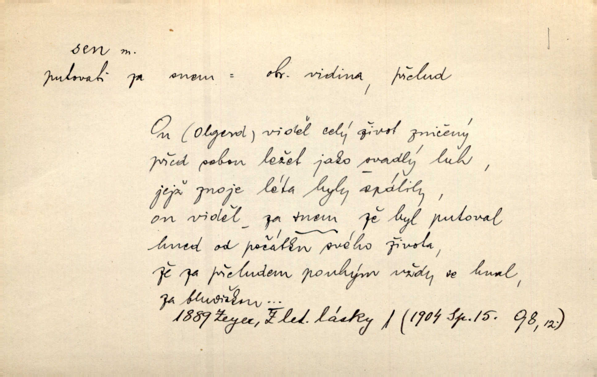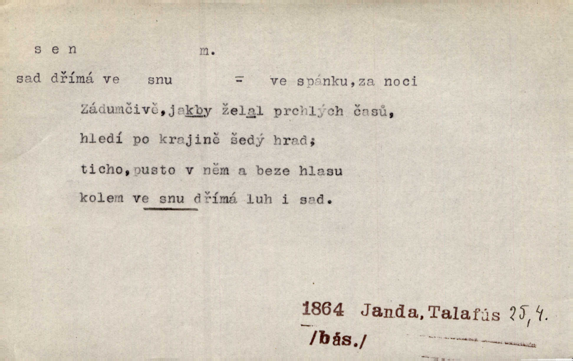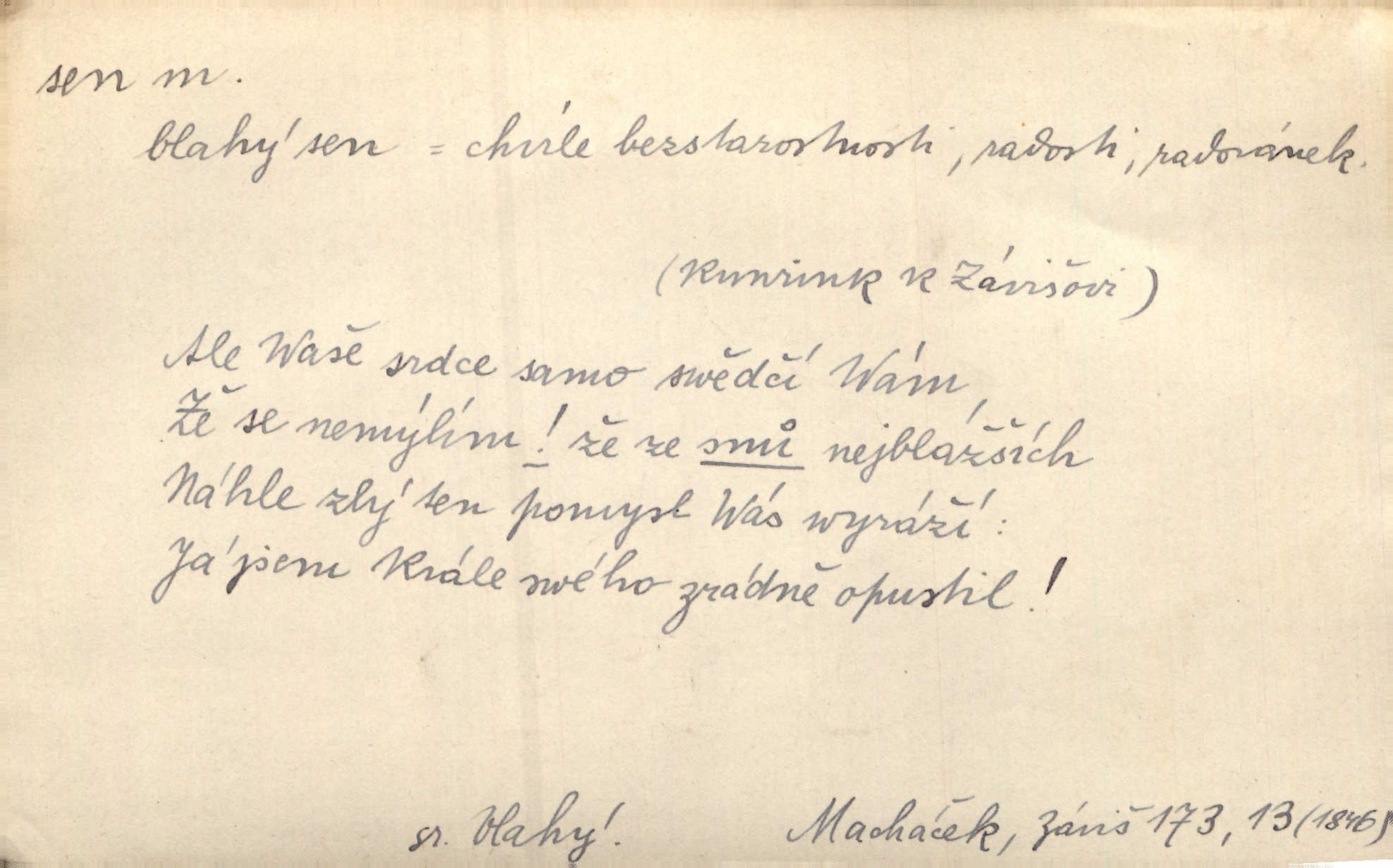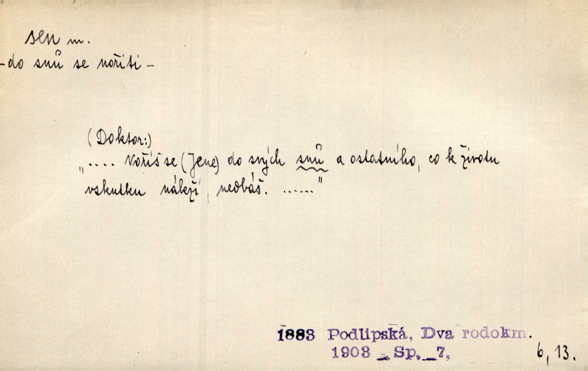 - sen, snu m. (2. sg. ve spoj. ze sna, 6. pl. též ve snách) poněk. kniž. spánek (op. bdění). Nežli by napočítal deset, spal jsem už snem spravedlivých. Kos. Nic už netísnilo tichý, zdravý jeho sen. V. Mrš. Zde odpočinu v pevném snu po dnešní pouti. Mácha. Bavívali se mezi sebou a zapuzovali tak sen. Šmil. Babička a vnuk spali, ale Irenu míjel sen. Jir. Zavřel oči a chtěl spát, ale po snu nebylo památky. Rais. Drůbež v hustých jejich [štěpů] korunách ze sna se pohnula. Rais. Ta bolest Stříhavku svírala, že nebude věčný sen dřímat vedle své nebožky že nebude pochován. Rais. Přen. V krajinu tichou kráčí sen. Mácha. Kolem ve snu dřímá luh i sad. Jan. Zasvitlo ráno, ze sna probudil se sad. Štulc. Vše dřímalo železným snem v náručí tuhého mrazu. Zey. Když byl již Přemysl vysoko v letech, usnul snem smrti zemřel. Jir. D bezděčné vybavování představ a prožívání dějů ve spánku; obrazy n. děje ve spánku viděné. Noc co noc spím krásně a beze sna. K. Čap. Ve snech se vyskytují nejčastěji dojmy zrakové. OSN Dod. Já měla zlý té noci sen: Nechoď dceruško k vodě ven. Erb. Jen zavřela oči, už se jí pletly sny, o bratru, o faráři. Jir. Voral i ve snu vídal ten dlouhý pás svých polí. Rais. Celou noc mluvil ze sna. Svět. K tvému otci přišel ve snách sv. Petr? Hol. Jdi, bláhová! Což na sny věříš? Špind. Vše tlačilo se k slunci ven, že snilo sen tak dlouhý. Hál. Jako po živém snu prochvívaly mu myslí ještě včerejší dojmy. Jir. Bylo mu, jakoby se probíral z ošklivého sna nepříjemně. Herb. Žil jako ve snu, v krásném, kypícím snu krásně, idylicky. Maj. Chodí jako ve snách a kale nemluví jako mátoha. Rais. Jako ve snách pamatoval se na popis krajiny neurčitě. Pfleg. Jako ve snu viděla jsem, že mne bral někdo do náručí ne v plném vědomí. Něm. Krásné to zjevení zmizelo jako sen rychle. Zey. Jemu ani ve snu nenapadlo, že by se vůbec kdy mohl mýlit vůbec ne. Klost. Něco takového matce Kulichové ani ve snách nepřipadlo. Herrm. D představa, kterou si někdo o něčem n. o někom vytvořil bez ohledu na skutečnost, výtvor obrazotvornosti, iluse, vidina; snění, blouznění, dumání. Nechoď vůbec do Athén, je-li ti milý sen! Ner. Nechme je doufati, neberme jim ten krásný sen! Rub. Snem se blažila, nebo skutečnost byla tak smutná. Jir. On viděl, za snem že byl putoval hned od počátku svého života. Zey. [Člověk] utíká se k blouznivým snům a vzpomínkám na doby lepší. V. Mrš. [Zeyer] uchyloval se do nádherných svých snů. V. Mrš. A ta Praha jeho snů a tužeb prchala před ním jako fantóm. Zey. Nikdy jí nebyla obrazotvornost její sny živé předváděla. Ner. On zase má své náboženské sny. J. z Hv. [Aleš] sen své duše podává, tedy vnitřní pravdu kreslí. V. Mrš. D vroucí, toužebné přání, těžko splnitelná n. dostupná tužba, naděje, plán. [Básník] mohl realisovati svůj dávný sen. Kar. Teď čte najednou, že se má splnit jeho krásný sen — rolnická škola. Baar. Národní divadlo náleželo k jeho (Chmelenského) zlatým snům. Tyl. A slýchala jsem o něm povídat, o smělých snech, jež uskutečnit chtěl. Zey. Rozhovořil se o svých snech a plánech. Hlad. Musil se rozloučiti se sny o výnosném místě. Jir. Kochala se v blahých snech, o jichž uskutečnění nepochybovala. Něm. D něco neskutečně krásného, prchavého, pomíjivého. Ten lásky sen, jak krásný byl. Sab. Žiltě [Hálek] v růžovém snu své první lásky. Jir. V života sen byl jsem já snad jen vyváben. Mácha. Jeho řeč, ať byla podstatná, ať pouhý sen, se šířila po celém kraji. Zey.