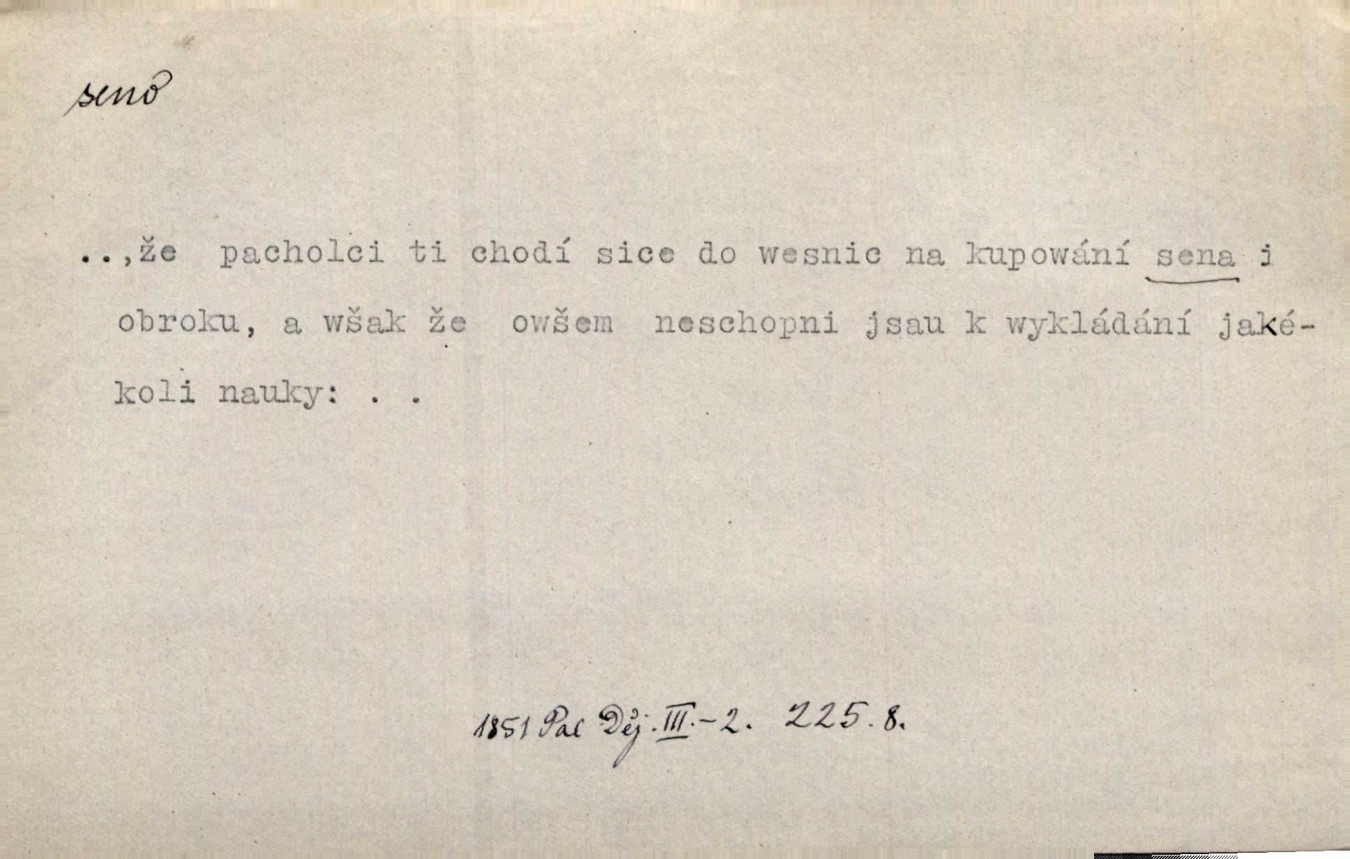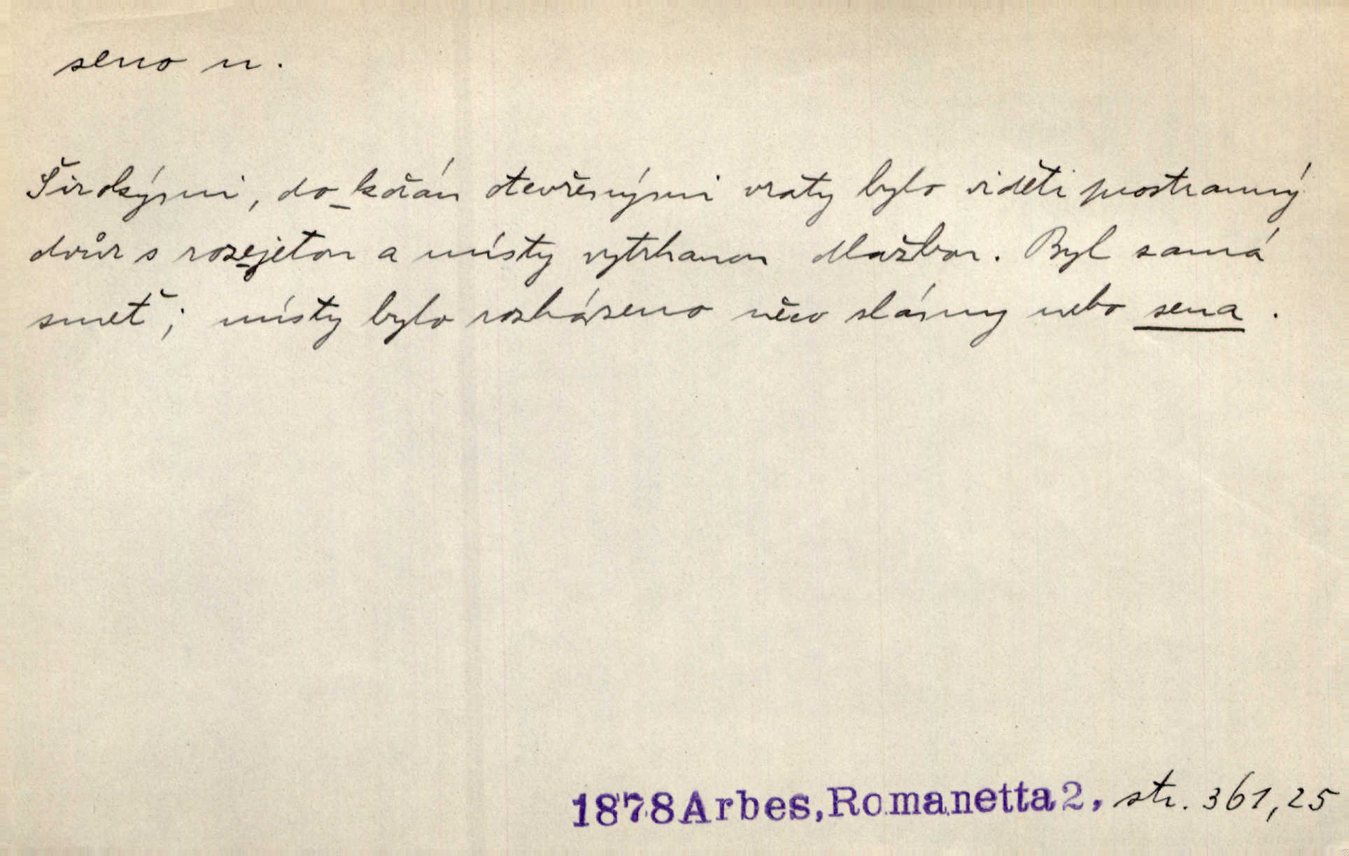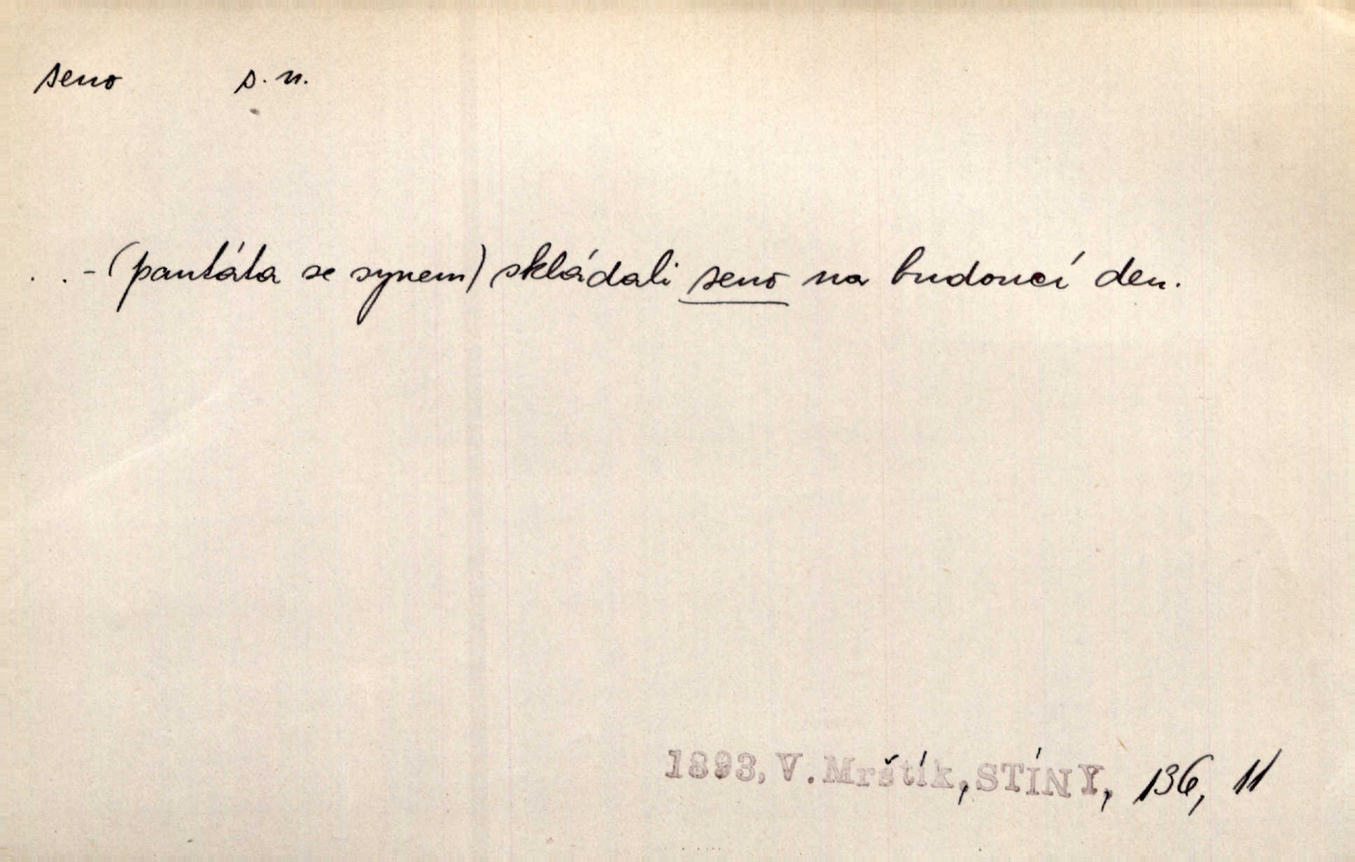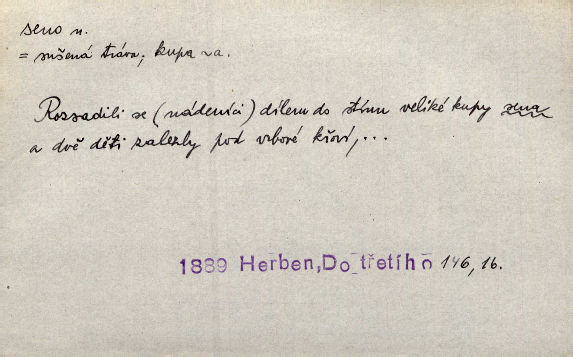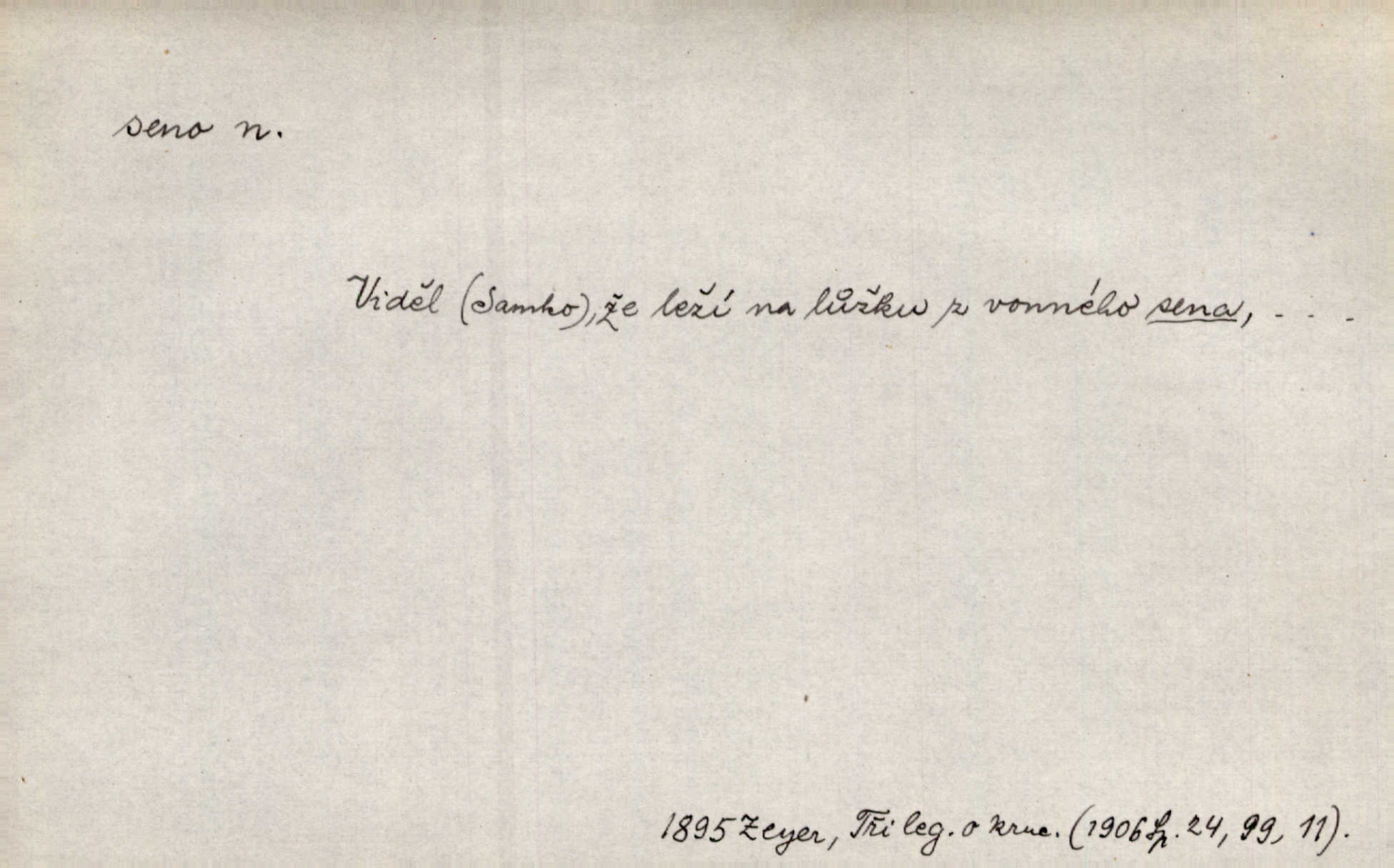 - seno, -a n. první sklizeň trávy na louce; vůbec usušená trava, píce. Druhý den vykázal jim král velkou louku, by ji pokosili, seno usušili a do kup urovnali. Něm. Posečenou trávu rozhazují, suší a večer dávají seno do kupek. Kronb. V poli na pasekách Vojta nakládal jetelové seno. Rais. Staré kobyle nasypal z koše sena. Rais. Spávaly na půdě na seně. Něm. Mohli byste v té knihovně udělati trochu nějaký pořádek. Je to tam všecko seno sláma v nepořádku, pomíchané. Kos. Bot. řecké seno rostlina z čeledi motýlokvětých, Trigonella foenum graecum. D sena, sen pl. n. (lok. v senách) práce spojené se sečením a sušením sena, senoseč; doba senoseče. V dolinách děvčata ještě dodělávaly sena. Čel. Musil na sena a na otavu s kosou. Svět. Počalo se dělat o senách. Rais. Nejkrásnější doba roční je kolem Jana Křtitele, v sena. Hol. Ovdověla selka Pernačka, které umřel muž v senách. Vrba.