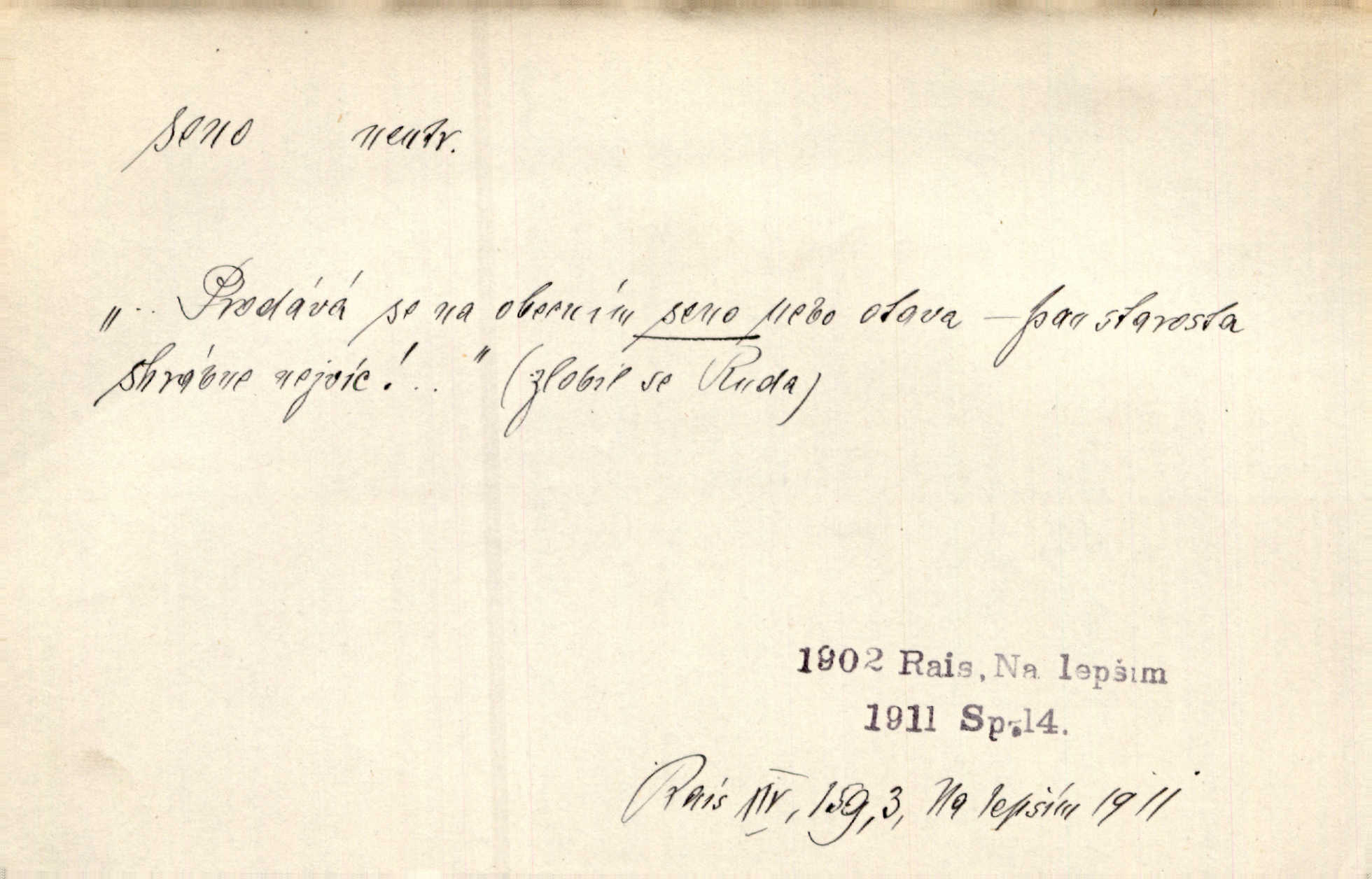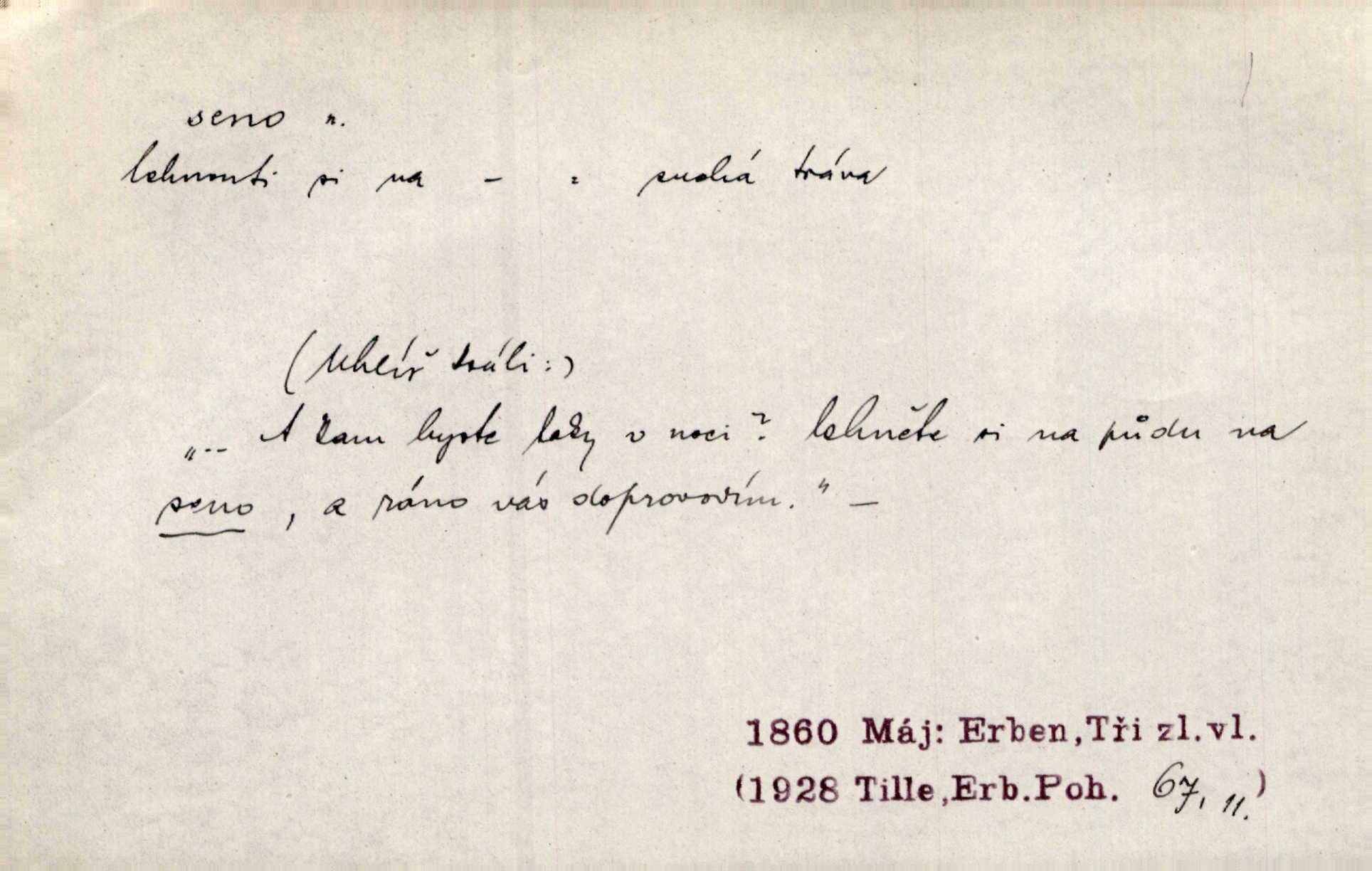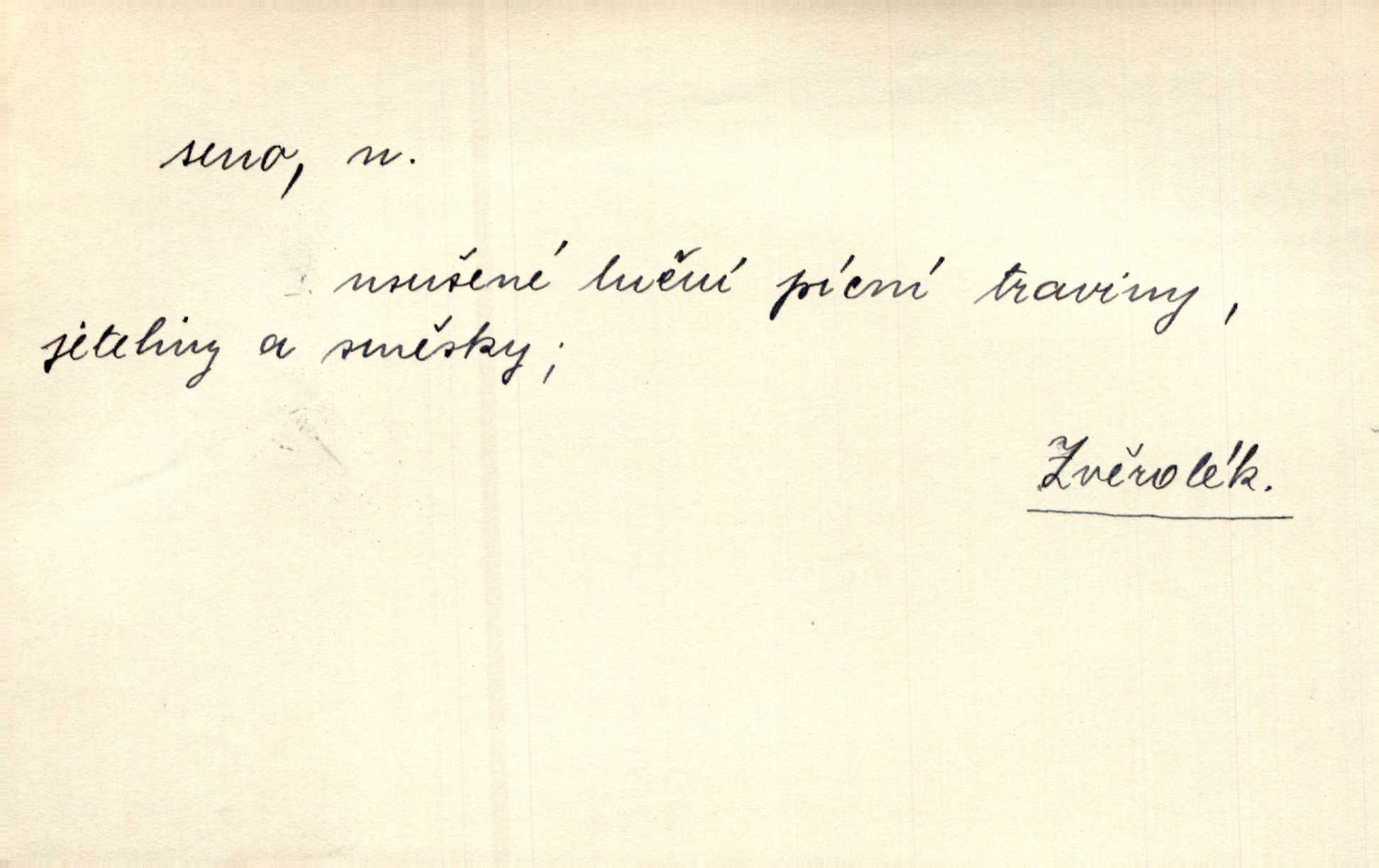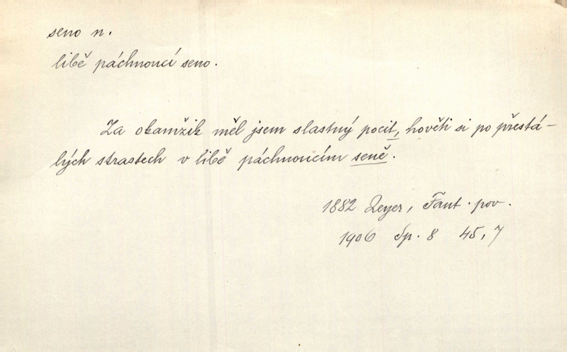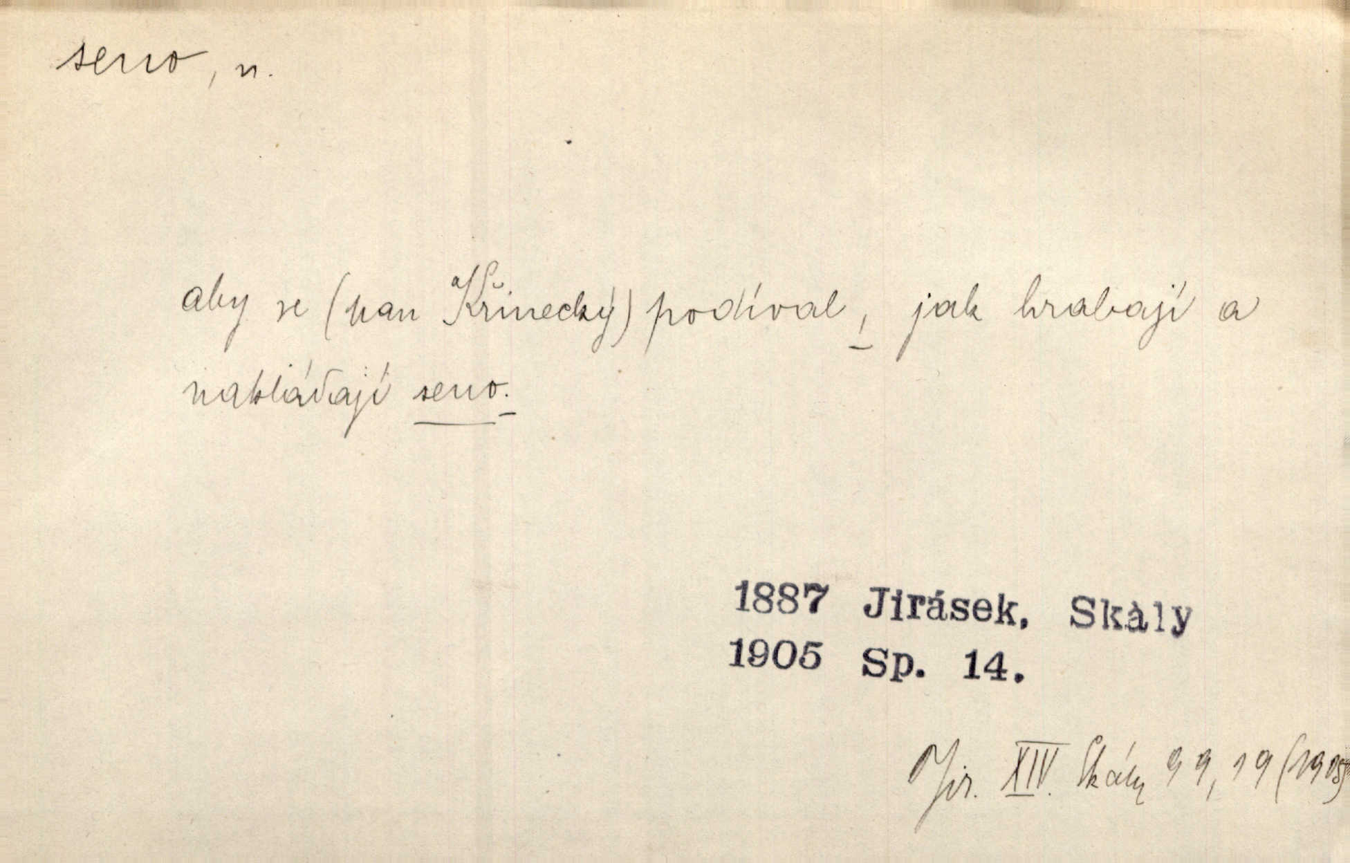 - seno, -a n. první sklizeň trávy na louce; vůbec usušená trava, píce. Druhý den vykázal jim král velkou louku, by ji pokosili, seno usušili a do kup urovnali. Něm. Posečenou trávu rozhazují, suší a večer dávají seno do kupek. Kronb. V poli na pasekách Vojta nakládal jetelové seno. Rais. Staré kobyle nasypal z koše sena. Rais. Spávaly na půdě na seně. Něm. Mohli byste v té knihovně udělati trochu nějaký pořádek. Je to tam všecko seno sláma v nepořádku, pomíchané. Kos. Bot. řecké seno rostlina z čeledi motýlokvětých, Trigonella foenum graecum. D sena, sen pl. n. (lok. v senách) práce spojené se sečením a sušením sena, senoseč; doba senoseče. V dolinách děvčata ještě dodělávaly sena. Čel. Musil na sena a na otavu s kosou. Svět. Počalo se dělat o senách. Rais. Nejkrásnější doba roční je kolem Jana Křtitele, v sena. Hol. Ovdověla selka Pernačka, které umřel muž v senách. Vrba.