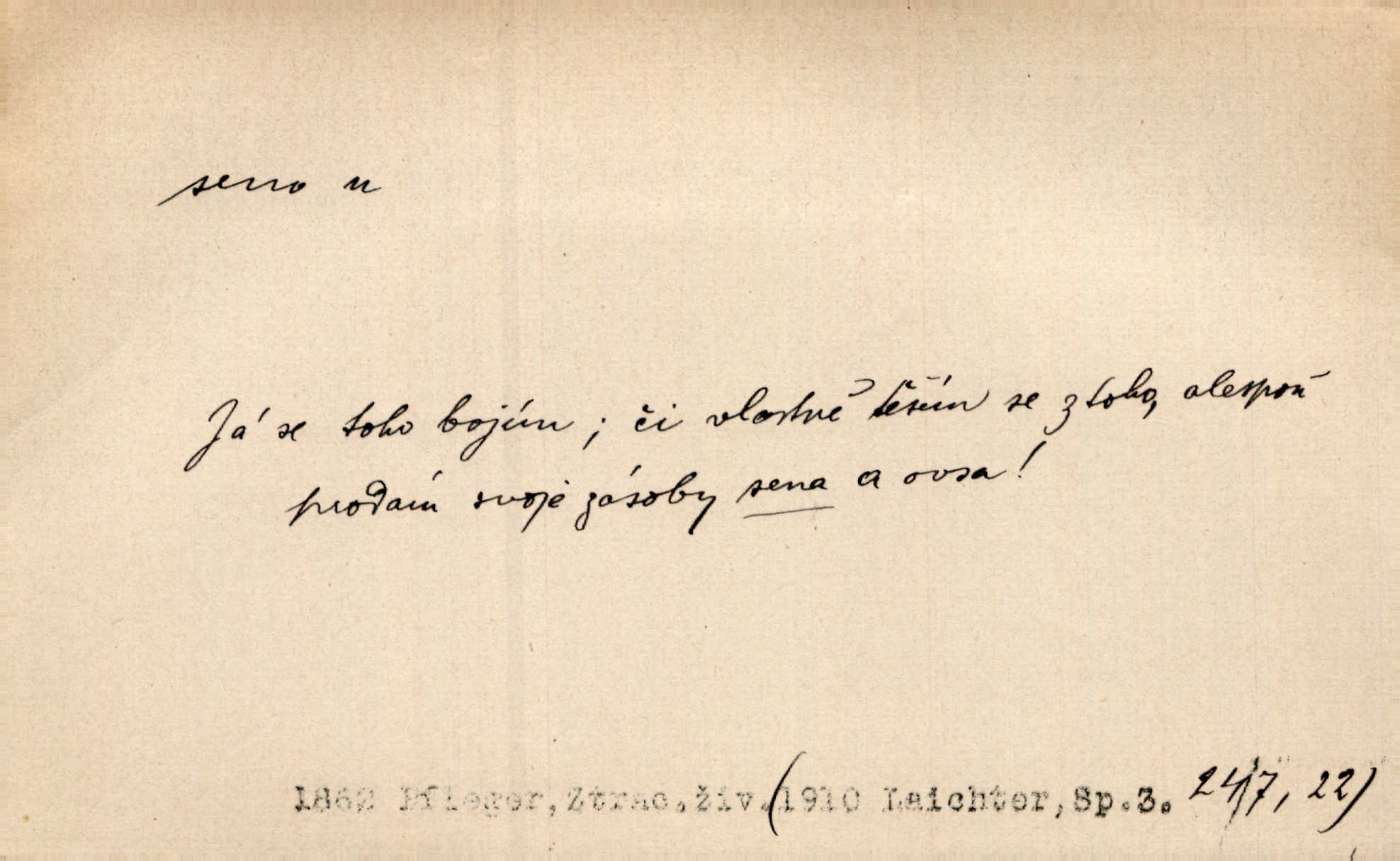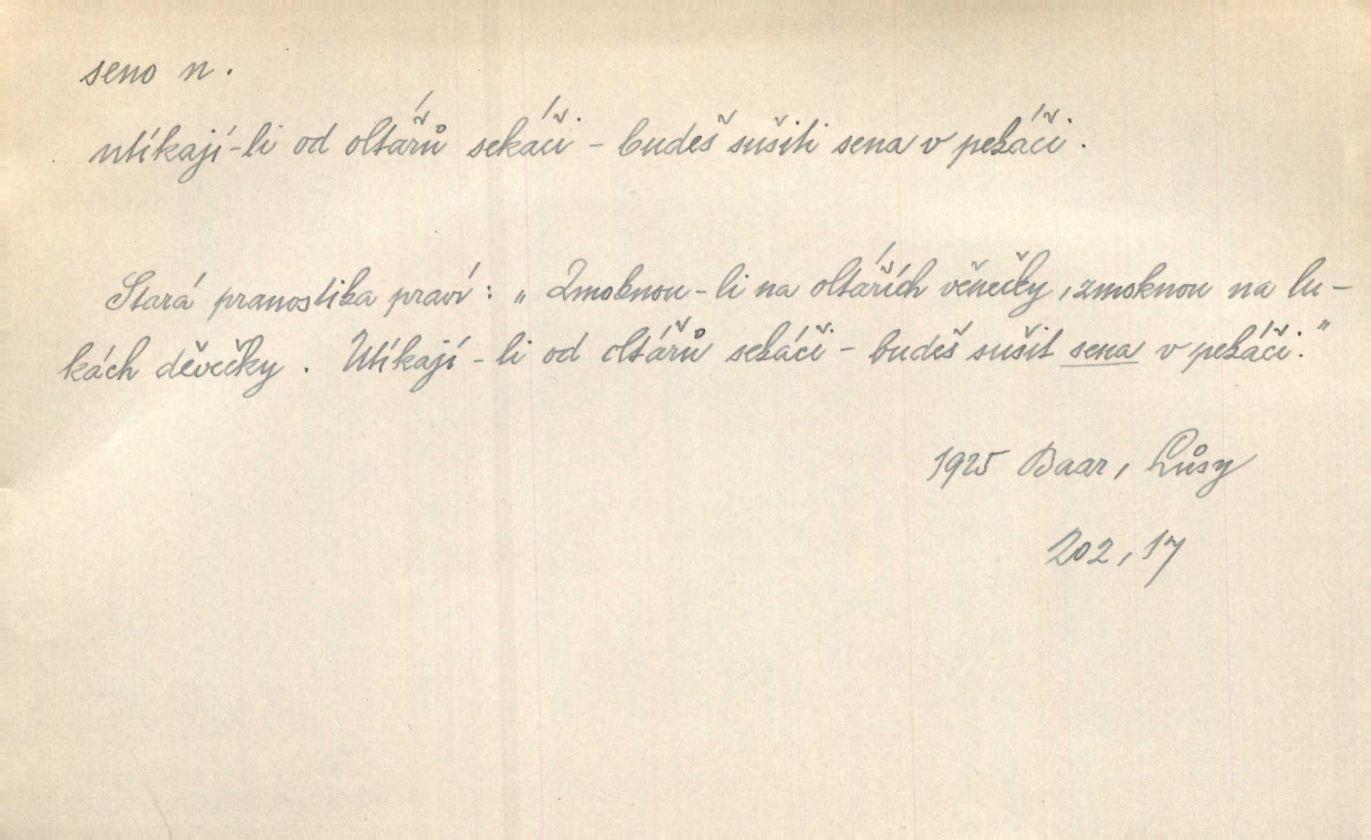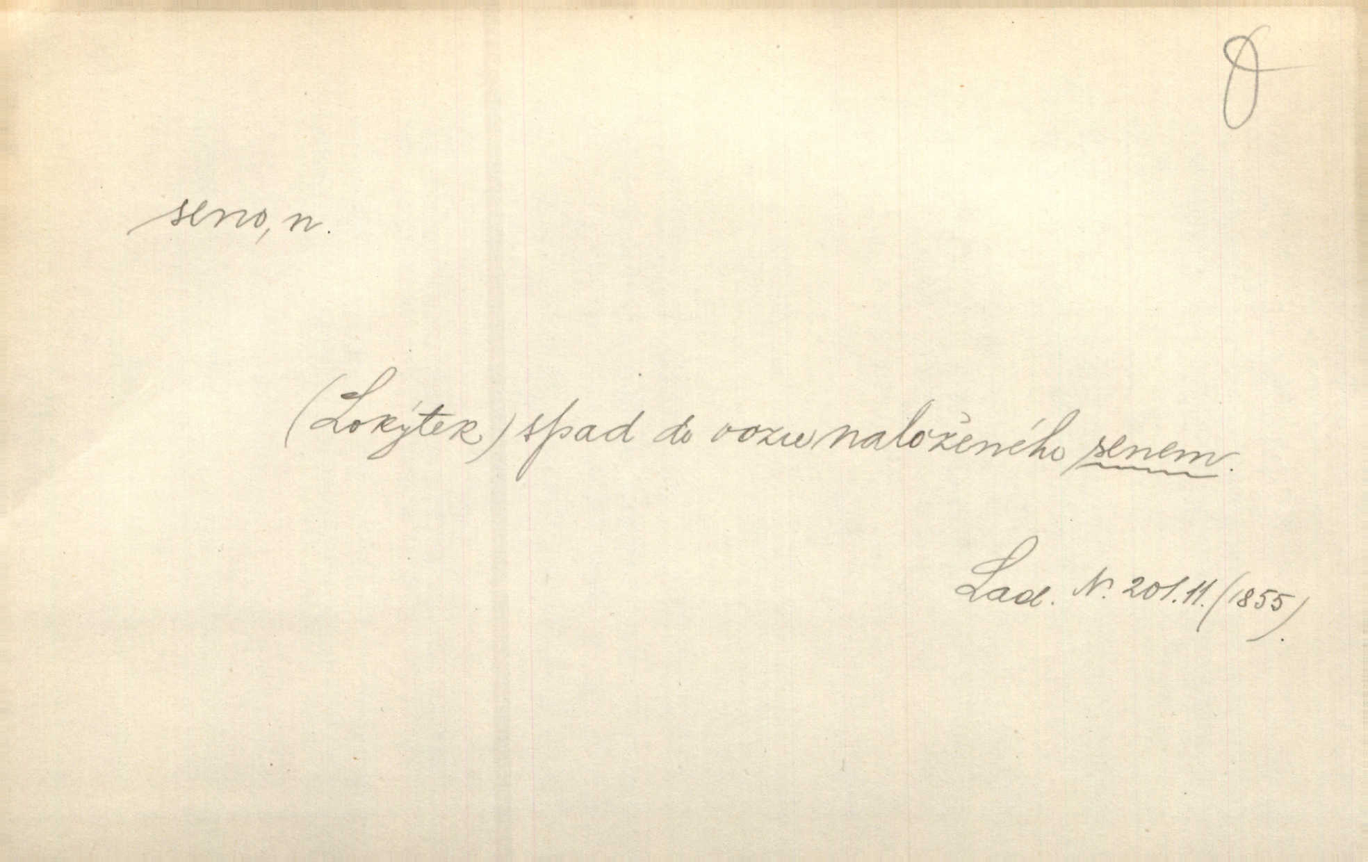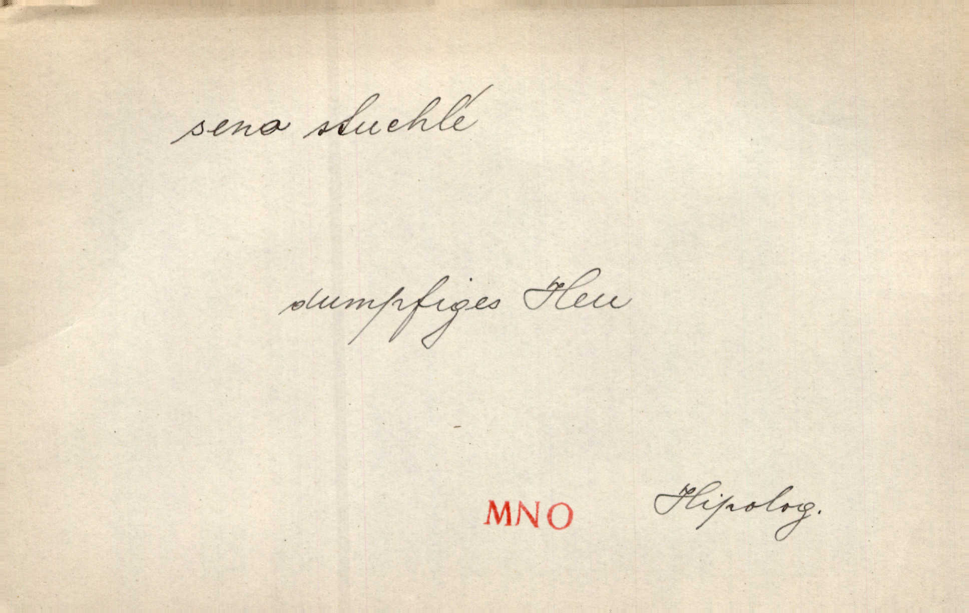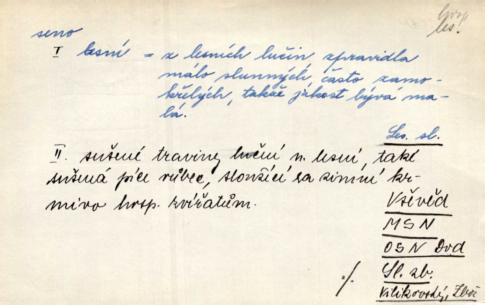 - seno, -a n. první sklizeň trávy na louce; vůbec usušená trava, píce. Druhý den vykázal jim král velkou louku, by ji pokosili, seno usušili a do kup urovnali. Něm. Posečenou trávu rozhazují, suší a večer dávají seno do kupek. Kronb. V poli na pasekách Vojta nakládal jetelové seno. Rais. Staré kobyle nasypal z koše sena. Rais. Spávaly na půdě na seně. Něm. Mohli byste v té knihovně udělati trochu nějaký pořádek. Je to tam všecko seno sláma v nepořádku, pomíchané. Kos. Bot. řecké seno rostlina z čeledi motýlokvětých, Trigonella foenum graecum. D sena, sen pl. n. (lok. v senách) práce spojené se sečením a sušením sena, senoseč; doba senoseče. V dolinách děvčata ještě dodělávaly sena. Čel. Musil na sena a na otavu s kosou. Svět. Počalo se dělat o senách. Rais. Nejkrásnější doba roční je kolem Jana Křtitele, v sena. Hol. Ovdověla selka Pernačka, které umřel muž v senách. Vrba.