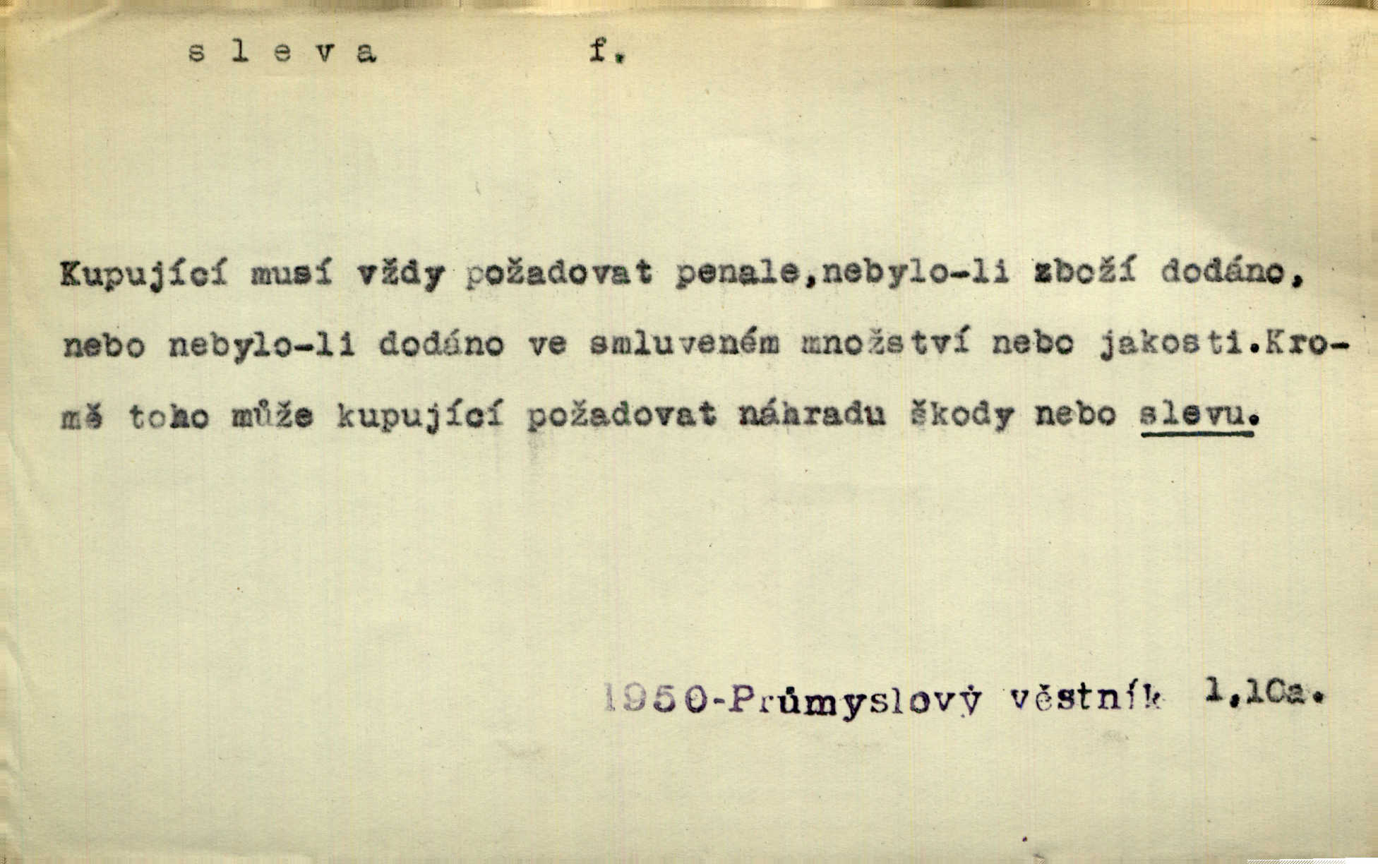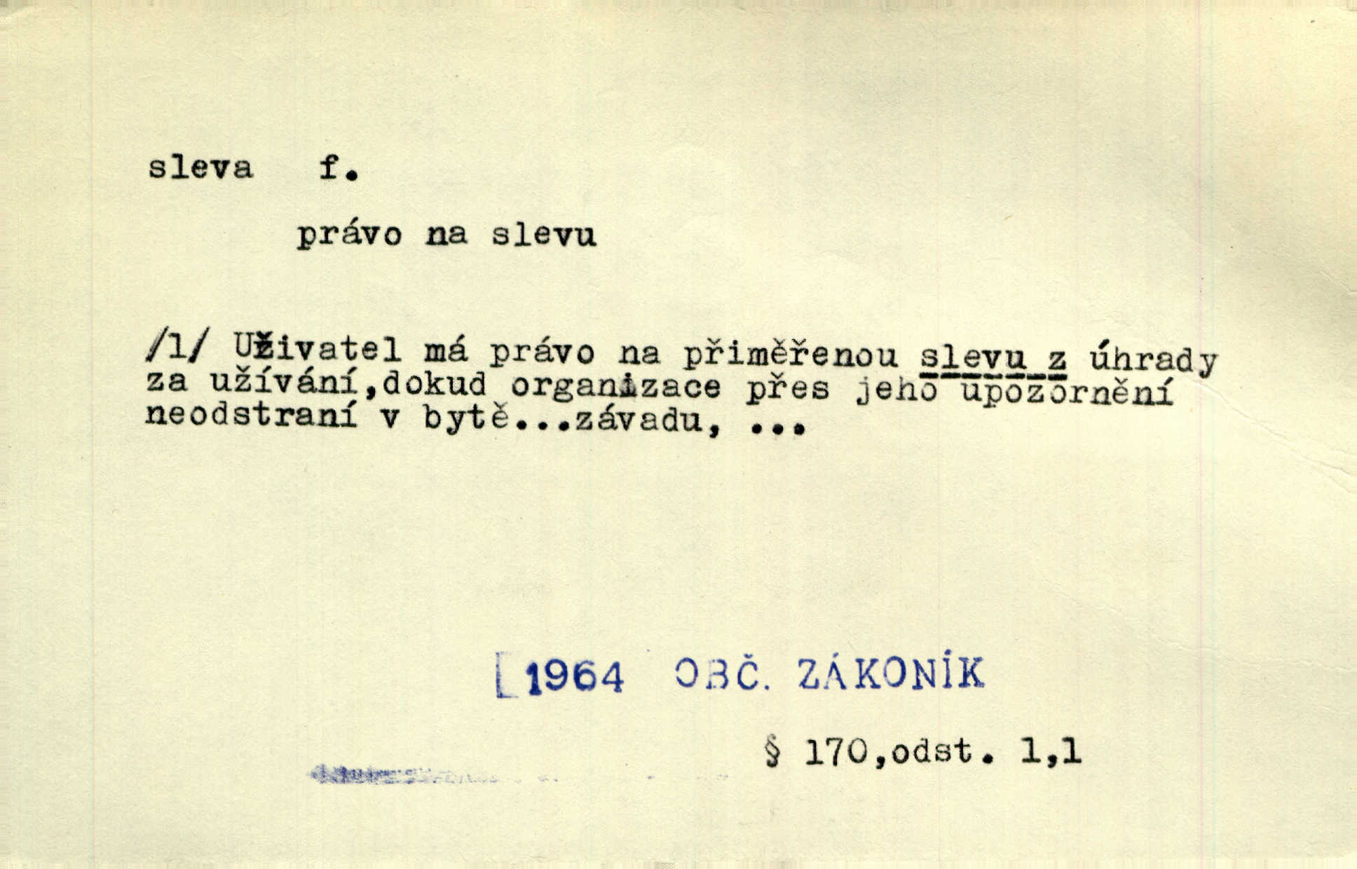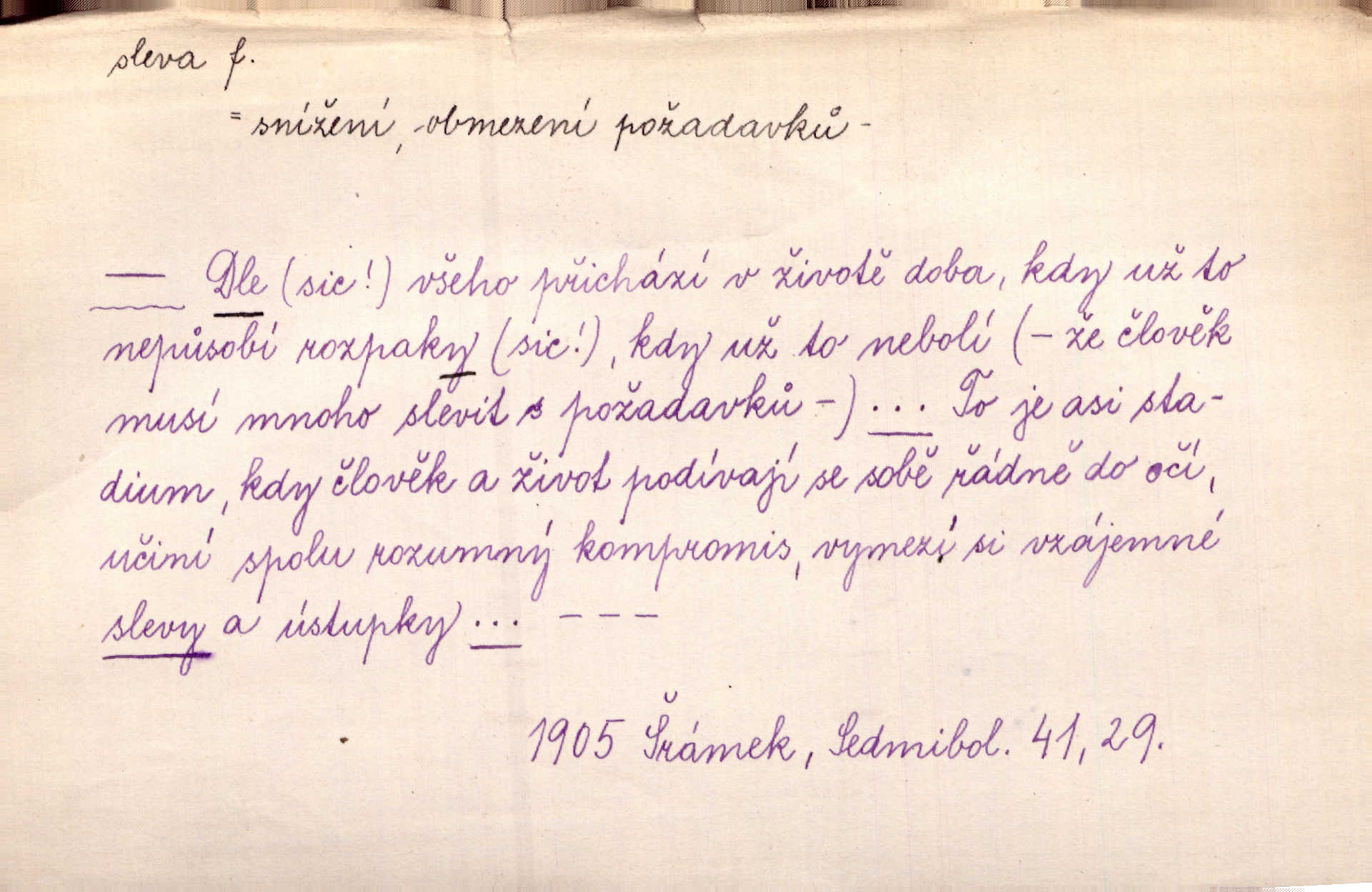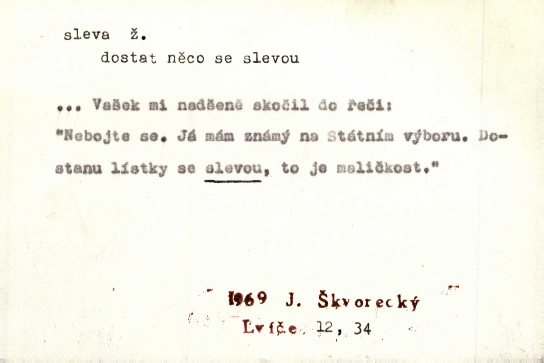 - sleva, -y f. (dobrovolné) snížení platné ceny při prodeji zboží. Majitel pekárny neposkytoval slevy. Dur. „Hospodář“ vybírával často poplatky za inserty napřed a raději se slevou, jen aby sehnal peníze. Herb. Žel. tarifní slevy. Přen. Člověk a život učiní spolu rozumný kompromis, vymezí si vzájemné slevy a ústupky. Šrám. Ze svých zvyků, rozmarů a způsobů nepřinesla manželství ani jedné slevy. Svob. Netrpěla nám [matka] škemrání o nějakou slevu svého rozhodnutí. Krás.