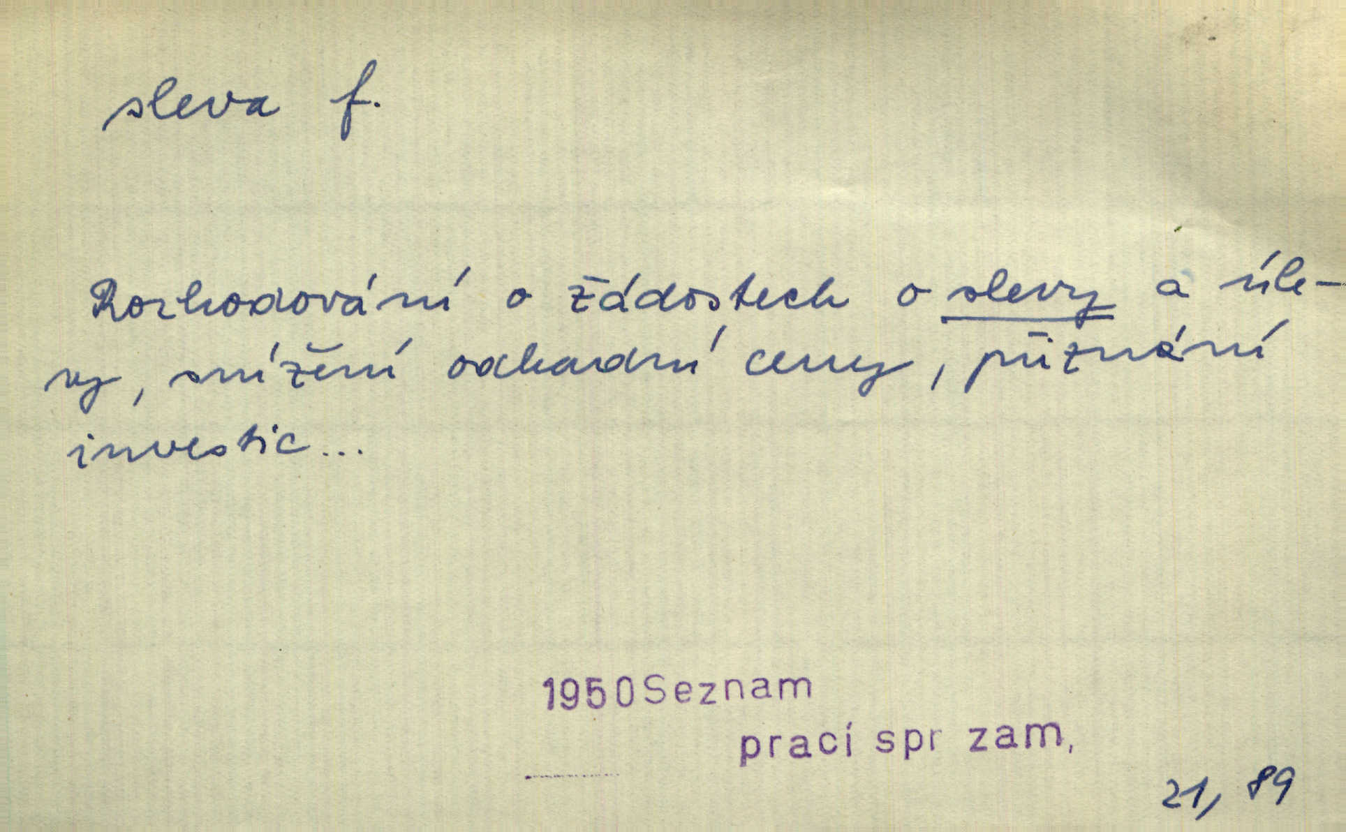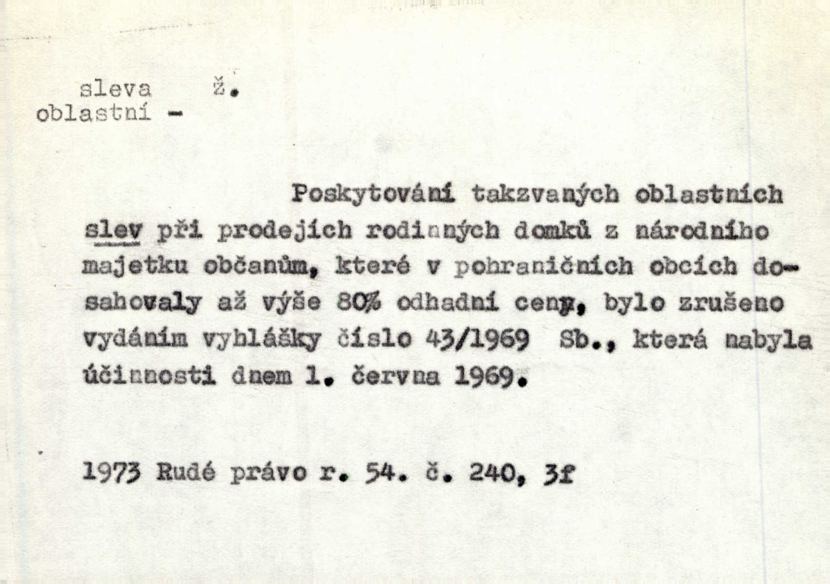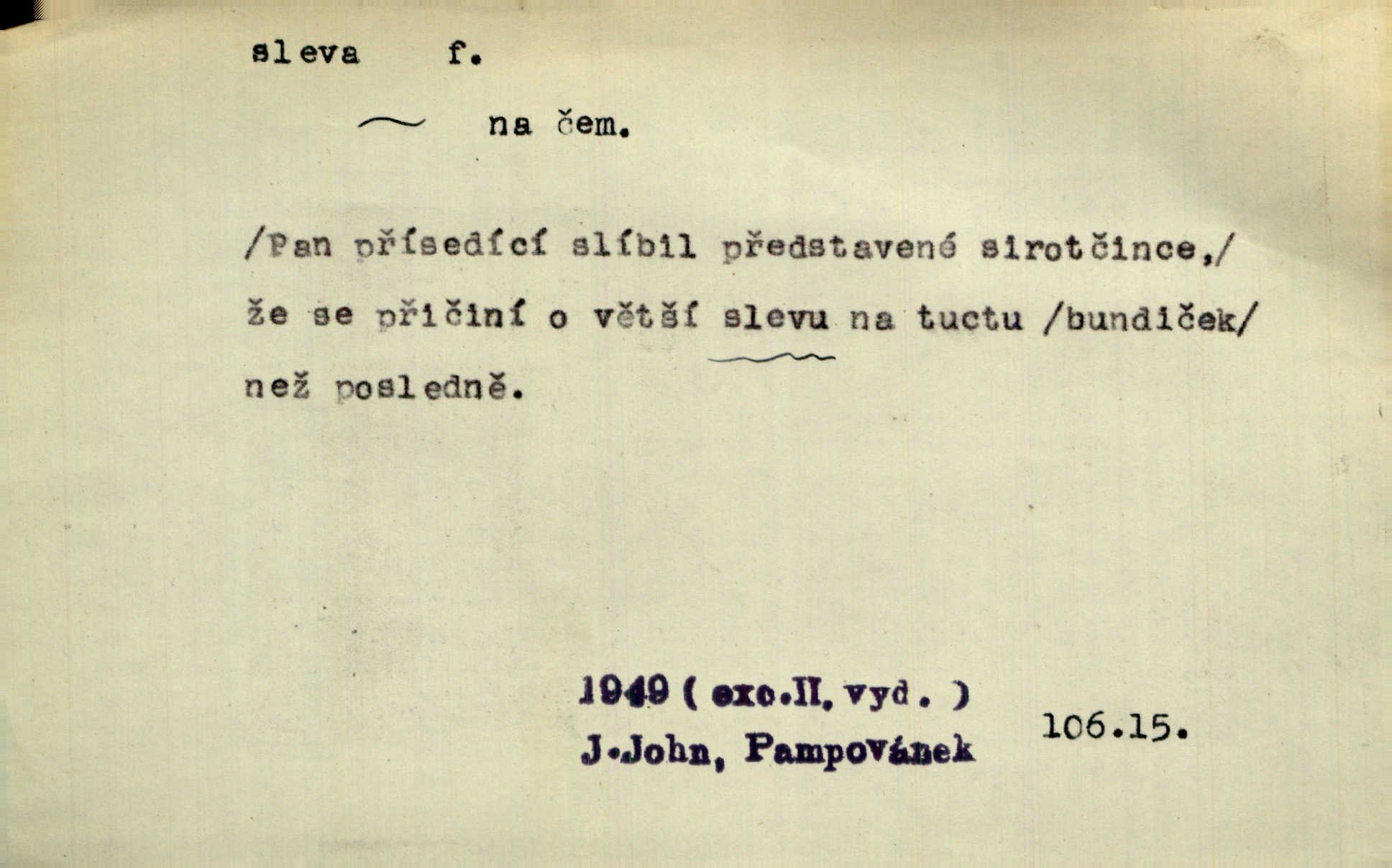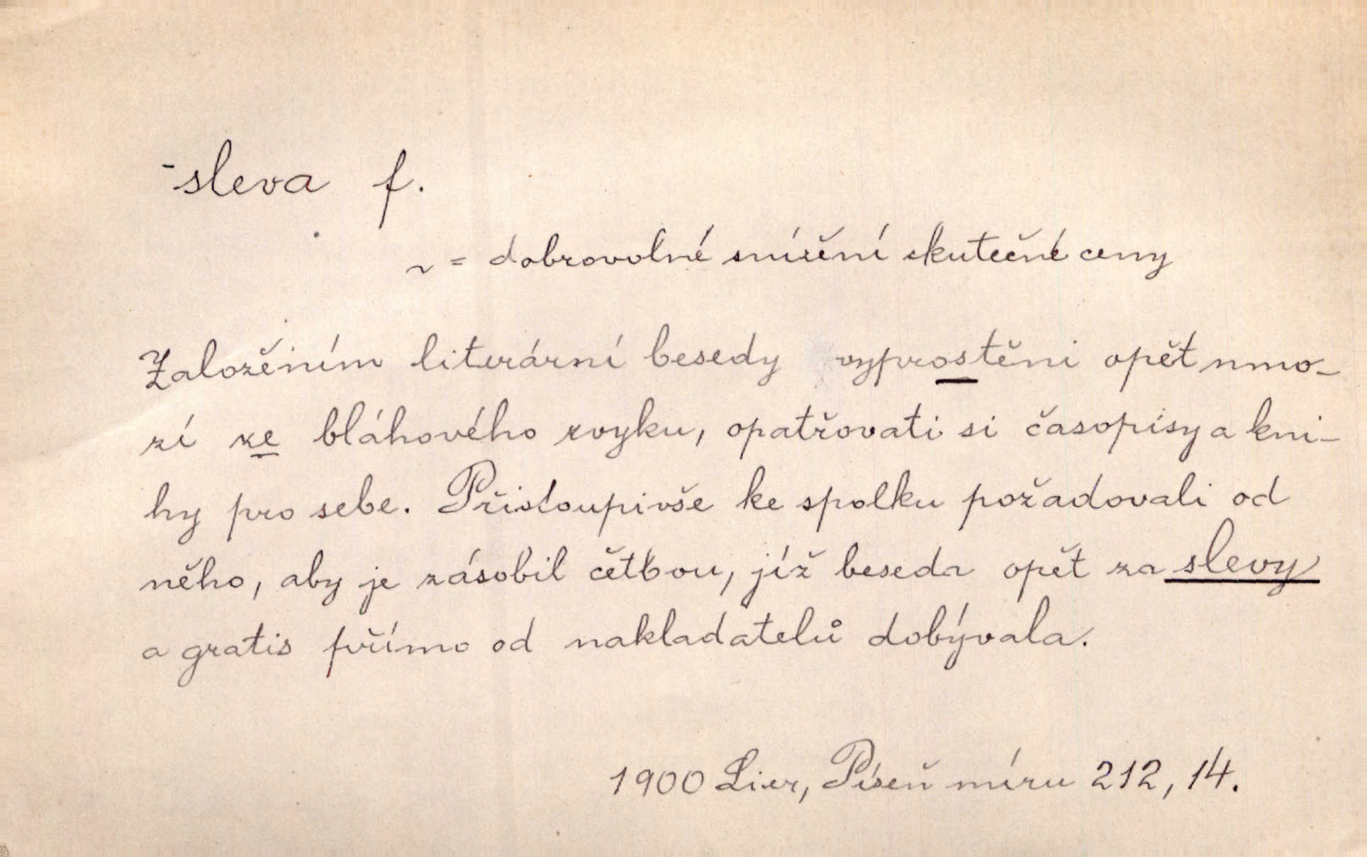 - sleva, -y f. (dobrovolné) snížení platné ceny při prodeji zboží. Majitel pekárny neposkytoval slevy. Dur. „Hospodář“ vybírával často poplatky za inserty napřed a raději se slevou, jen aby sehnal peníze. Herb. Žel. tarifní slevy. Přen. Člověk a život učiní spolu rozumný kompromis, vymezí si vzájemné slevy a ústupky. Šrám. Ze svých zvyků, rozmarů a způsobů nepřinesla manželství ani jedné slevy. Svob. Netrpěla nám [matka] škemrání o nějakou slevu svého rozhodnutí. Krás.