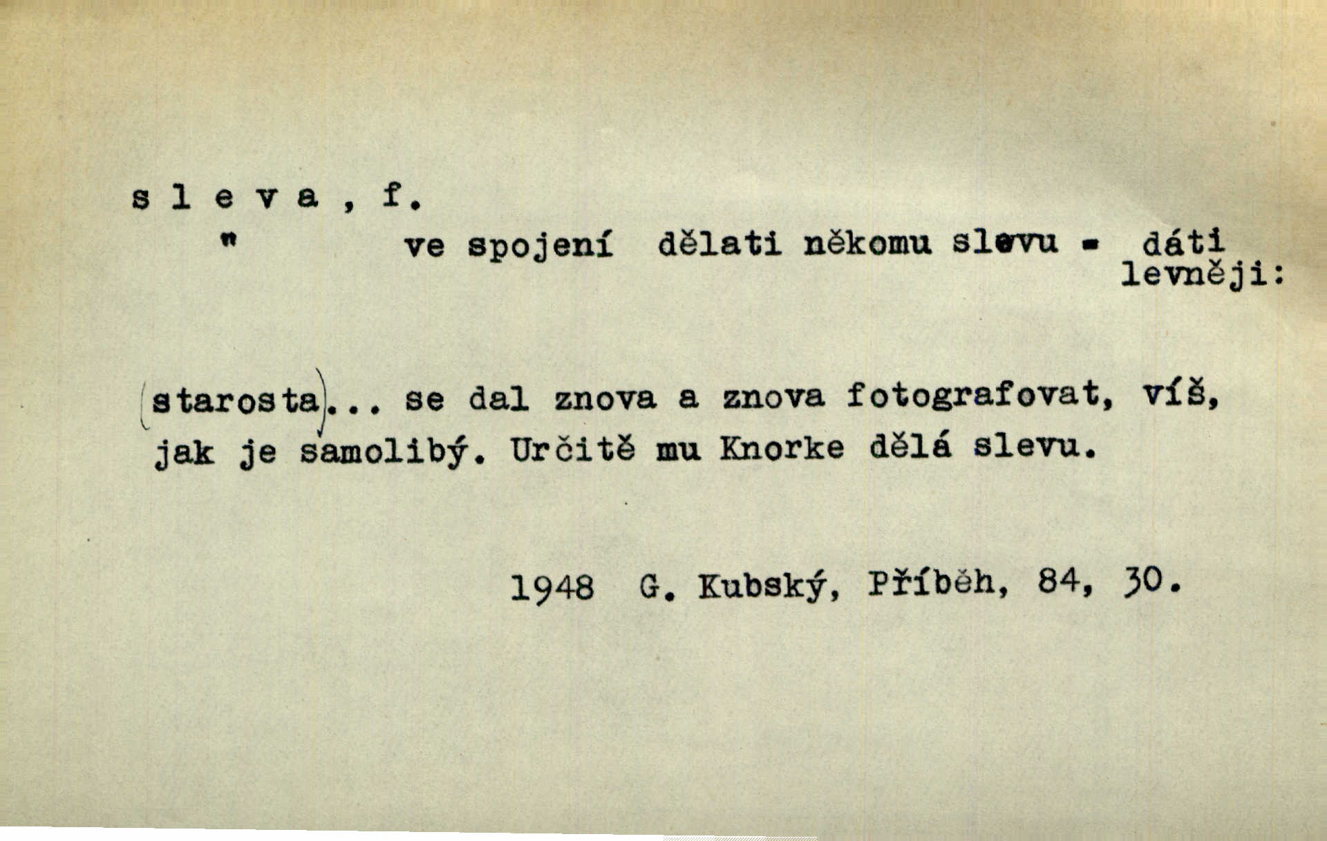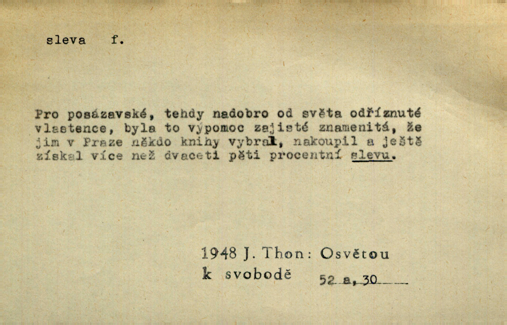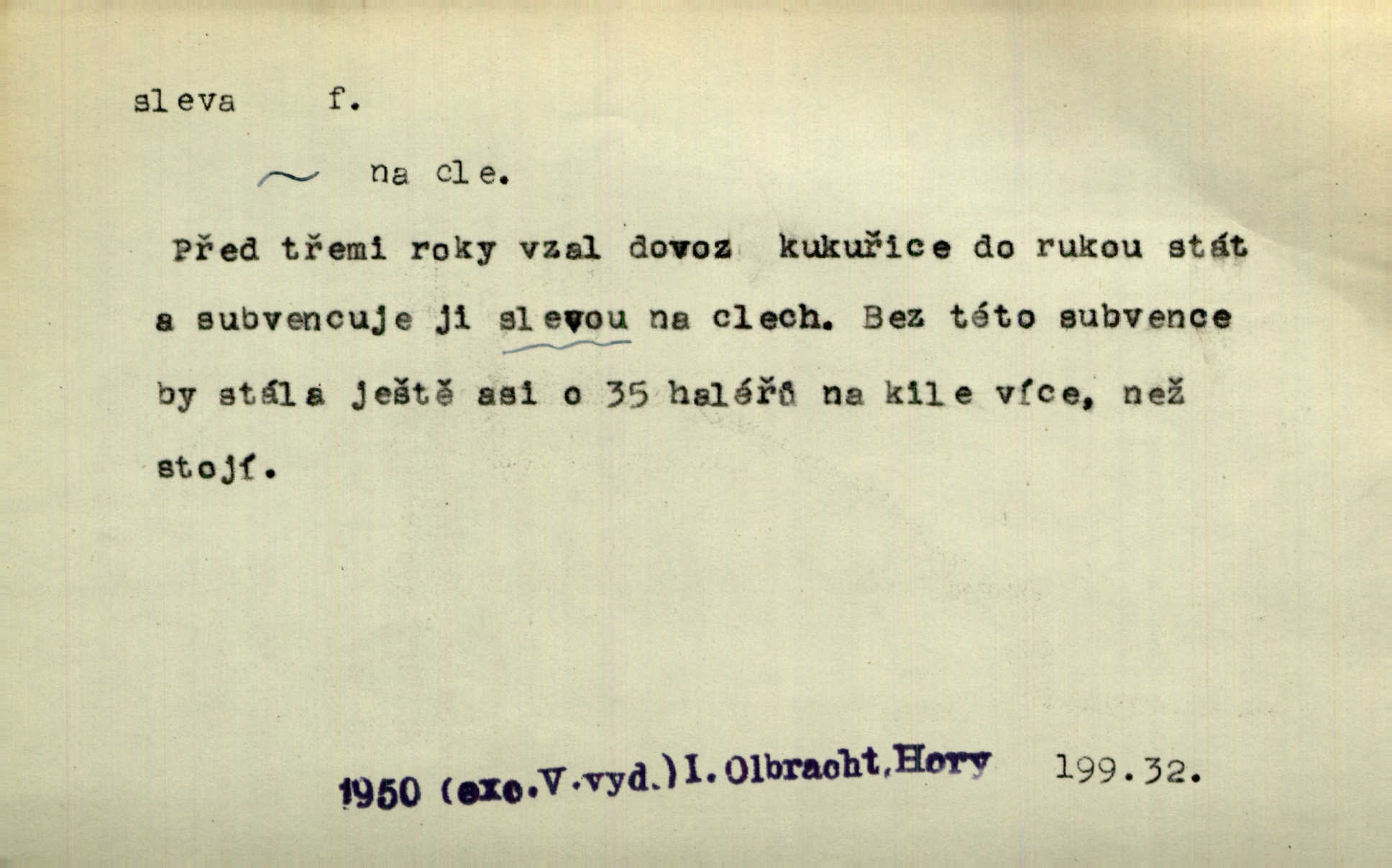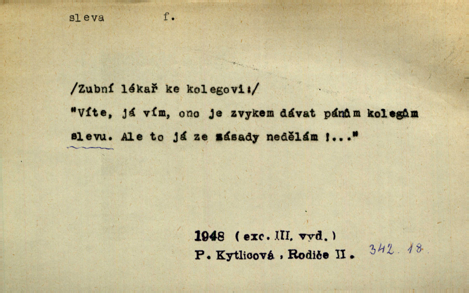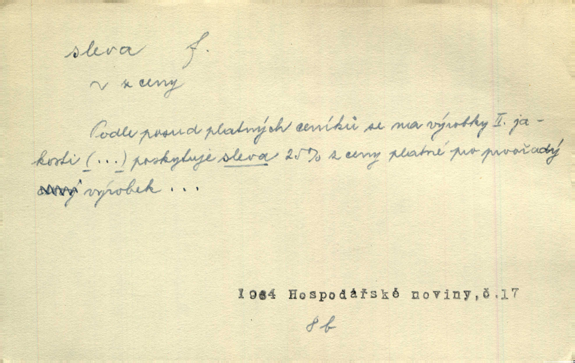 - sleva, -y f. (dobrovolné) snížení platné ceny při prodeji zboží. Majitel pekárny neposkytoval slevy. Dur. „Hospodář“ vybírával často poplatky za inserty napřed a raději se slevou, jen aby sehnal peníze. Herb. Žel. tarifní slevy. Přen. Člověk a život učiní spolu rozumný kompromis, vymezí si vzájemné slevy a ústupky. Šrám. Ze svých zvyků, rozmarů a způsobů nepřinesla manželství ani jedné slevy. Svob. Netrpěla nám [matka] škemrání o nějakou slevu svého rozhodnutí. Krás.