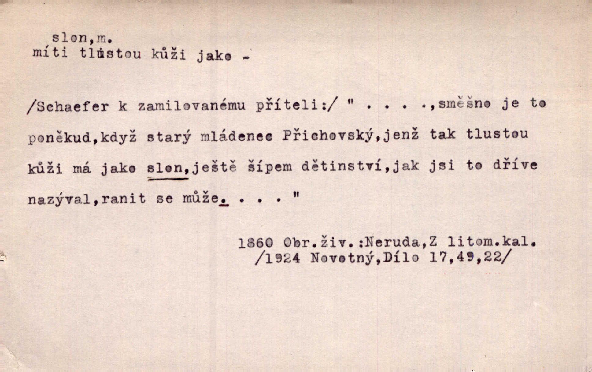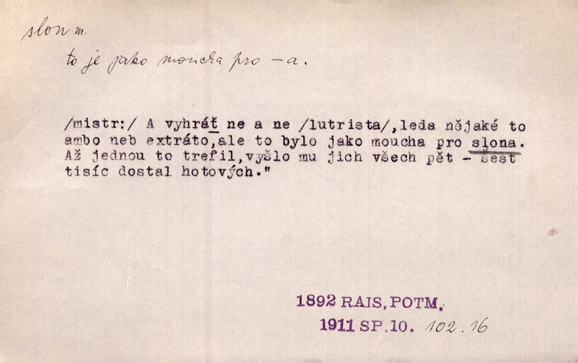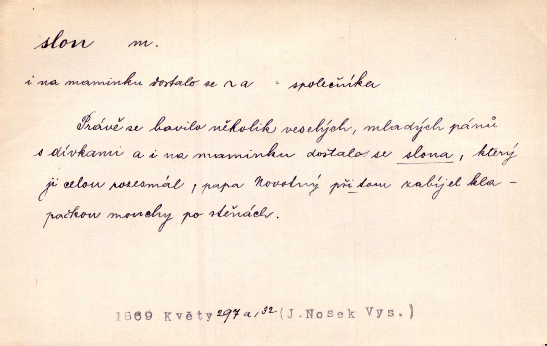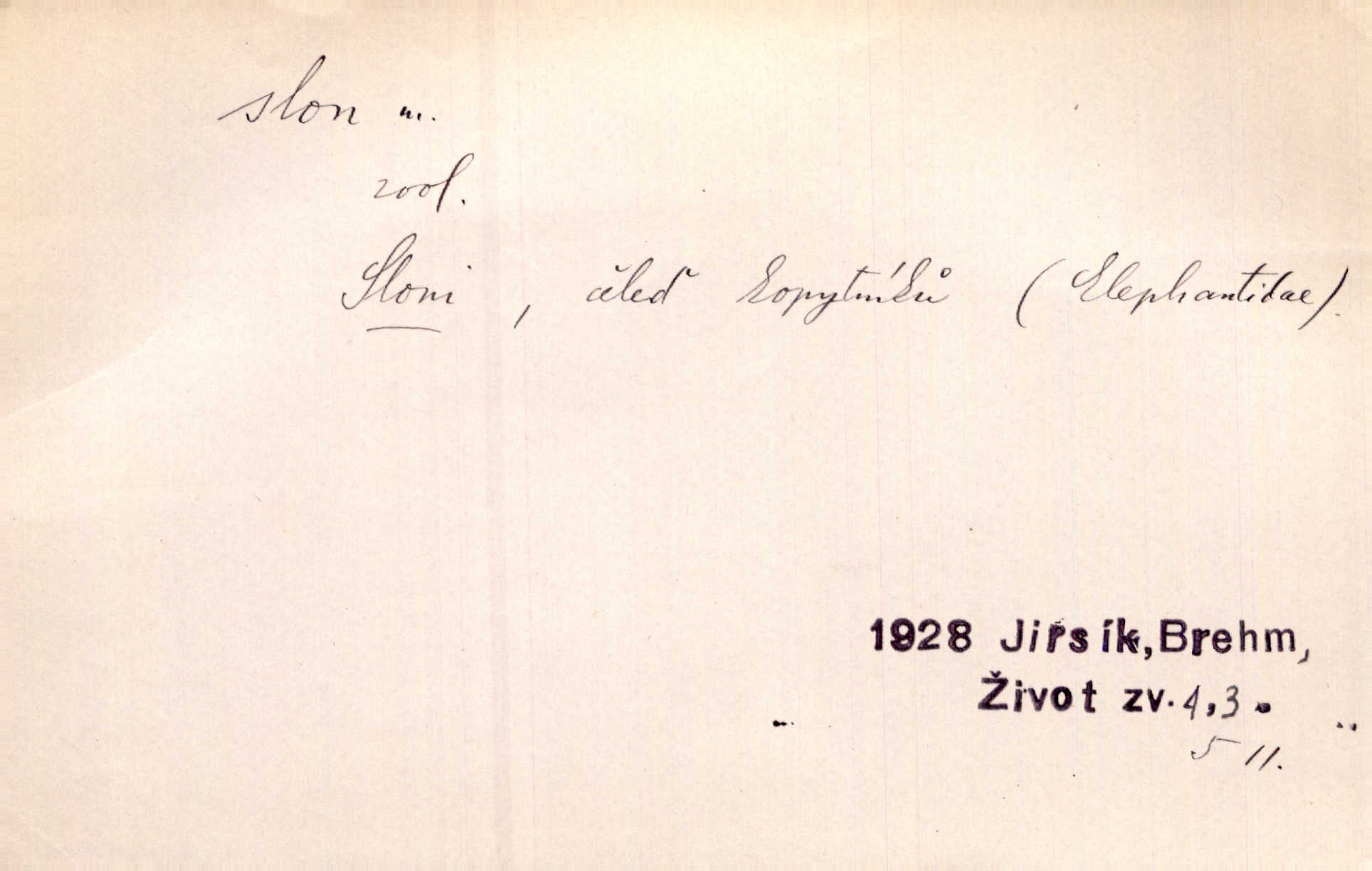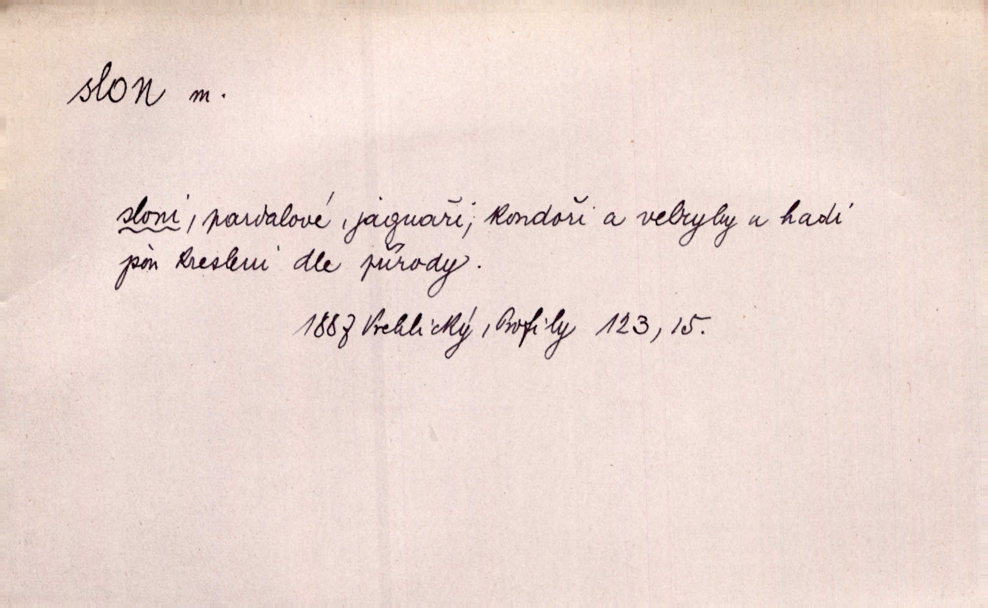 - slon, -a m. největší suchozemský ssavec, s mocným chobotem. I viděl jsem [v zoologické zahradě] koupat se slony. K. Čap. Celou těžkou truhlu položil si na záda a dupaje jako slon odnášel ji na saně. Rais. Tak tlustou kůži má jako slon. Ner. A vyhráť ne a ne [lutrista], leda nějaké to ambo nebo extráto, ale to bylo jako moucha pro slona pramálo. Rais. Zool. slon africký druh ssavců z podřádu Proboscidea, Loxodonta africana; sloni indičtí rod ssavců z čeledi Proboscidea, Elephas. D Expr. člověk ve společnosti neohrabaný. Markétka vykládá, co jí kdo řekl, který z těch mladých slonů jí přišlápl střevíc. Řezáč. D Expr. třetí osoba doprovázející dvojici (milenců); nevítaný společník vůbec. Tak tedy ti dva mládenci chodili do zámku za pannami Šimákovými a mladý poeta Bělohrobský dělal jim jaksi slona. J. Kvap. Můžete mi zase přijít, abych vám dělal slona na nějakém výletě. Schein. D Vulg. nadávka. Co chceš, slone, pár do nosu? Haš. „Teď pobídni, ty jeden slone!“ zvolal na Ondru. Klost.