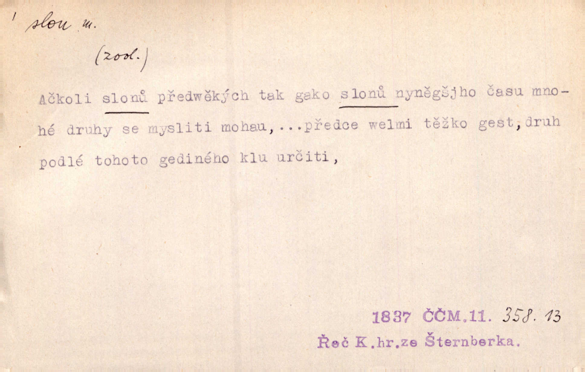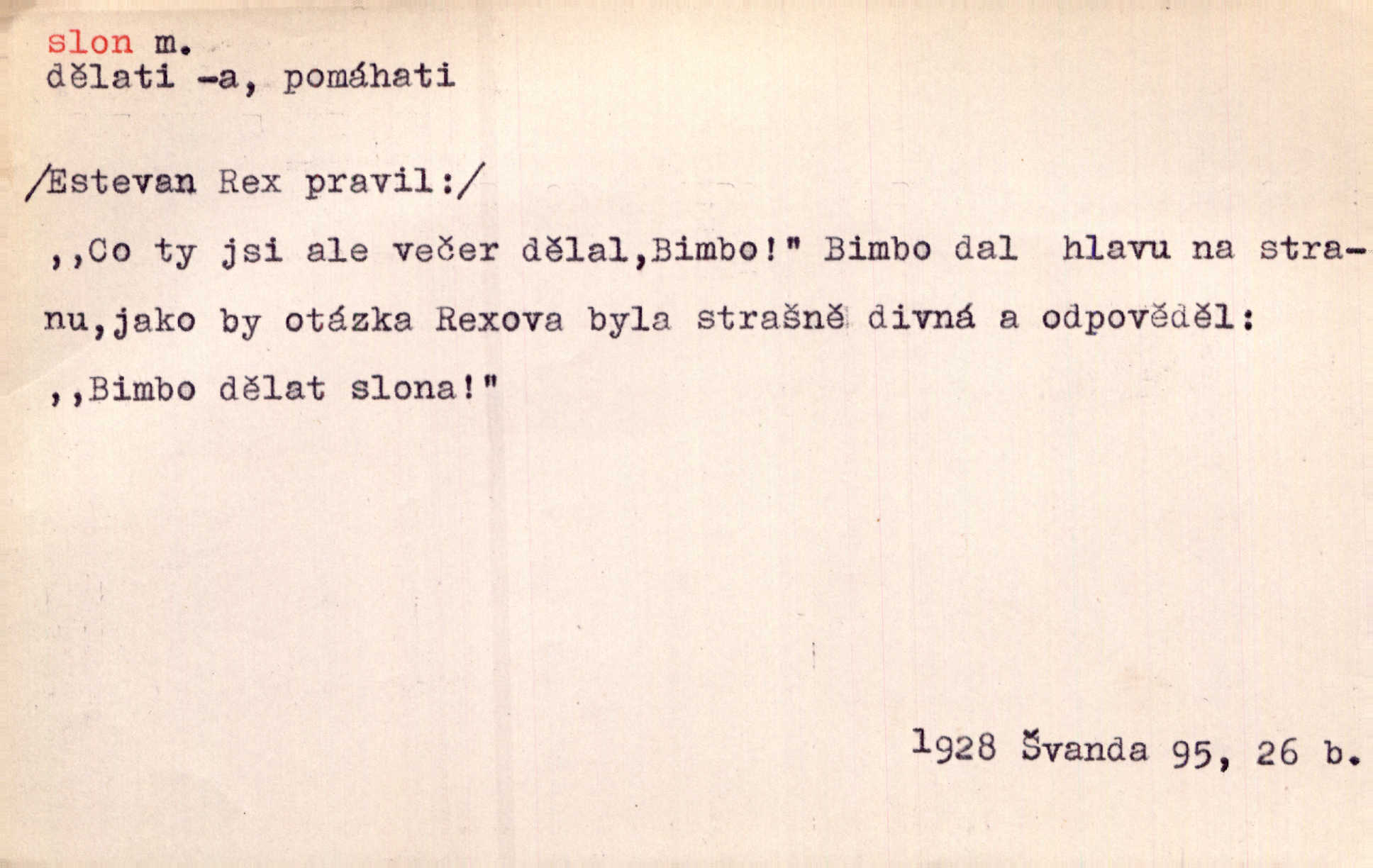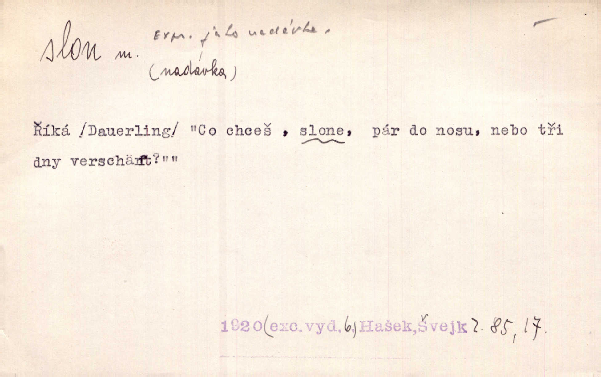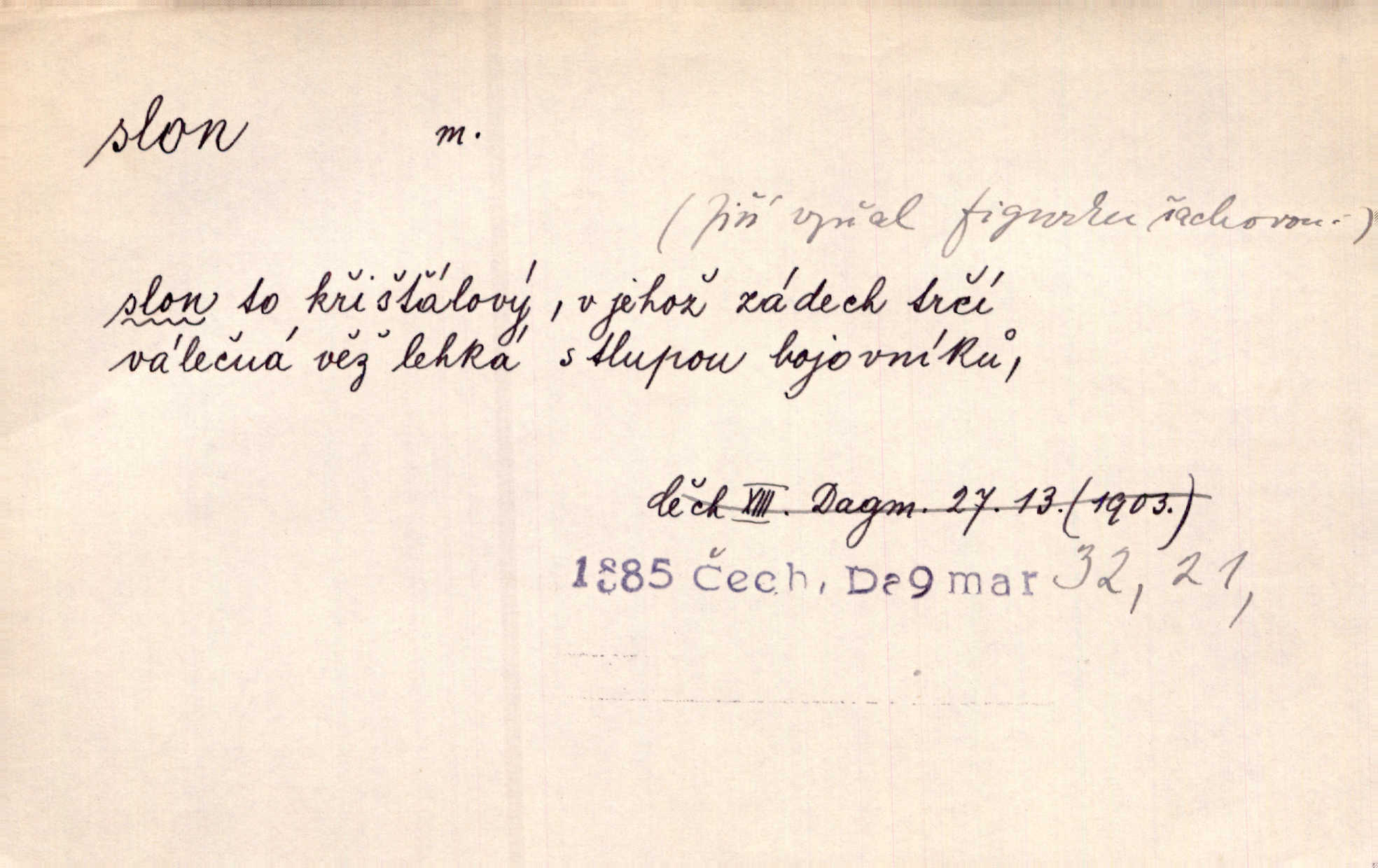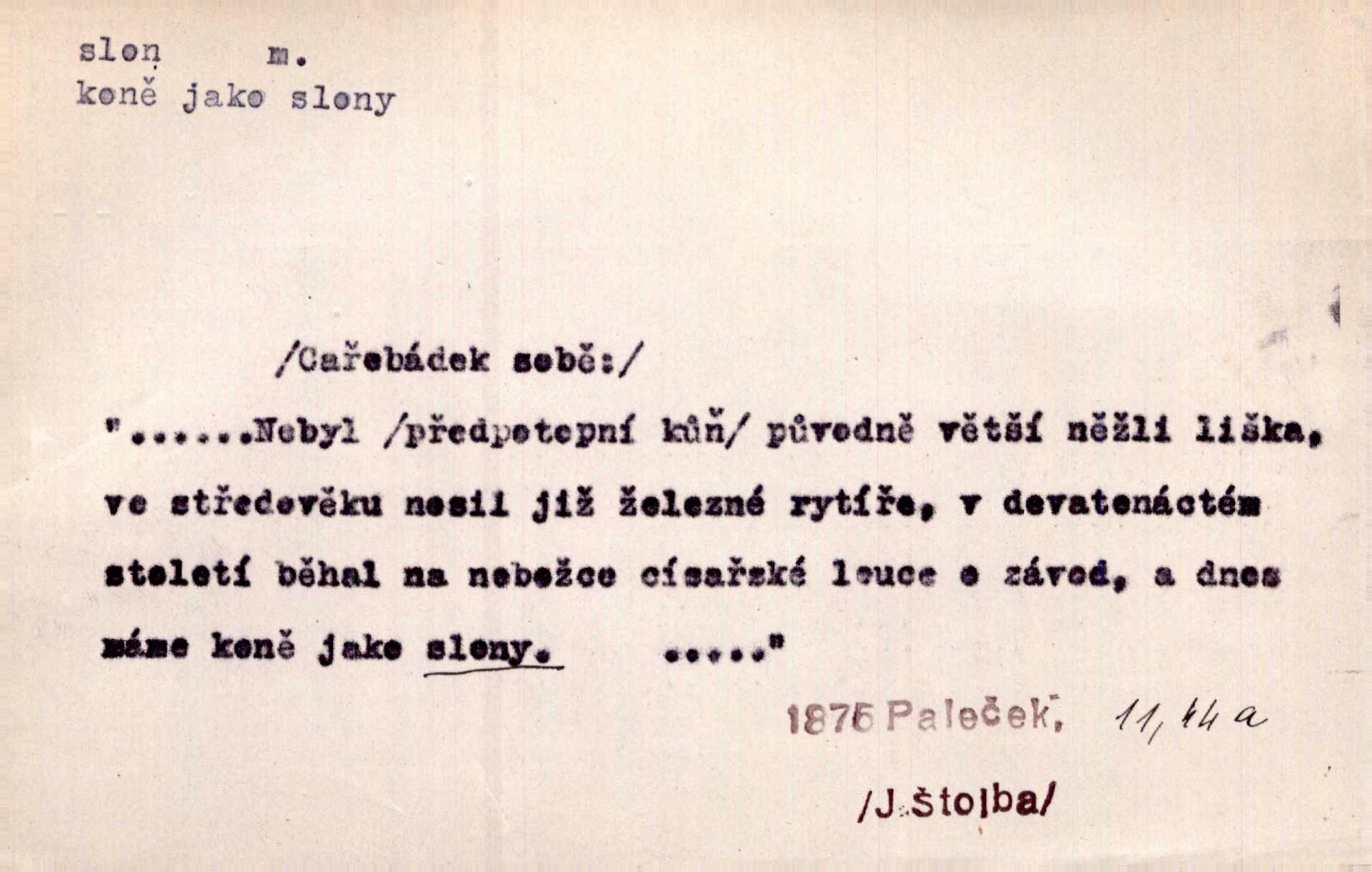- slon, -a m. největší suchozemský ssavec, s mocným chobotem. I viděl jsem [v zoologické zahradě] koupat se slony. K. Čap. Celou těžkou truhlu položil si na záda a dupaje jako slon odnášel ji na saně. Rais. Tak tlustou kůži má jako slon. Ner. A vyhráť ne a ne [lutrista], leda nějaké to ambo nebo extráto, ale to bylo jako moucha pro slona pramálo. Rais. Zool. slon africký druh ssavců z podřádu Proboscidea, Loxodonta africana; sloni indičtí rod ssavců z čeledi Proboscidea, Elephas. D Expr. člověk ve společnosti neohrabaný. Markétka vykládá, co jí kdo řekl, který z těch mladých slonů jí přišlápl střevíc. Řezáč. D Expr. třetí osoba doprovázející dvojici (milenců); nevítaný společník vůbec. Tak tedy ti dva mládenci chodili do zámku za pannami Šimákovými a mladý poeta Bělohrobský dělal jim jaksi slona. J. Kvap. Můžete mi zase přijít, abych vám dělal slona na nějakém výletě. Schein. D Vulg. nadávka. Co chceš, slone, pár do nosu? Haš. „Teď pobídni, ty jeden slone!“ zvolal na Ondru. Klost.