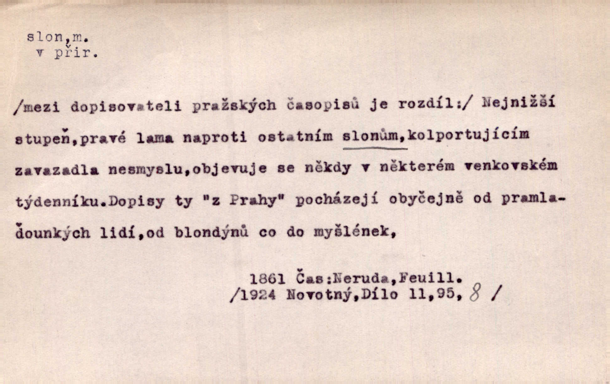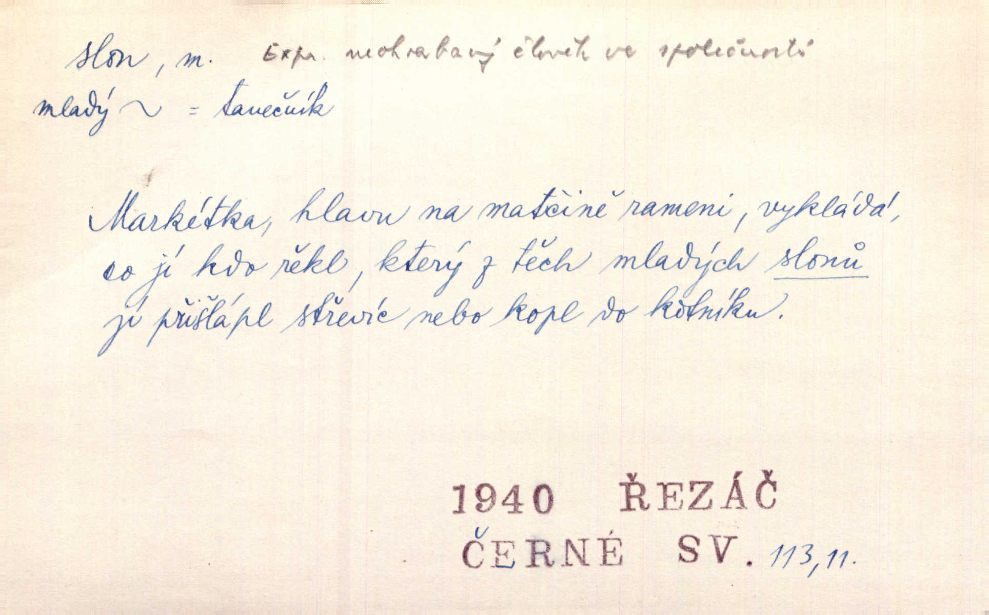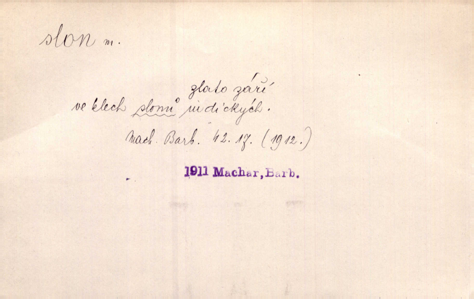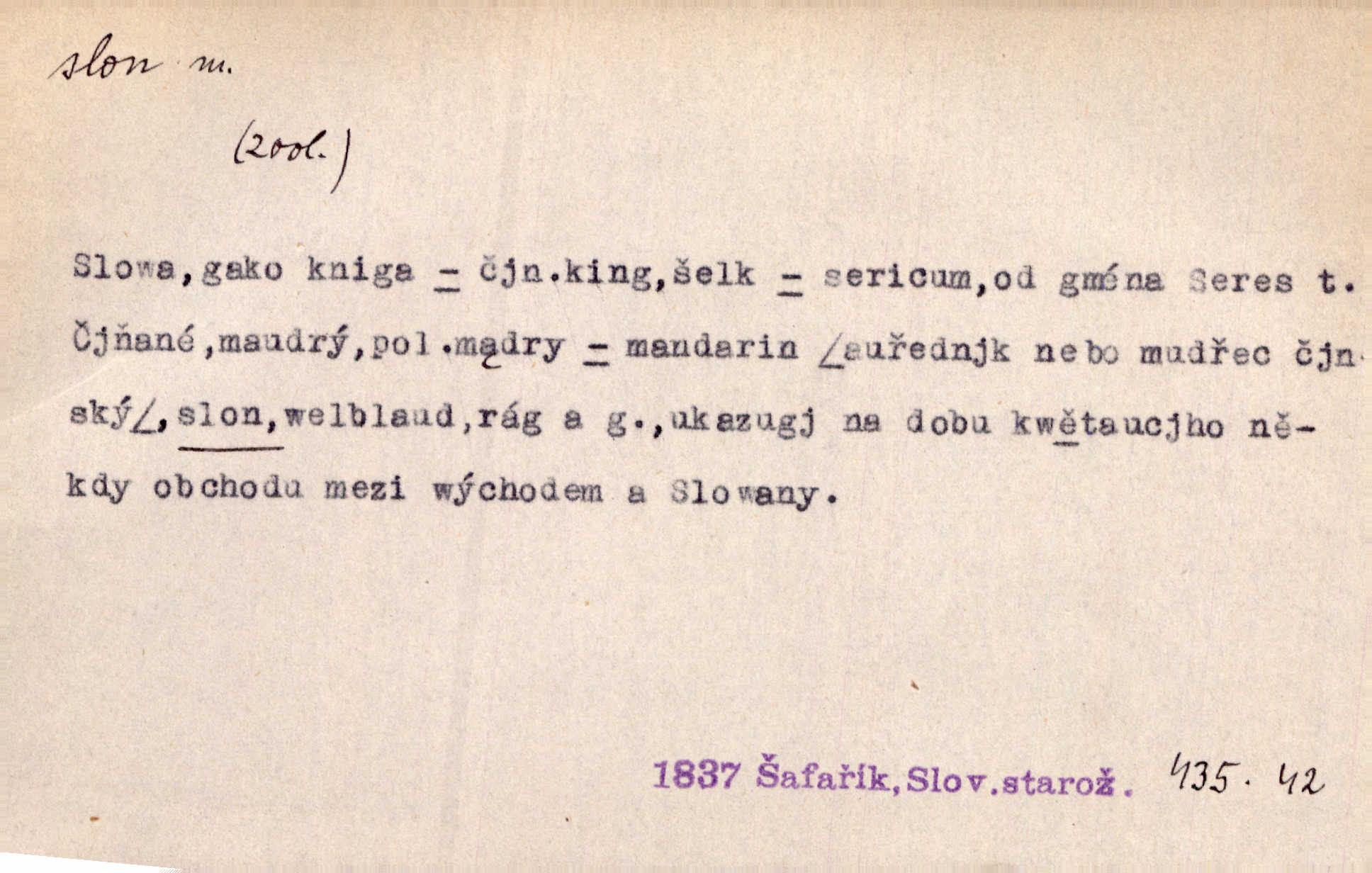 - slon, -a m. největší suchozemský ssavec, s mocným chobotem. I viděl jsem [v zoologické zahradě] koupat se slony. K. Čap. Celou těžkou truhlu položil si na záda a dupaje jako slon odnášel ji na saně. Rais. Tak tlustou kůži má jako slon. Ner. A vyhráť ne a ne [lutrista], leda nějaké to ambo nebo extráto, ale to bylo jako moucha pro slona pramálo. Rais. Zool. slon africký druh ssavců z podřádu Proboscidea, Loxodonta africana; sloni indičtí rod ssavců z čeledi Proboscidea, Elephas. D Expr. člověk ve společnosti neohrabaný. Markétka vykládá, co jí kdo řekl, který z těch mladých slonů jí přišlápl střevíc. Řezáč. D Expr. třetí osoba doprovázející dvojici (milenců); nevítaný společník vůbec. Tak tedy ti dva mládenci chodili do zámku za pannami Šimákovými a mladý poeta Bělohrobský dělal jim jaksi slona. J. Kvap. Můžete mi zase přijít, abych vám dělal slona na nějakém výletě. Schein. D Vulg. nadávka. Co chceš, slone, pár do nosu? Haš. „Teď pobídni, ty jeden slone!“ zvolal na Ondru. Klost.